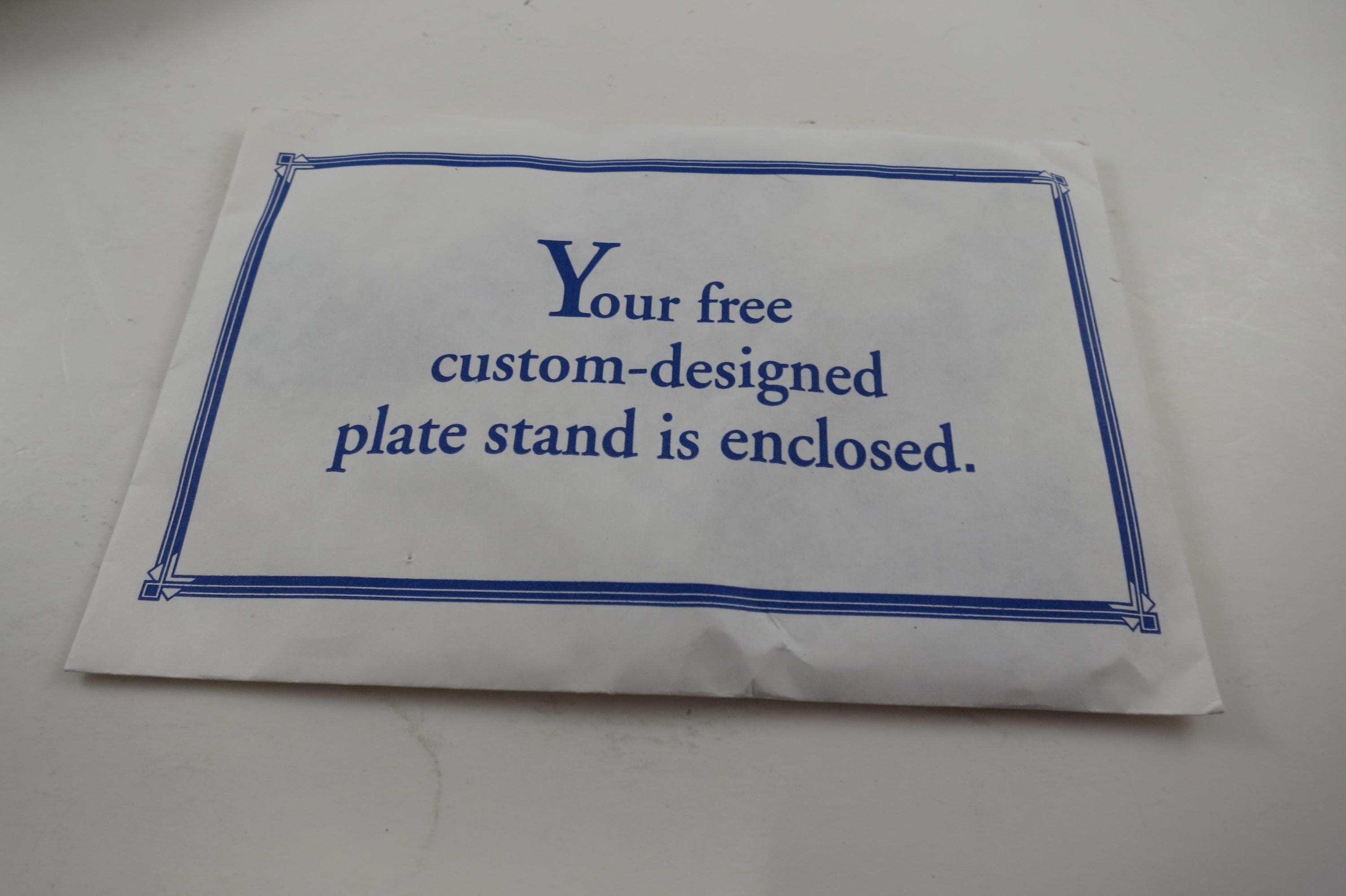 Plate is in pristine condition with no chips, cracks or damages. This is an 8 inch plate. Includes a plate stand.