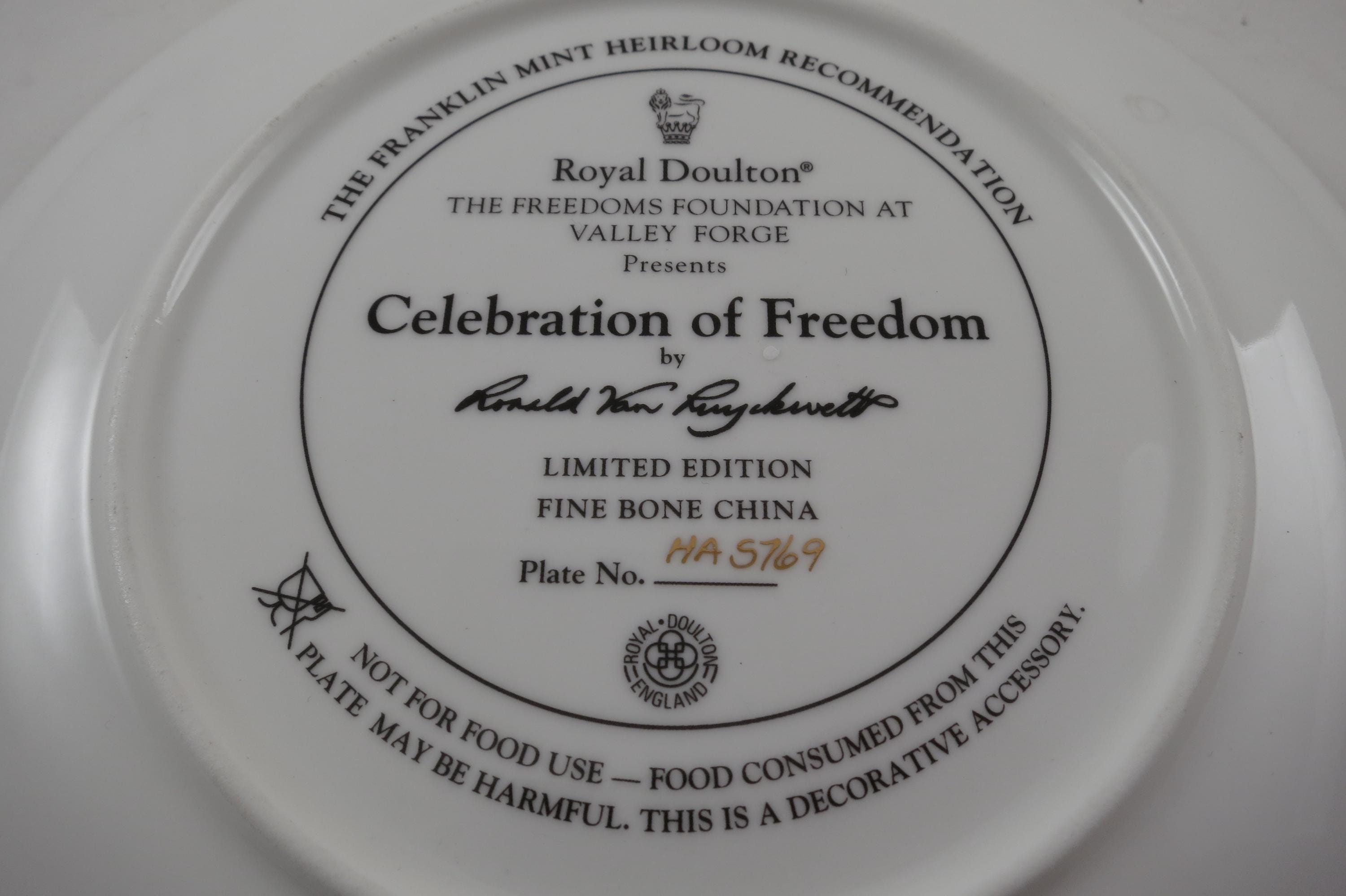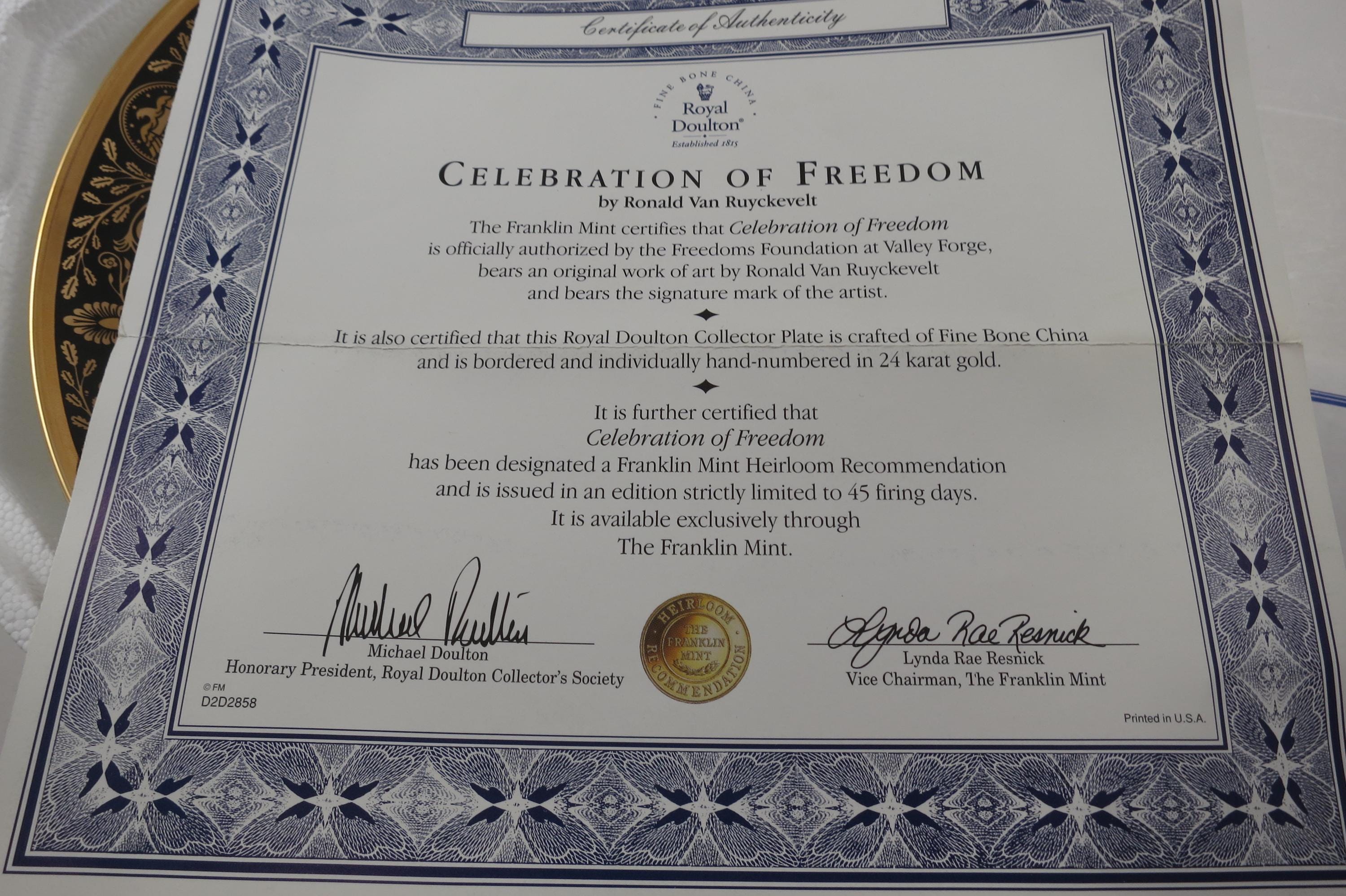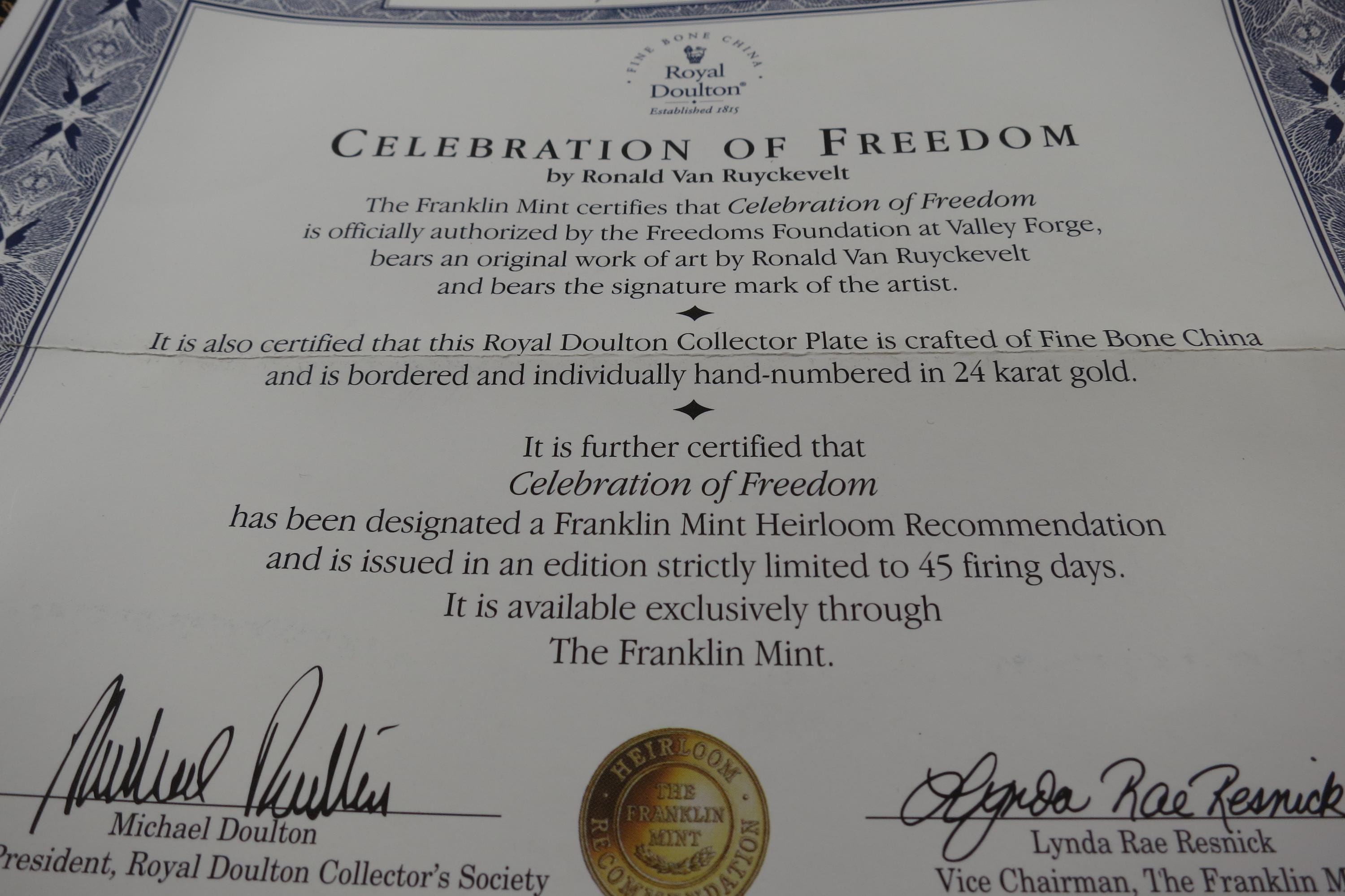 Franklin Mint Heirloom Royal Doulton Celebration of Freedom by Ronald Ruyckevelt IOB with COA.