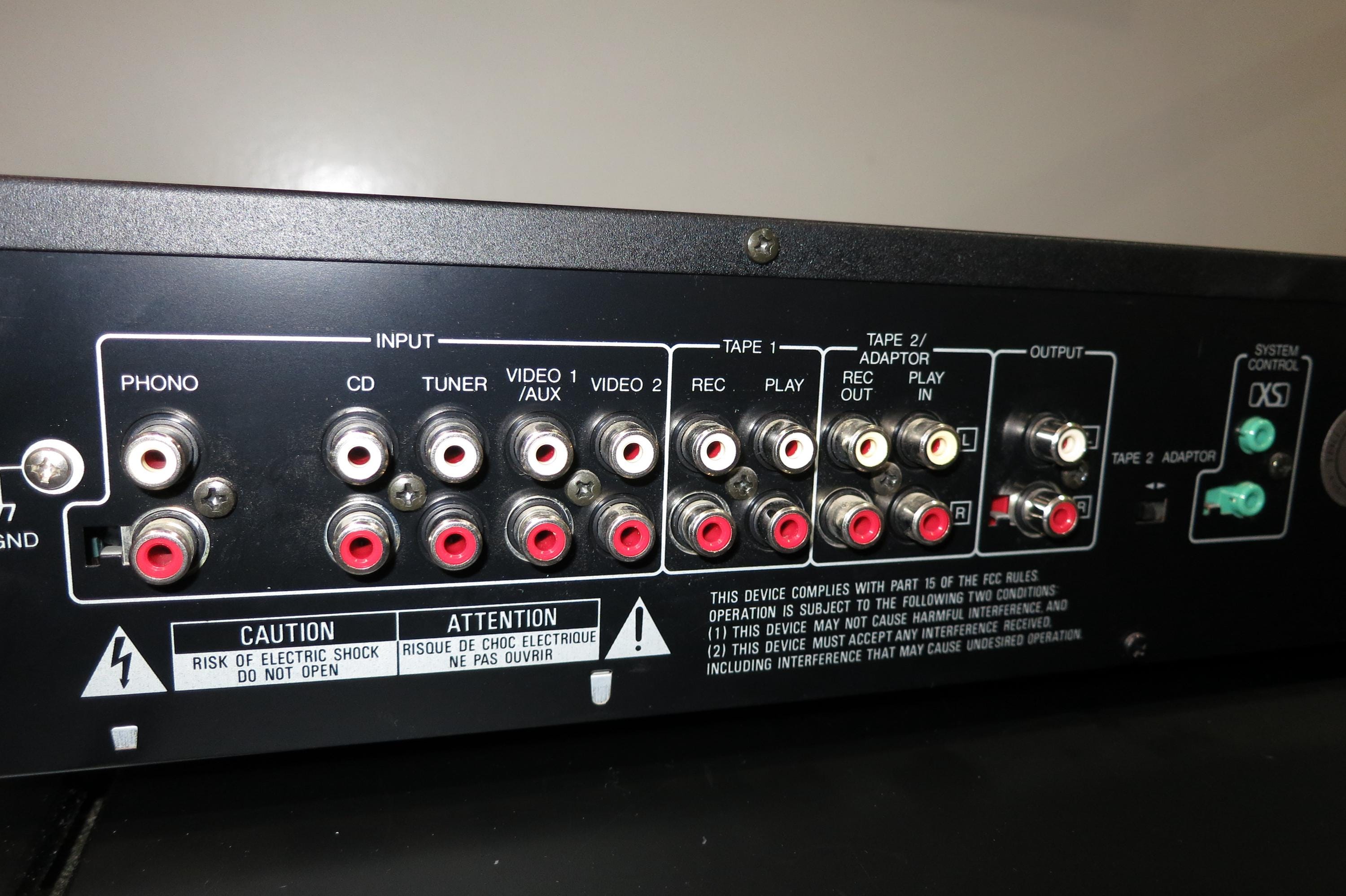 Inputs for Phono, CD, Tuner, Video/Aux, Video 2, Tape 1, Tape 2