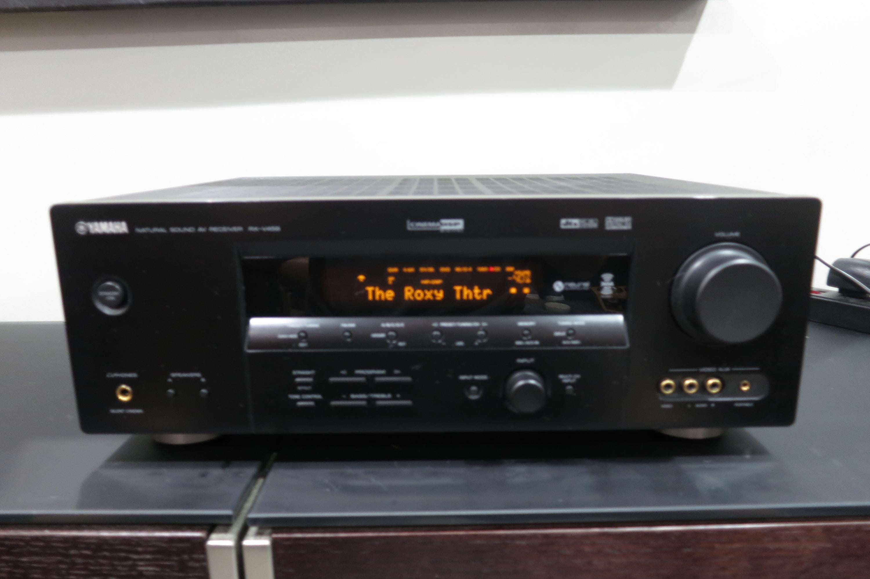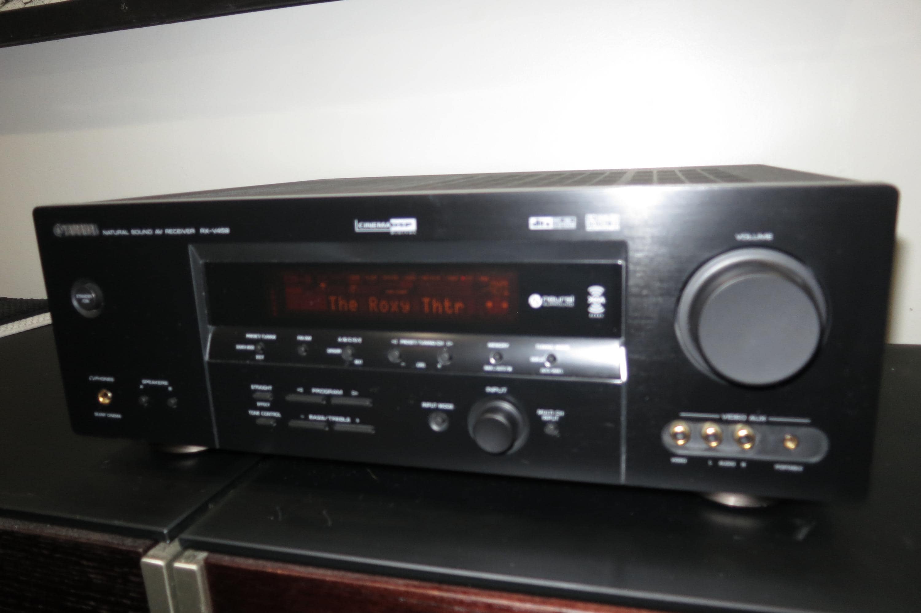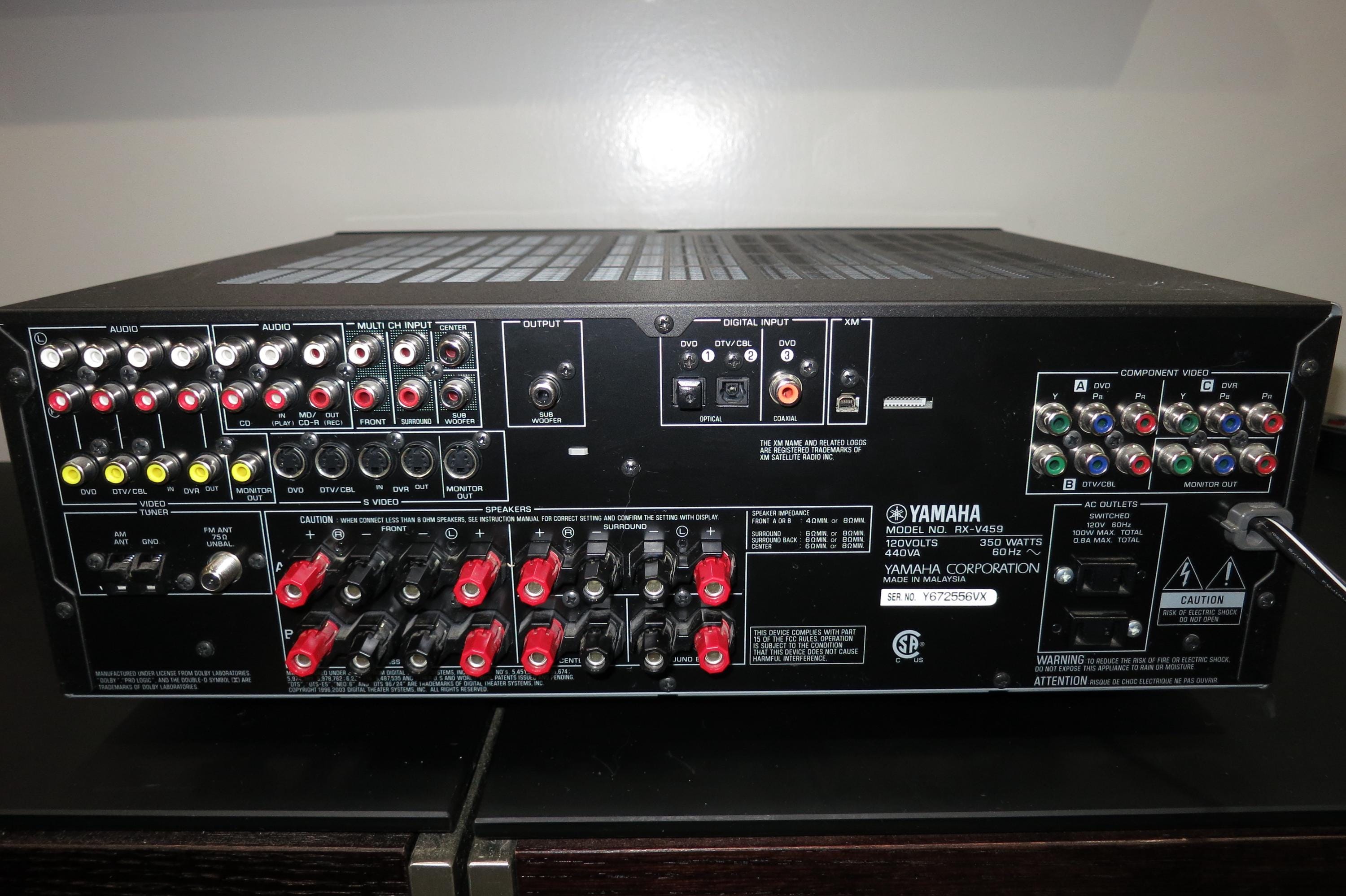 This RX-V459 Receiver is black in color for that modern retro look. Features Dolby Digital Pro Logic, A and B Speaker Controls, Headphone Input, Inputs for VCR, Cable, DVD, CD, Tuner and Phonograph, as well as the original remote control. Features an orange LED Display. Measures 17 inches wide, 14 inches deep and 6 1/4 inches tall. 350 Watts. Includes the original manual.