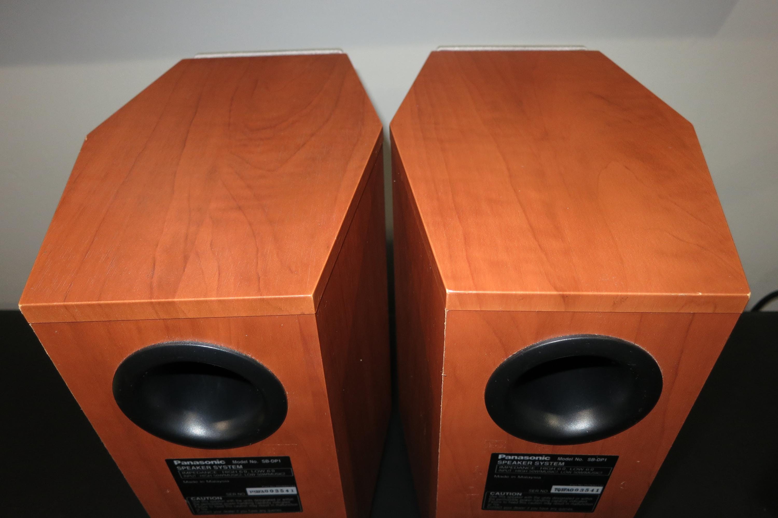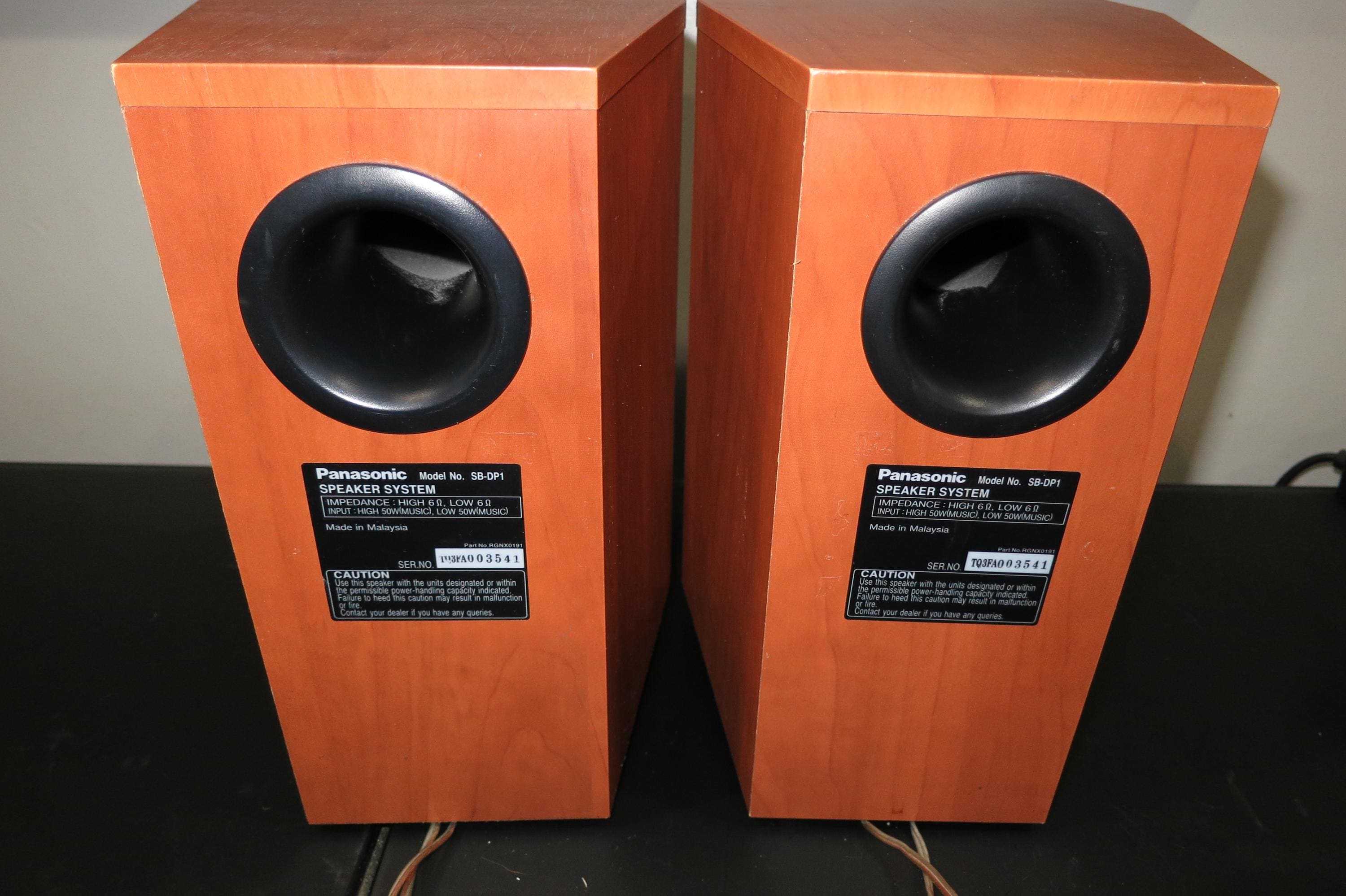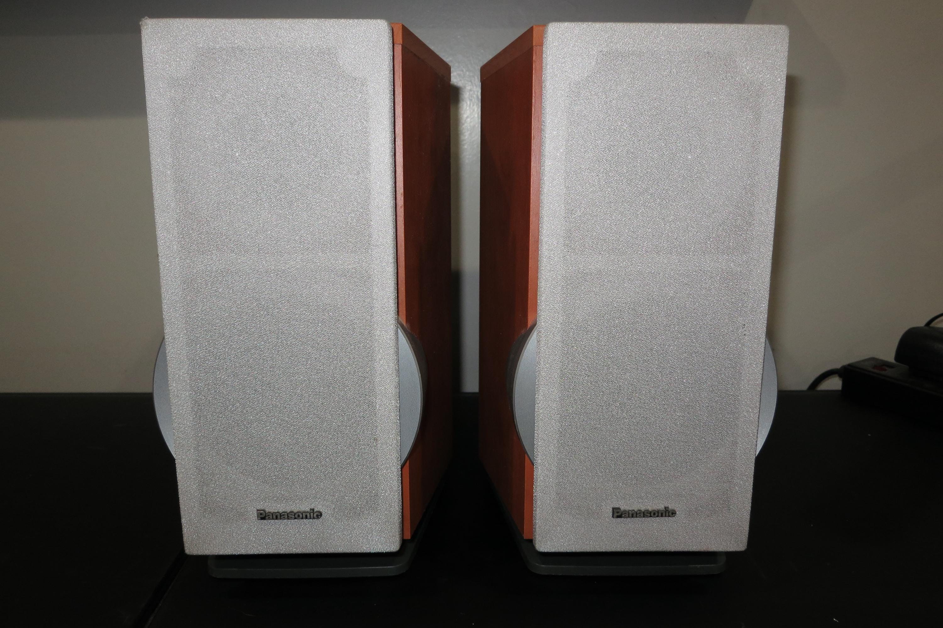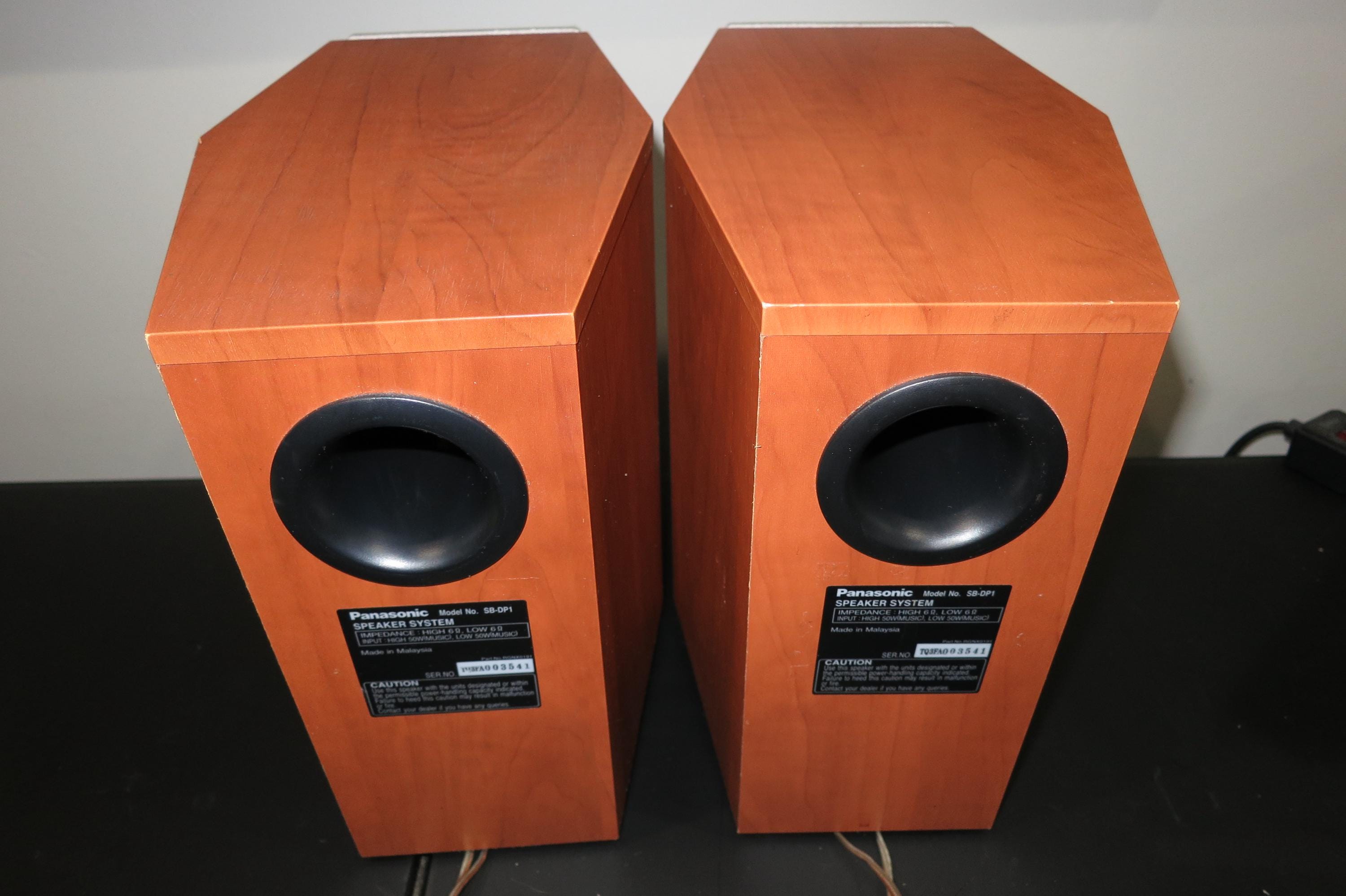 Pair of Vintage Panasonic SB-DP1 Bookshelf Stereo Speakers. Faux Wood Cabinets with Silver Covers. Great Sound and Retro Look! These measure 6 1/4 Inches Wide, 10 1/4 Inches Deep and 10 1/2 Inches Tall.