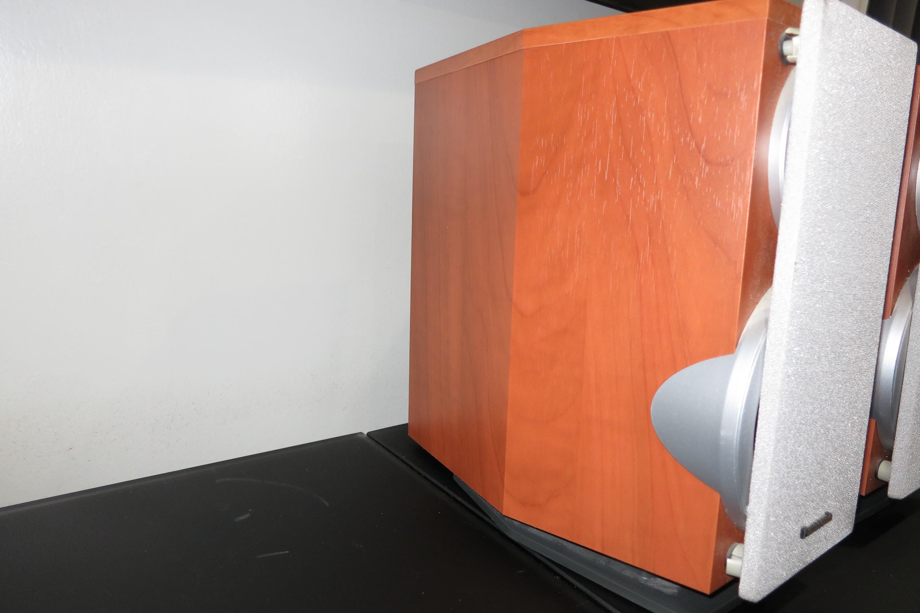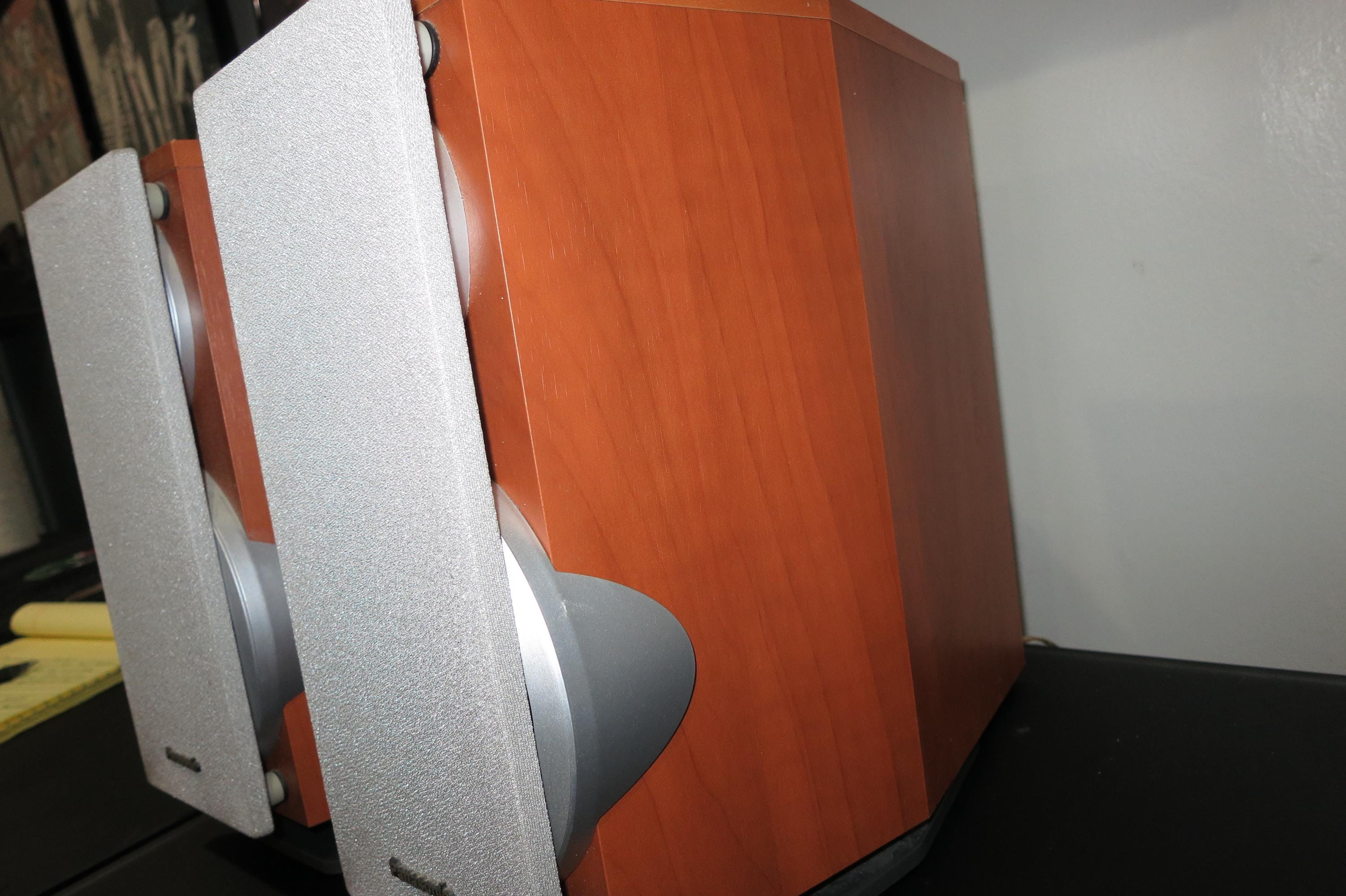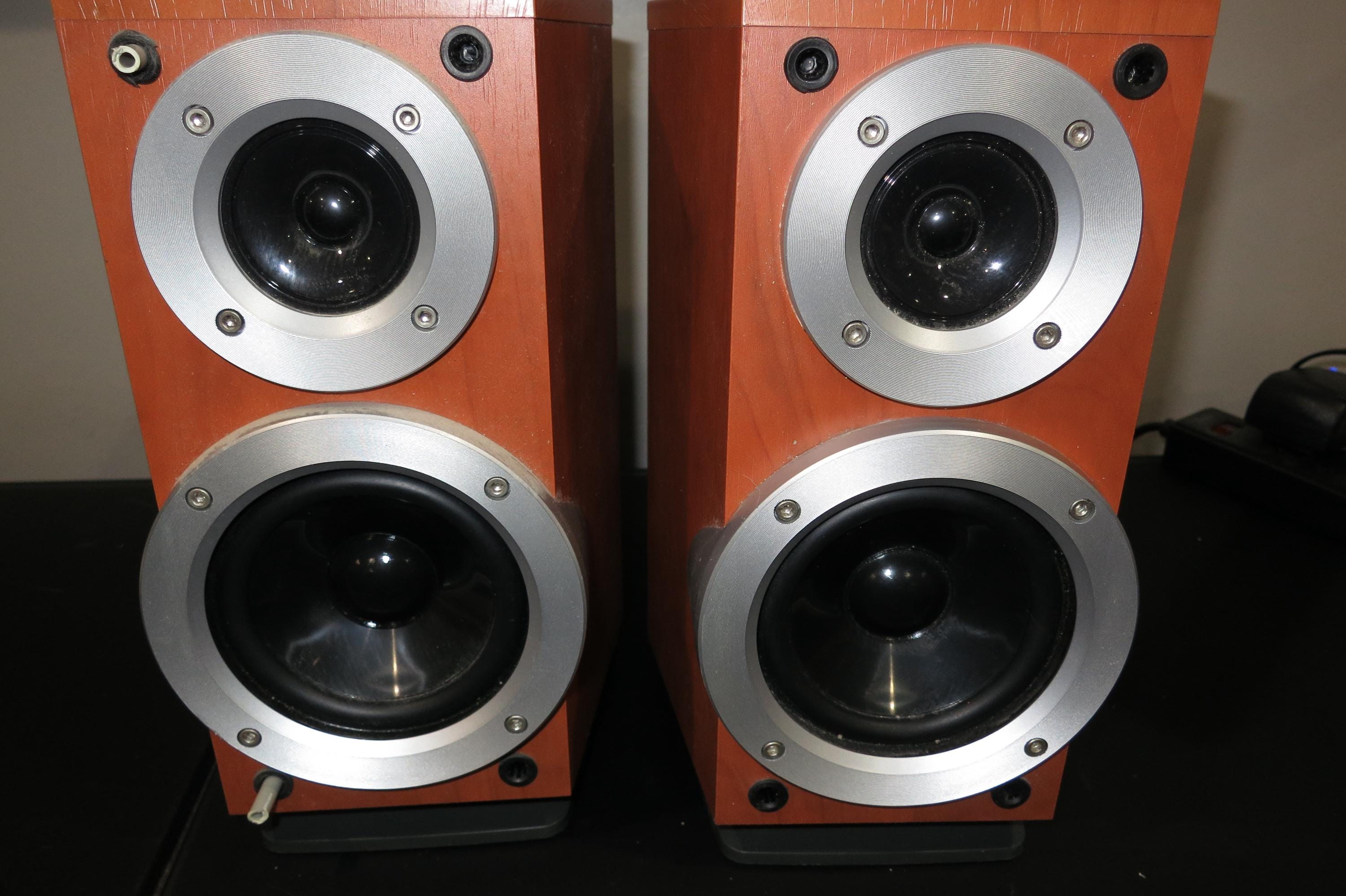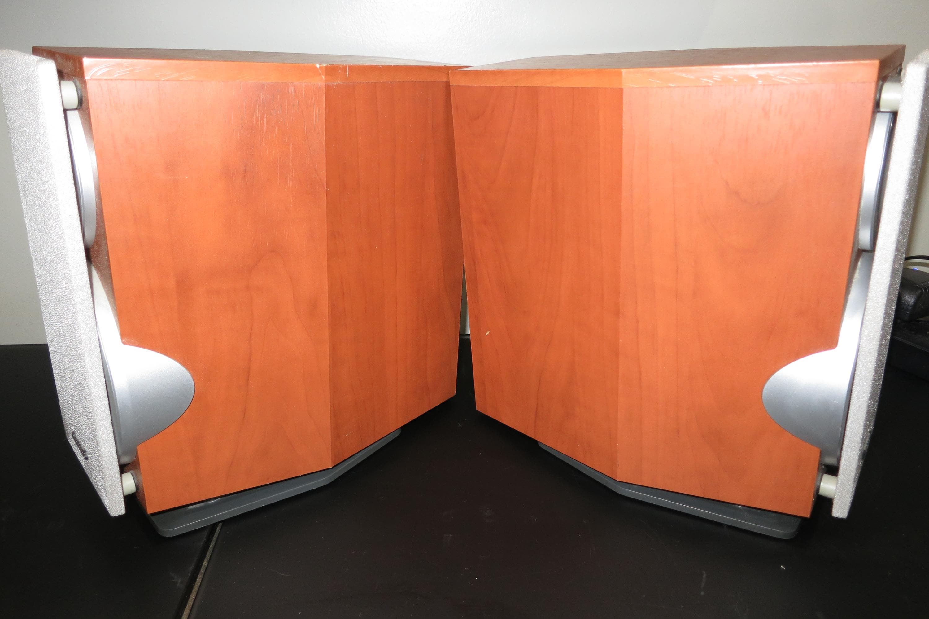 Pair of Vintage Panasonic SB-DP1 Bookshelf Stereo Speakers. Faux Wood Cabinets with Silver Covers. Great Sound and Retro Look! These measure 6 1/4 Inches Wide, 10 1/4 Inches Deep and 10 1/2 Inches Tall.