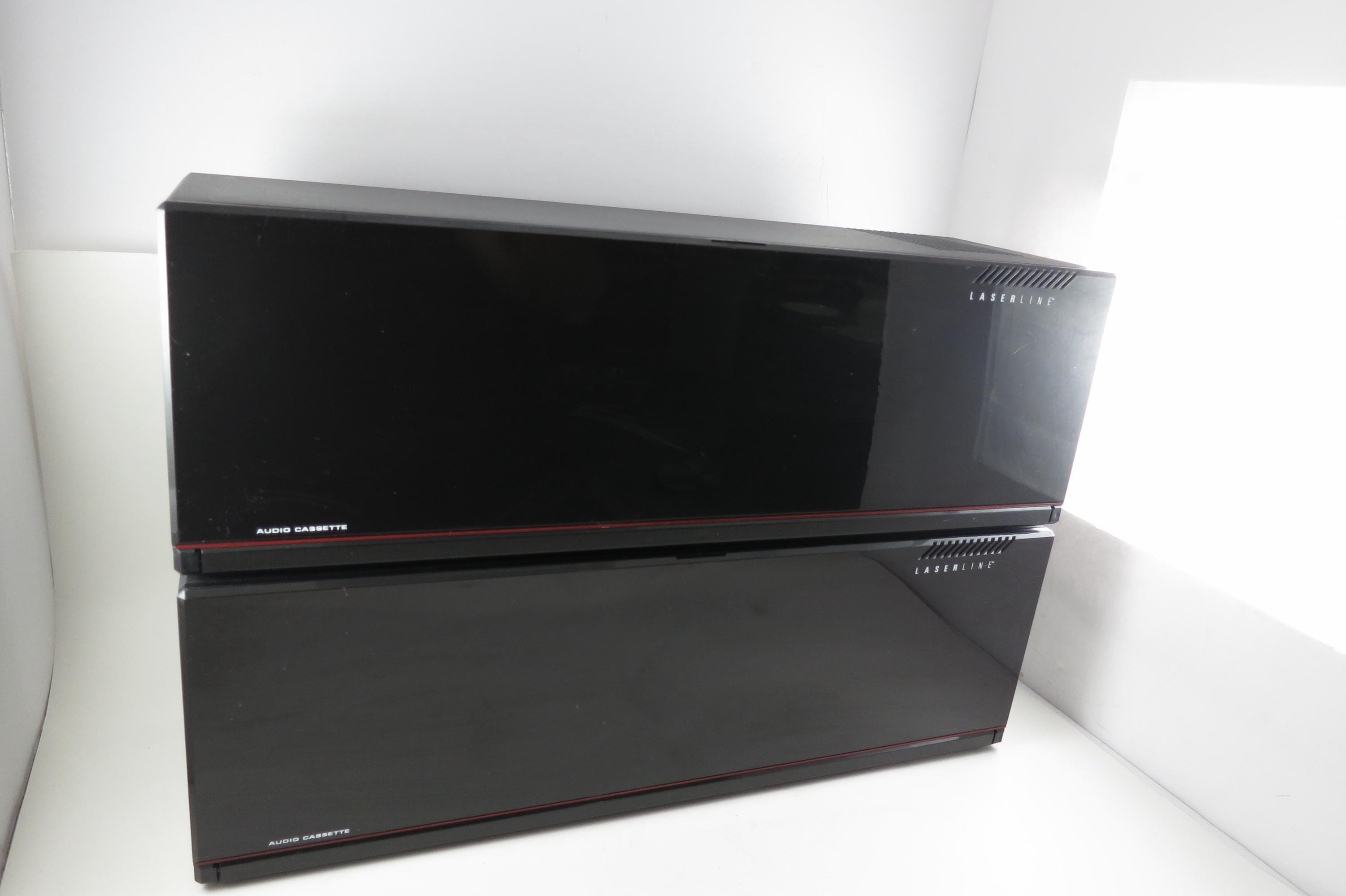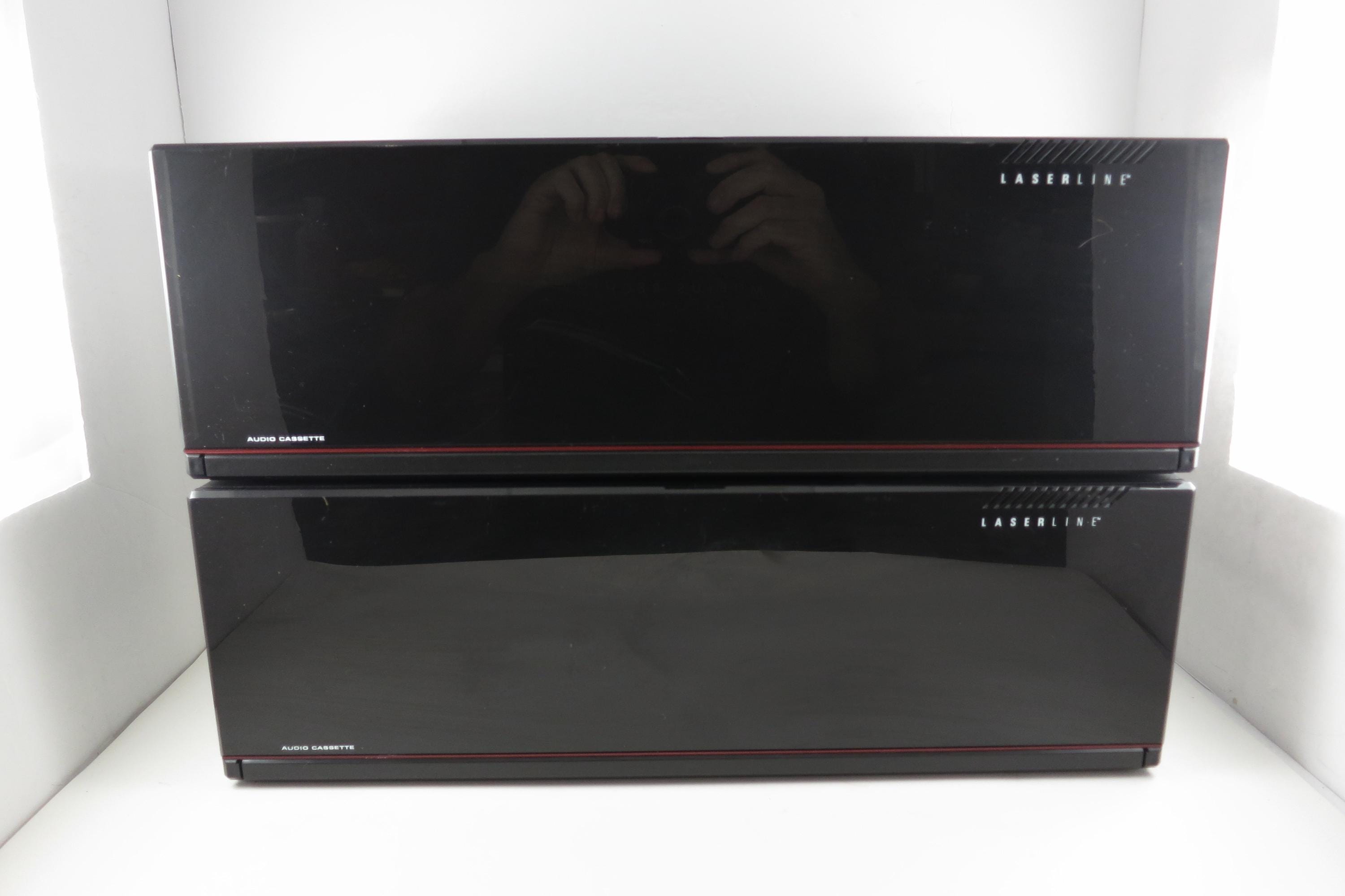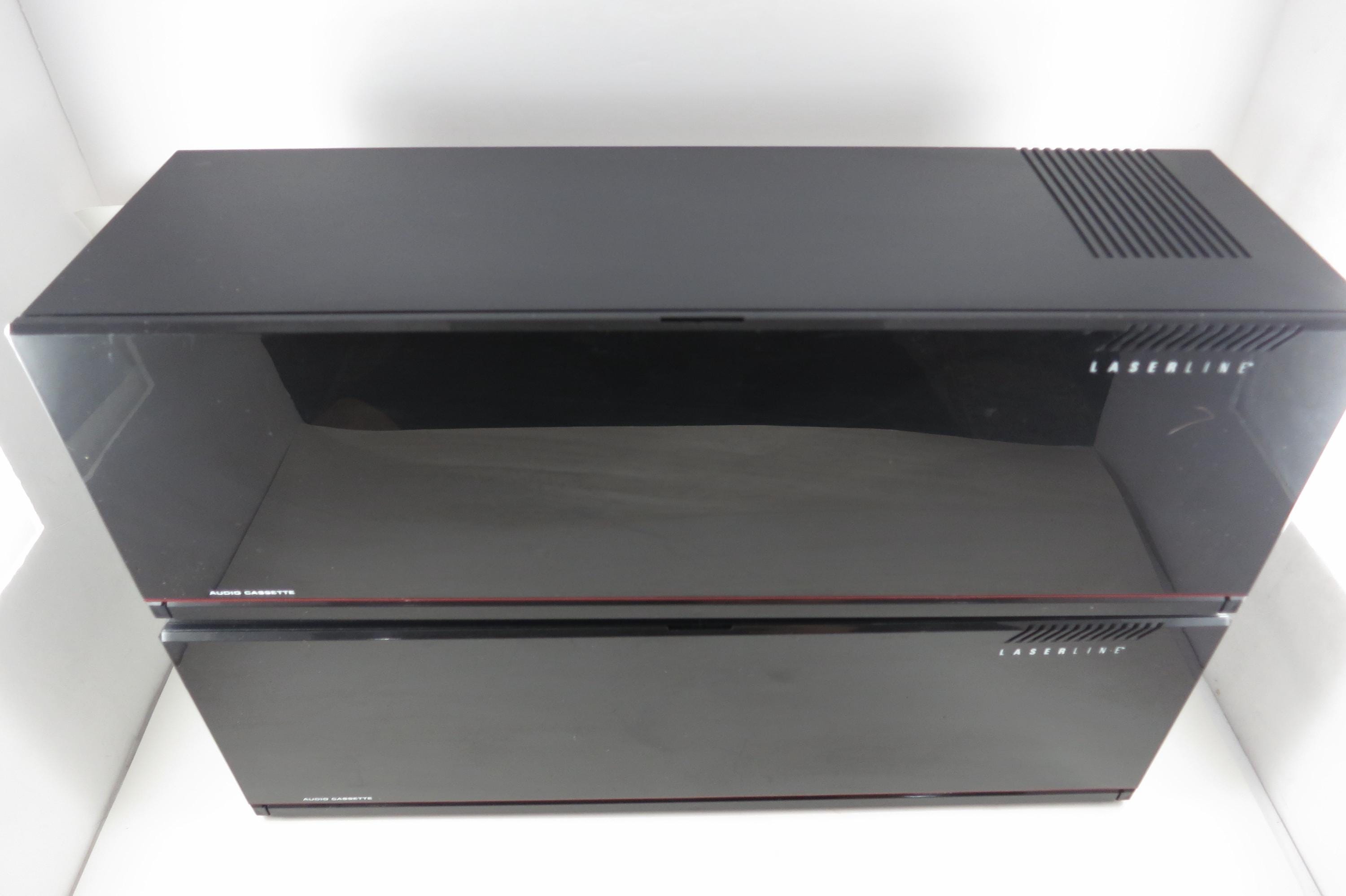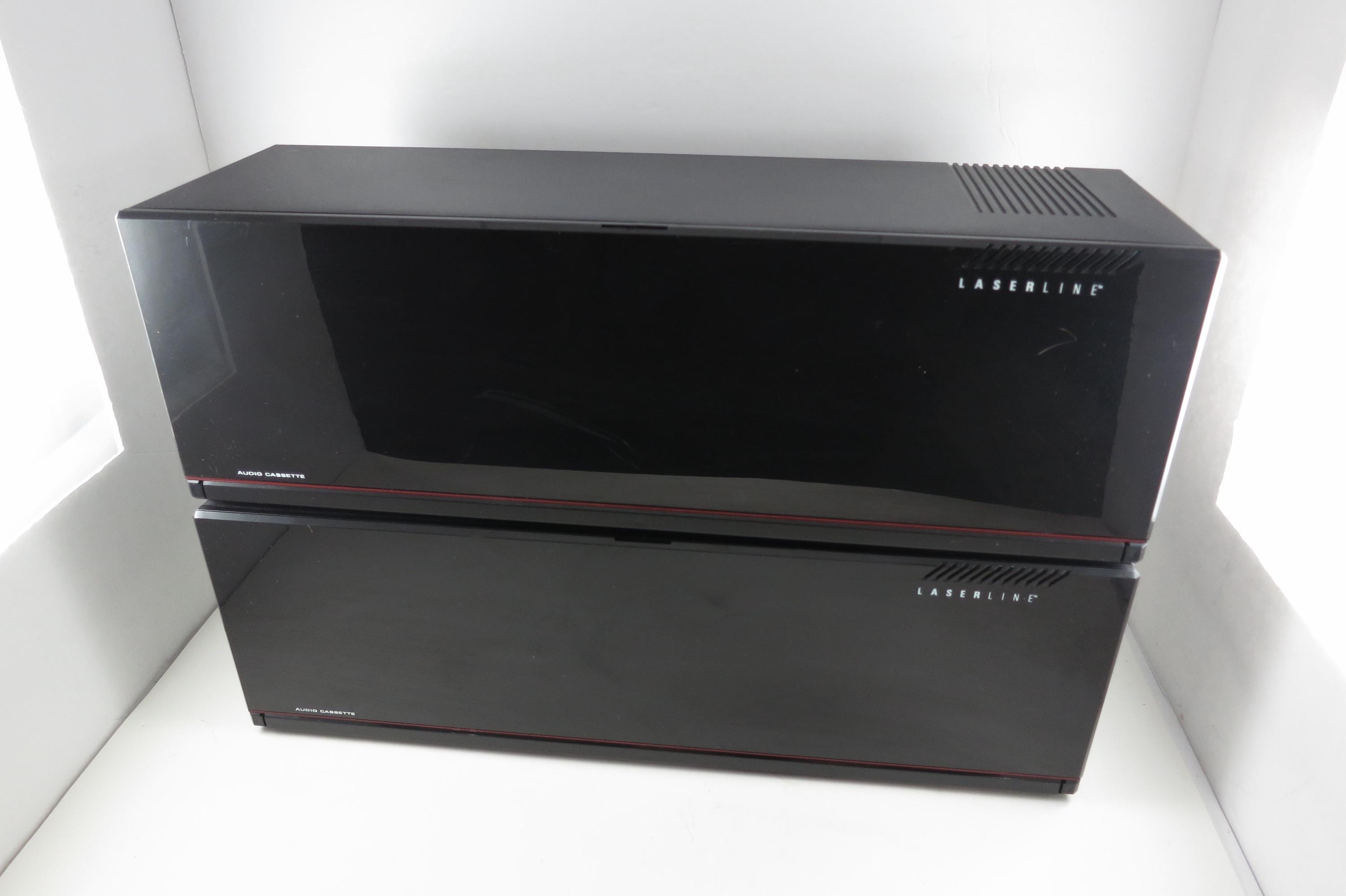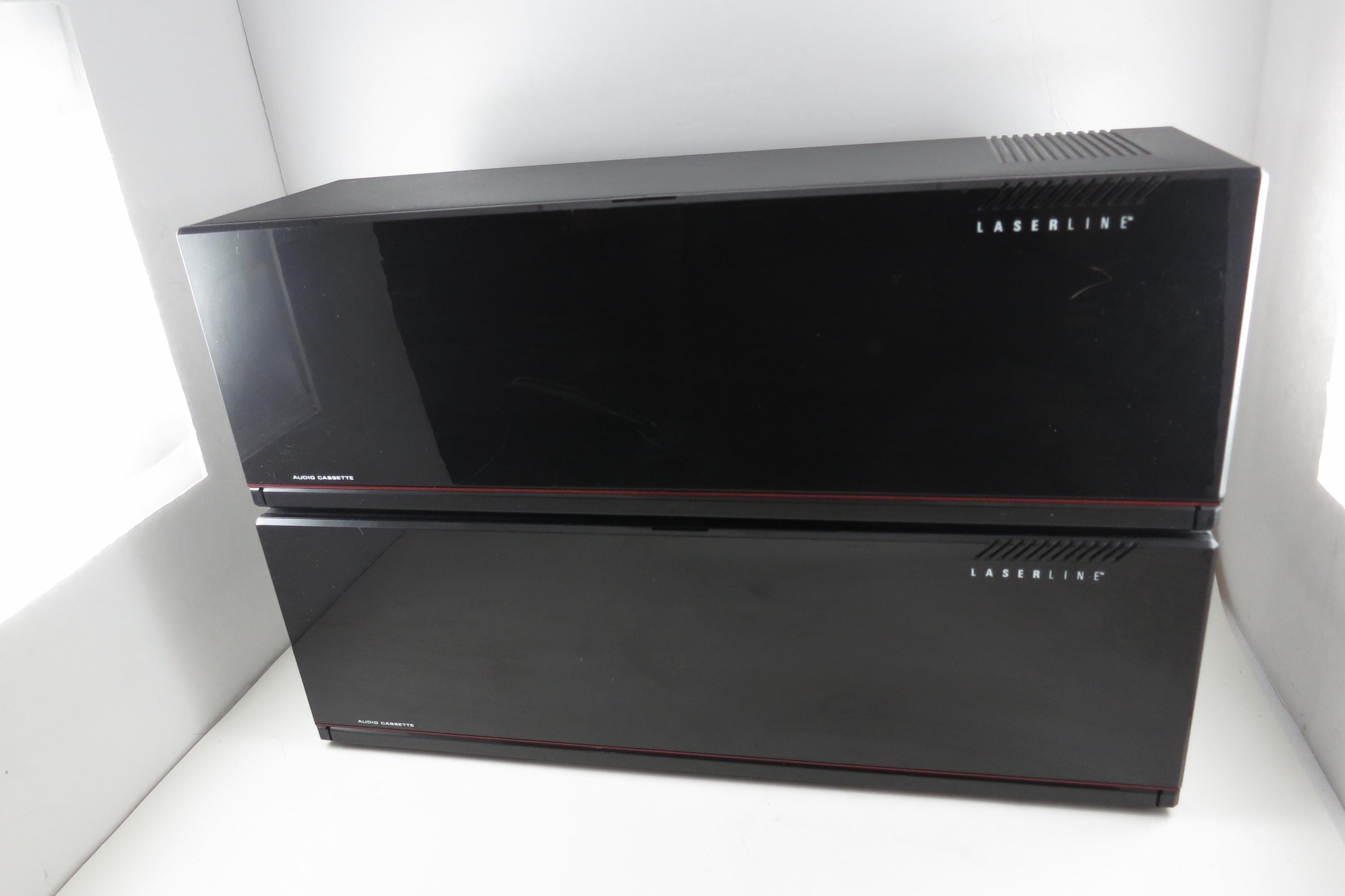 Pair of 1990's Black Laserline Cassette Holder 18 Cassettes Each Hard Plastic with Latch for Each Tape Flip down door. Very neat design, each Cassette space has a latch to hold the tapes in place! Door flips down in the front to hide the tapes but can be easily removed. This listing is for two cases, each holds 18 tapes, they can be stacked as shown or used individually. Each measures 16 1/2 inches wide, 5 3/4 inches deep and 5 1/2 inches tall.