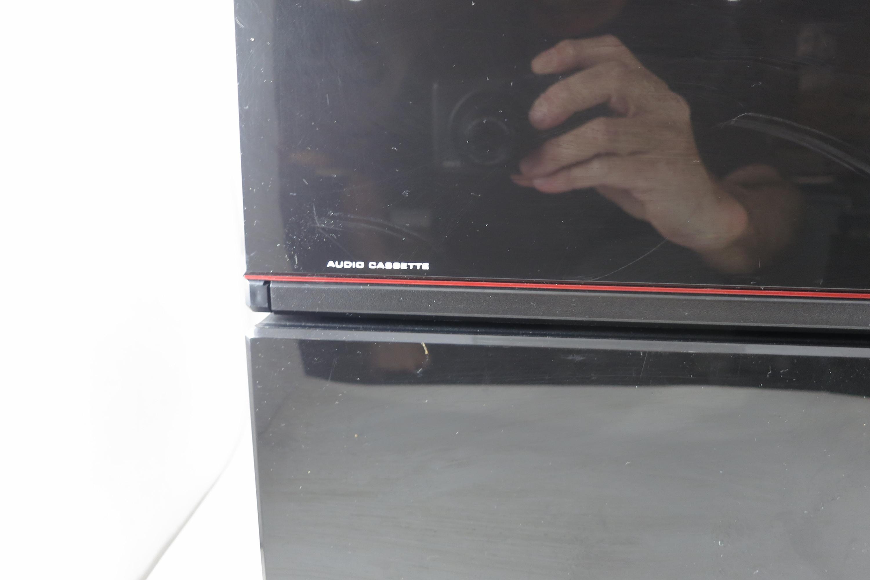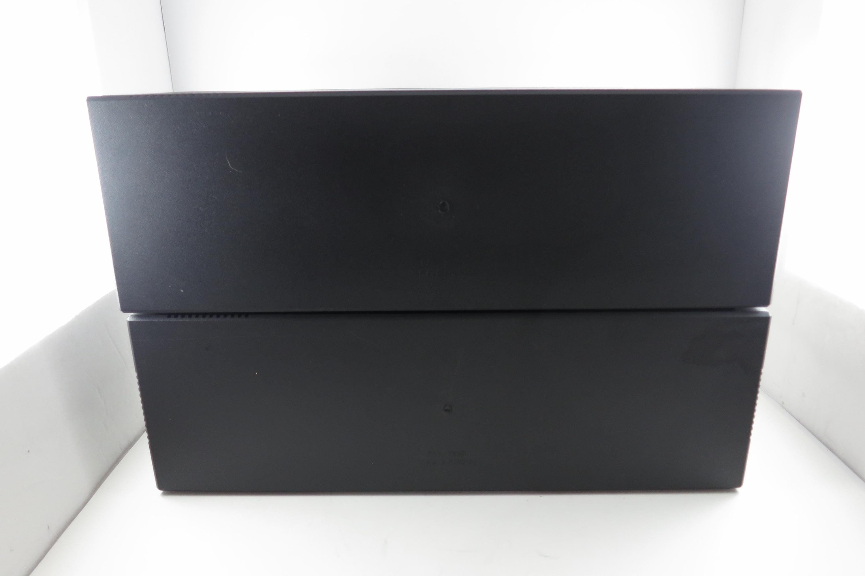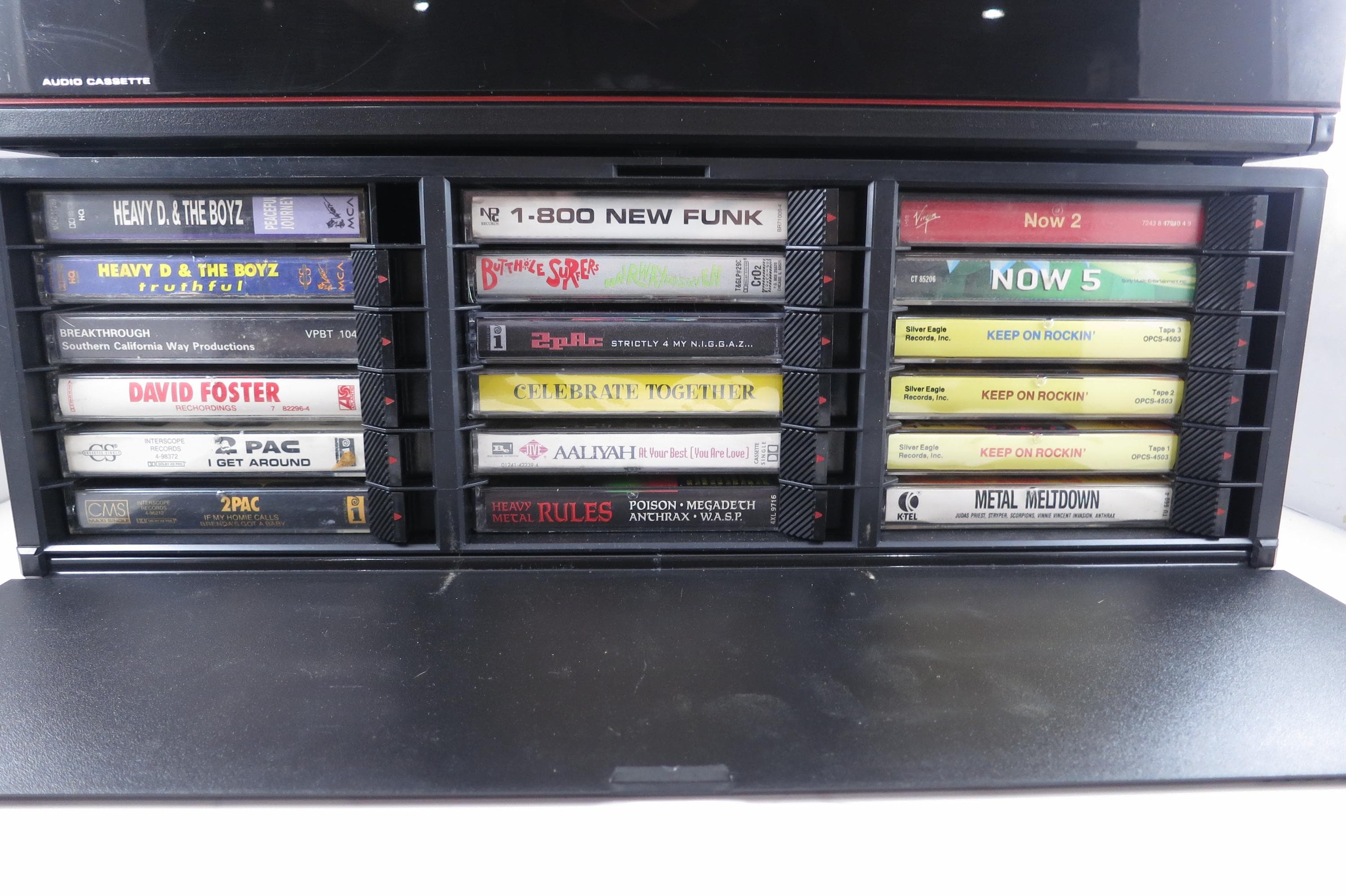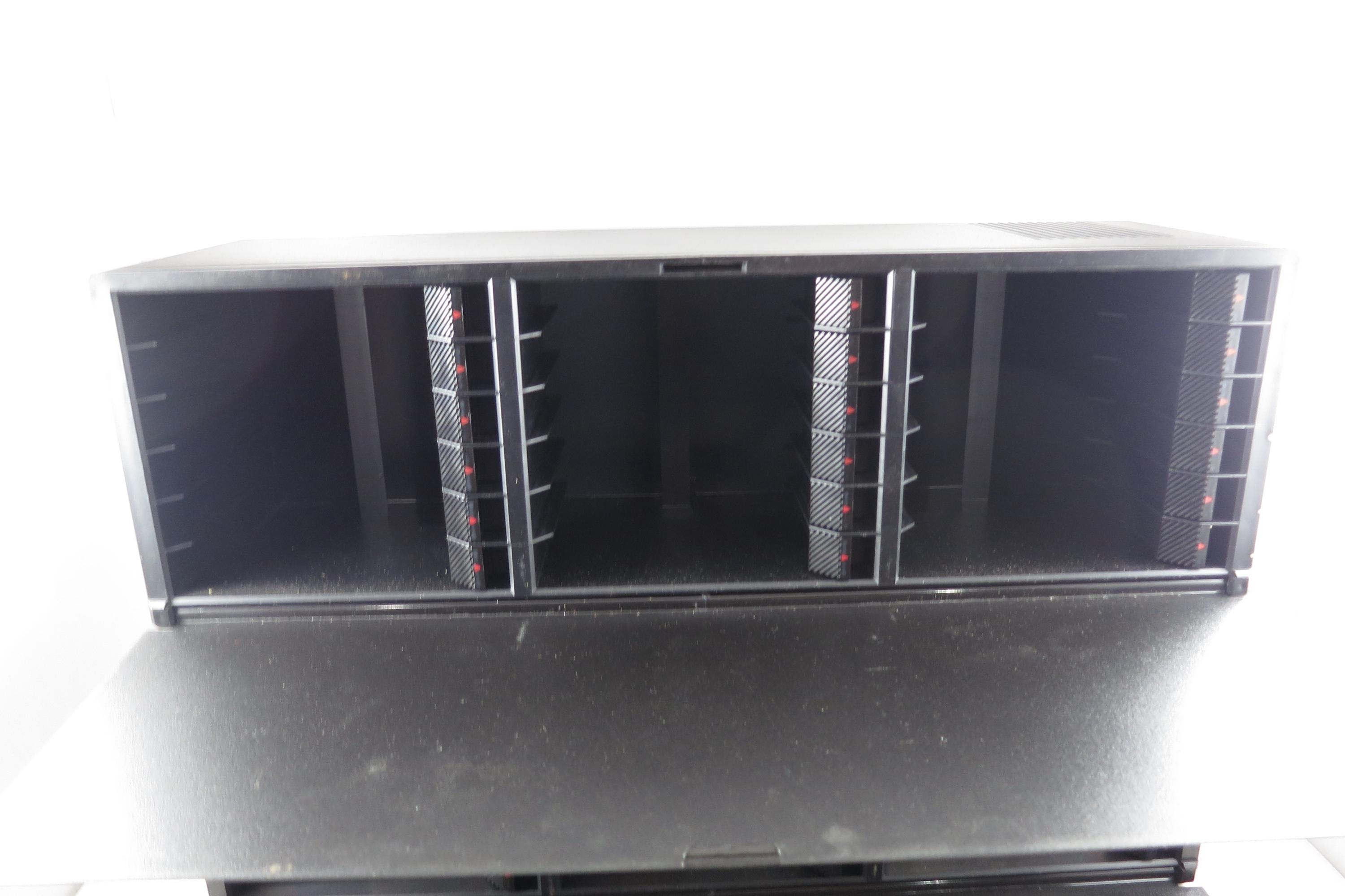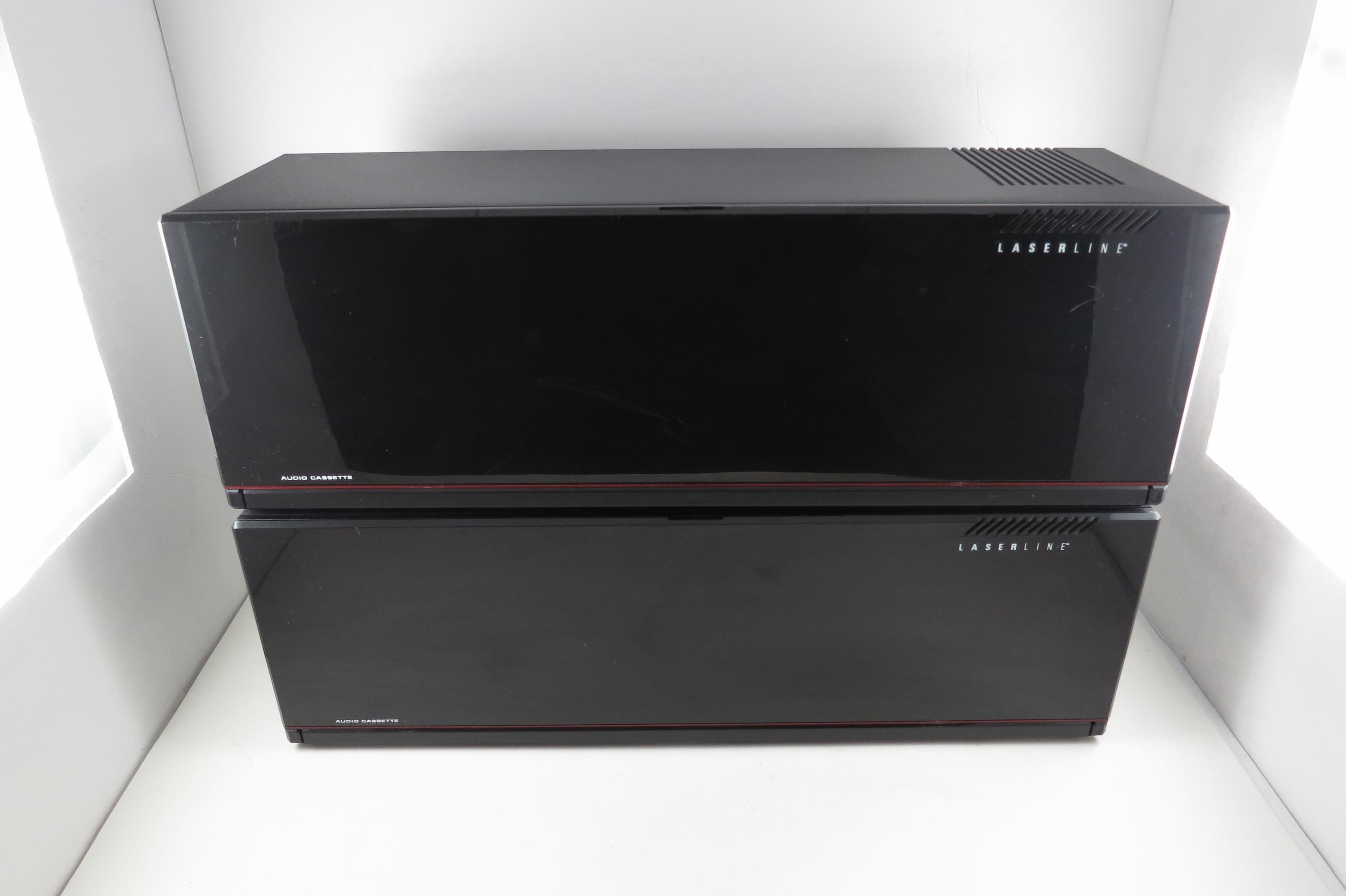 Pair of 1990's Black Laserline Cassette Holder 18 Cassettes Each Hard Plastic with Latch for Each Tape Flip down door. Very neat design, each Cassette space has a latch to hold the tapes in place! Door flips down in the front to hide the tapes but can be easily removed. This listing is for two cases, each holds 18 tapes, they can be stacked as shown or used individually. Each measures 16 1/2 inches wide, 5 3/4 inches deep and 5 1/2 inches tall.