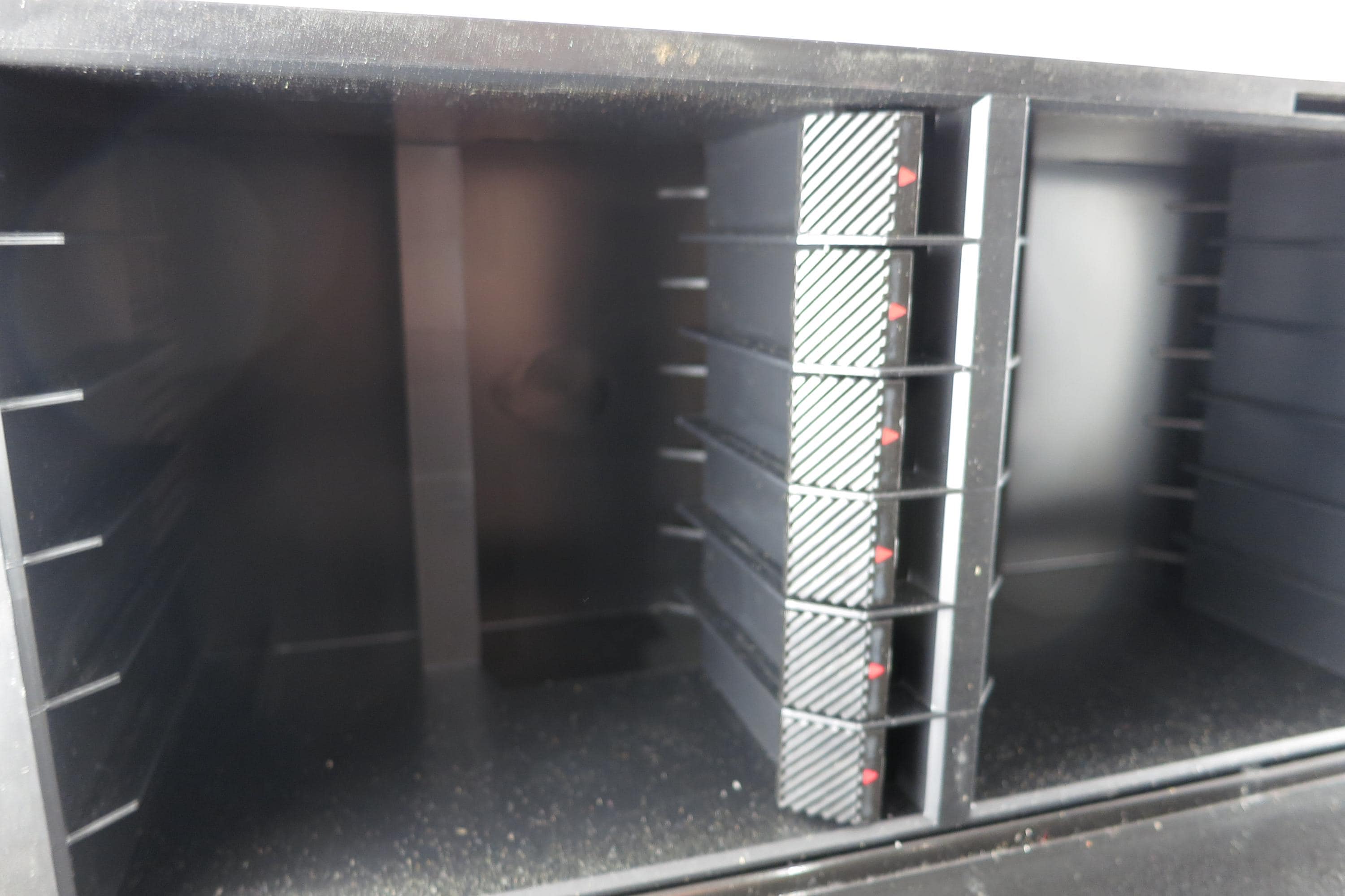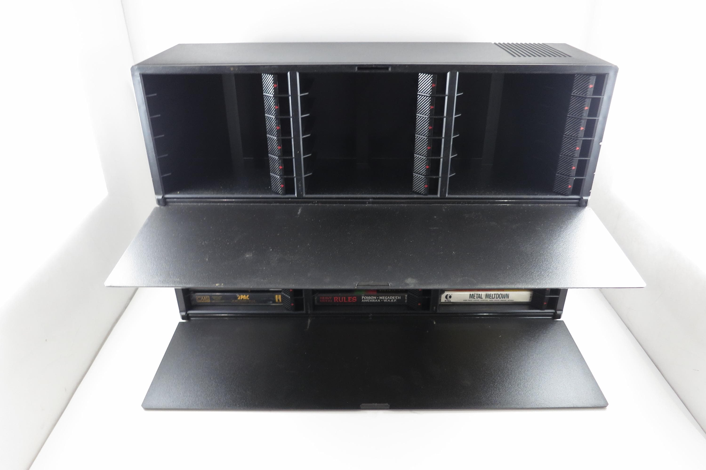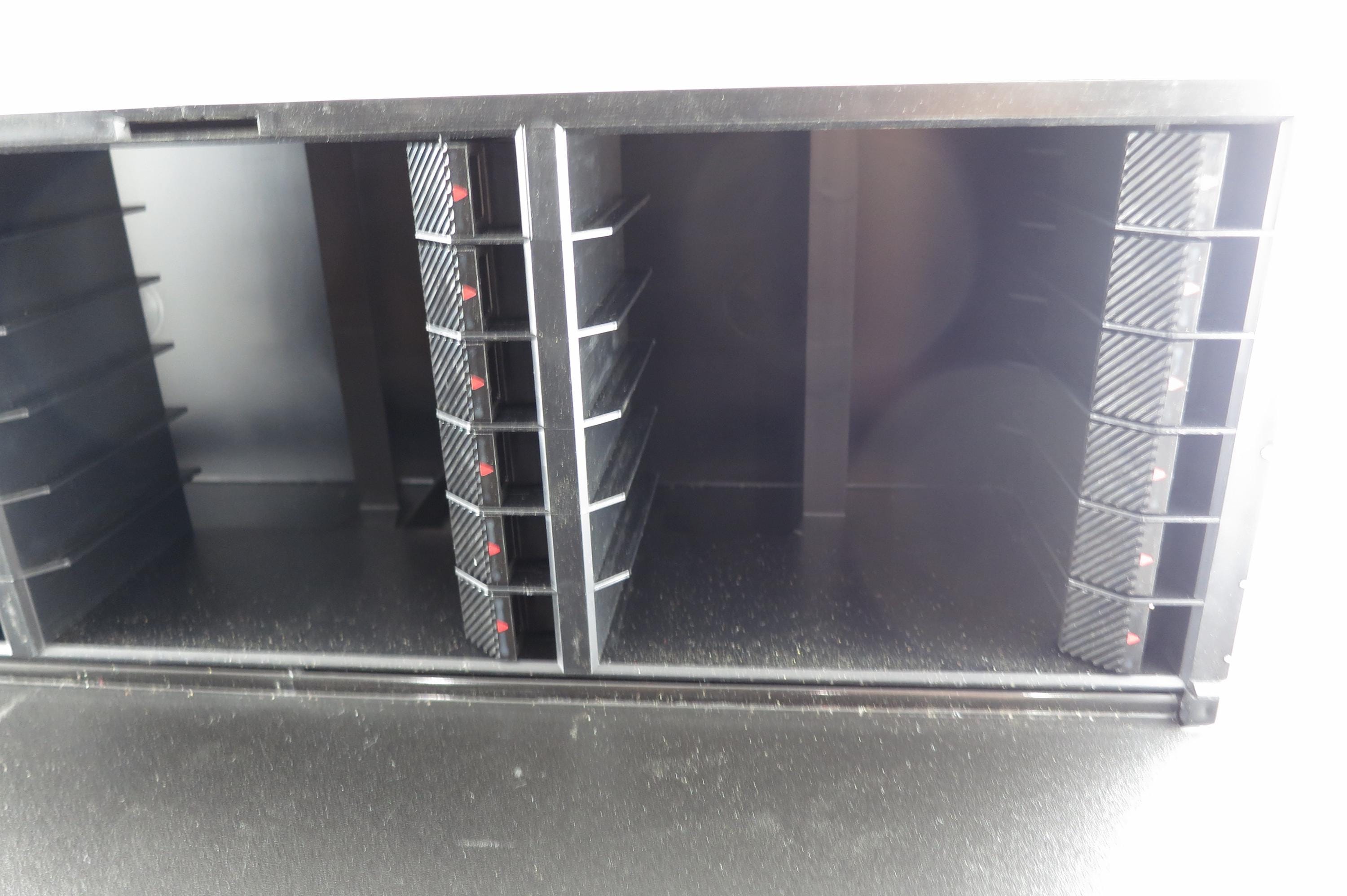 Pair of 1990's Black Laserline Cassette Holder 18 Cassettes Each Hard Plastic with Latch for Each Tape Flip down door
