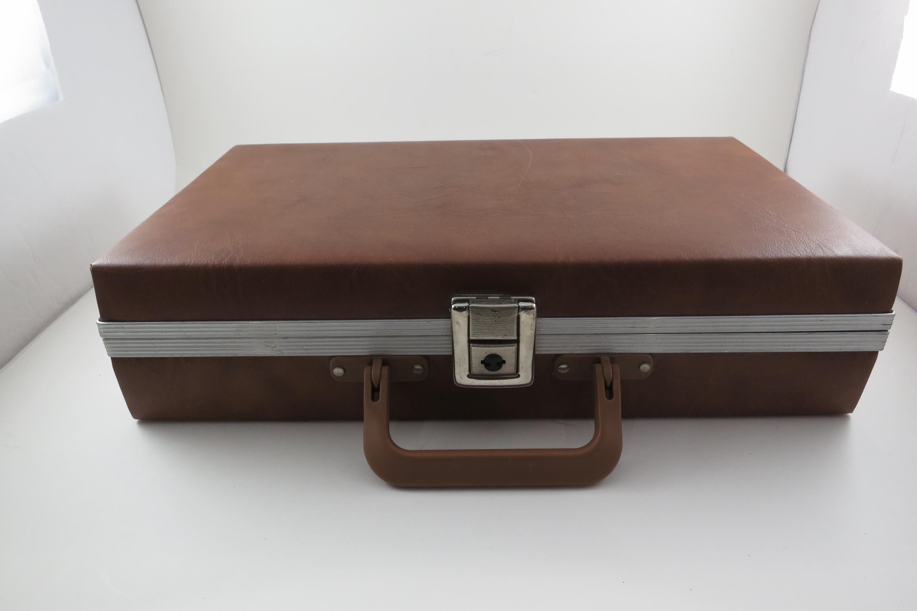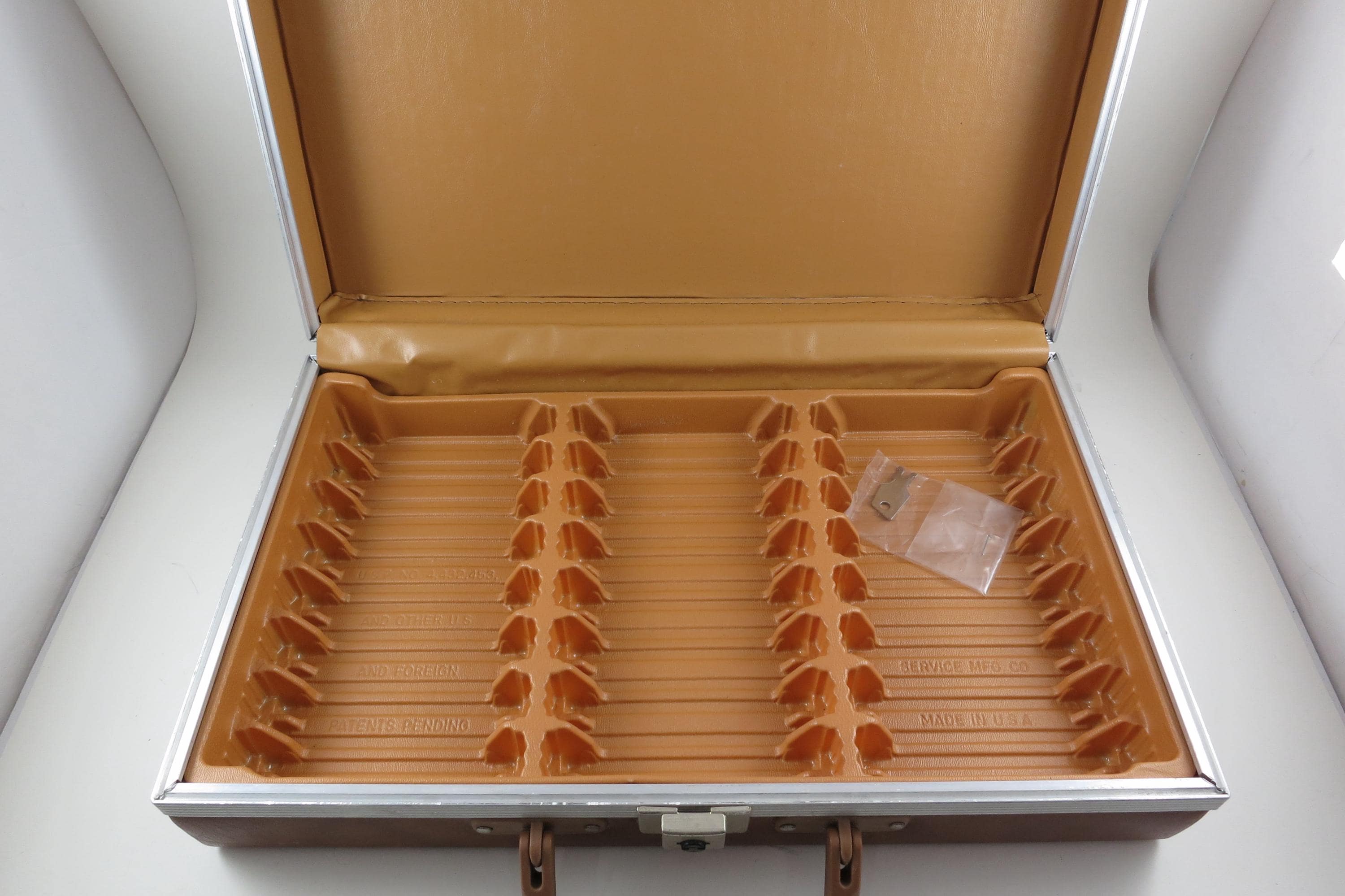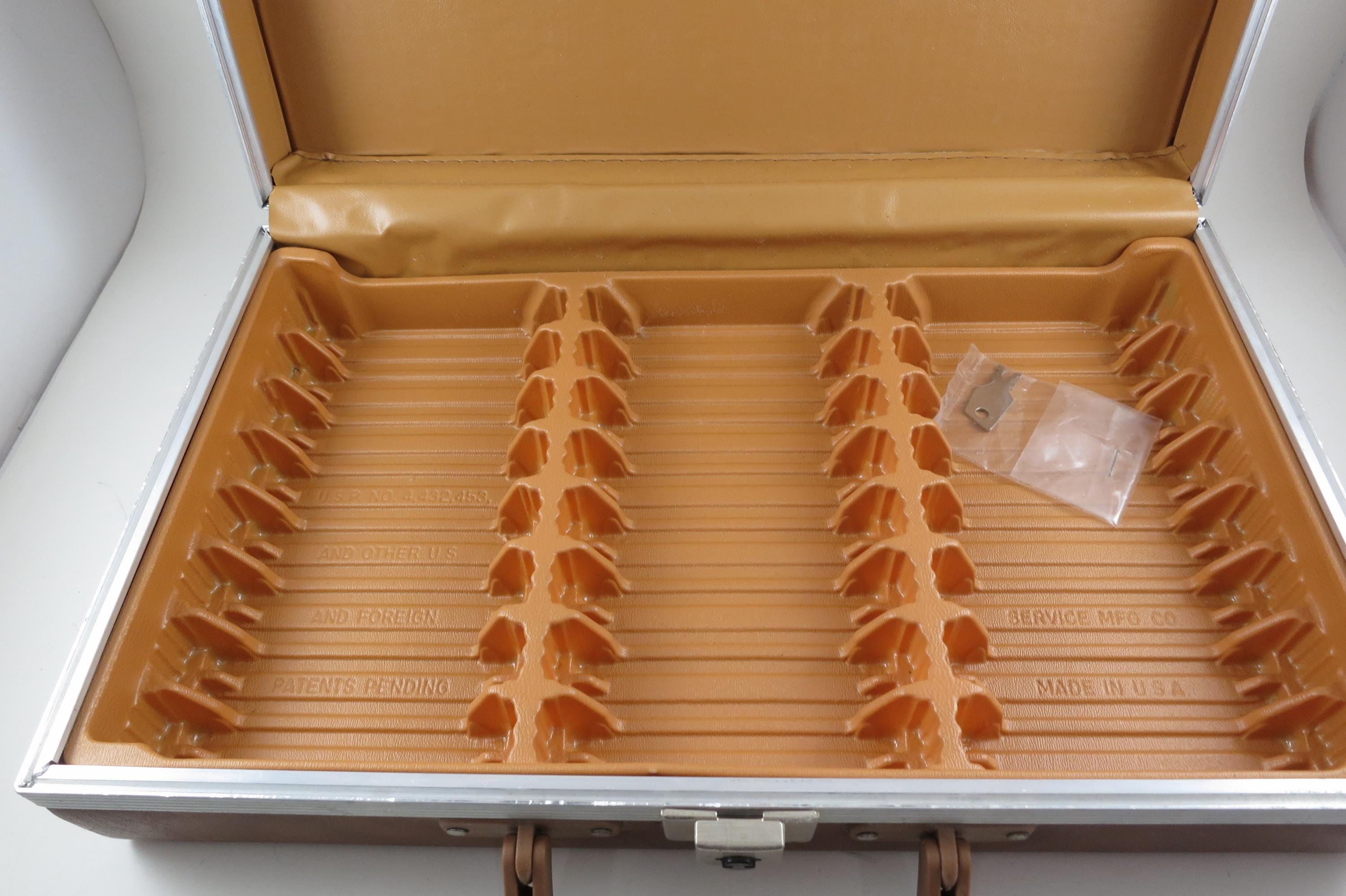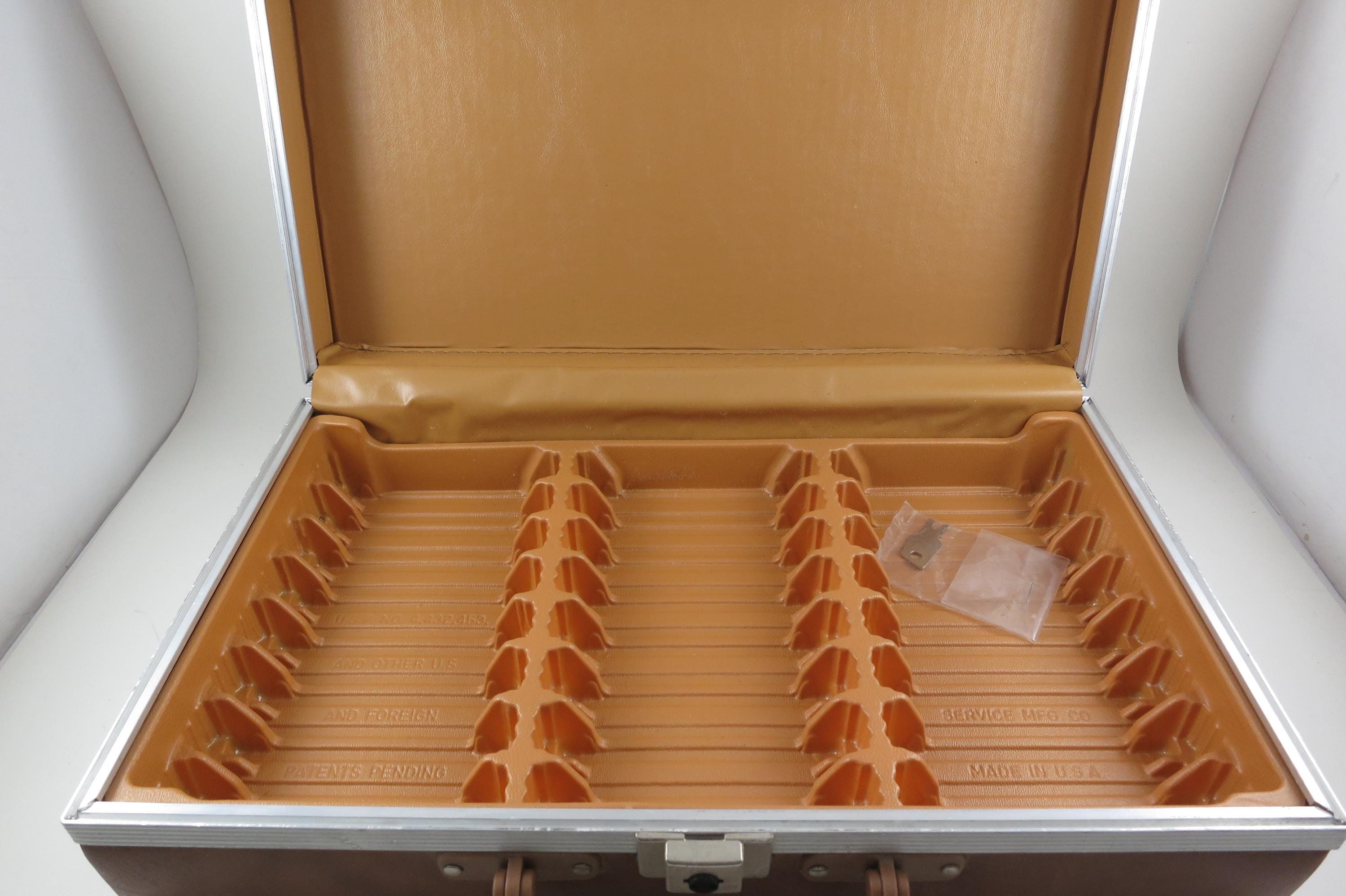 Service Mfg Co 24 Cassette Hard Shell Carrying Case Faux Brown Leather Double Latches and Handle Excellent Condition. Holds 24 tapes, three rows of eight. Latch, lock and the original key are included. Perfect for your vintage cassette tapes!