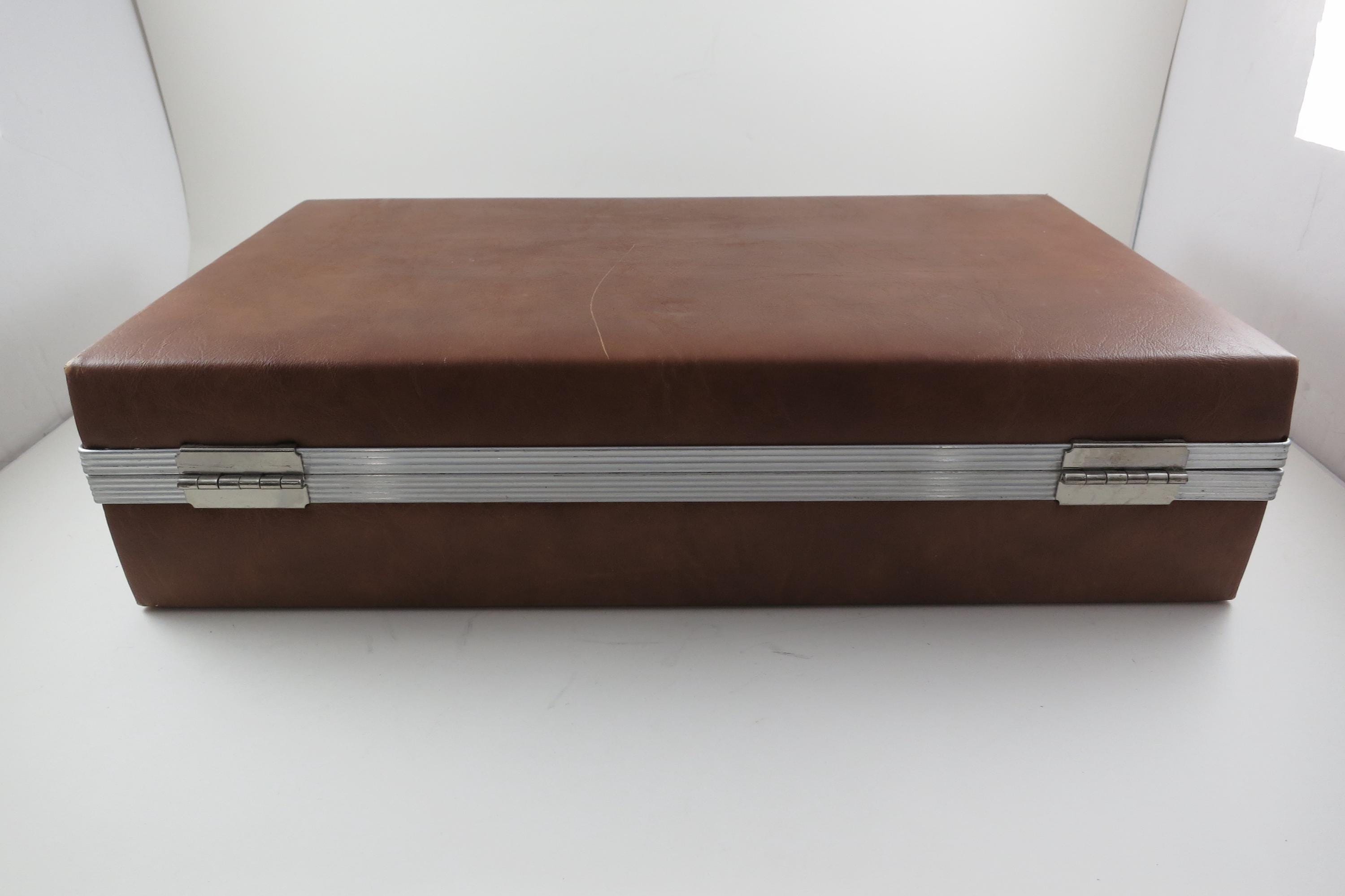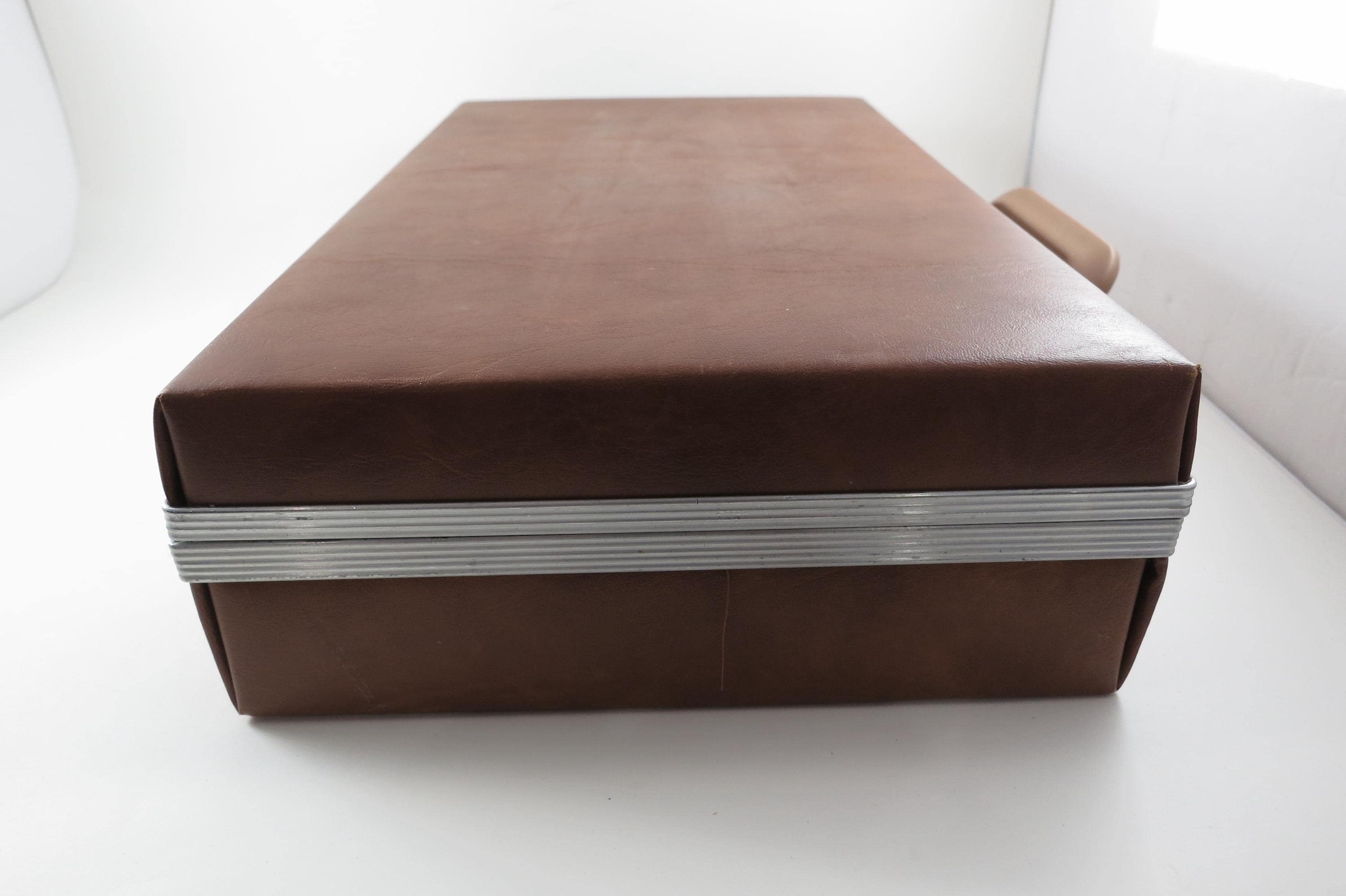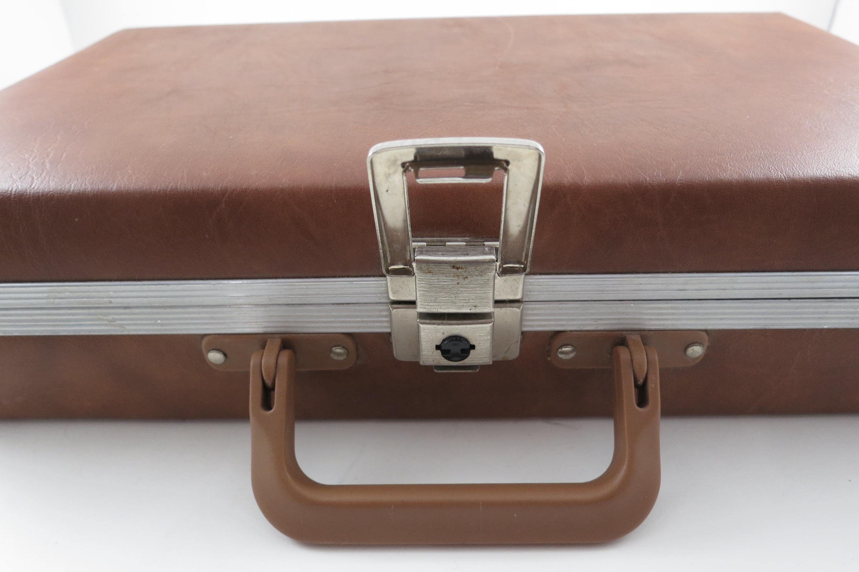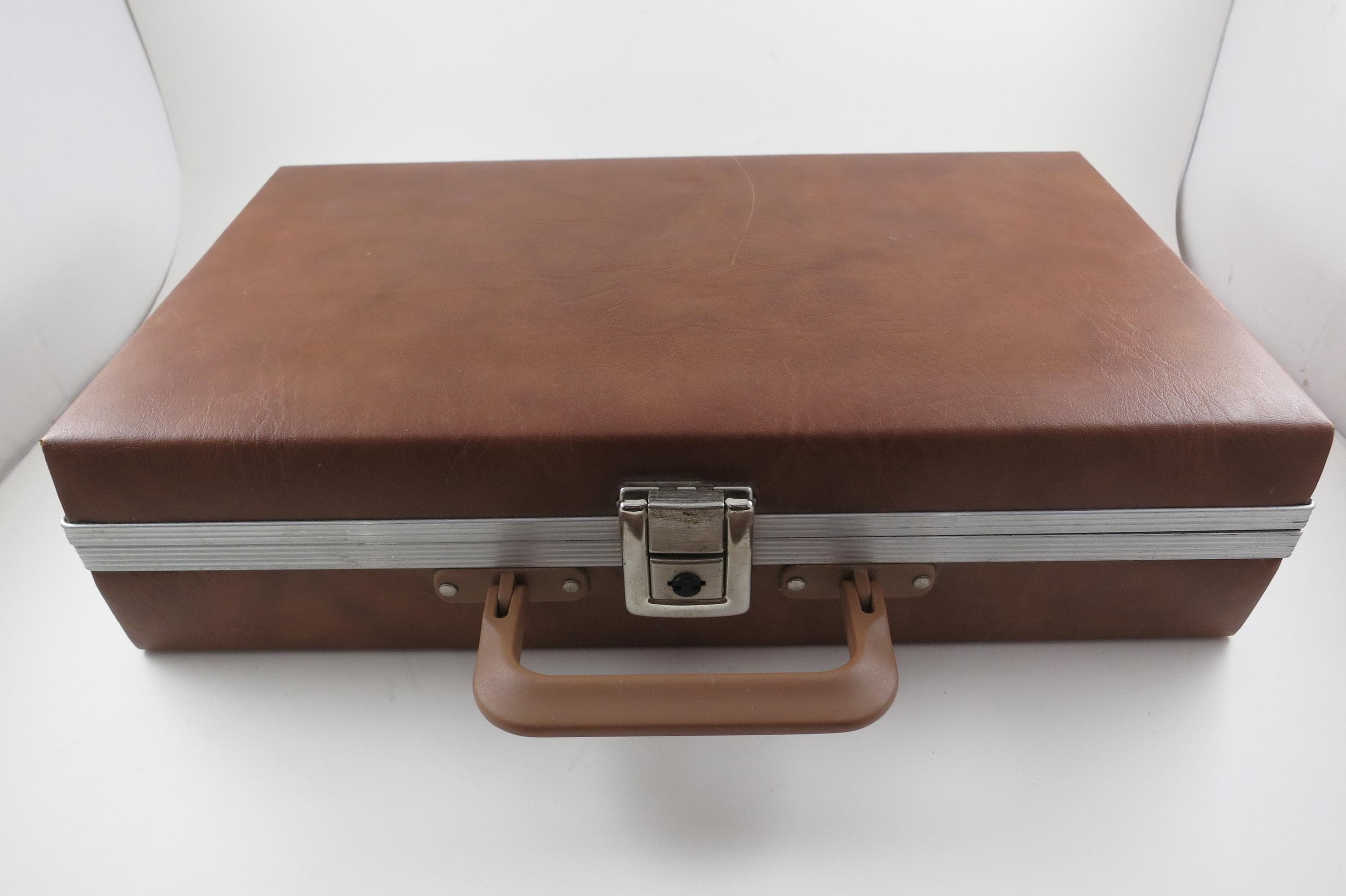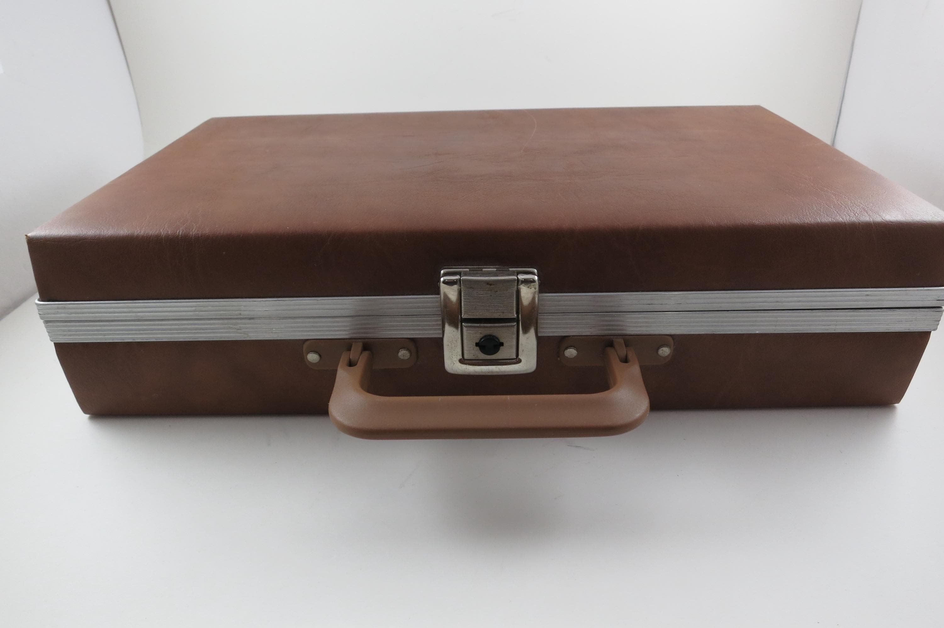 Service Mfg Co 24 Cassette Hard Shell Carrying Case Faux Brown Leather Double Latches and Handle Excellent Condition. Holds 24 tapes, three rows of eight. Latch, lock and the original key are included. Perfect for your vintage cassette tapes!