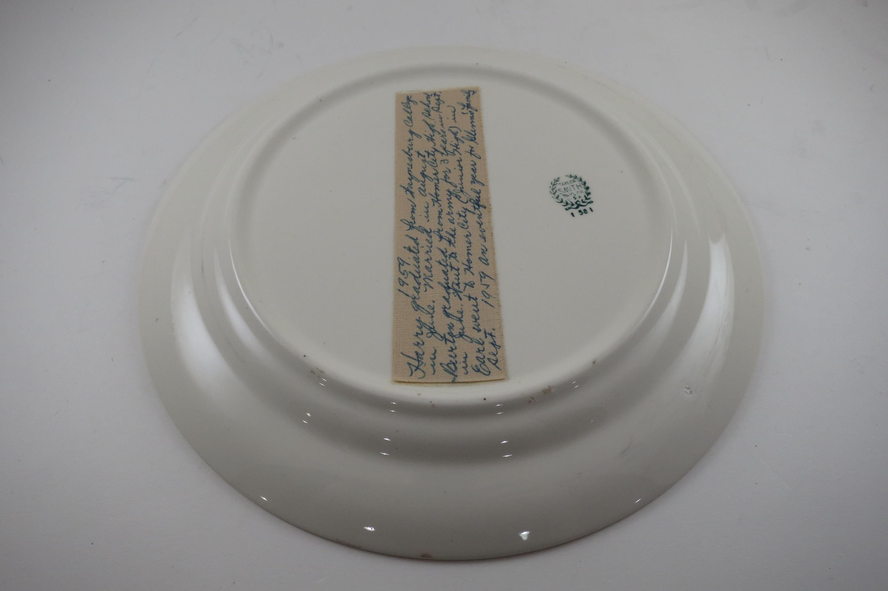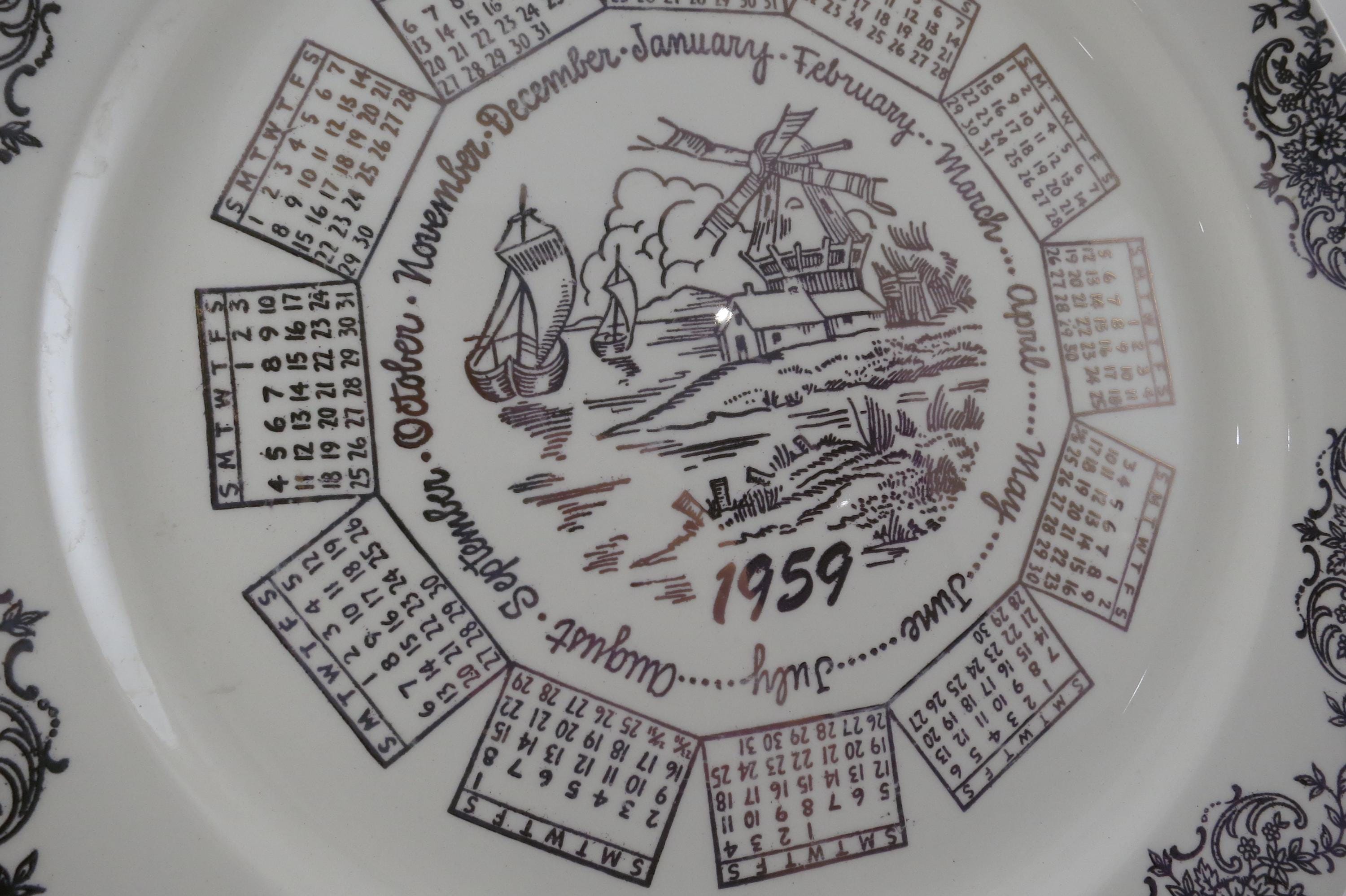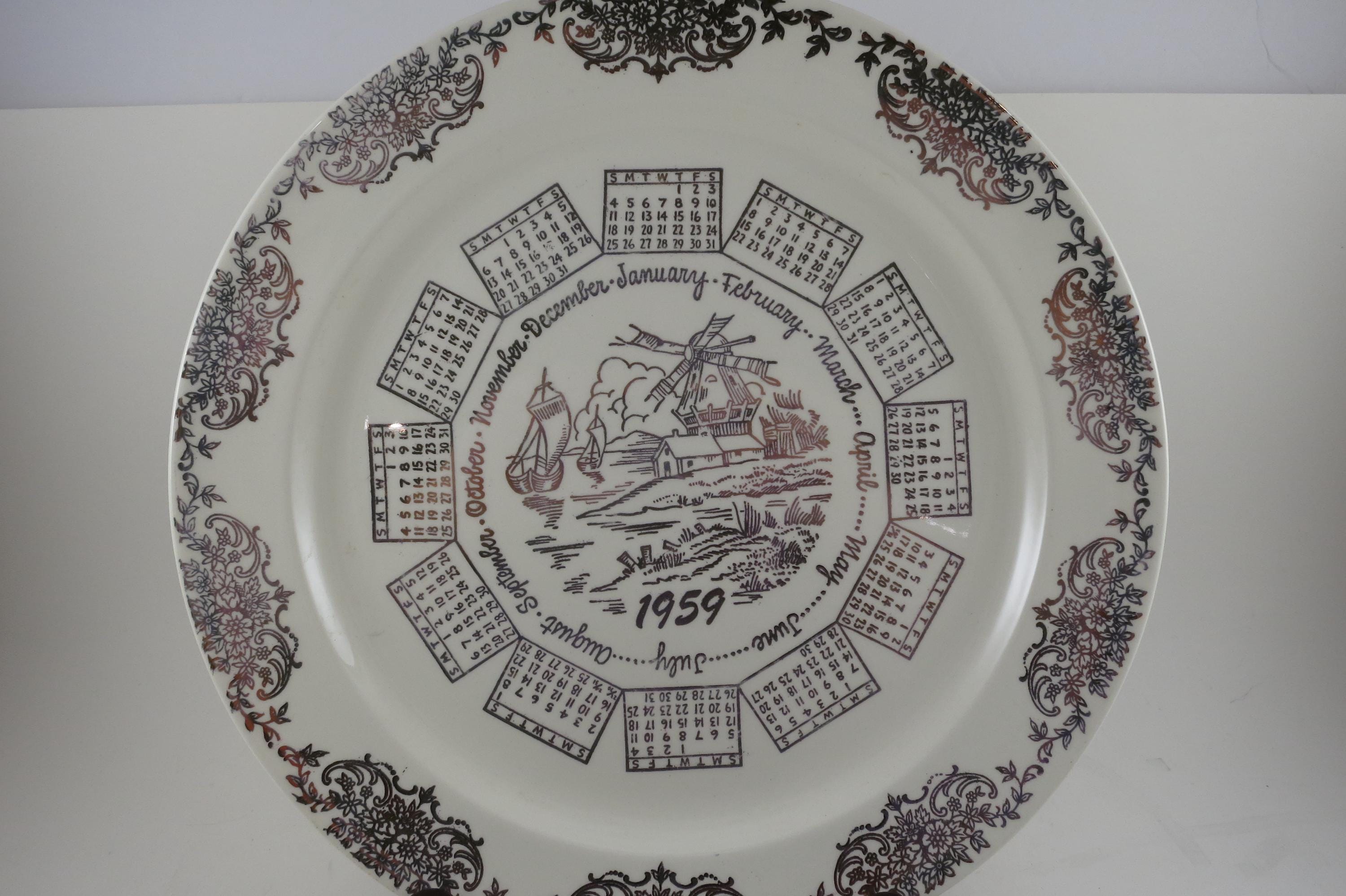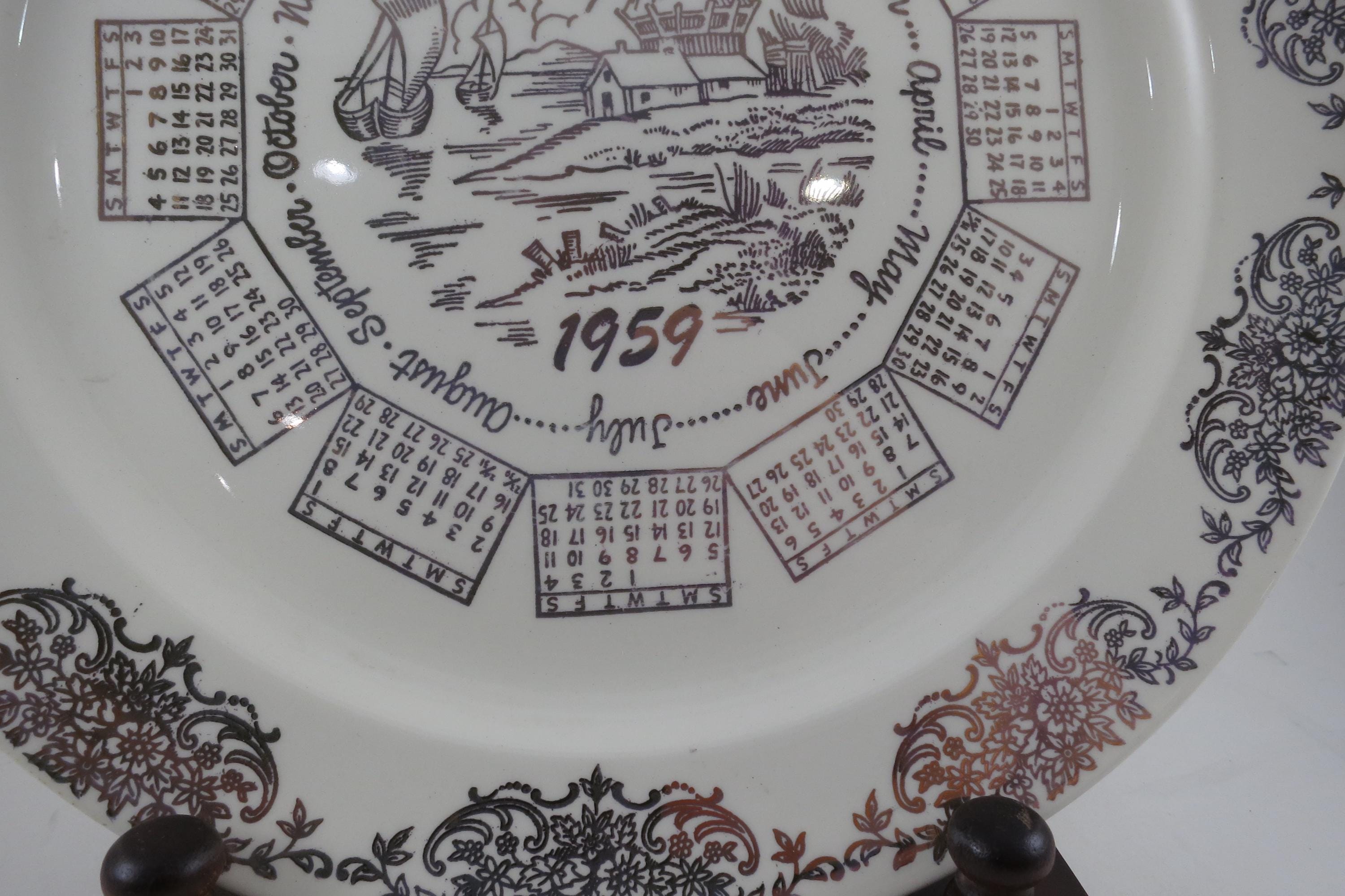 Vintage 1959 Calendar Plate Taylor Smith Taylor Ivory Gold Accents with Family Note.