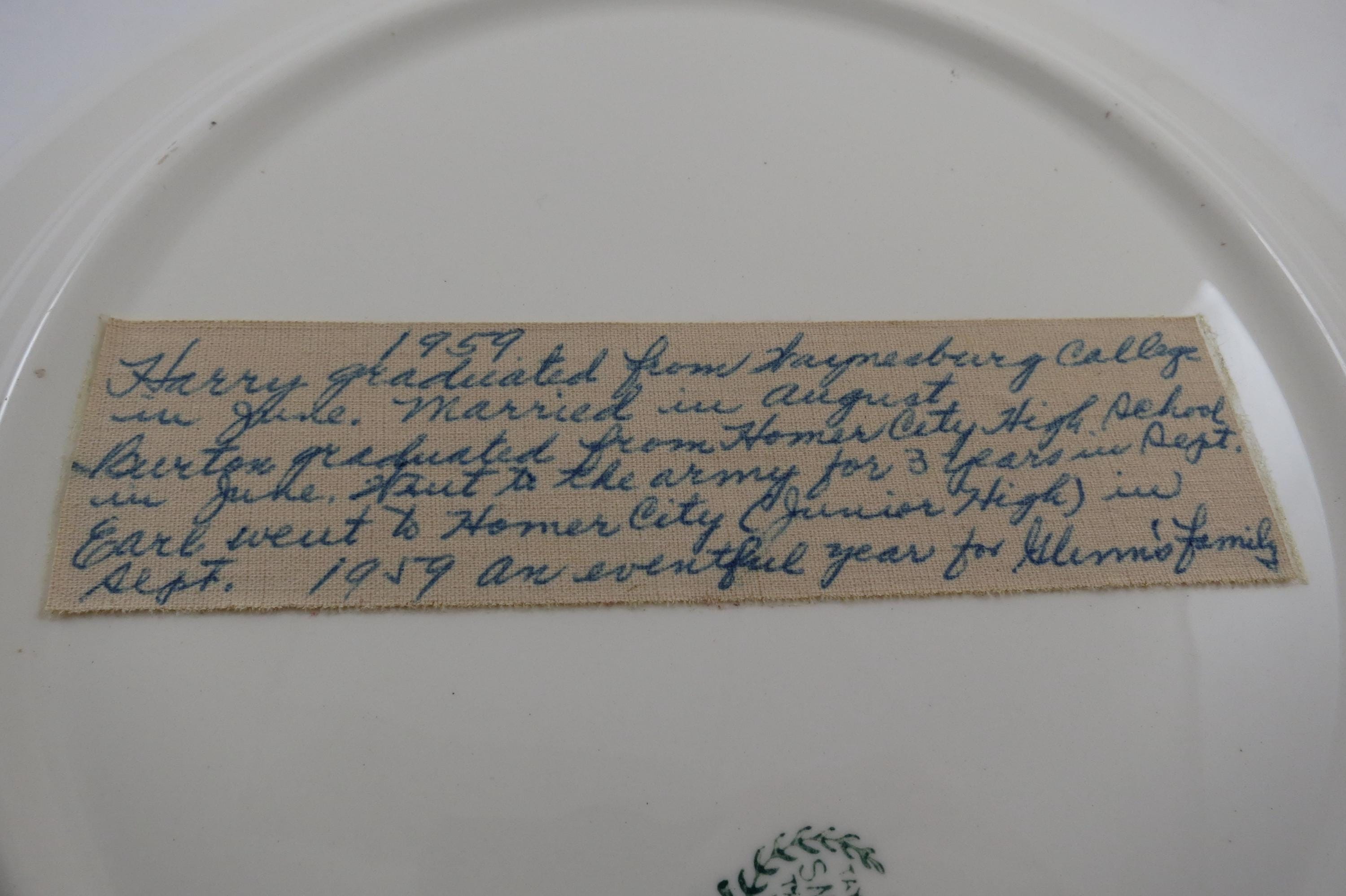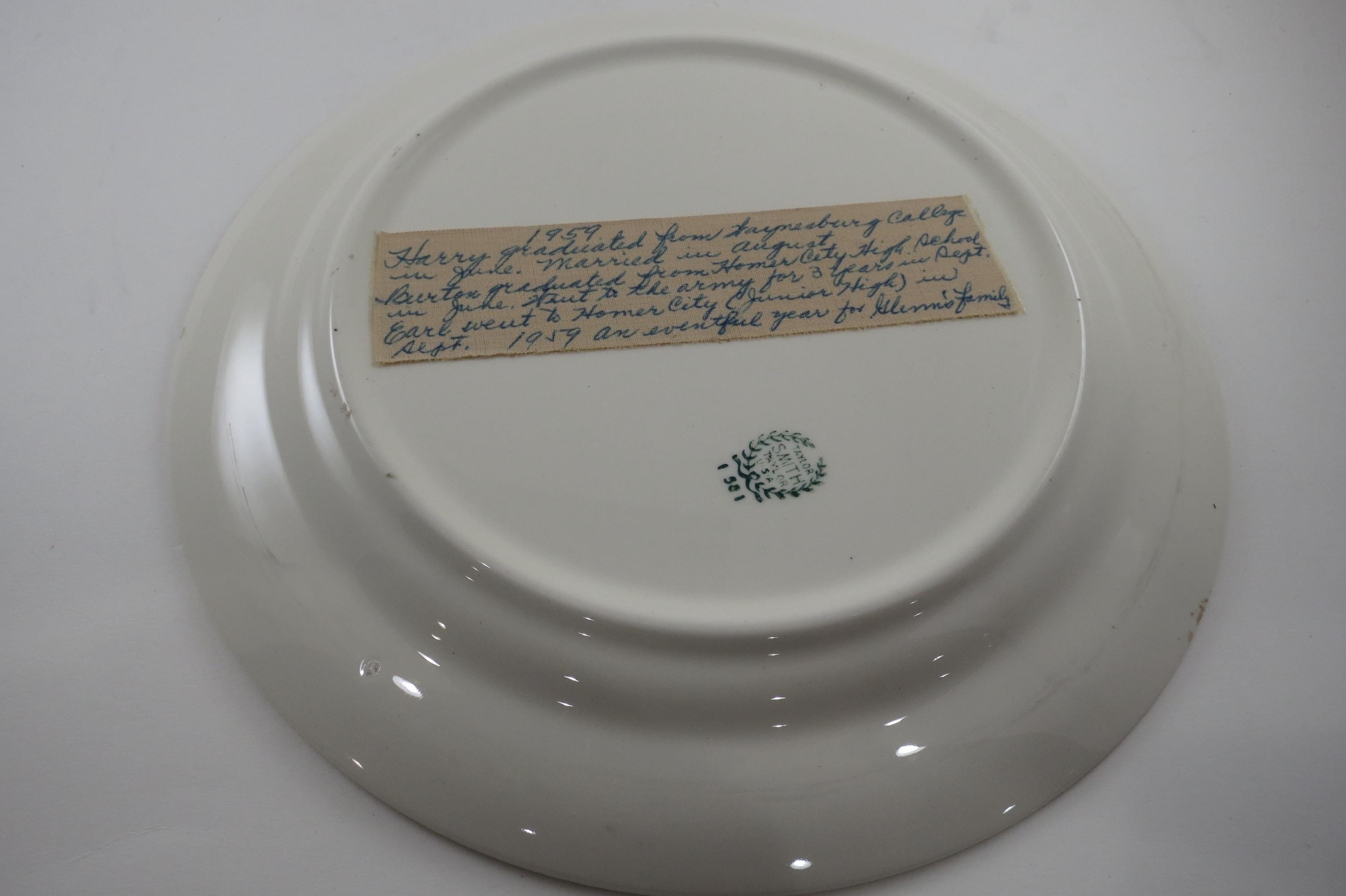 This is a 10 inch plate in excellent condition with no damages. Has an old family note taped to the back detailing a busy family year.
