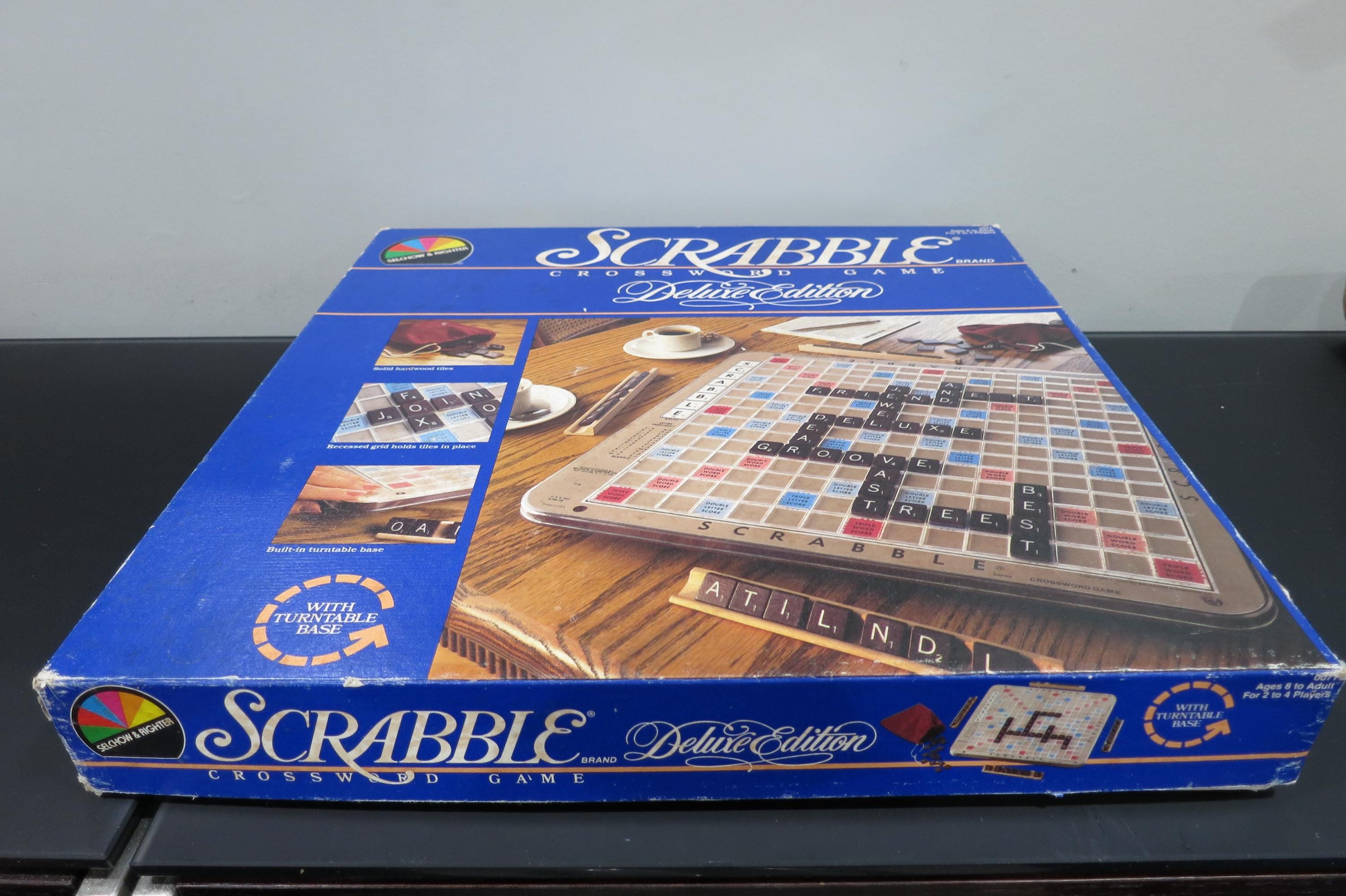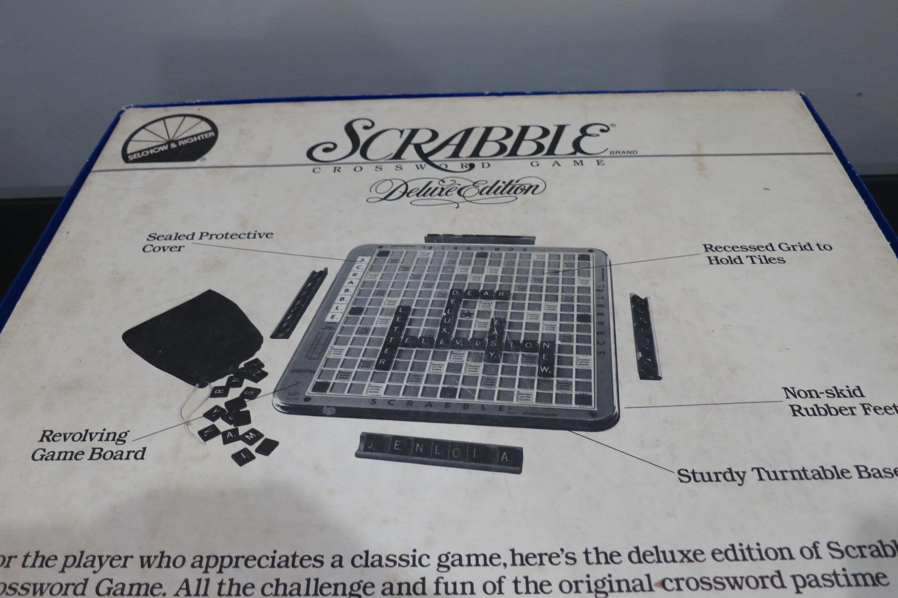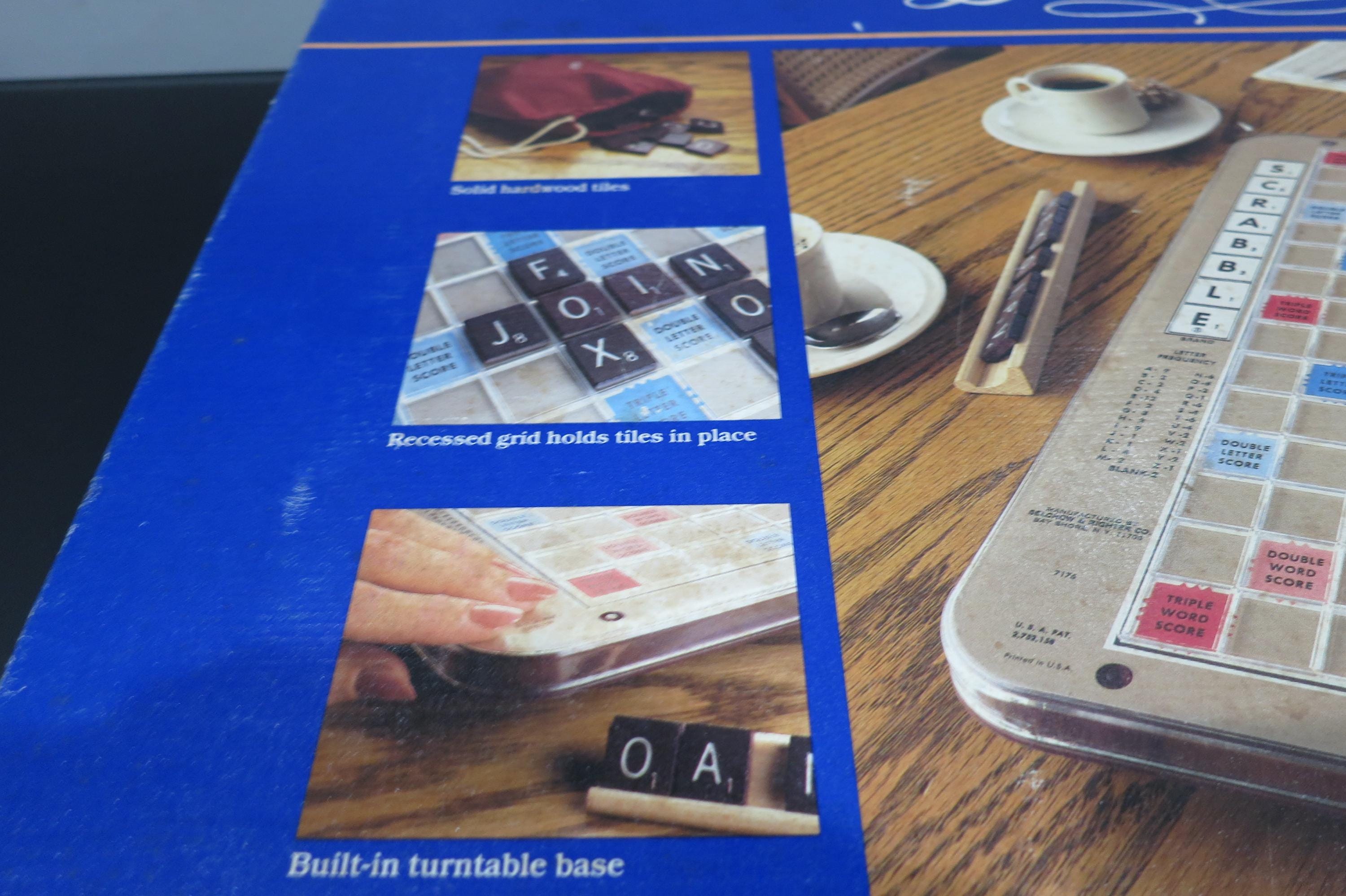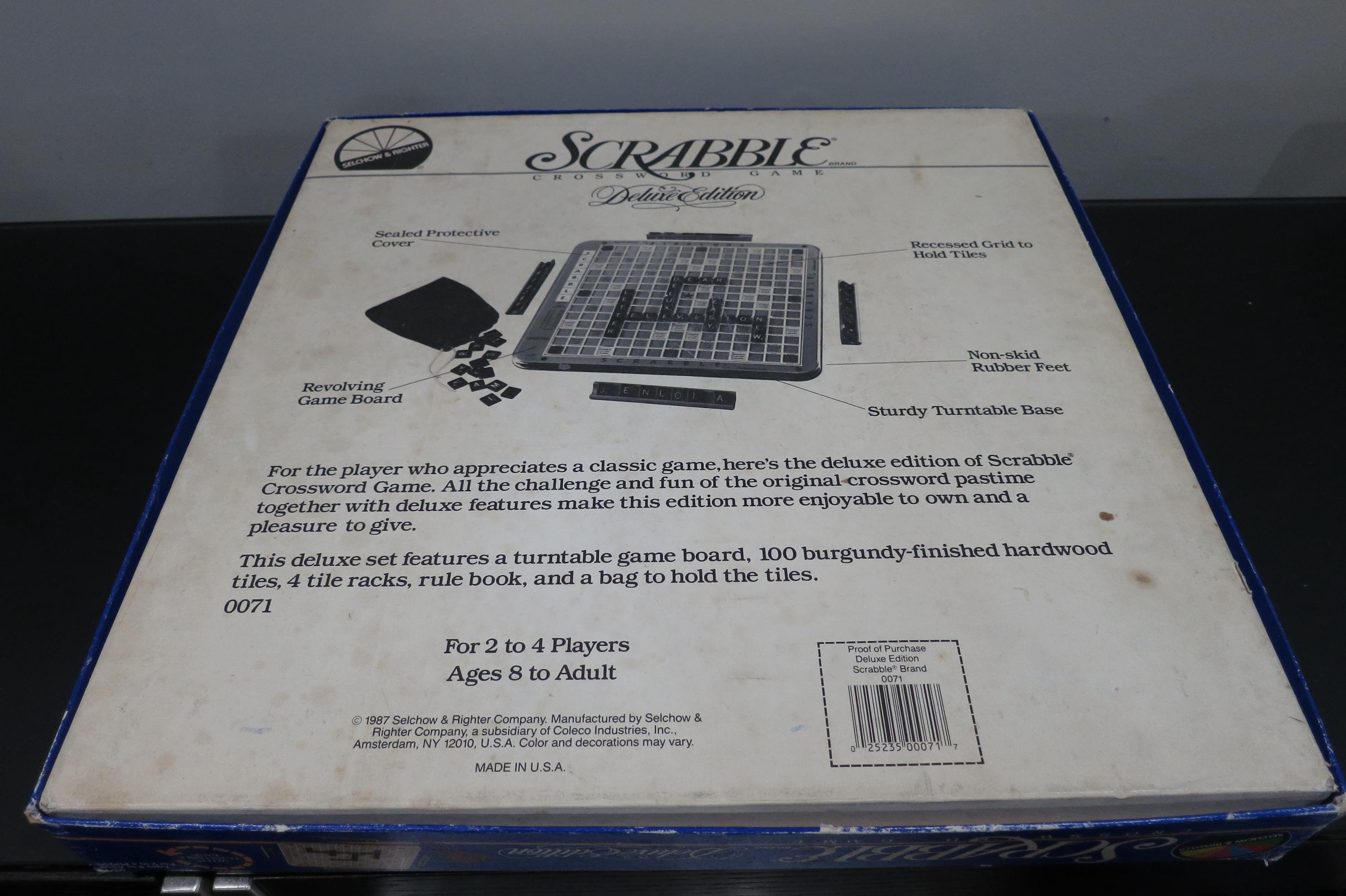 1987 Deluxe Collectors Edition Rotating Board Turntable Scrabble Selchow 100 % Complete. Great Game, Hours of enjoyment! Includes a blue tile bag,and red tiles with white lettering, as well as the instructions. Box has 2 tapes corners and one taped edge and shows normal age wear. This is the version with the recessed tile spaces that hold the tiles more secure than the newer versions.