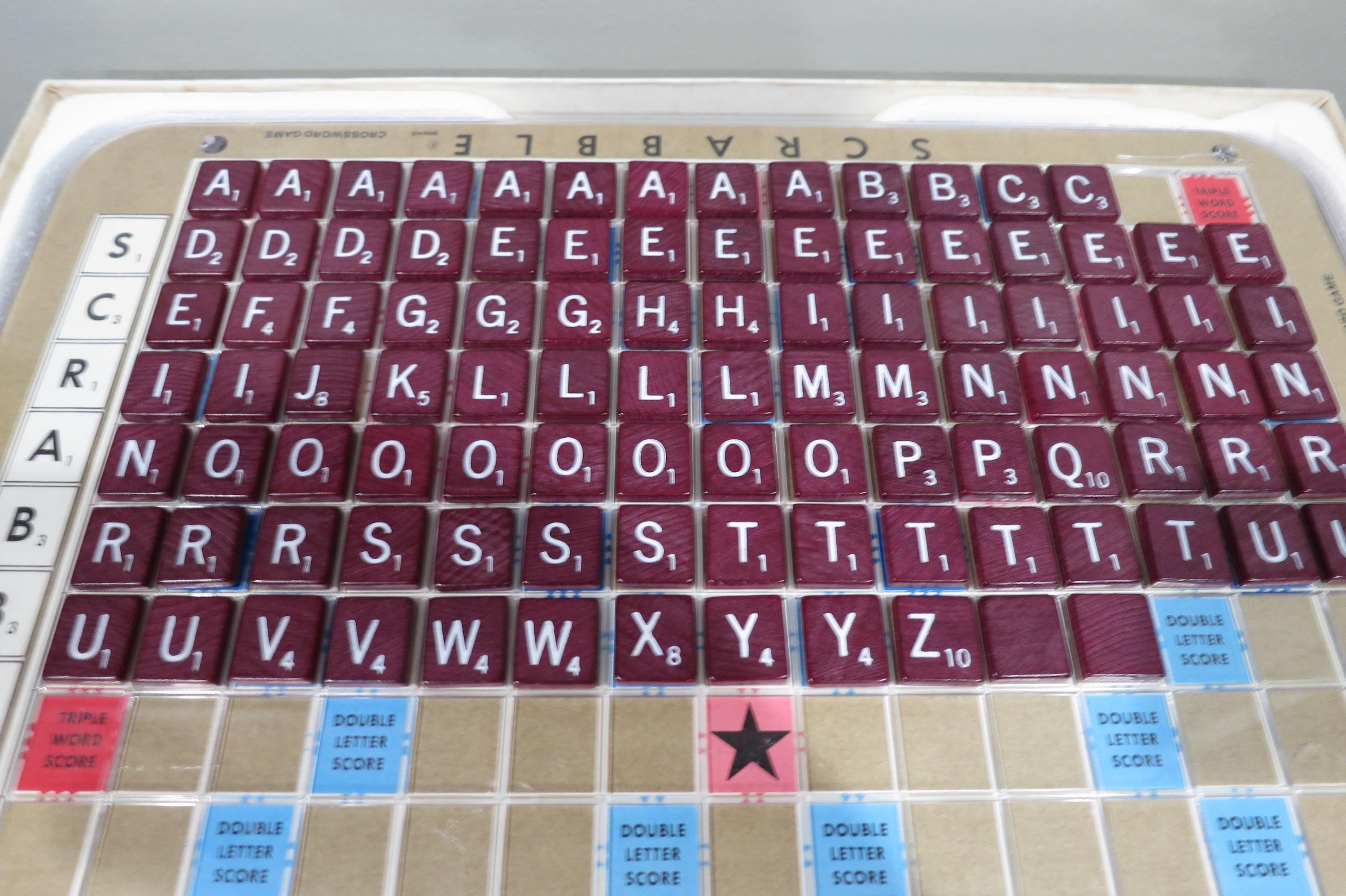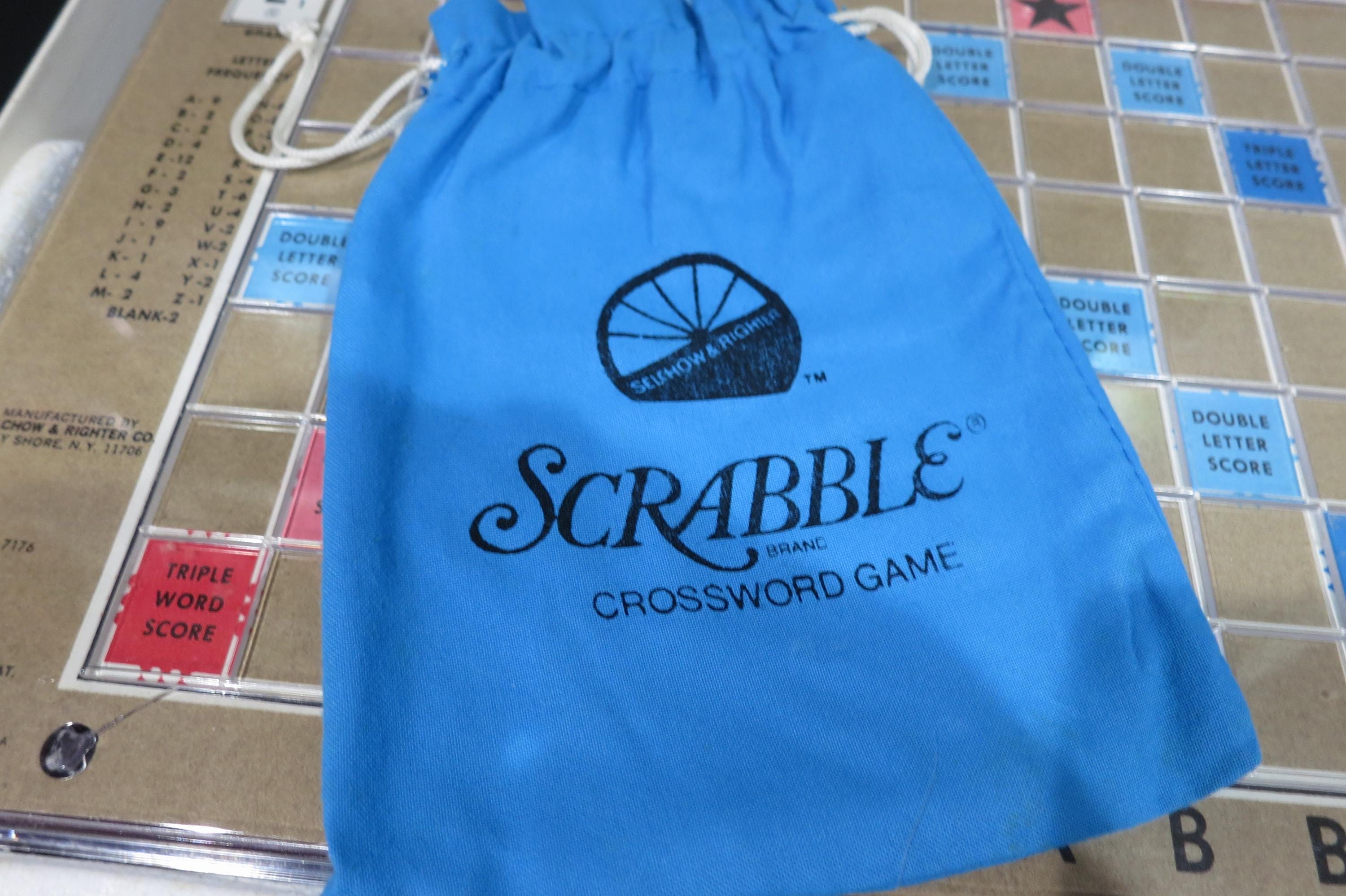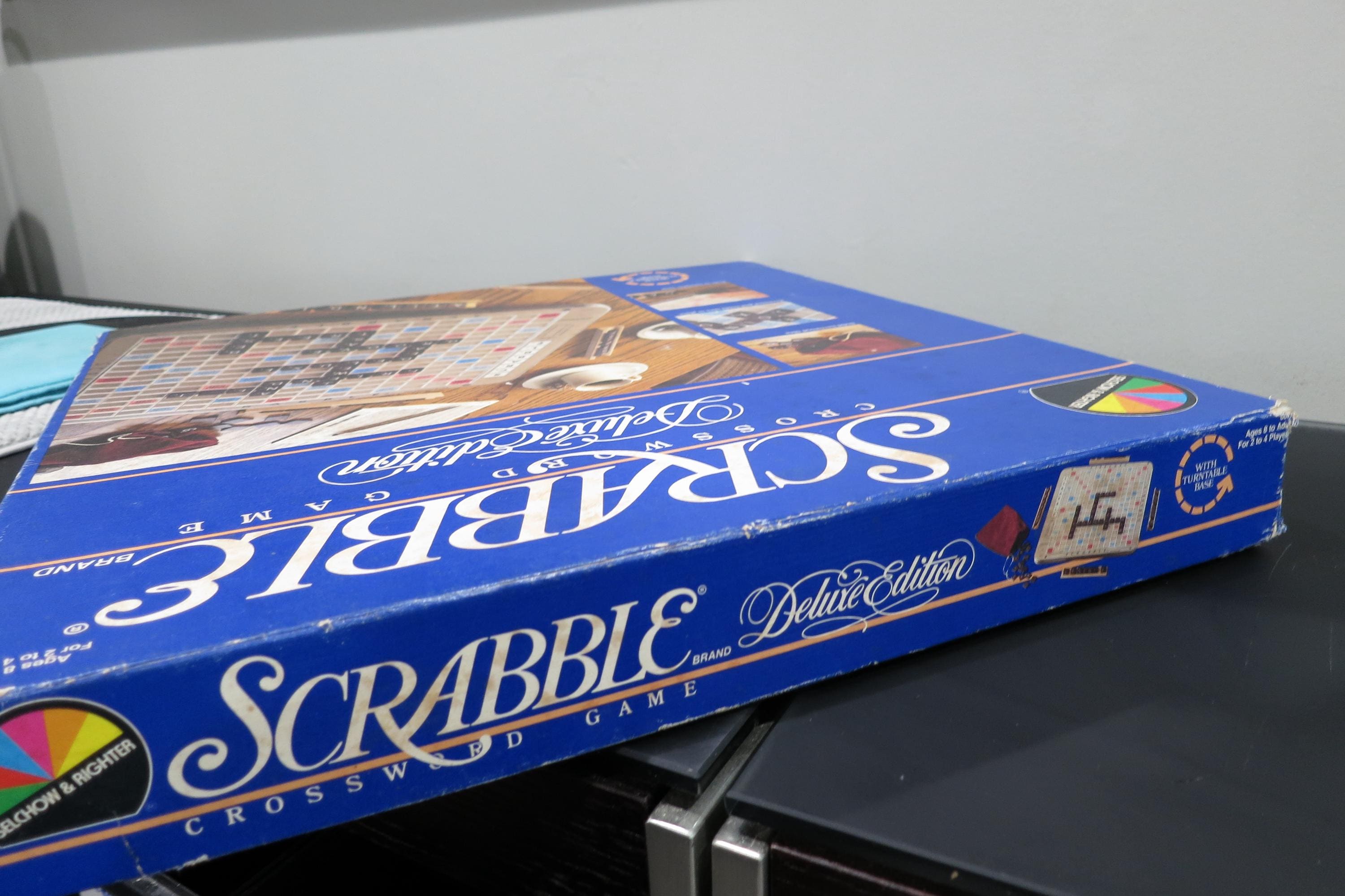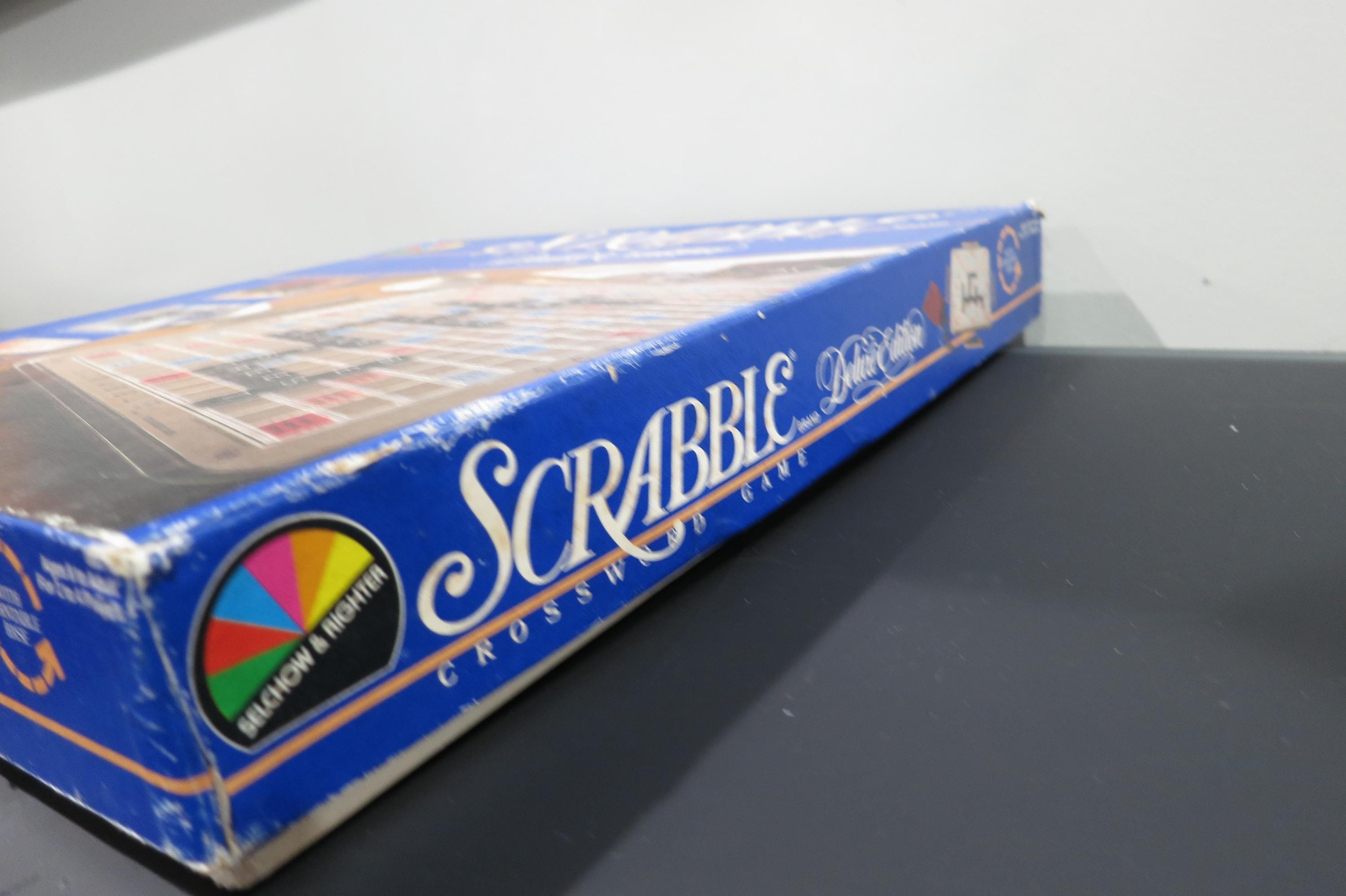 1987 Deluxe Collectors Edition Rotating Board Turntable Scrabble Selchow 100 % Complete. Great Game, Hours of enjoyment! Includes a blue tile bag,and red tiles with white lettering, as well as the instructions. Box has 2 tapes corners and one taped edge and shows normal age wear. This is the version with the recessed tile spaces that hold the tiles more secure than the newer versions.