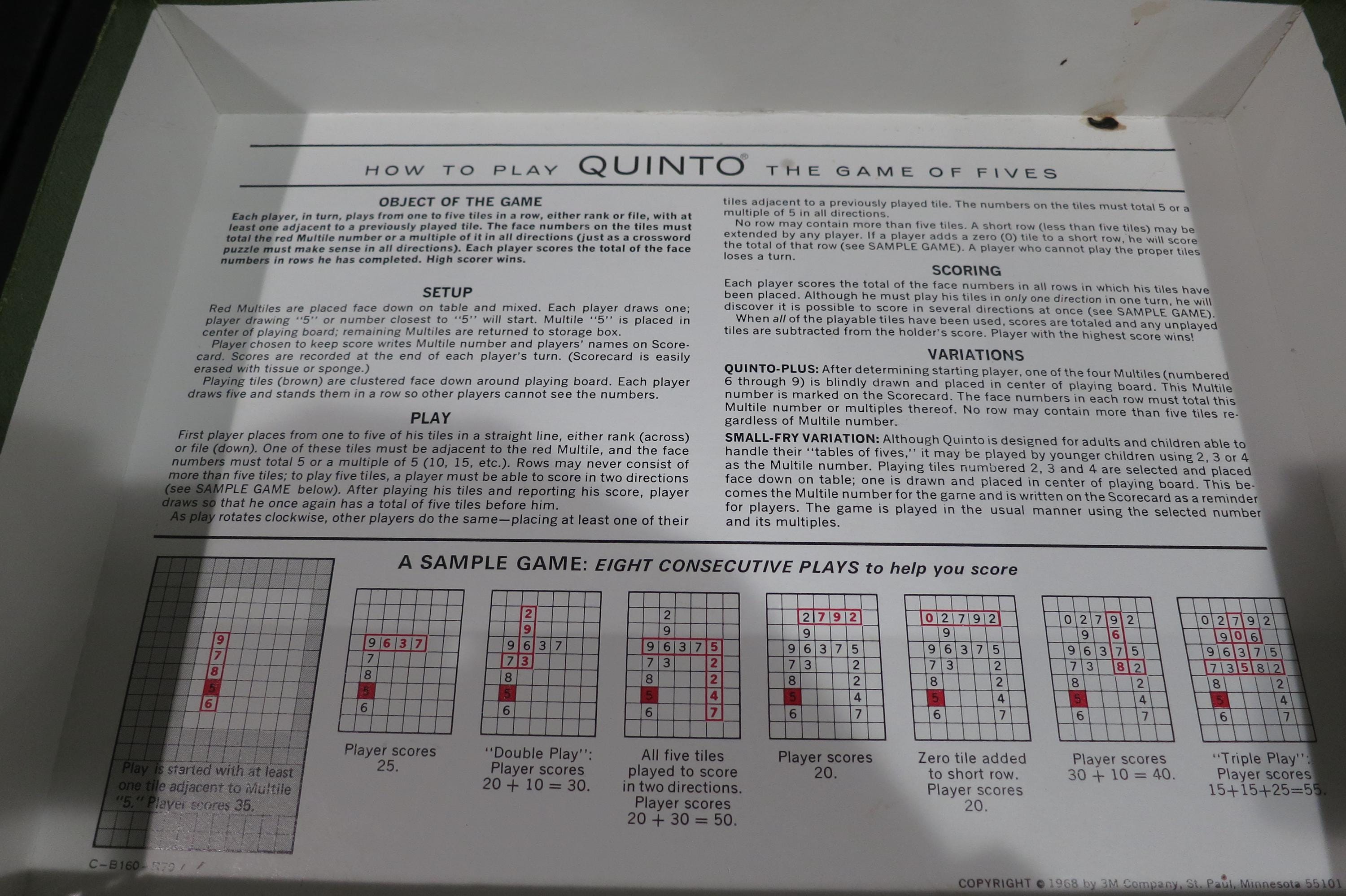 Vintage 1968 3M Bookshelf Board Game Quinto Facinating Game of Fives 100% Complete.
