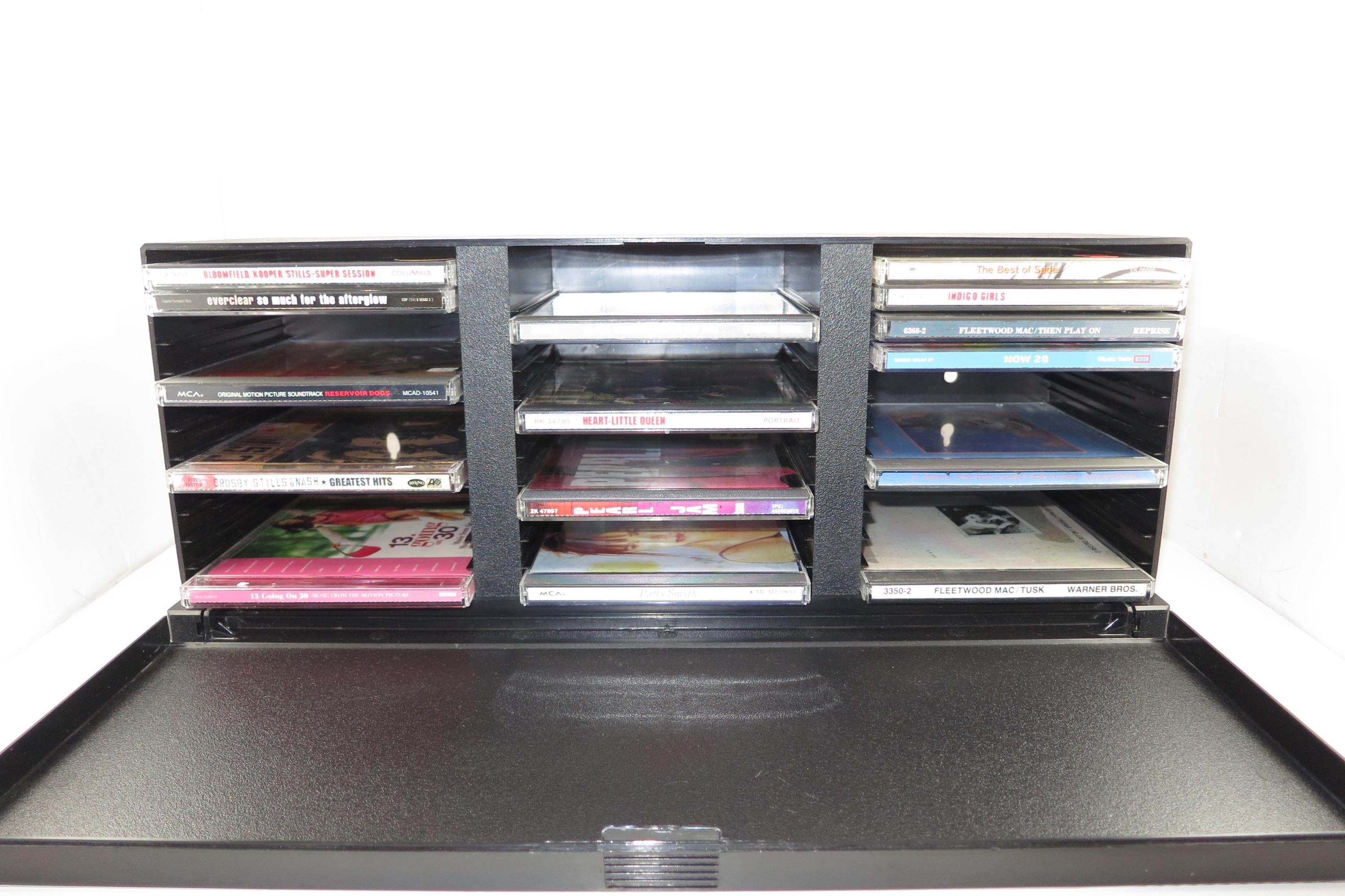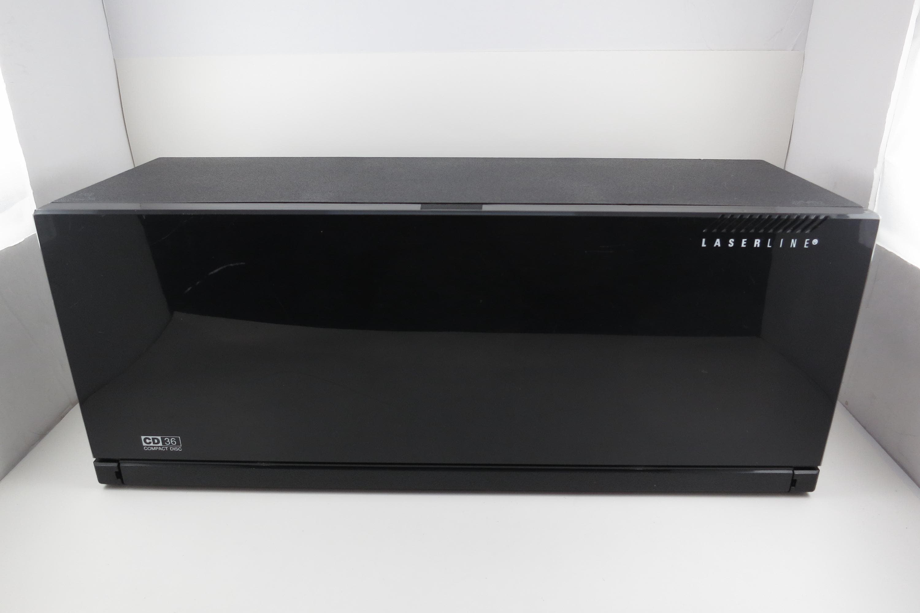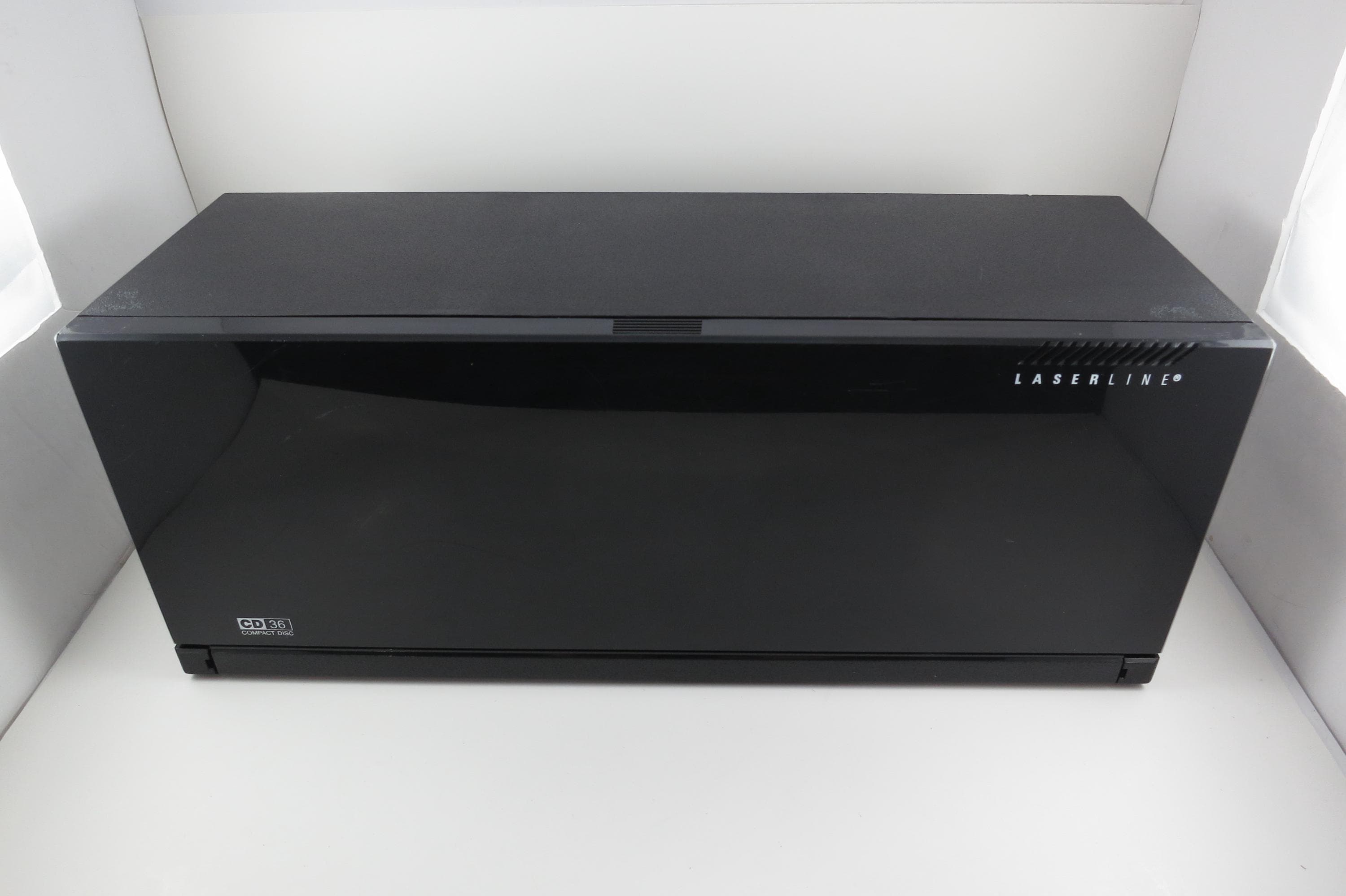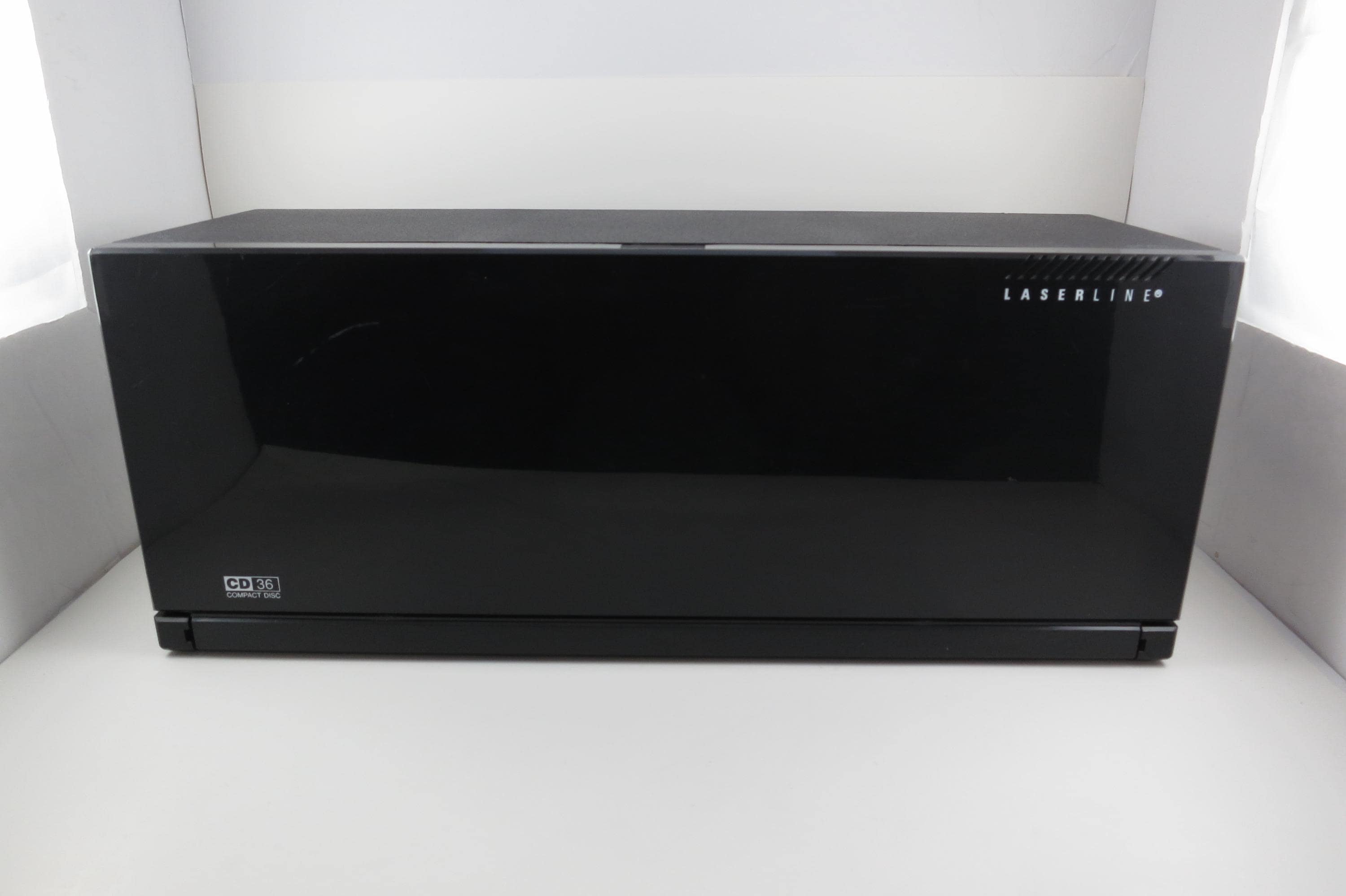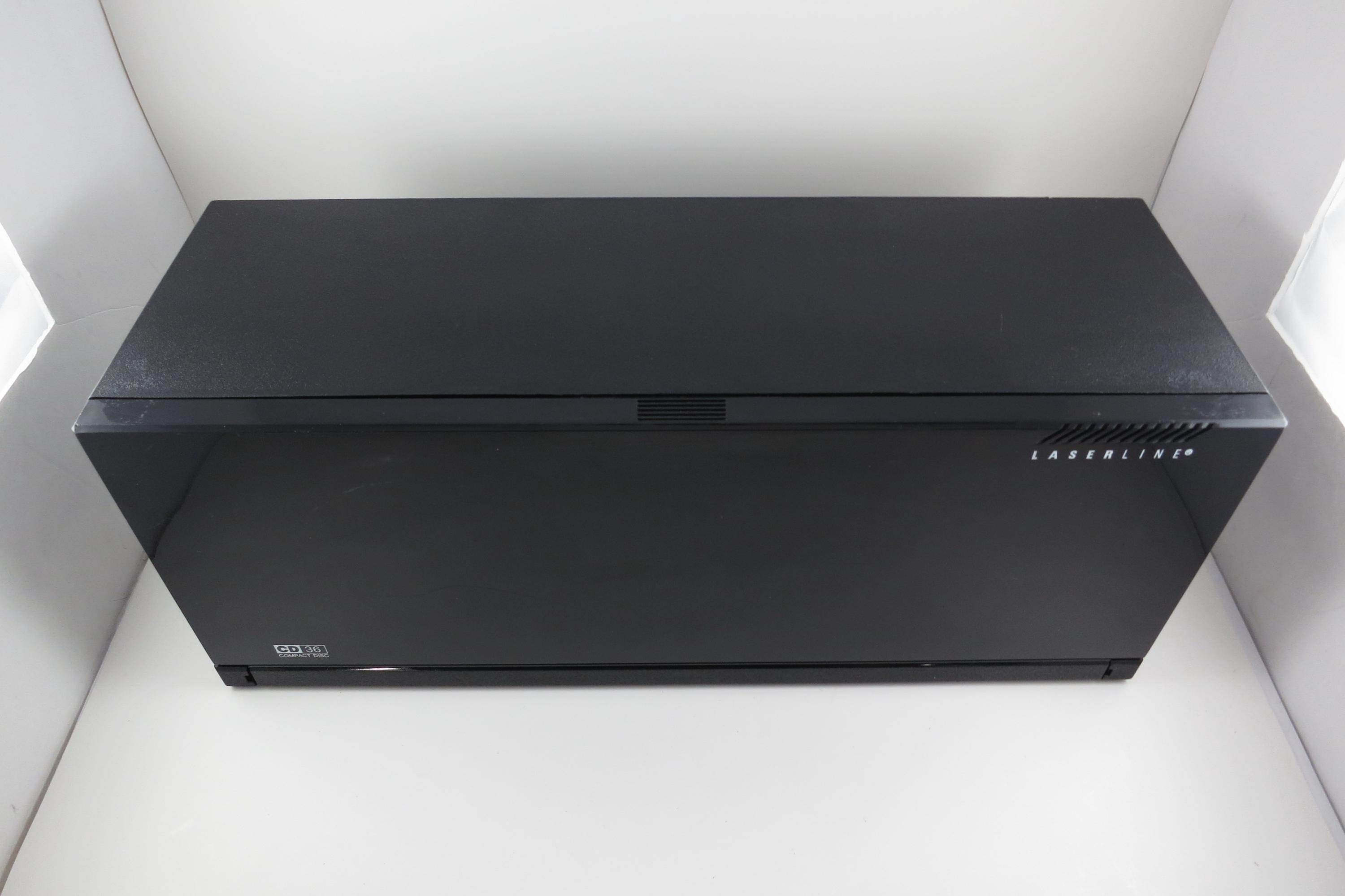 1990's Black Laserline CD Holder Holds 36 CD's Hard Plastic Excellent Condition CD Storage with Flip Down Front Cover. Measures 17 Inches wide, 5 1/2 Inches deep and 6 7/8 inches tall. Can be wall mounted or free standing.