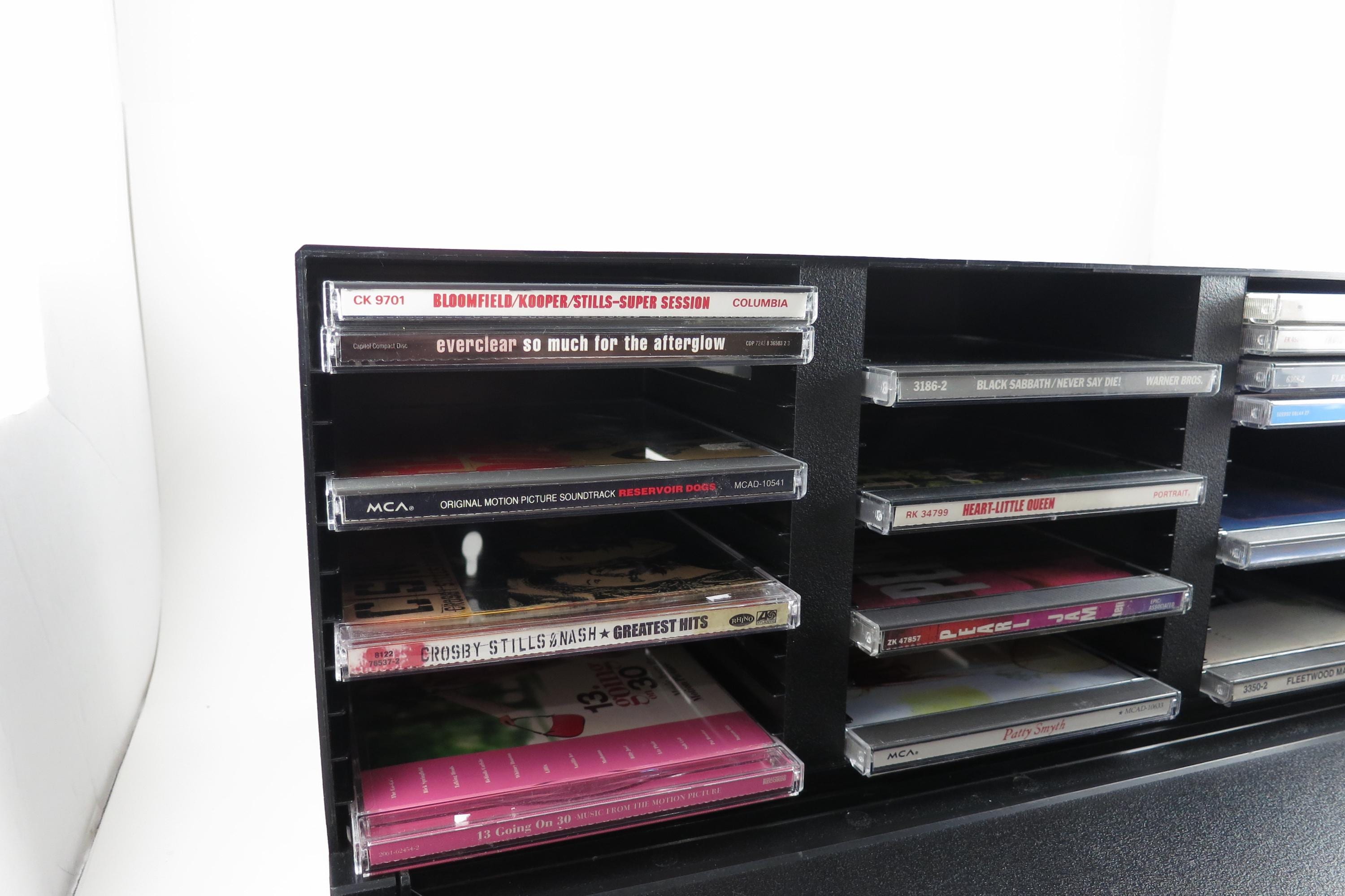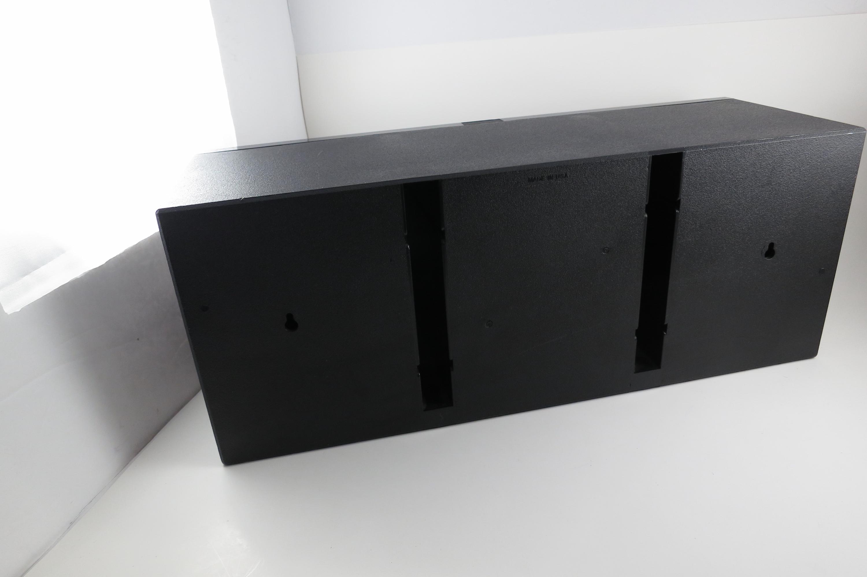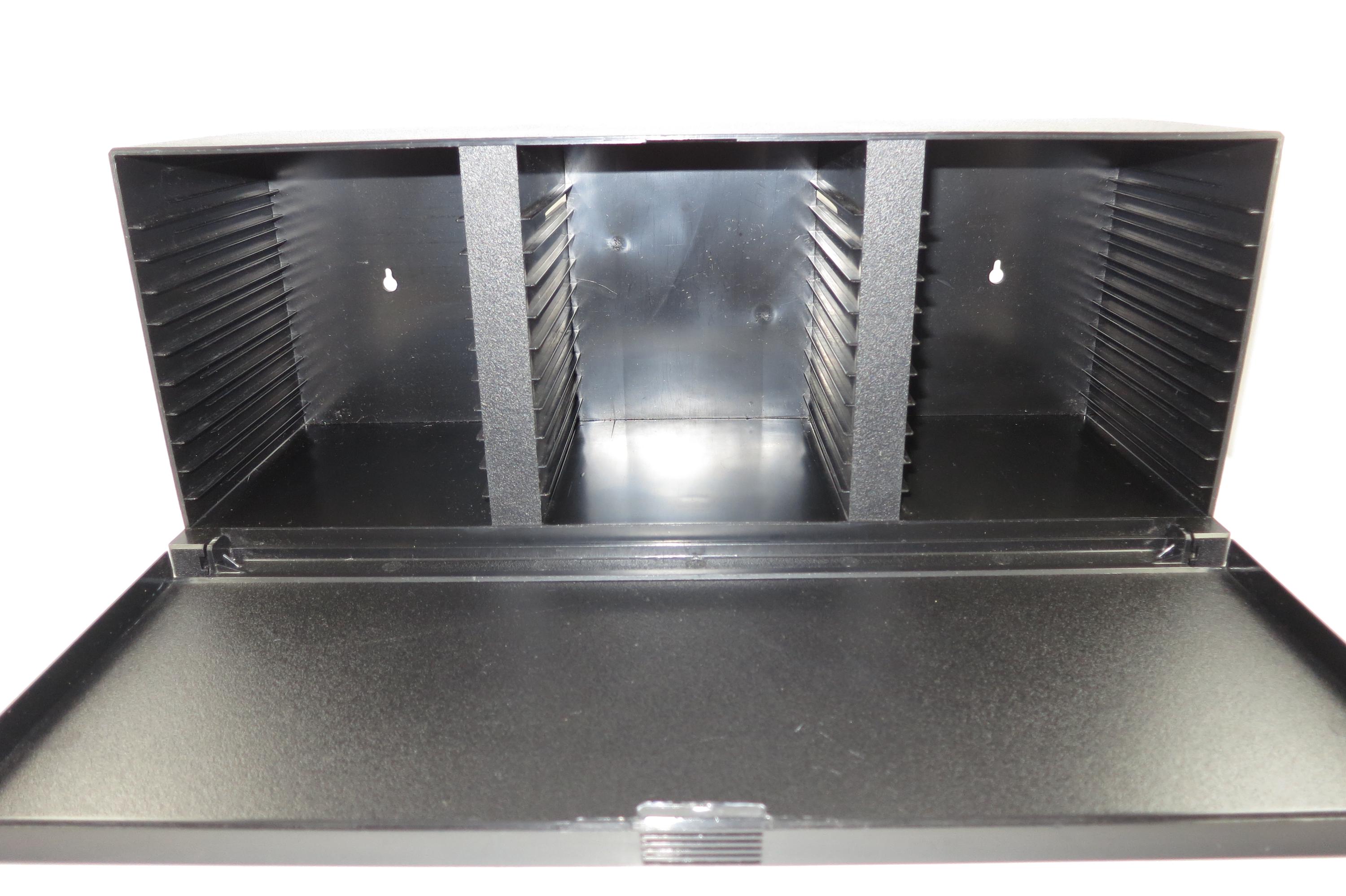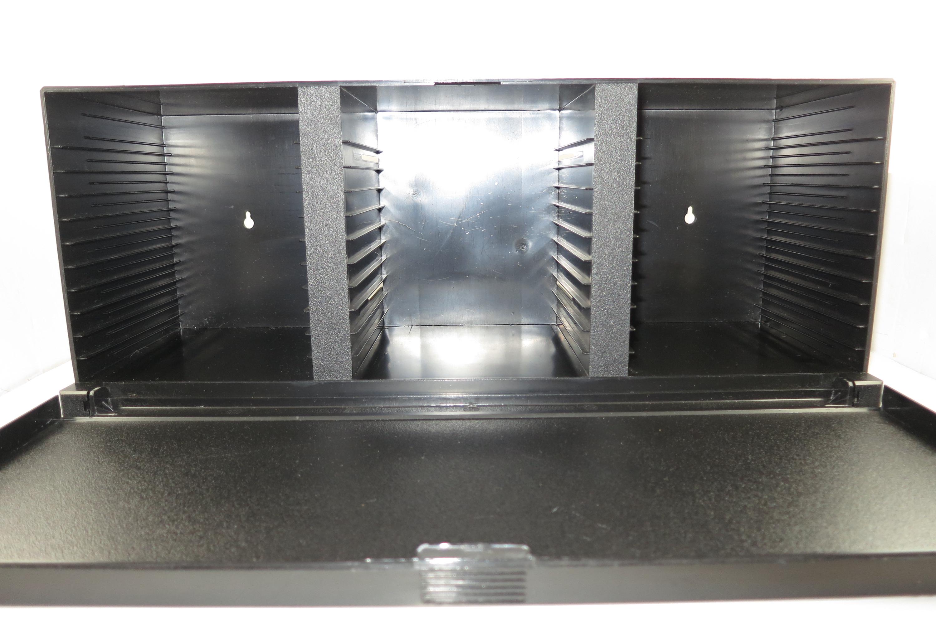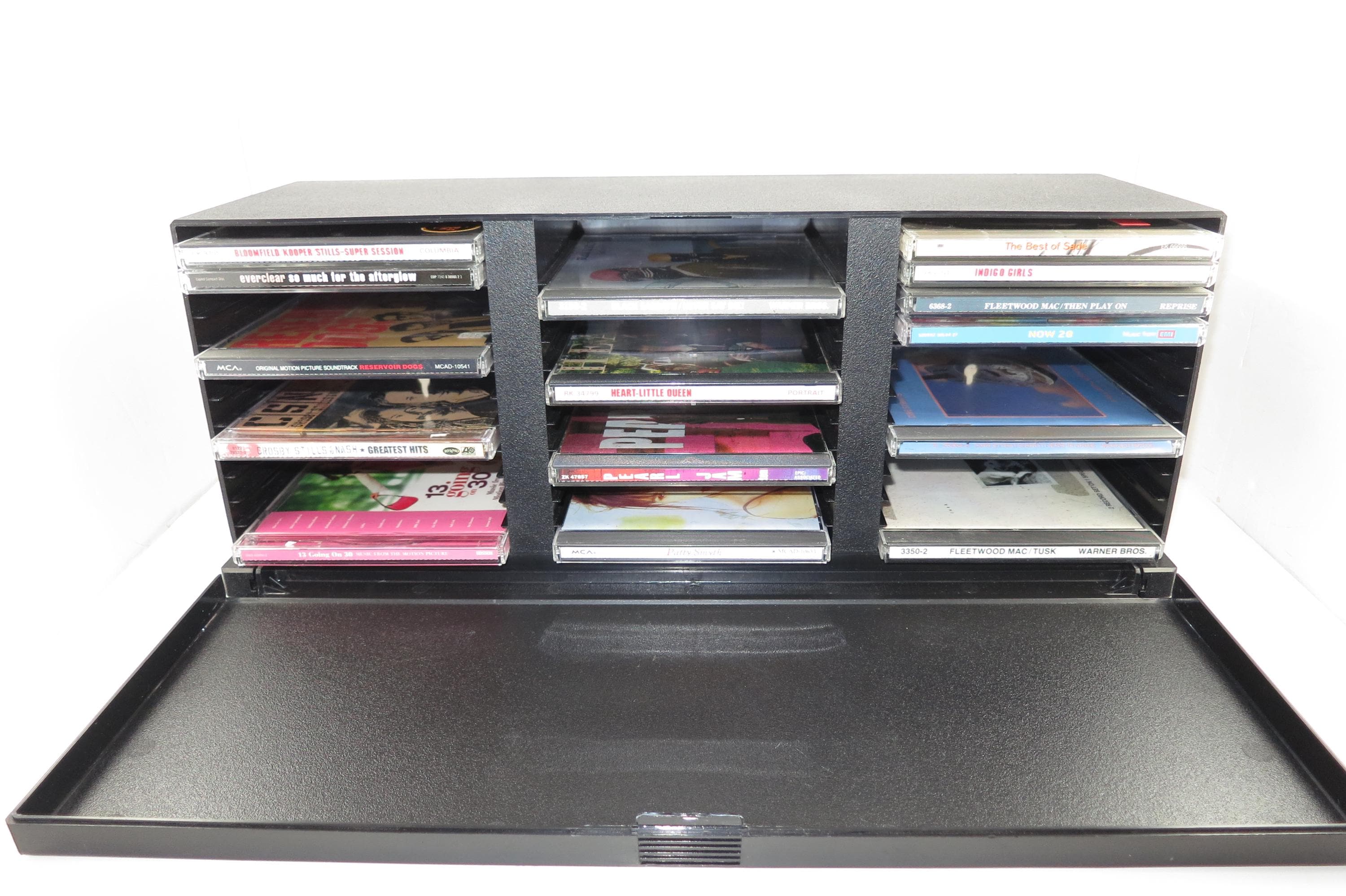 1990's Black Laserline CD Holder Holds 36 CD's Hard Plastic Excellent Condition CD Storage with Flip Down Front Cover. Measures 17 Inches wide, 5 1/2 Inches deep and 6 7/8 inches tall. Can be wall mounted or free standing.