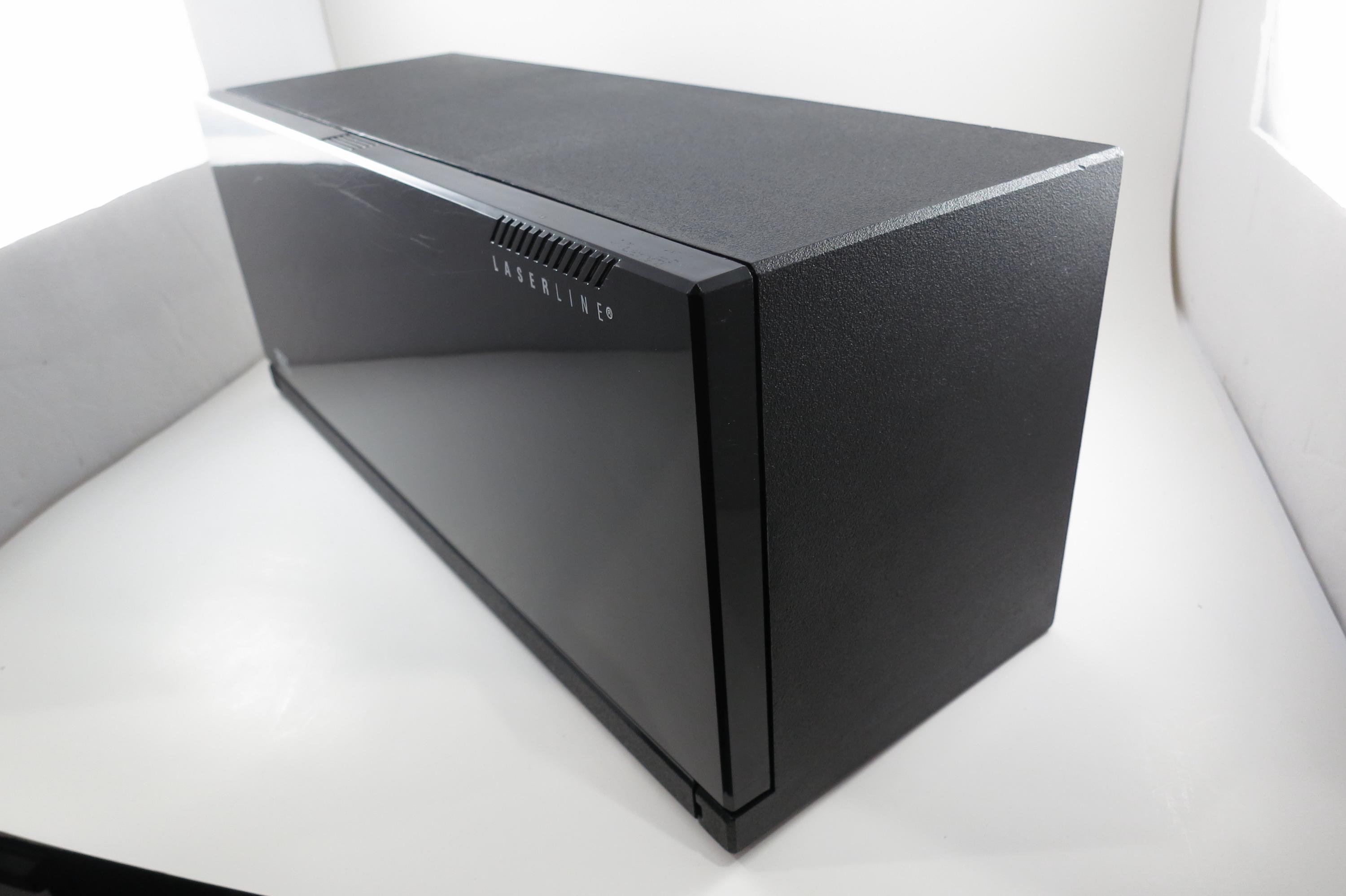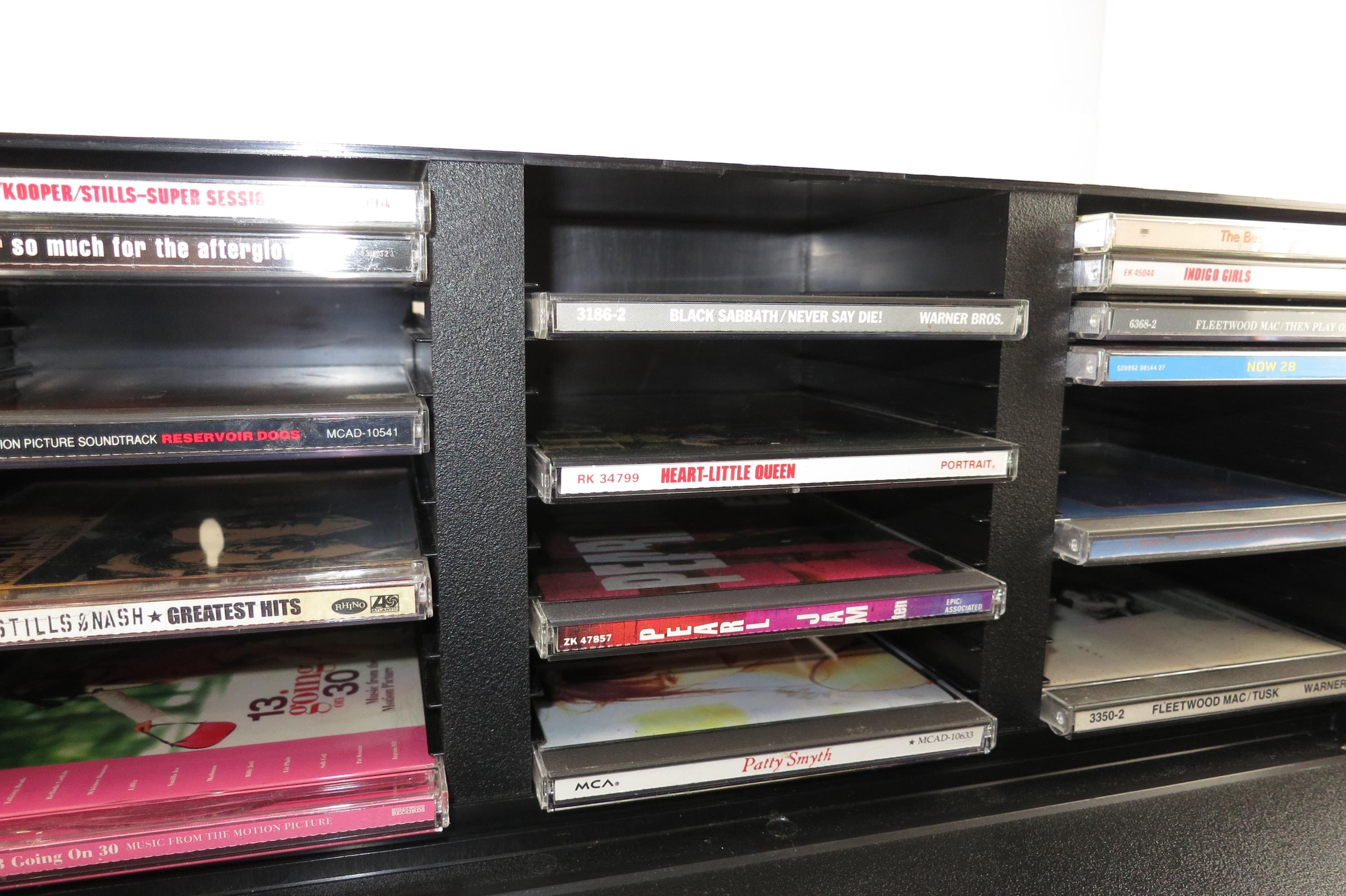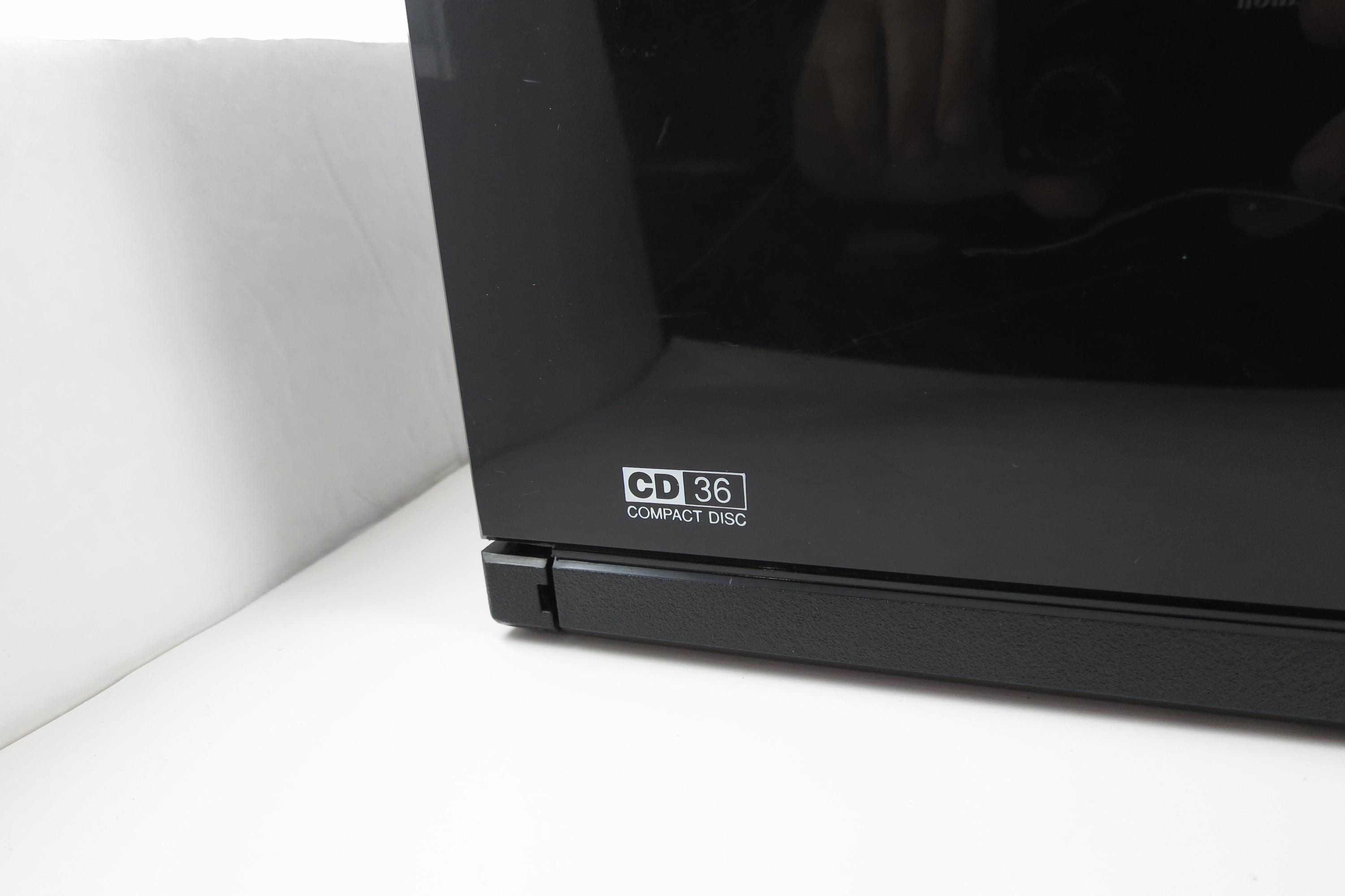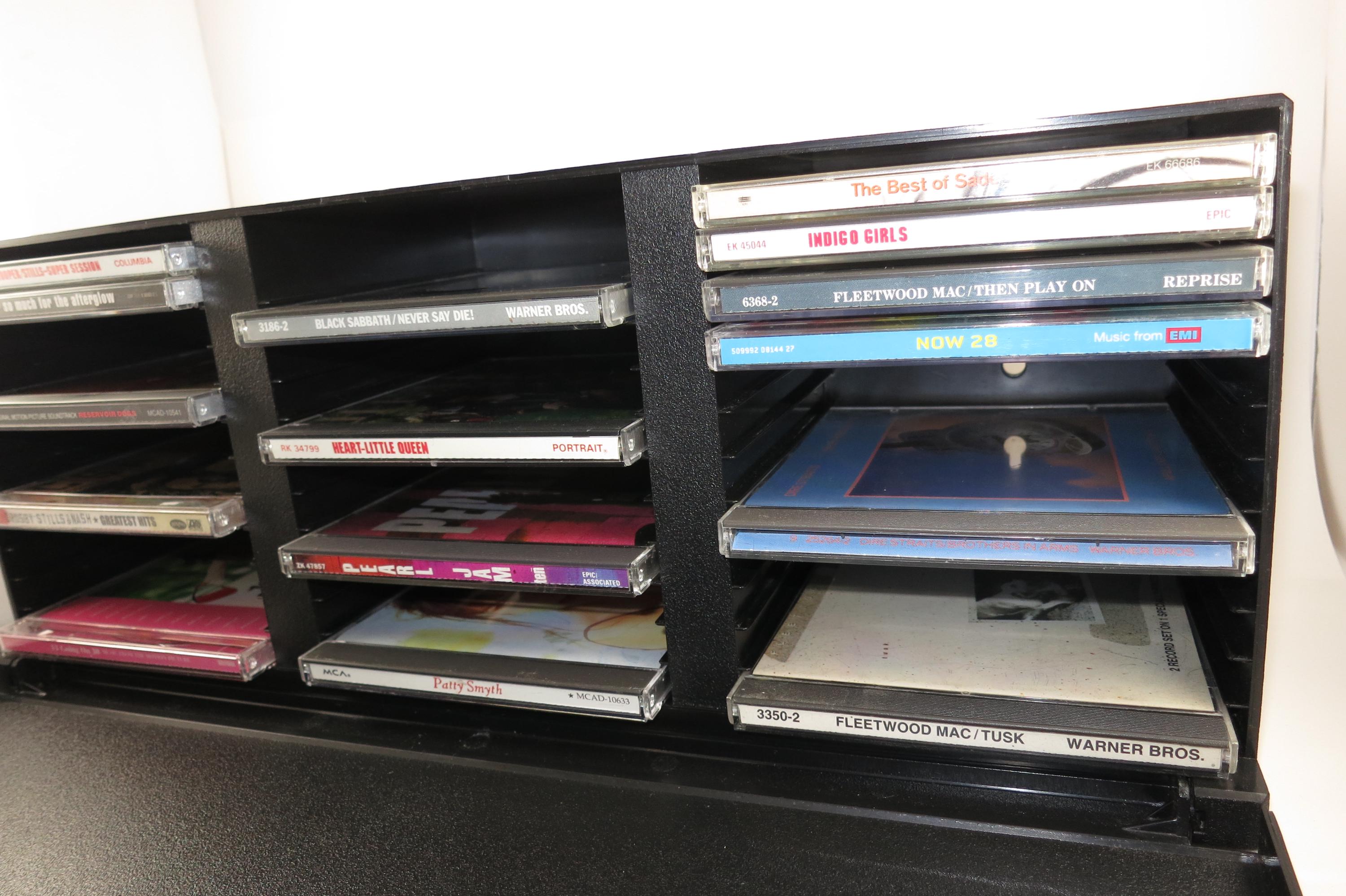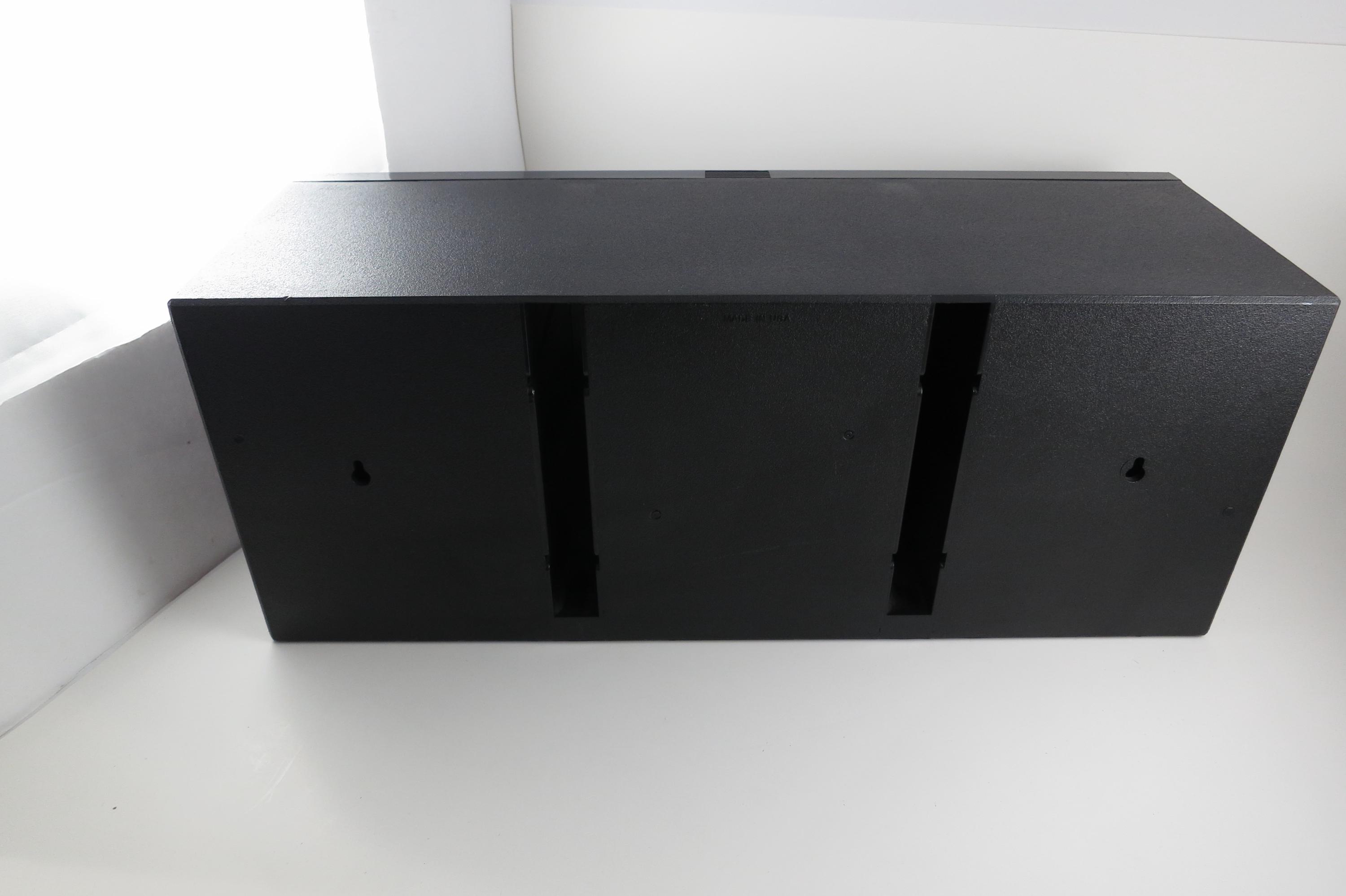 1990's Black Laserline CD Holder Holds 36 CD's Hard Plastic Excellent Condition CD Storage with Flip Down Front Cover. Measures 17 Inches wide, 5 1/2 Inches deep and 6 7/8 inches tall. Can be wall mounted or free standing.