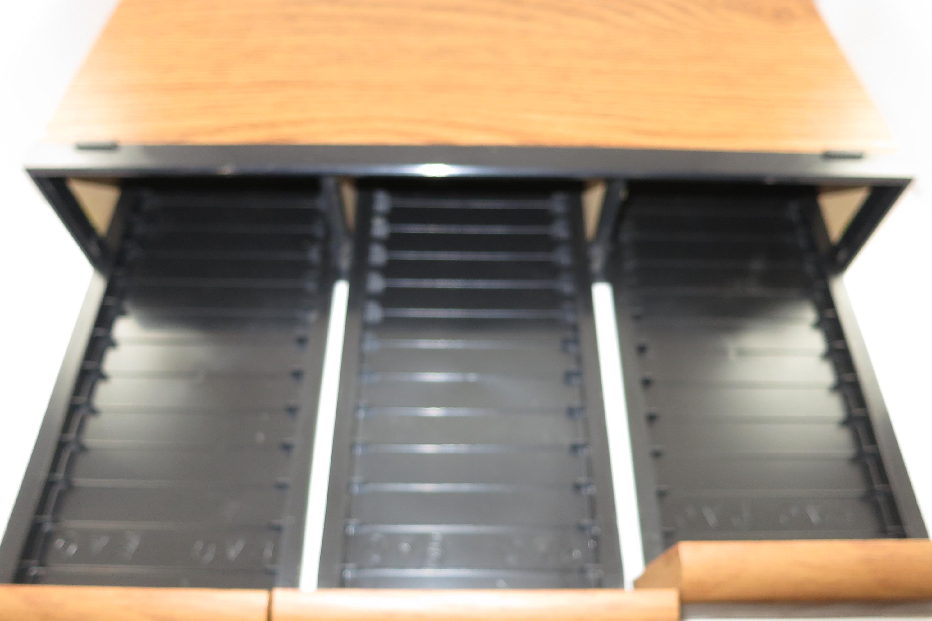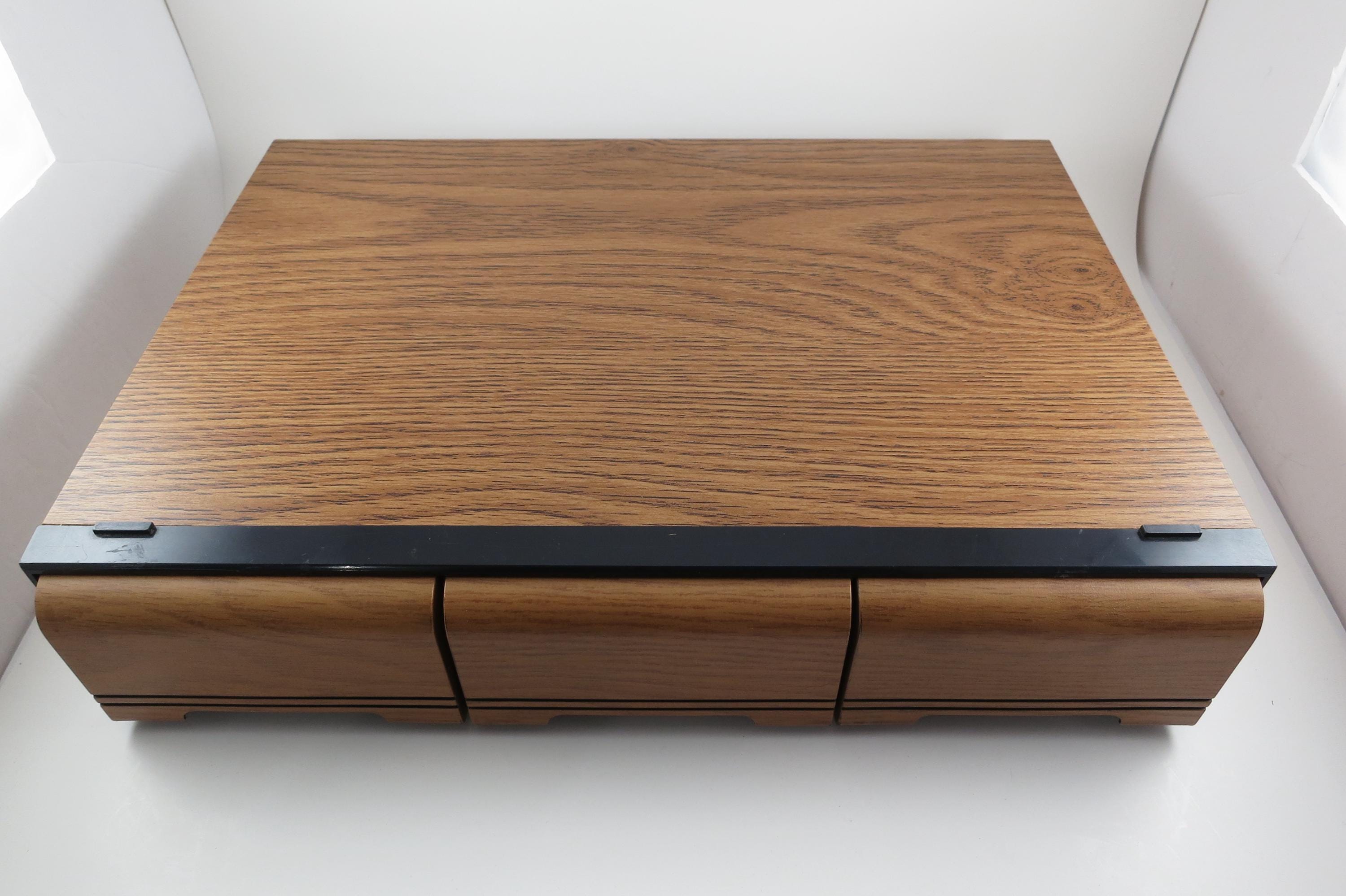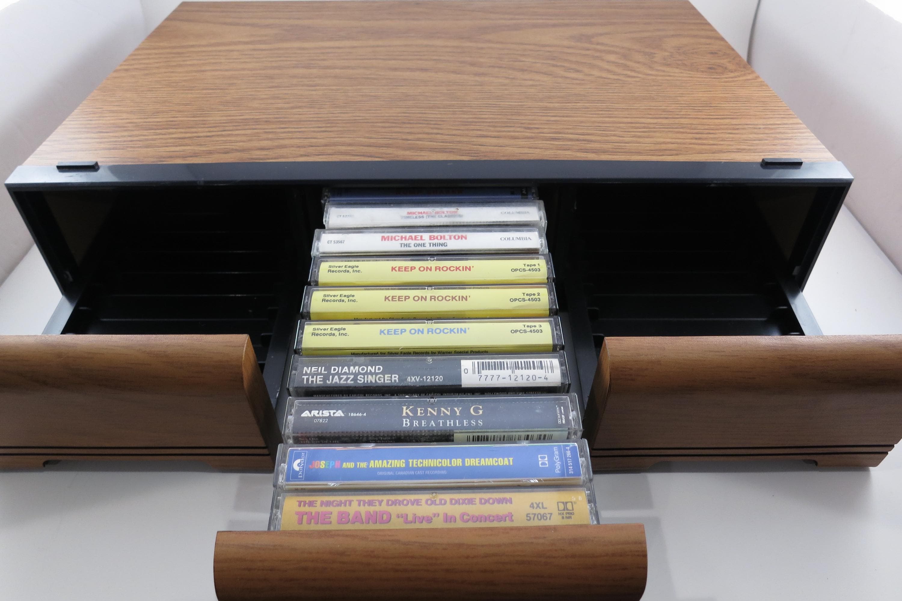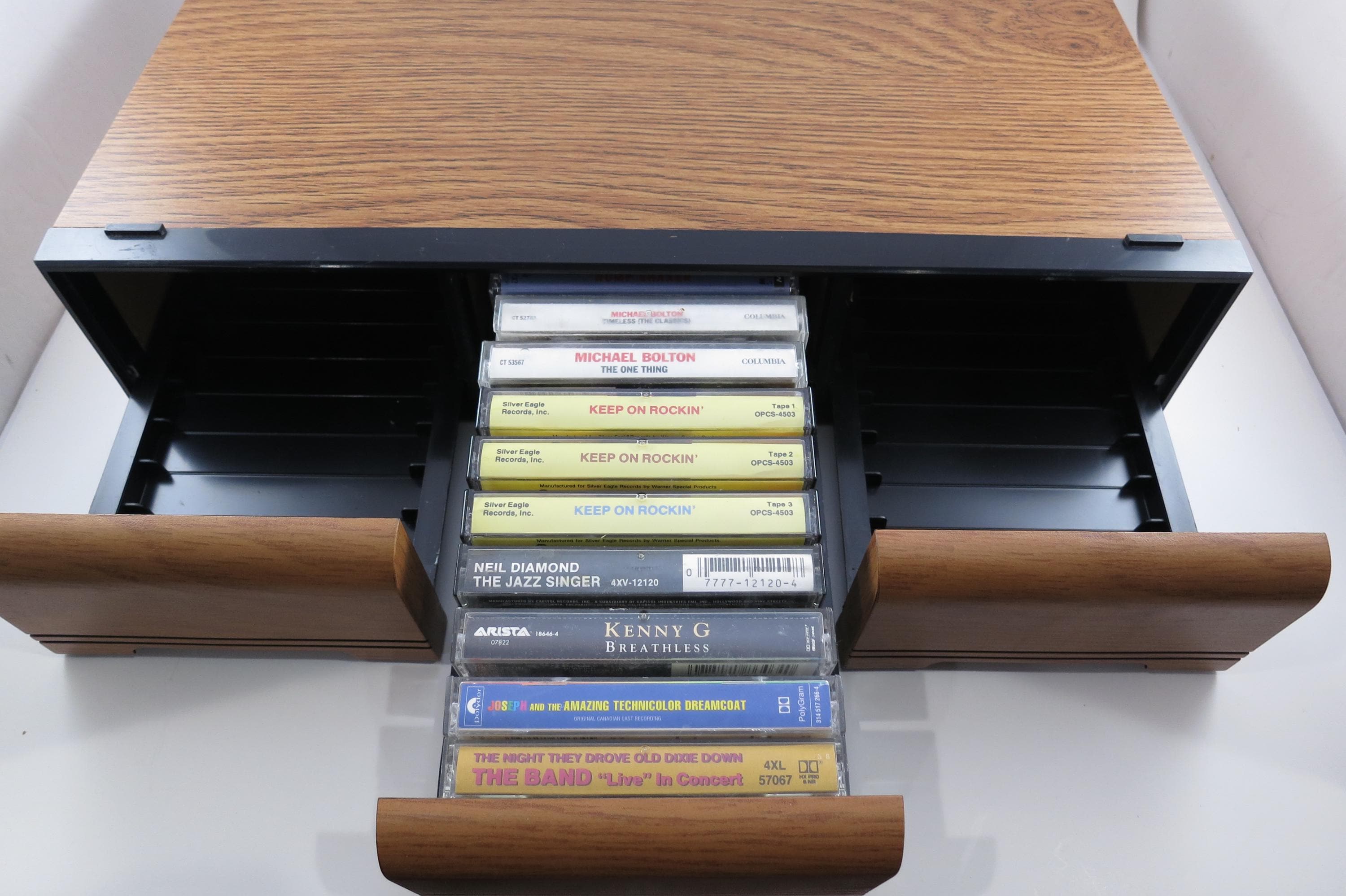 1980's Faux Wood Three Row Hard Cassette Holder Holds 42 Cassette Tapes Excellent Condition Home Storage. Has three pull out trays that each hold 14 Cassettes for a total of 42. This is the hard variety that is for home cassette storage. Measures 16 3/4 inches wide, 12 inches deep and 3 1/2 inches tall.