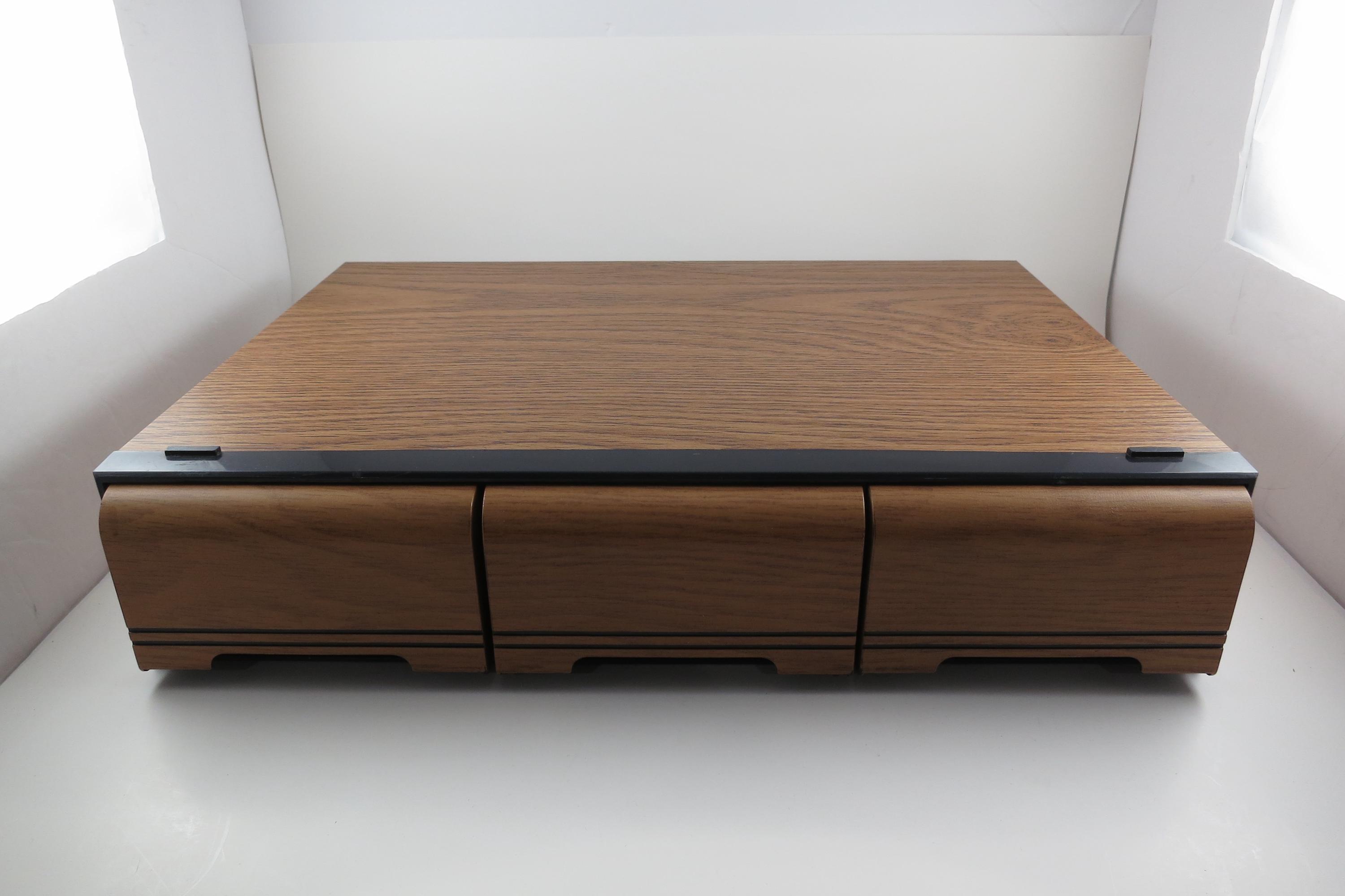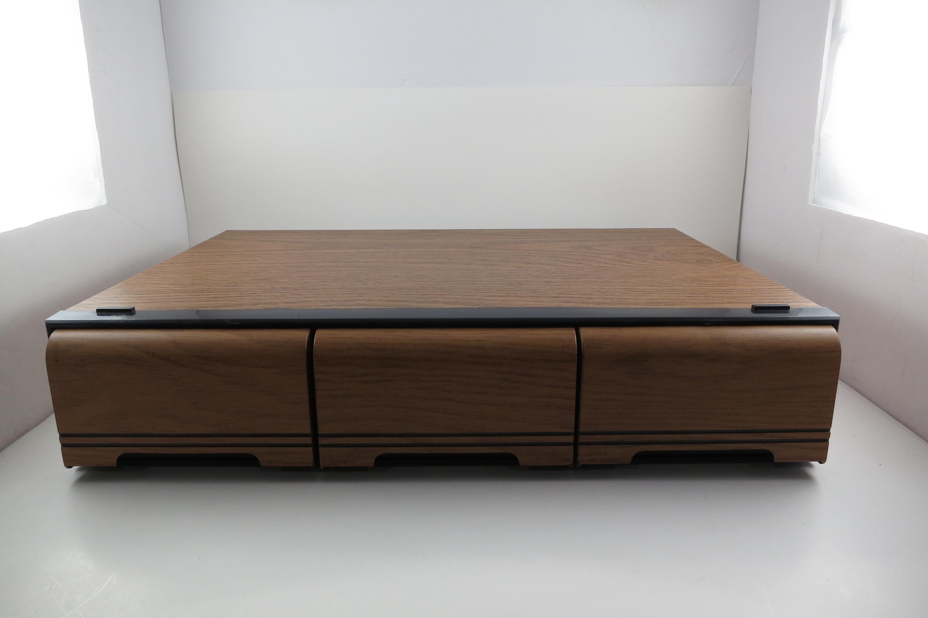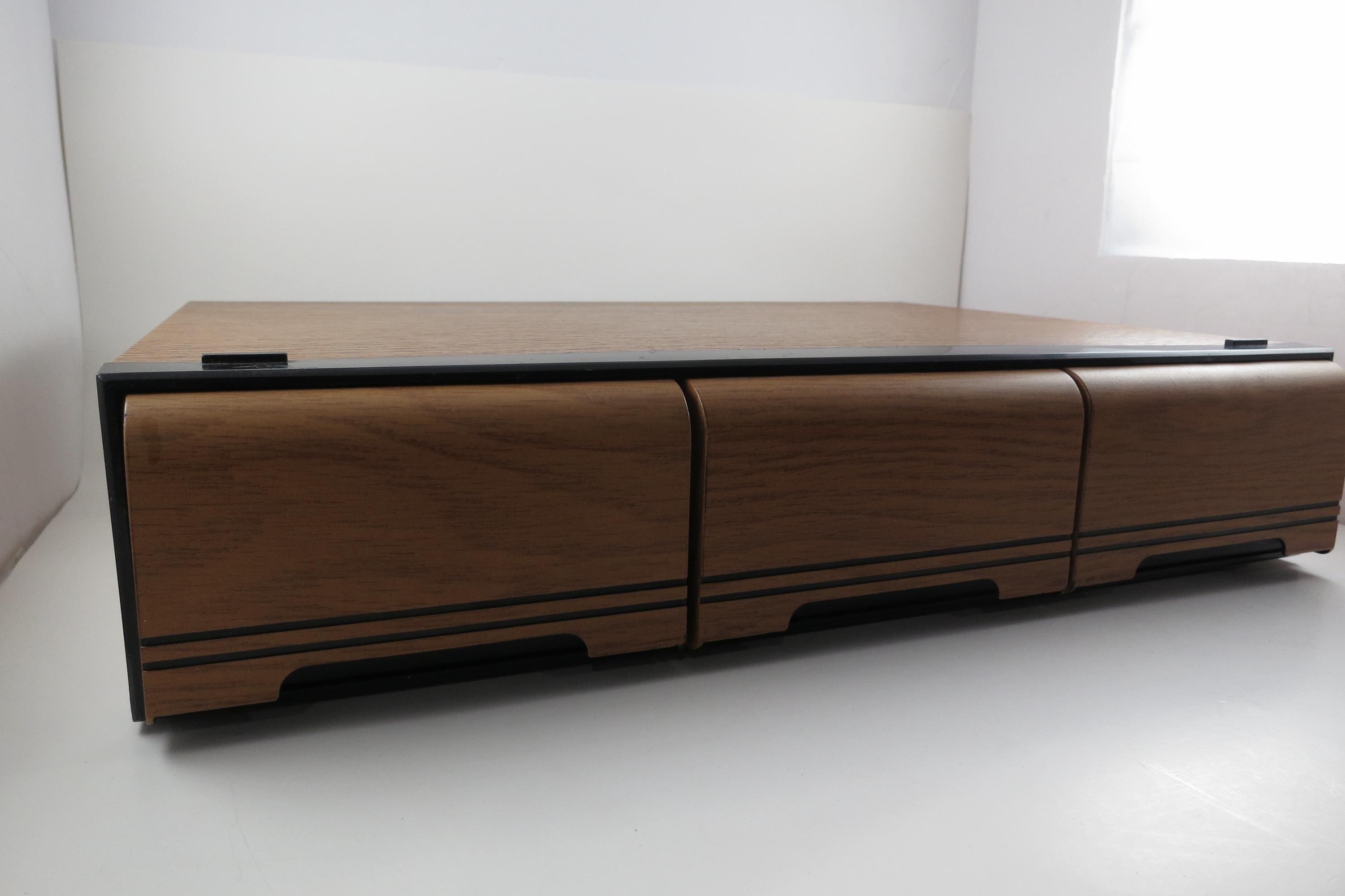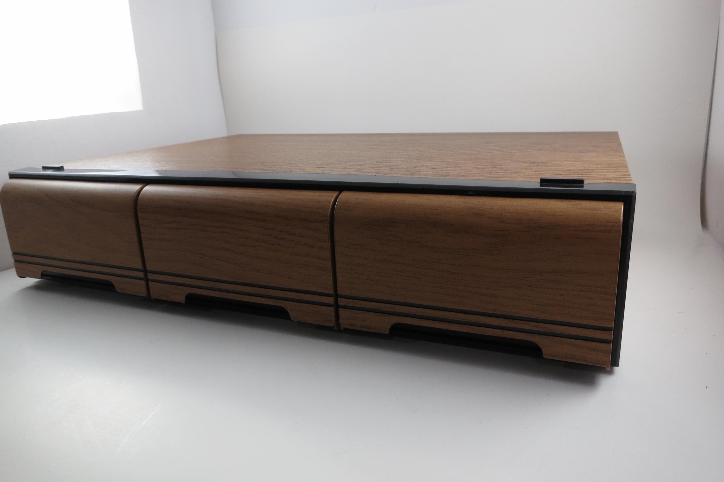 1980's Faux Wood Three Row Hard Cassette Holder Holds 42 Cassette Tapes Excellent Condition Home Storage. Has three pull out trays that each hold 14 Cassettes for a total of 42. This is the hard variety that is for home cassette storage. Measures 16 3/4 inches wide, 12 inches deep and 3 1/2 inches tall.