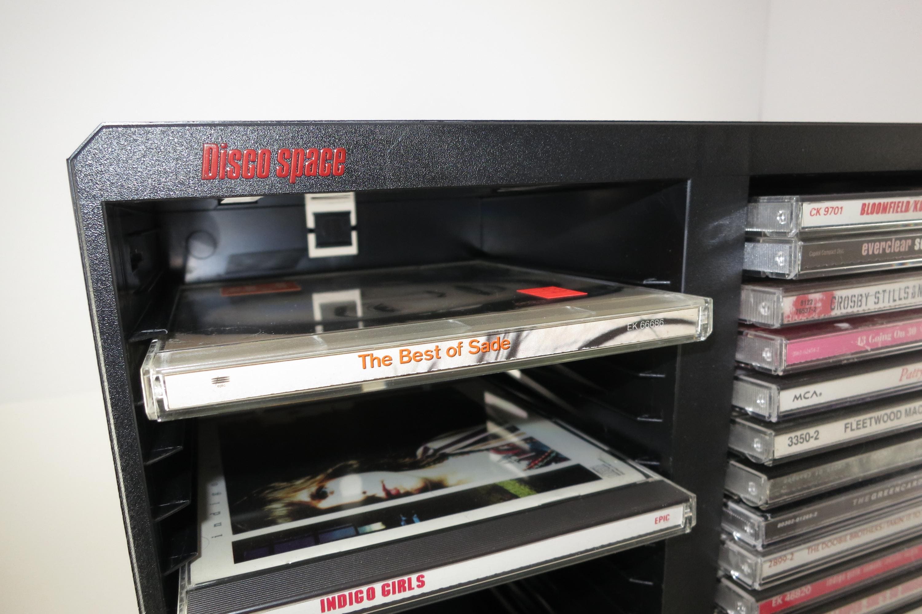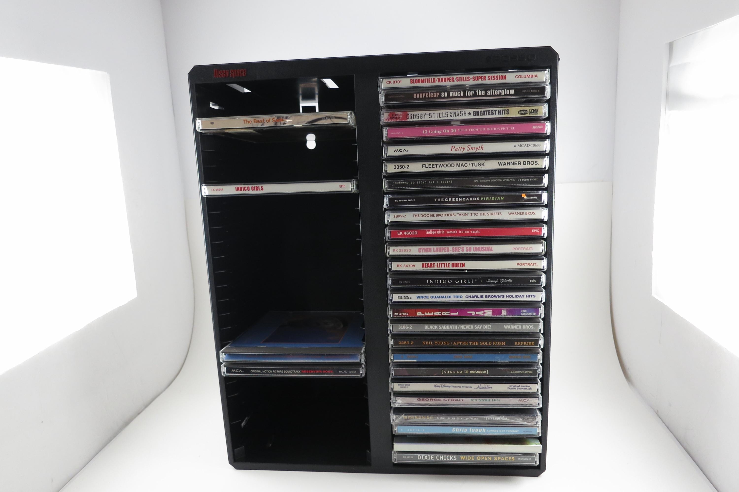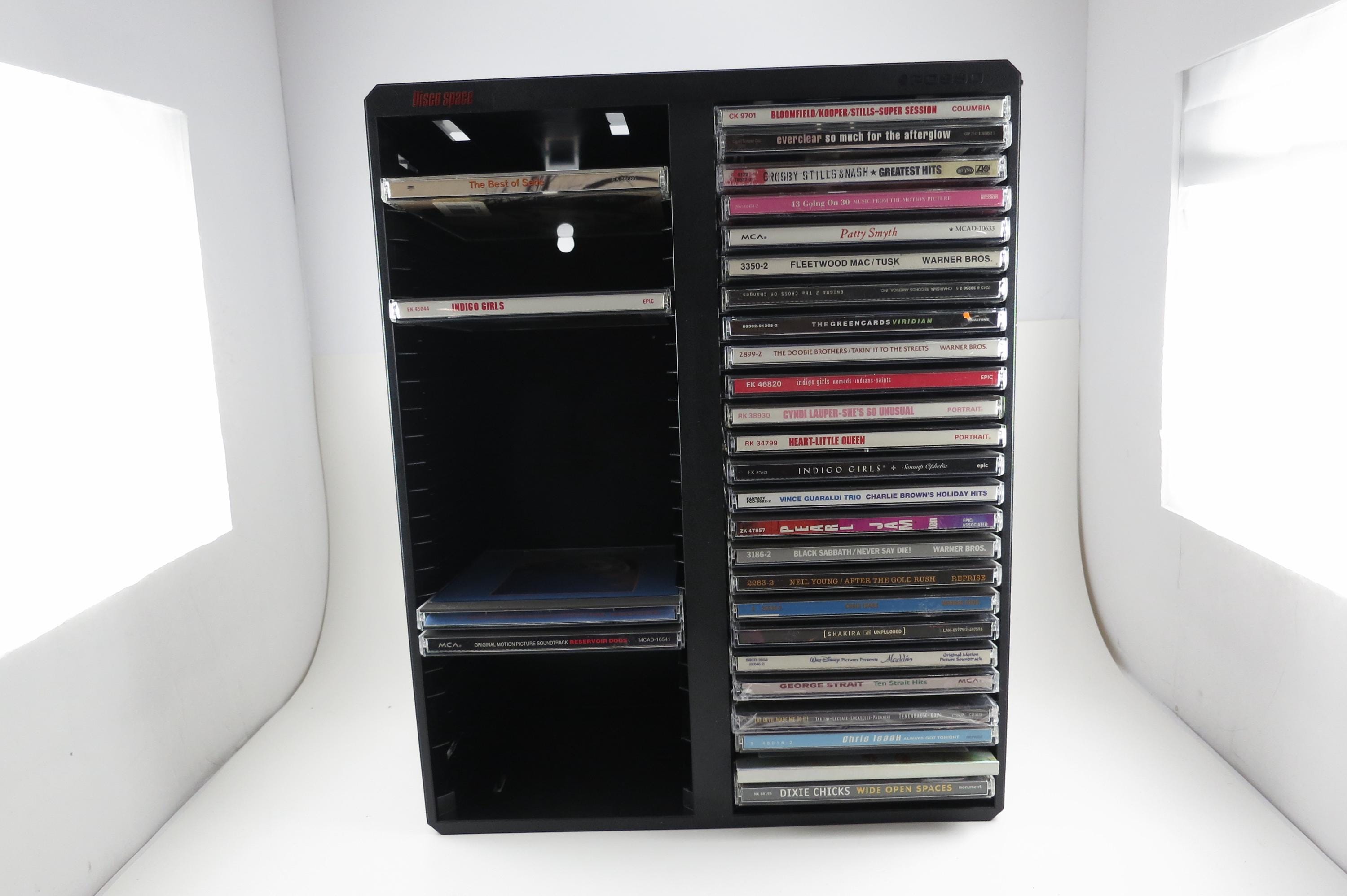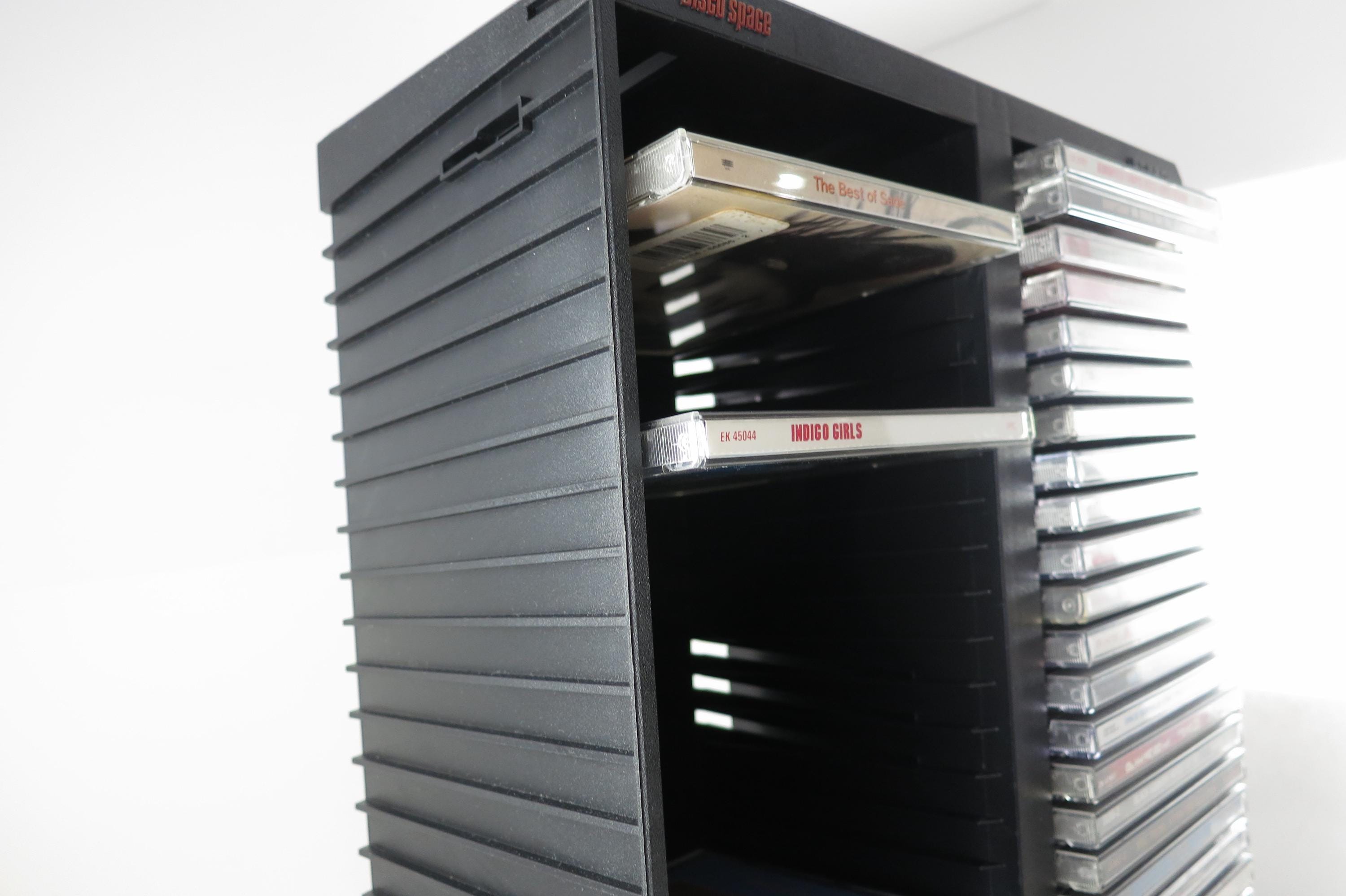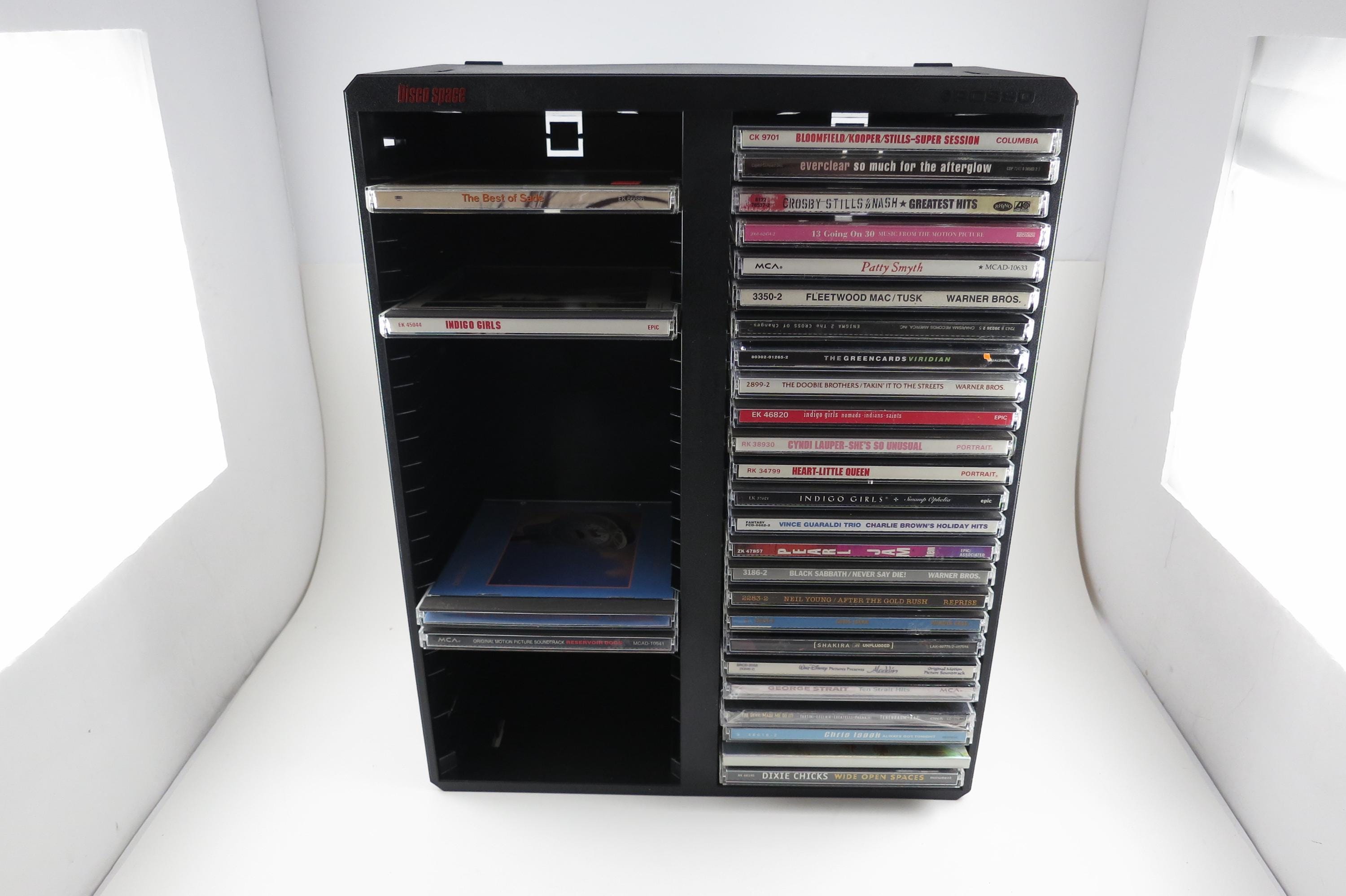 Vintage Black Posso Disco Space CD Crate: Double Holder, 50 Discs. Excellent Original Condition. Measures 11 1/4 inches wide, 14 1/4 inches tall and 5 1/4 inches deep. Can hold up to 6 double cd's as well as the singles.