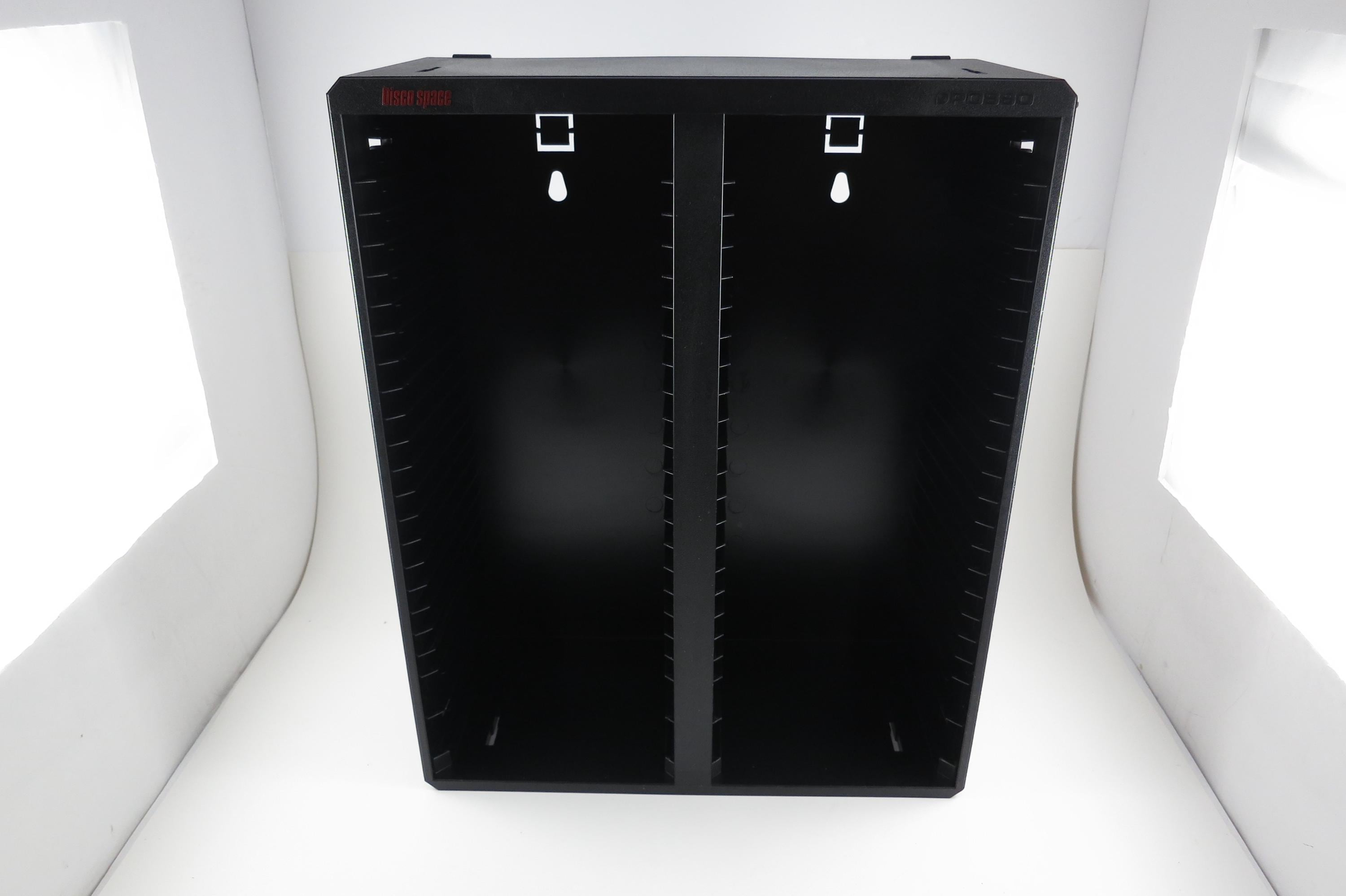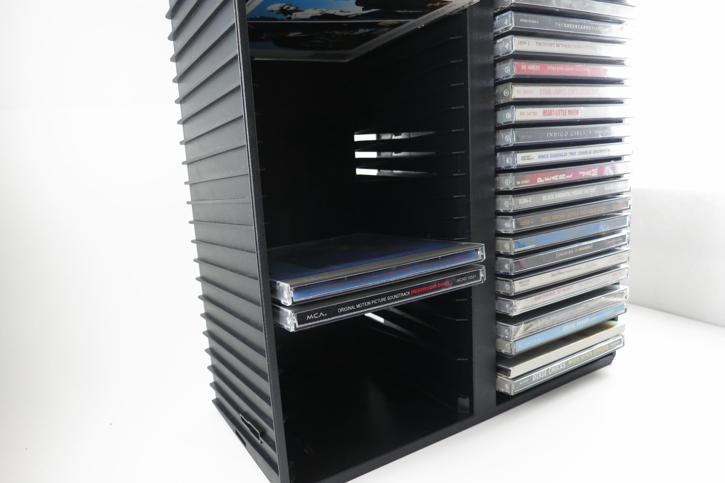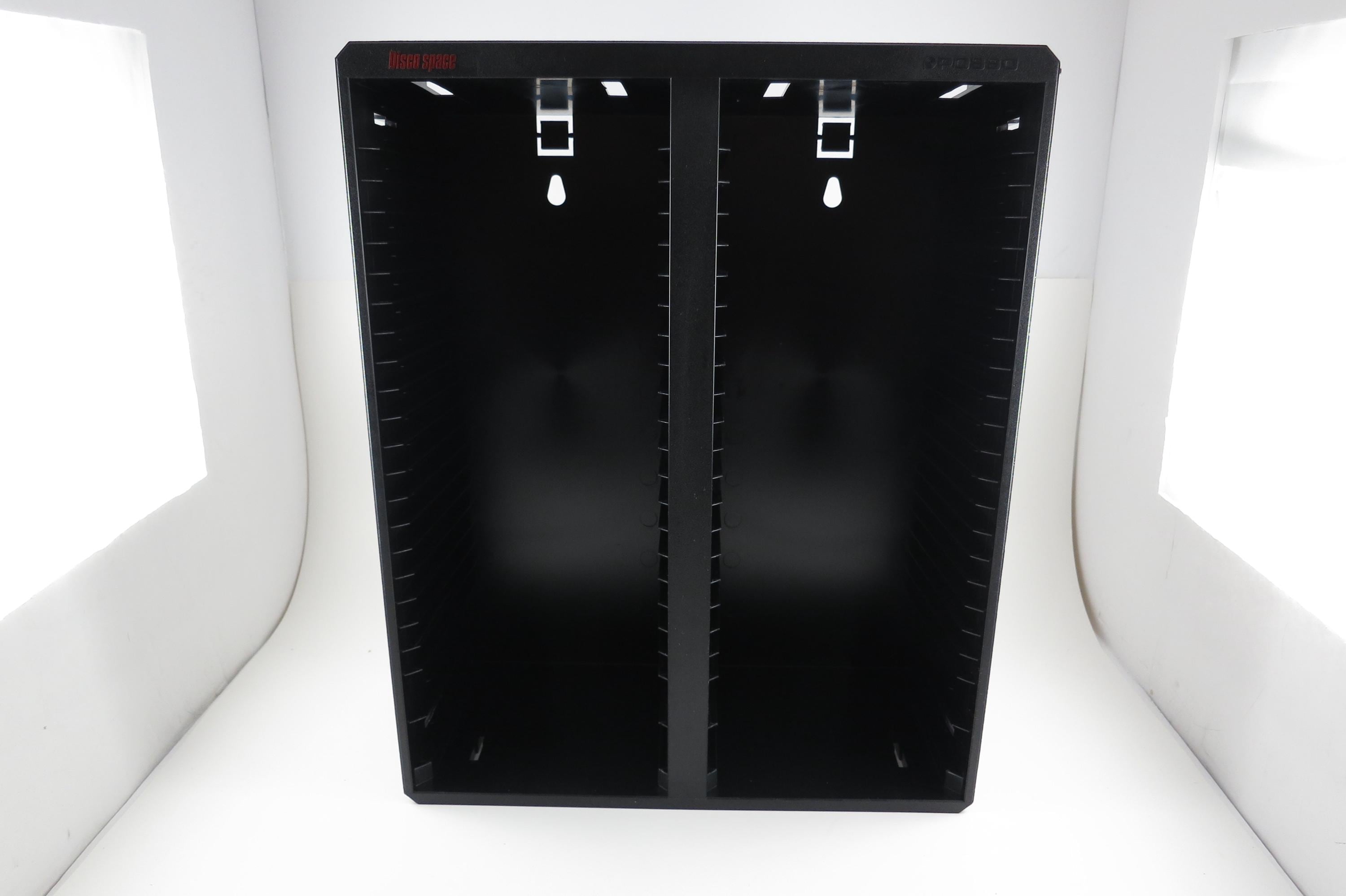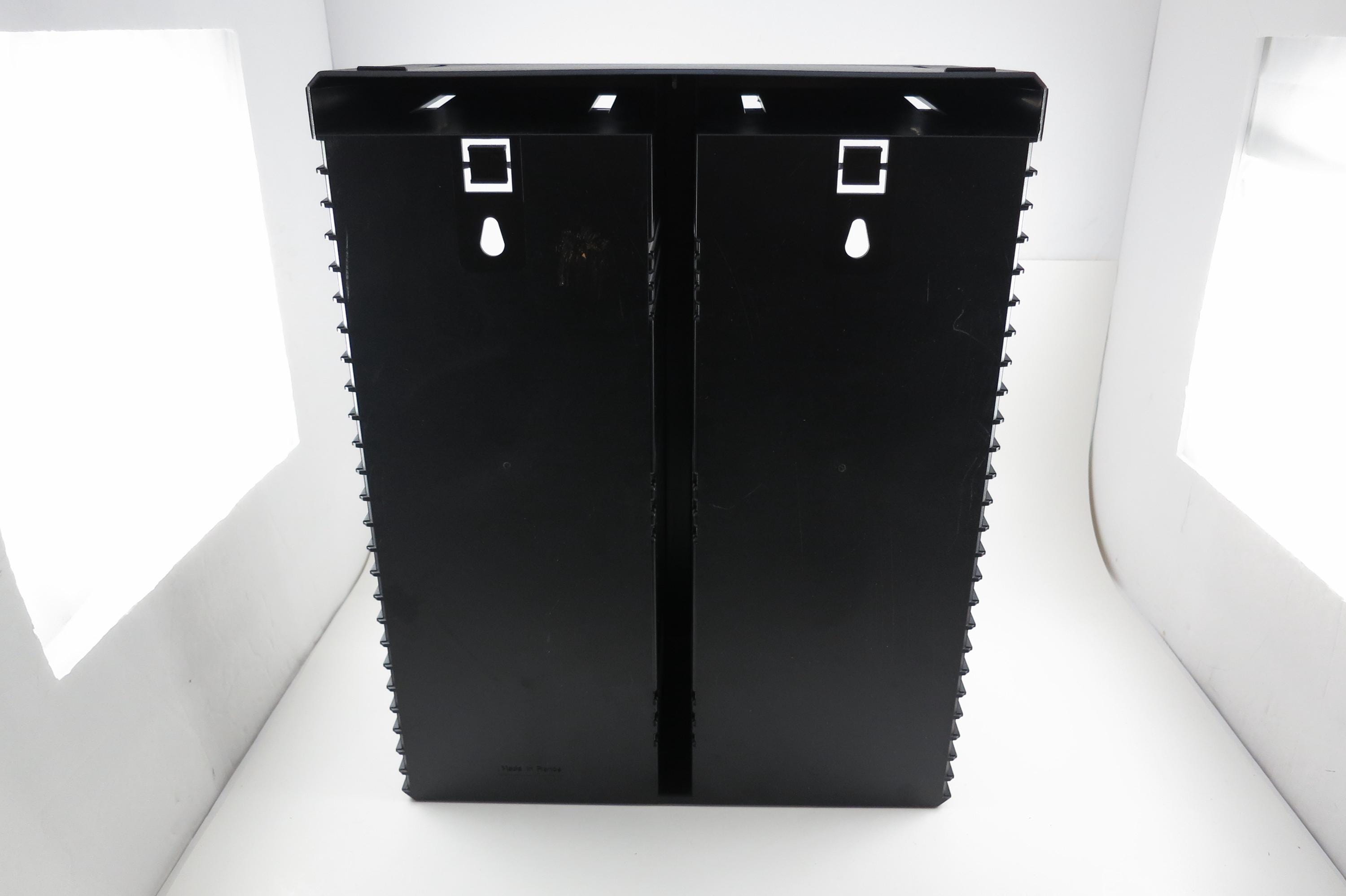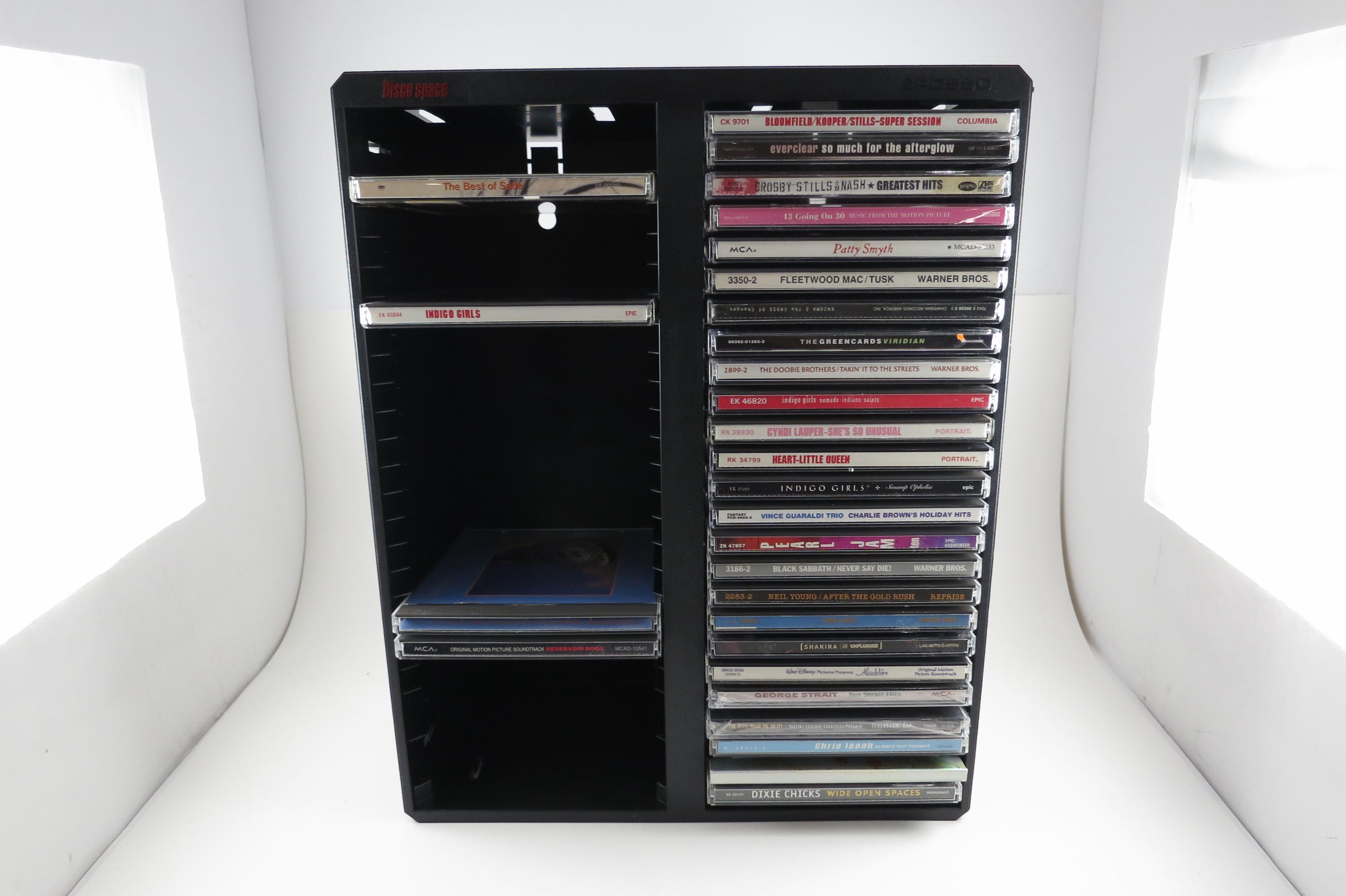 Vintage Black Posso Disco Space CD Crate: Double Holder, 50 Discs. Excellent Original Condition. Measures 11 1/4 inches wide, 14 1/4 inches tall and 5 1/4 inches deep. Can hold up to 6 double cd's as well as the singles.
