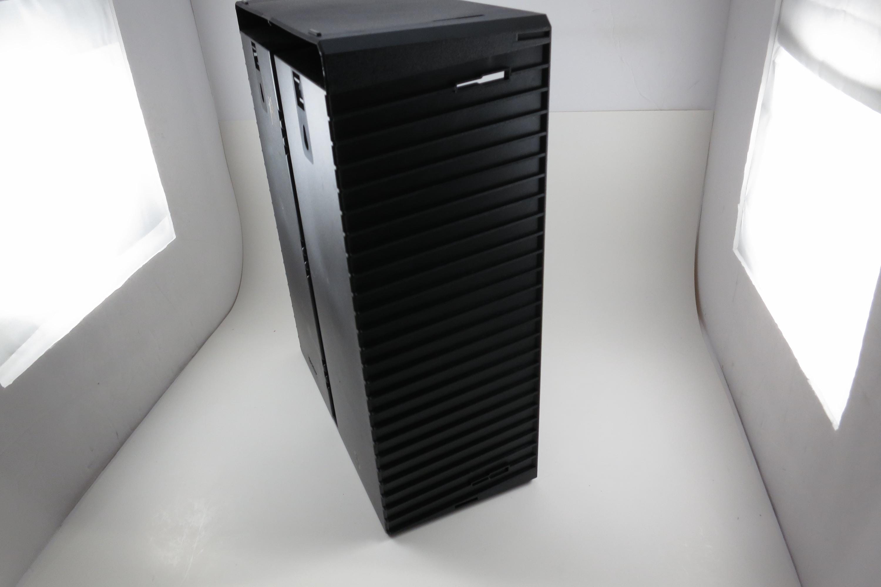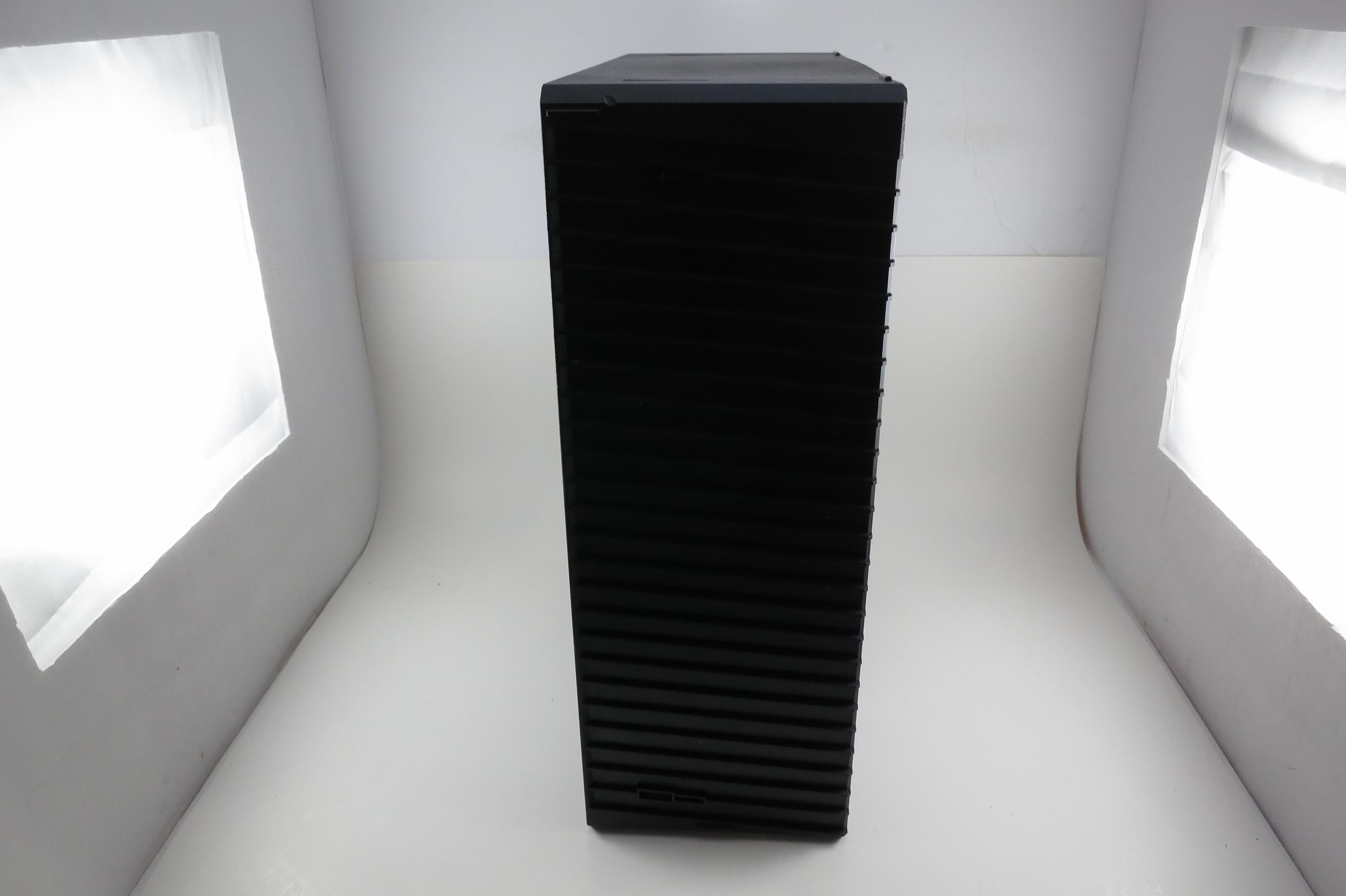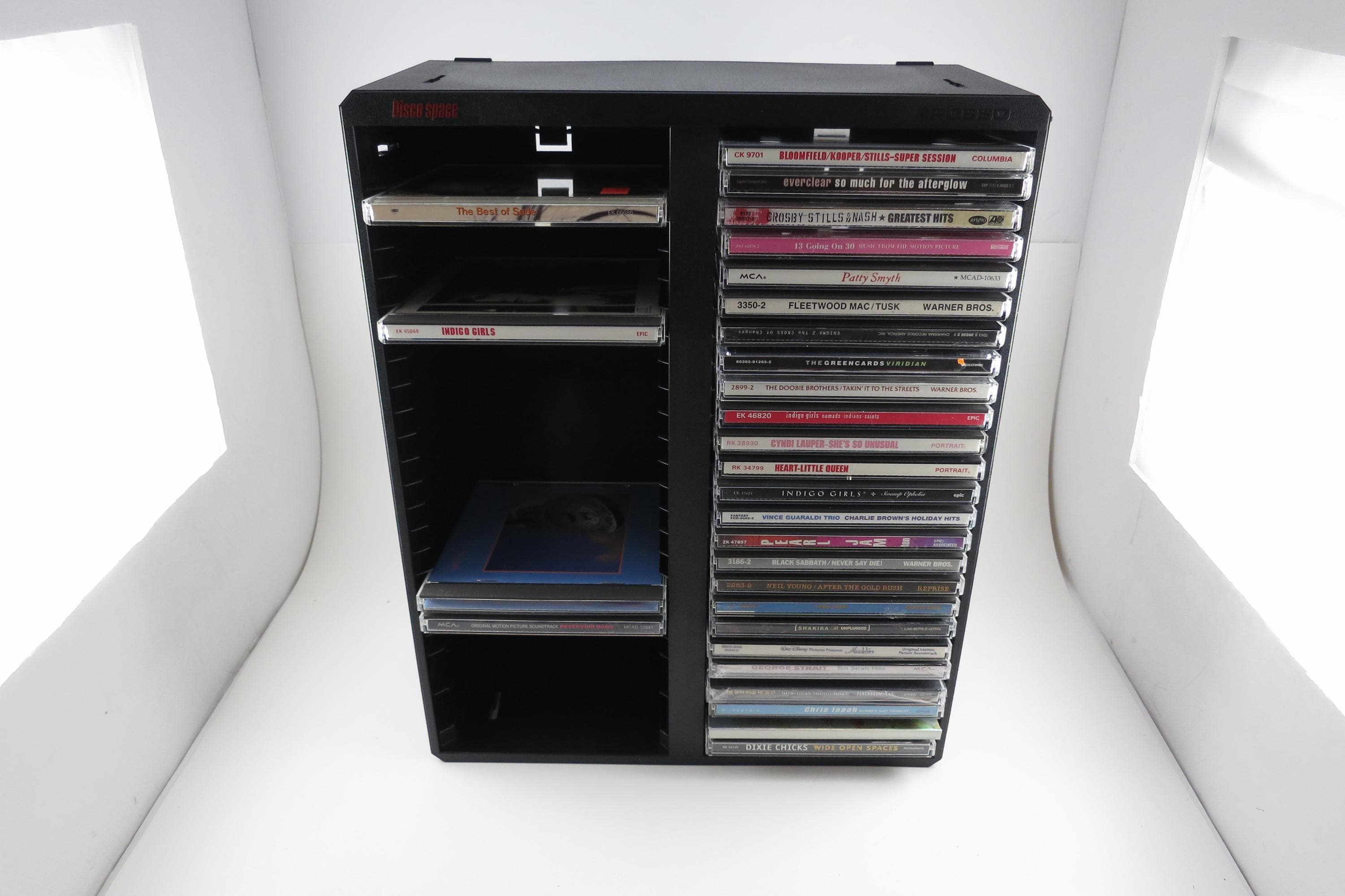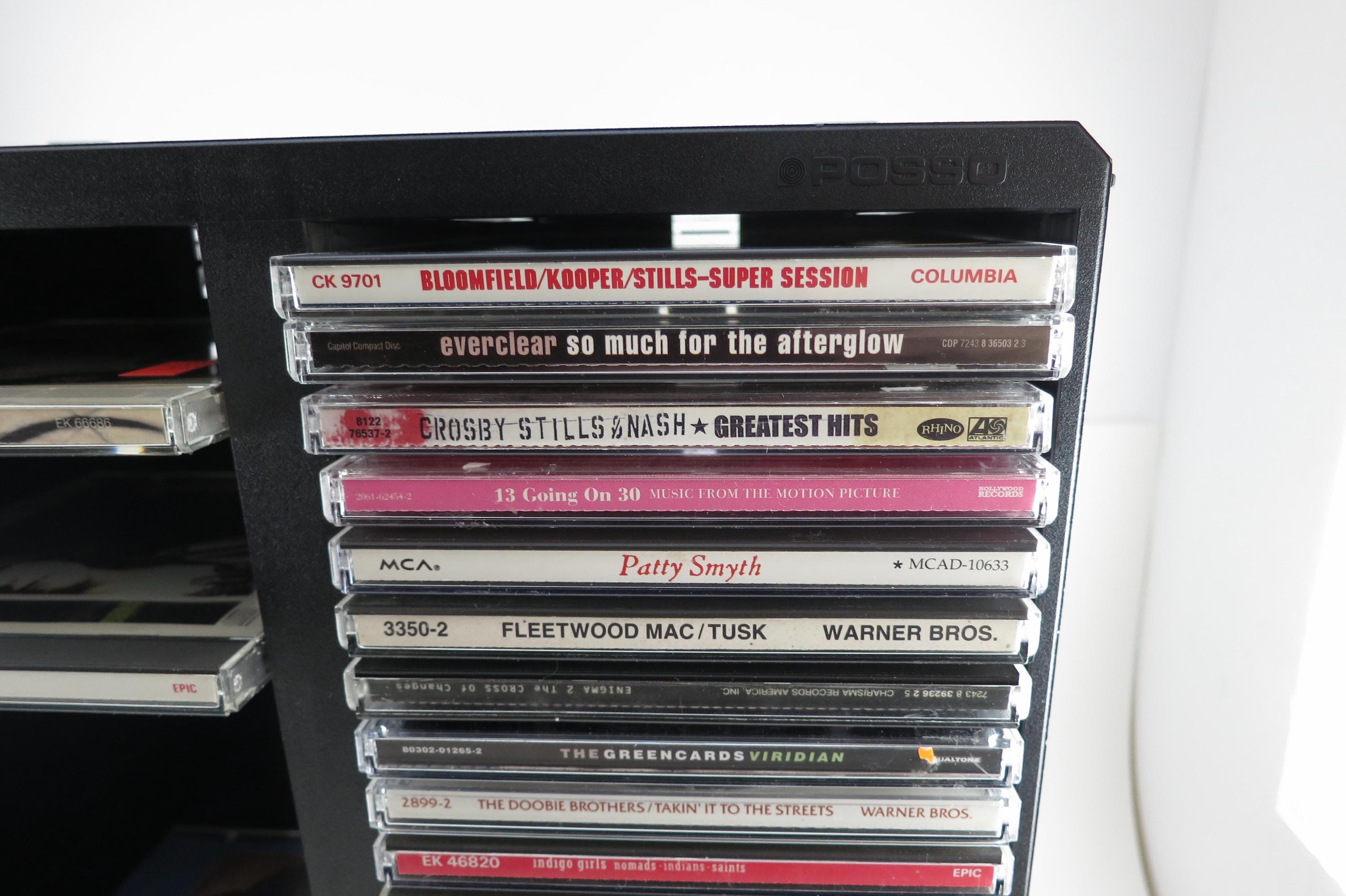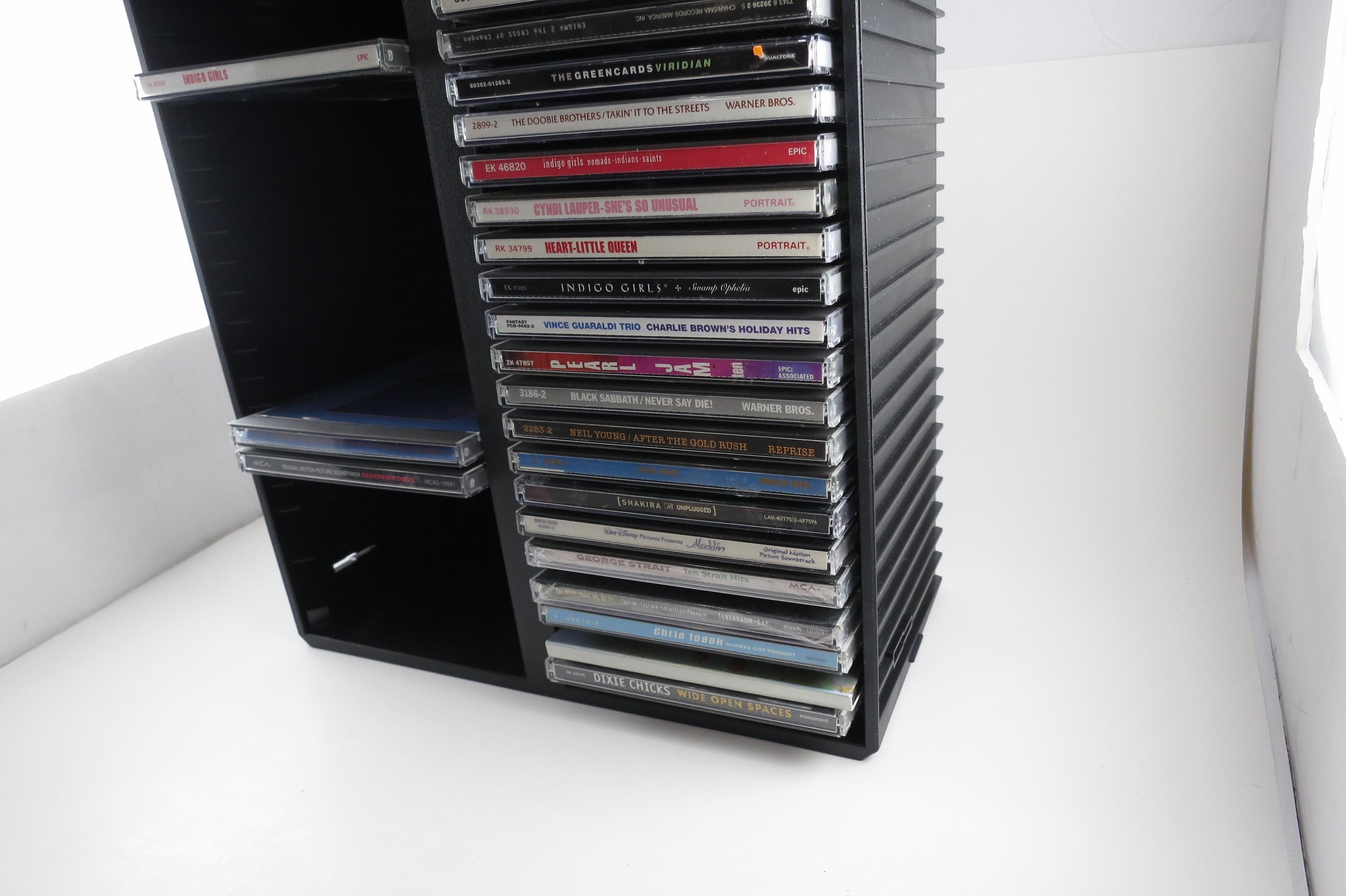 Vintage Black Posso Disco Space CD Crate: Double Holder, 50 Discs. Excellent Original Condition. Measures 11 1/4 inches wide, 14 1/4 inches tall and 5 1/4 inches deep. Can hold up to 6 double cd's as well as the singles.