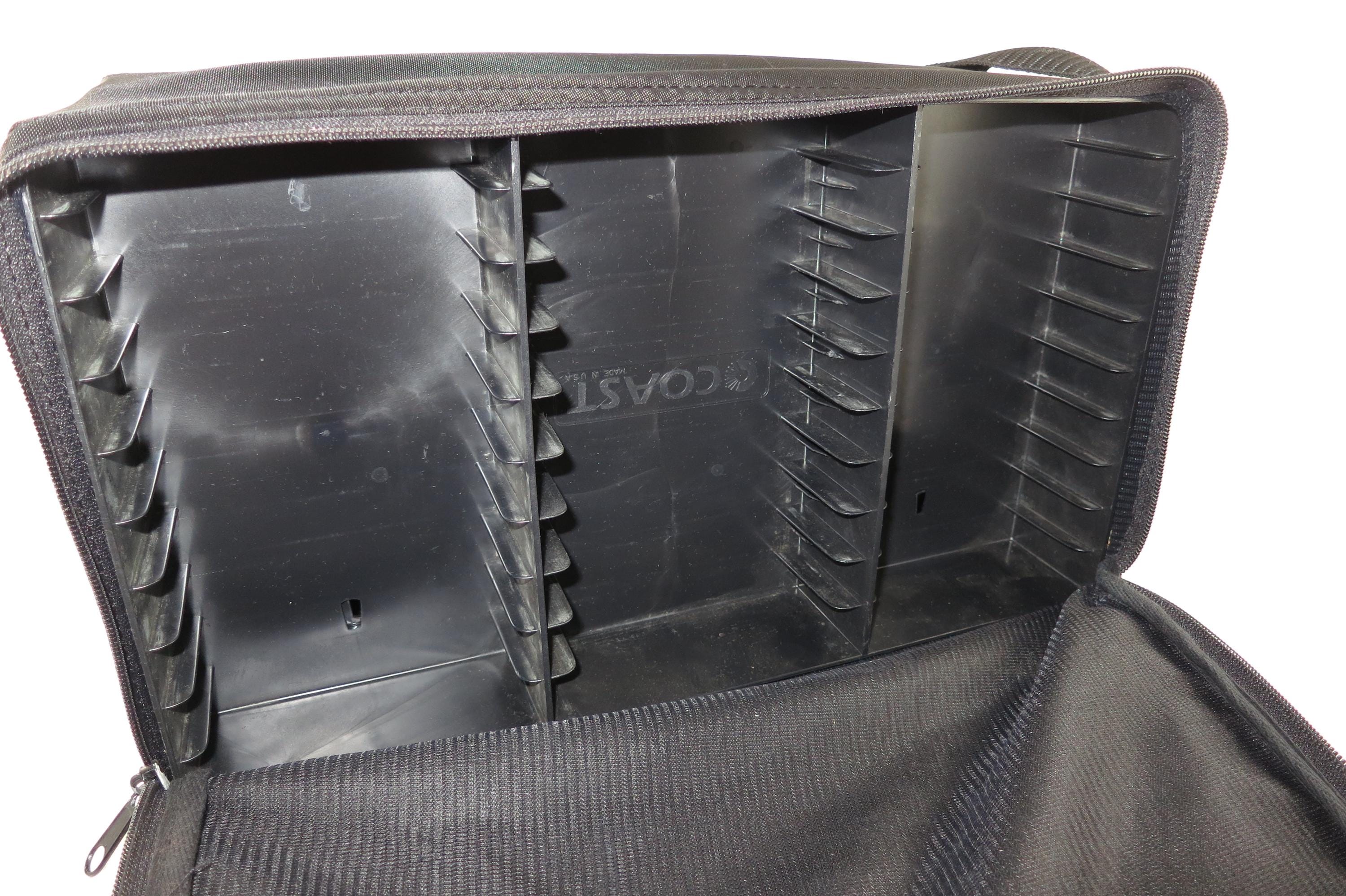 1980's Coast Black Cassette Tape Carrying Mega Case Holds 60 Cassettes with Hard Inner Trays Double Sided Double Strap. Each side holds 30 tapes for a total storage of 60.