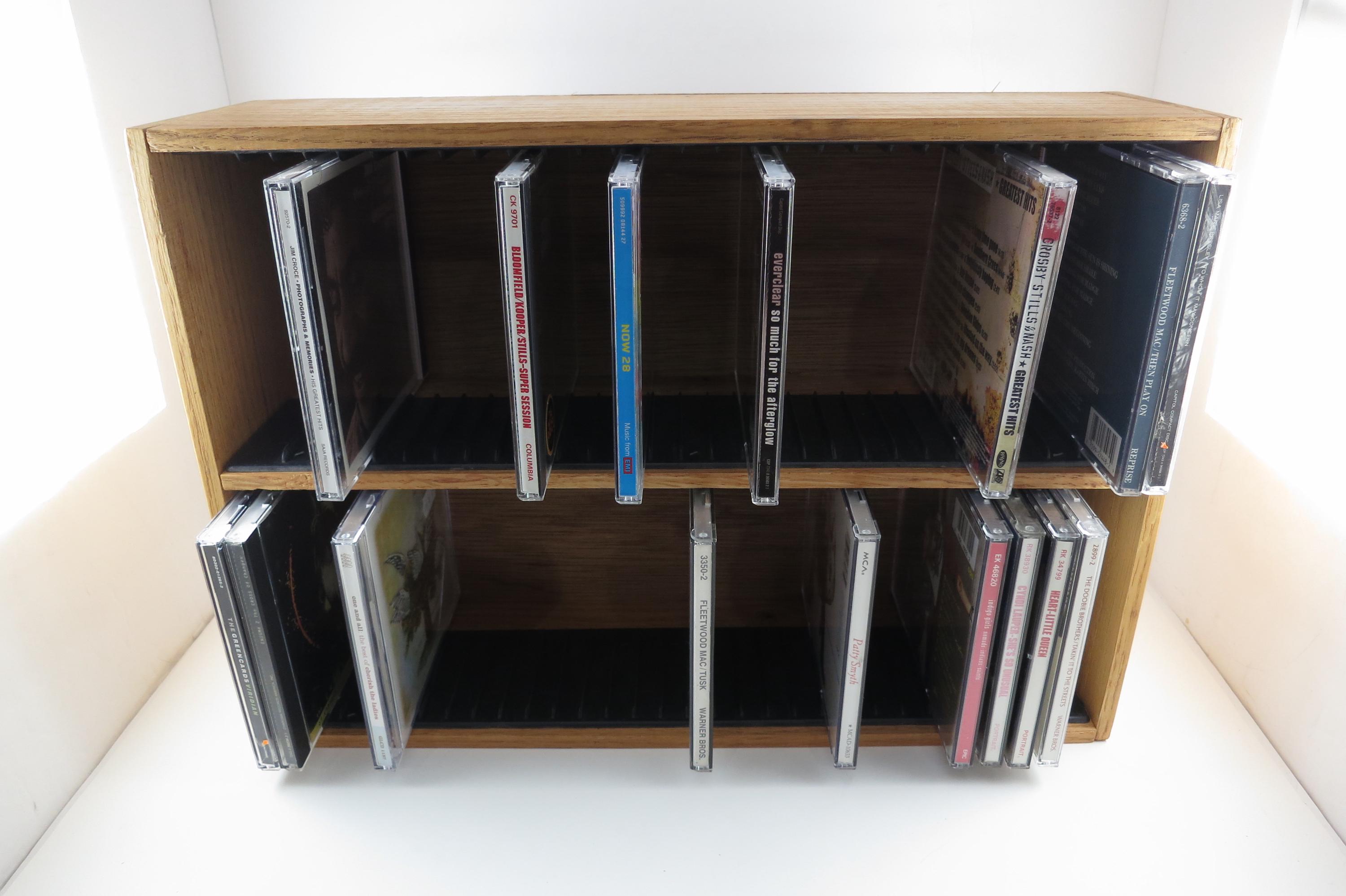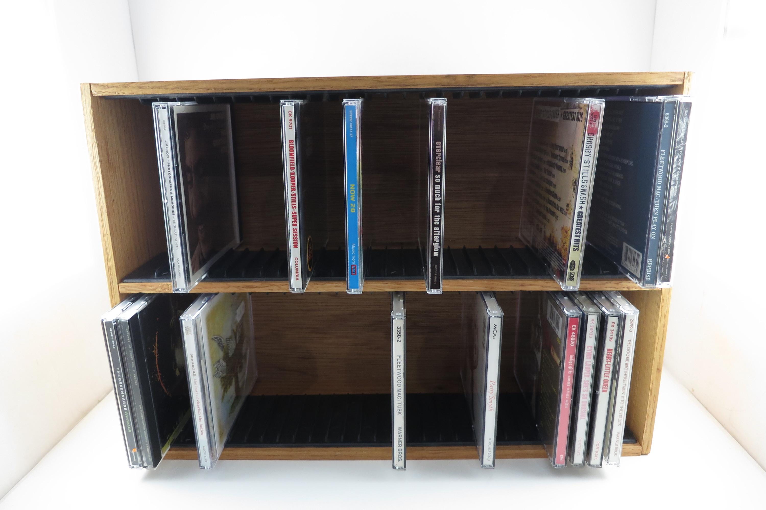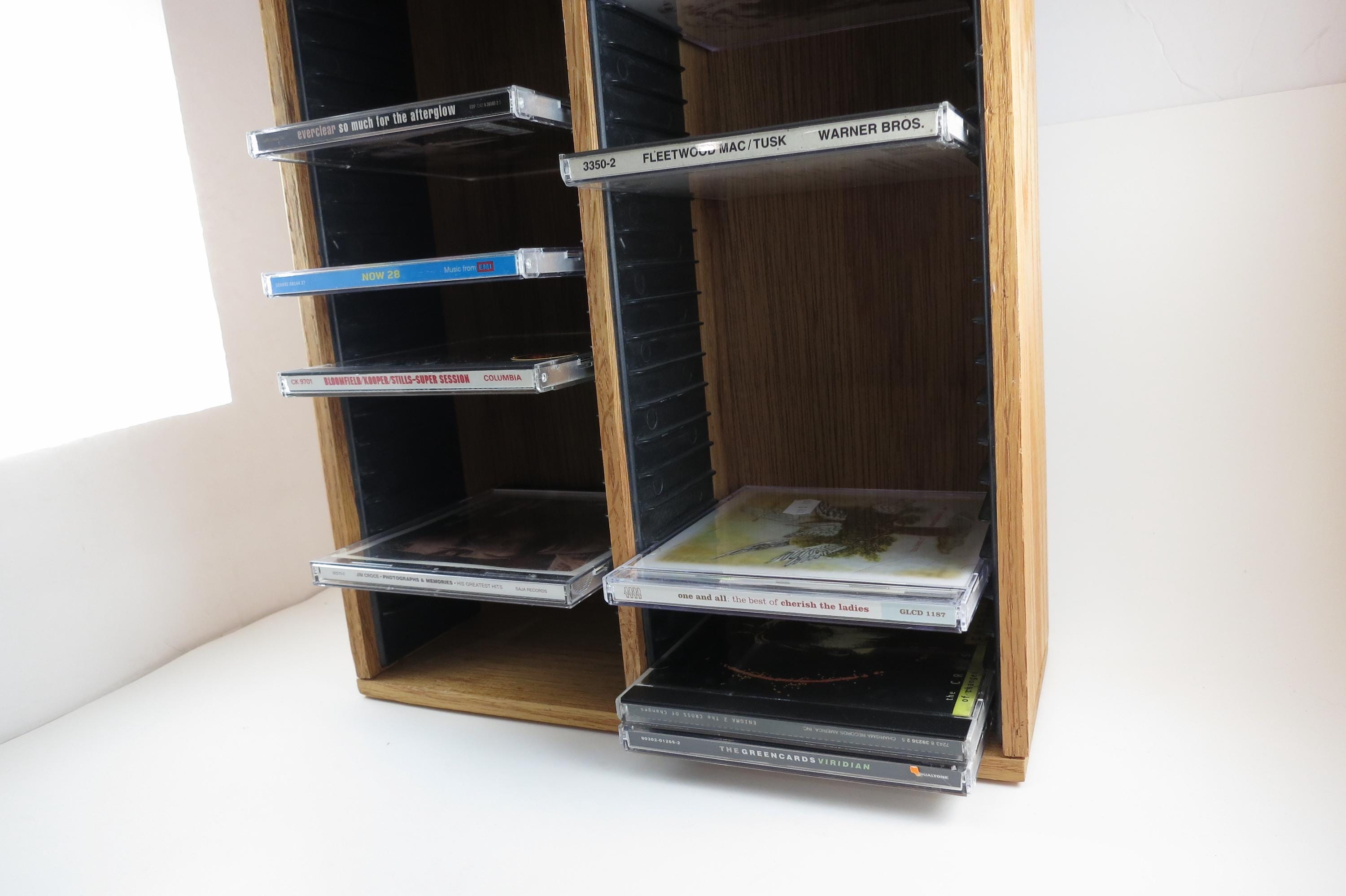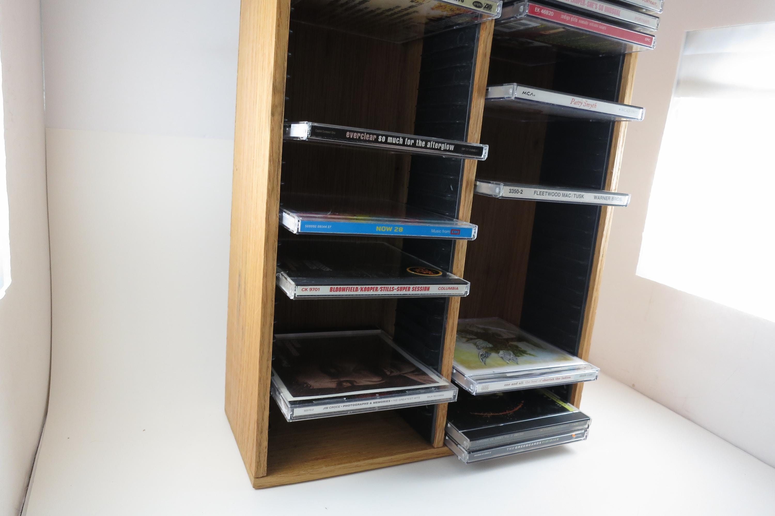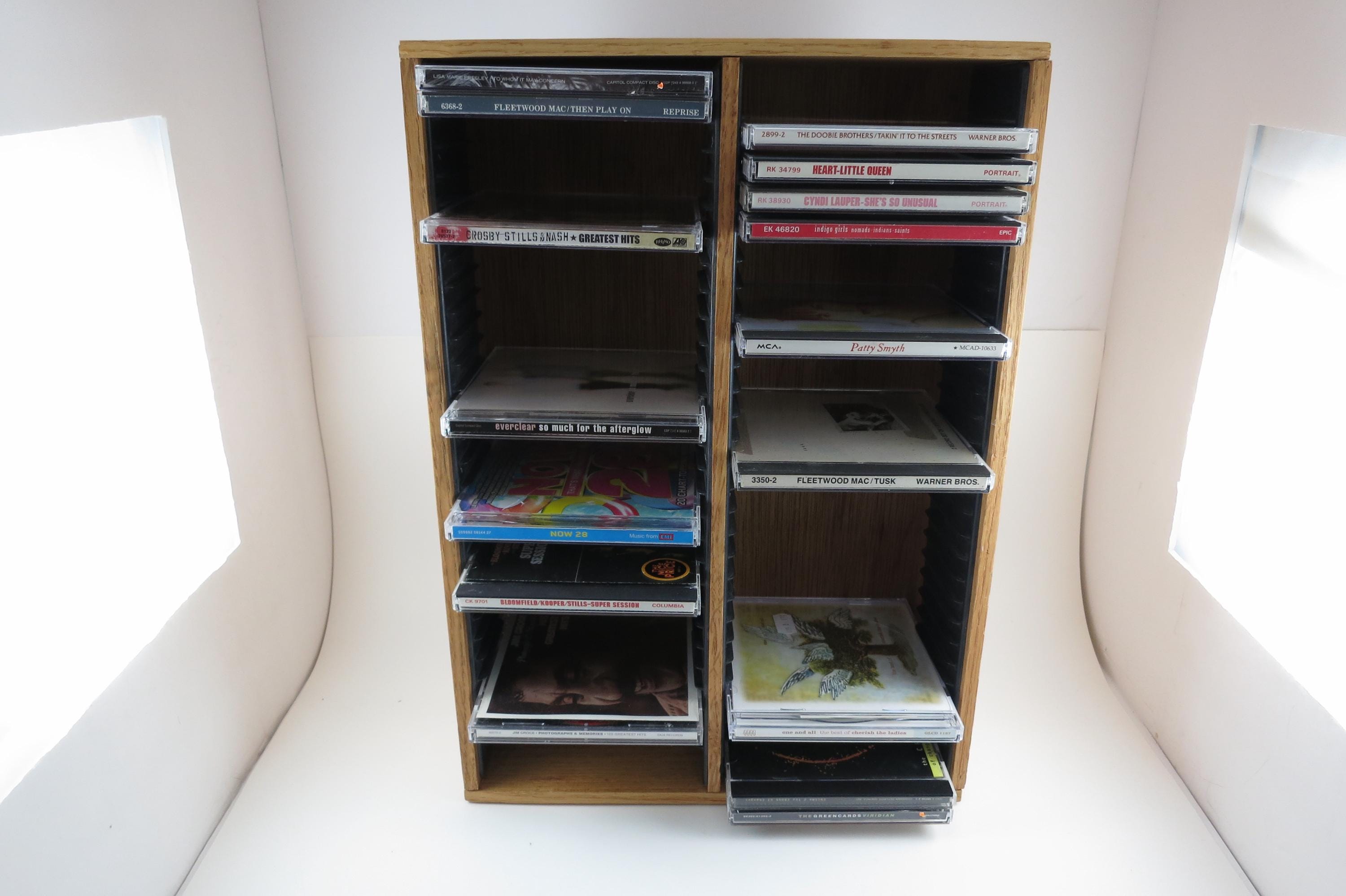 Vintage 90's Faux Wood Slotted CD Holder Display Holds 60 Discs In Cases Excellent Condition. Measures 11 1/2 inches wide, 4 3/4 inches deep and 16 1/8 inches tall. Holds 60 CD's Total. Up to four double cd's. Great for storage or display of your collection.