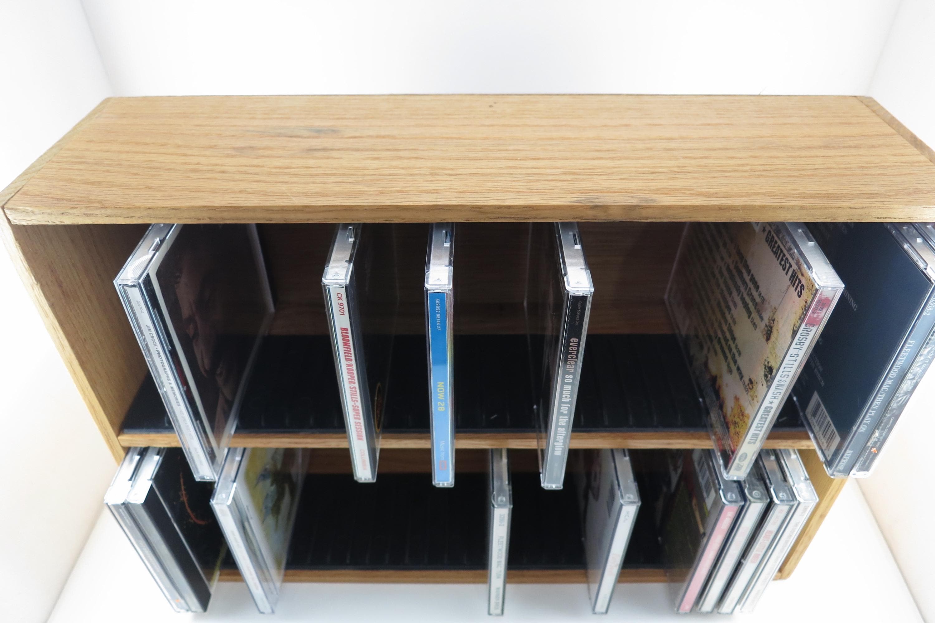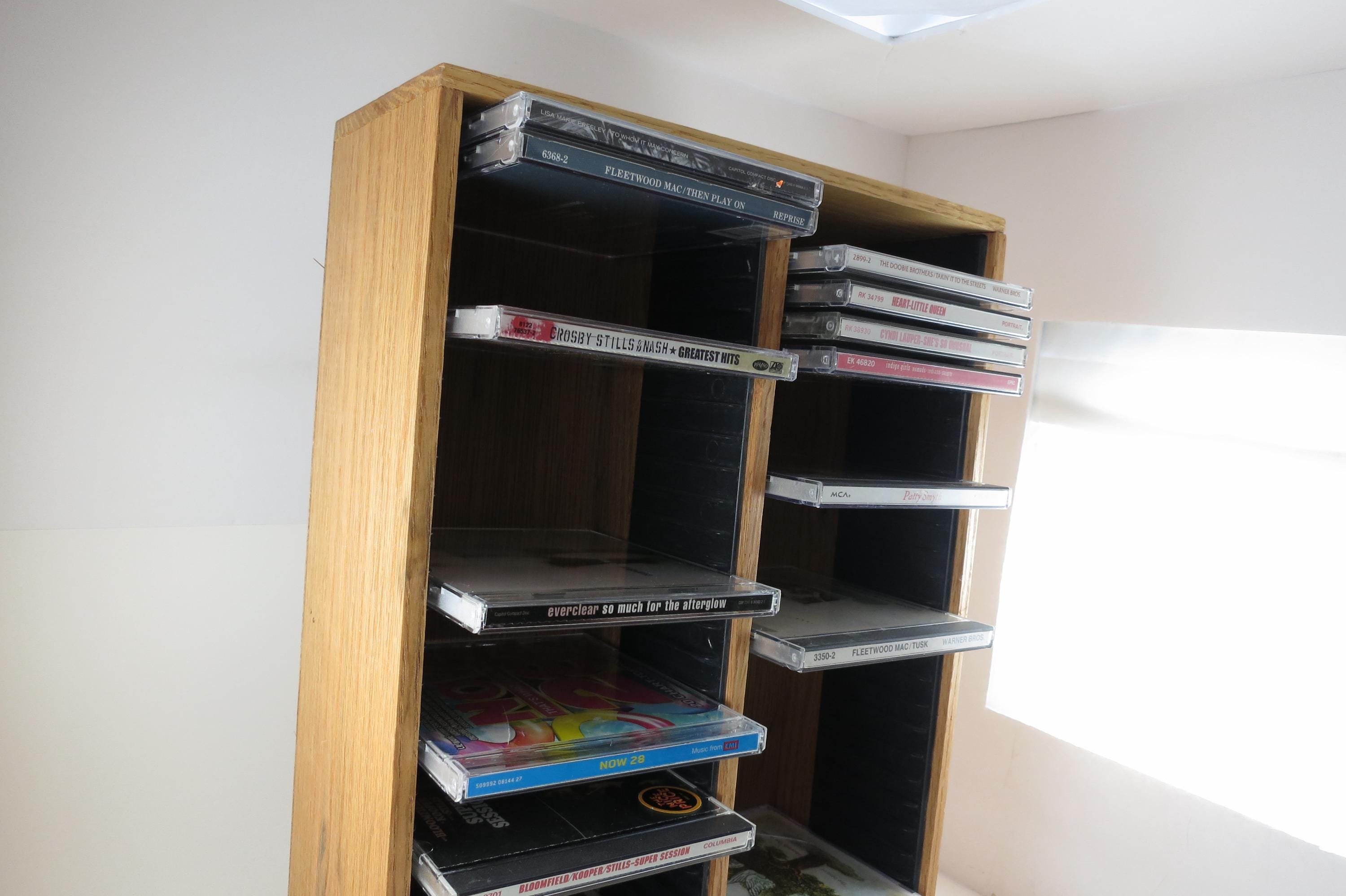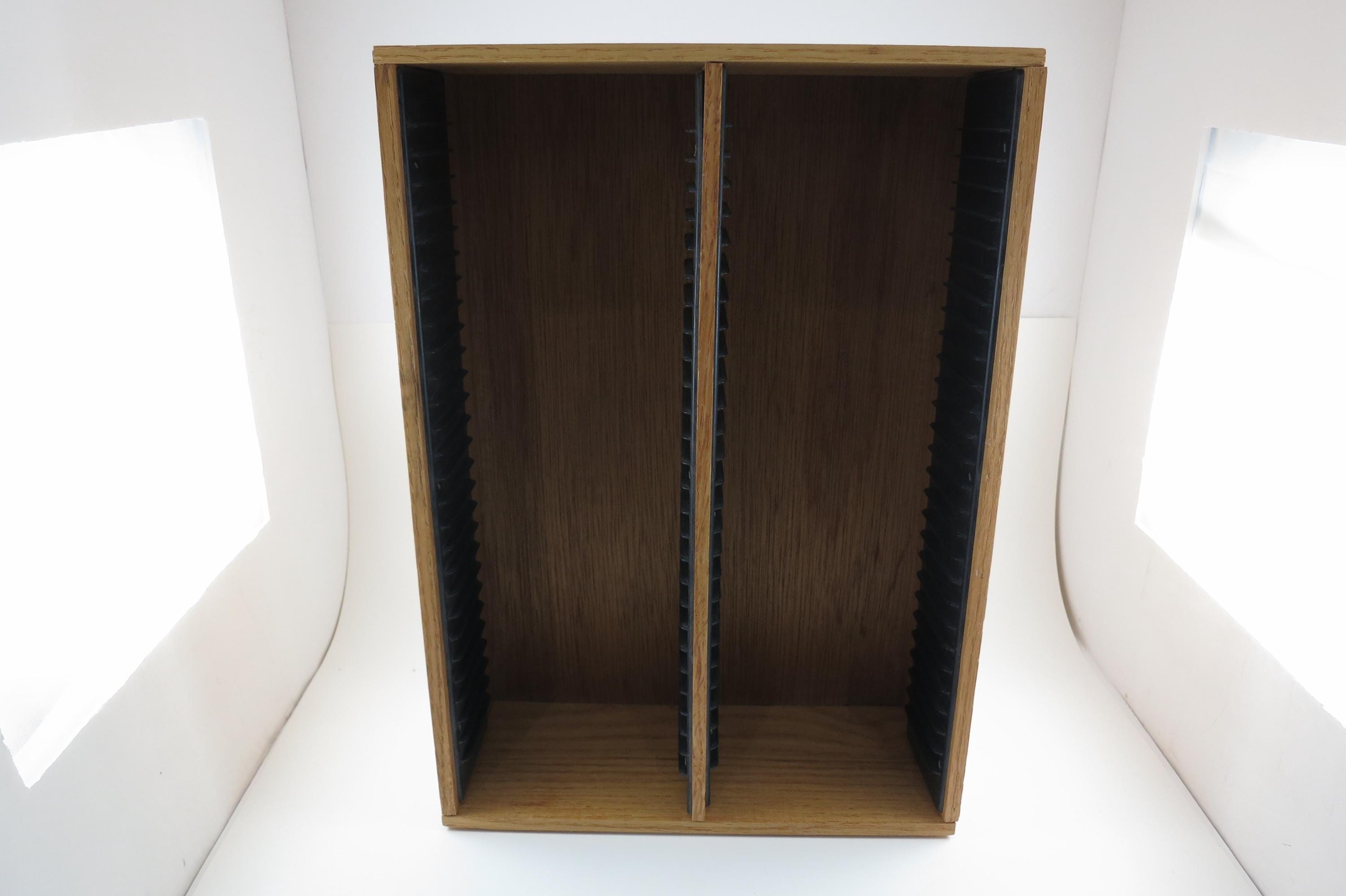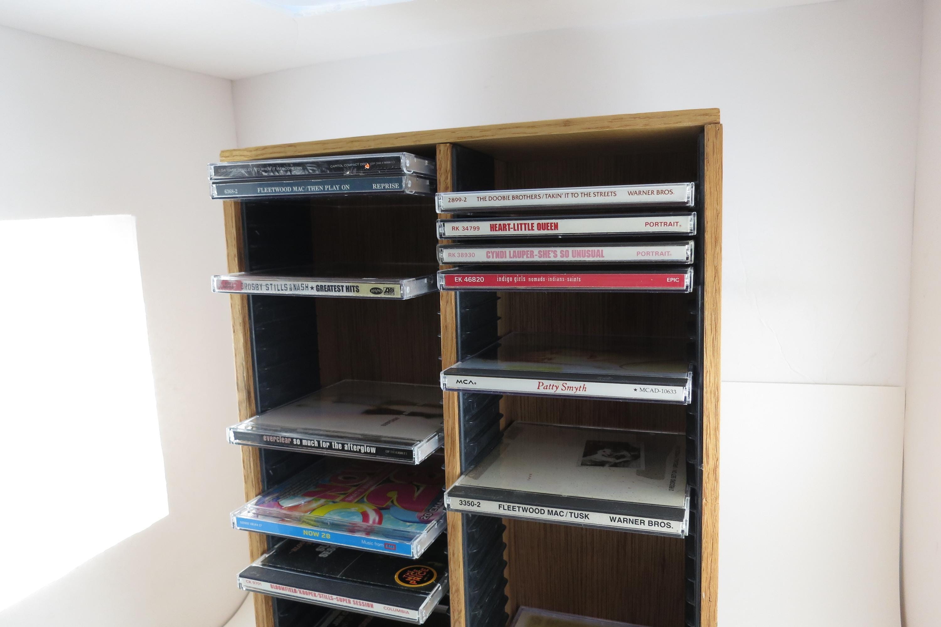 Vintage 90's Faux Wood Slotted CD Holder Display Holds 60 Discs In Cases Excellent Condition. Measures 11 1/2 inches wide, 4 3/4 inches deep and 16 1/8 inches tall. Holds 60 CD's Total. Up to four double cd's. Great for storage or display of your collection.