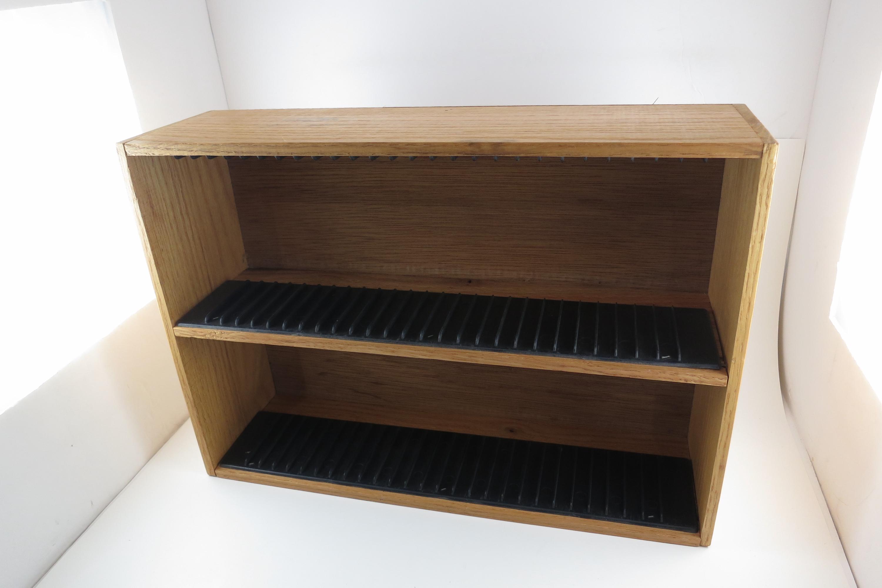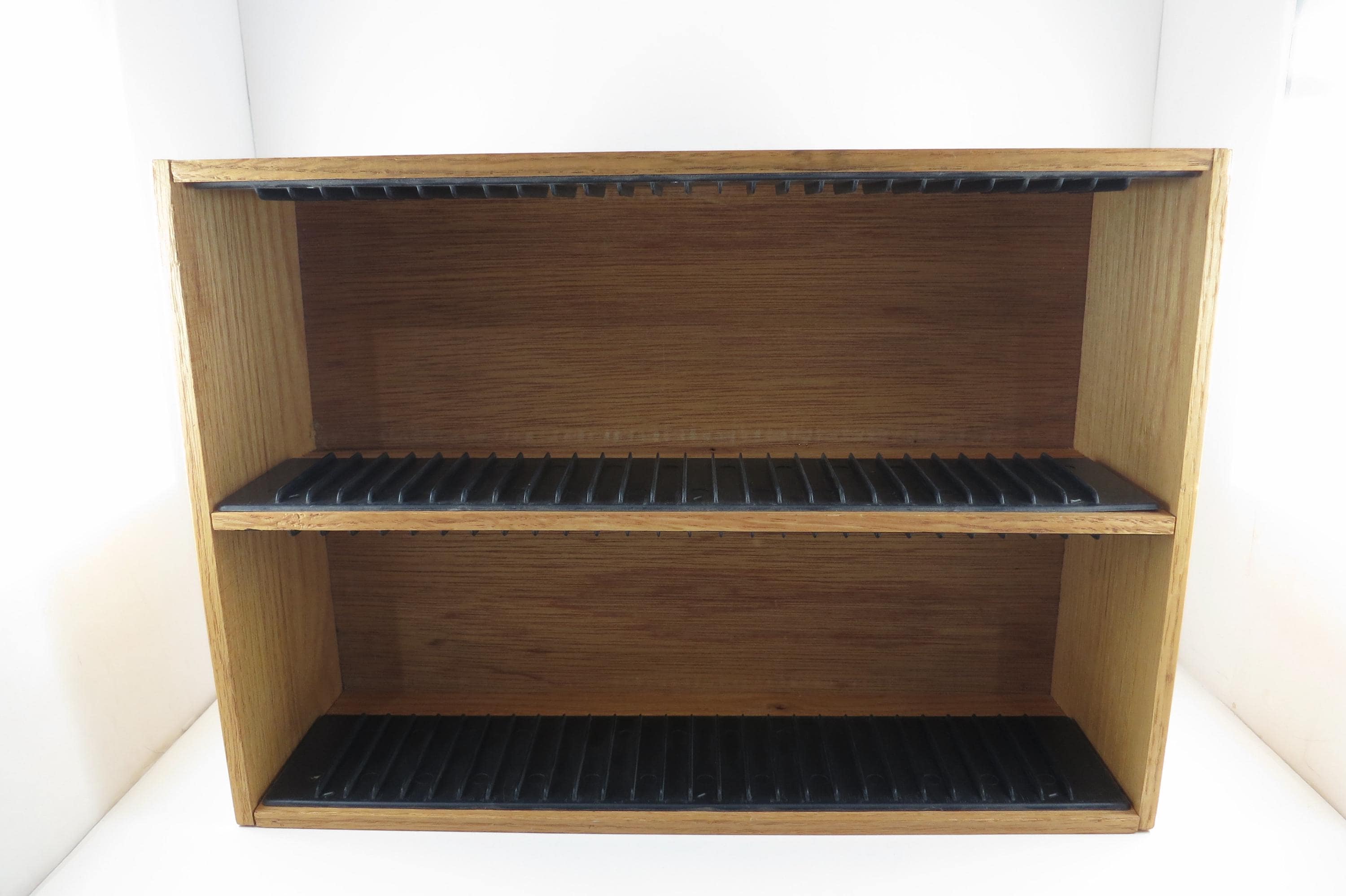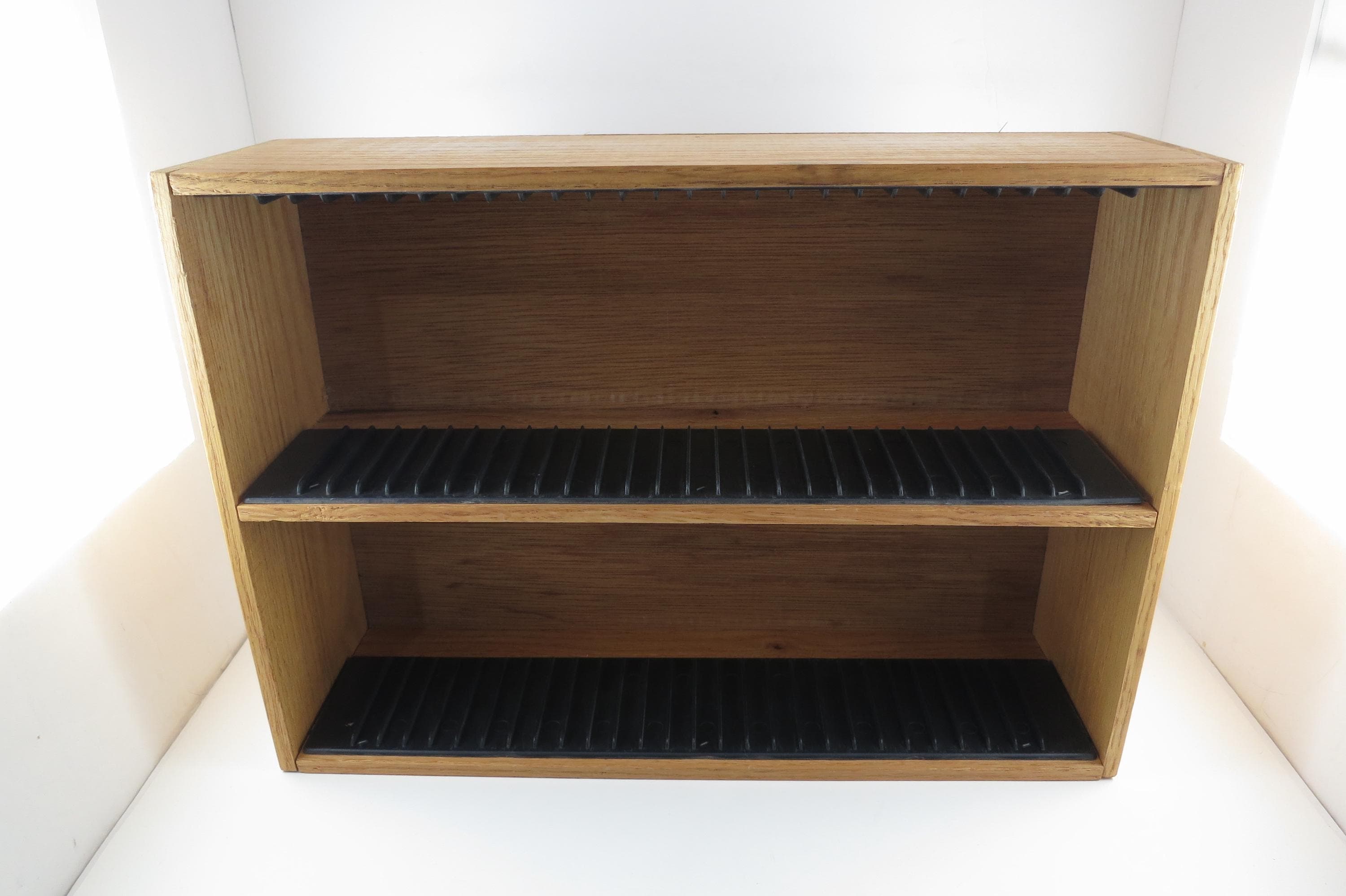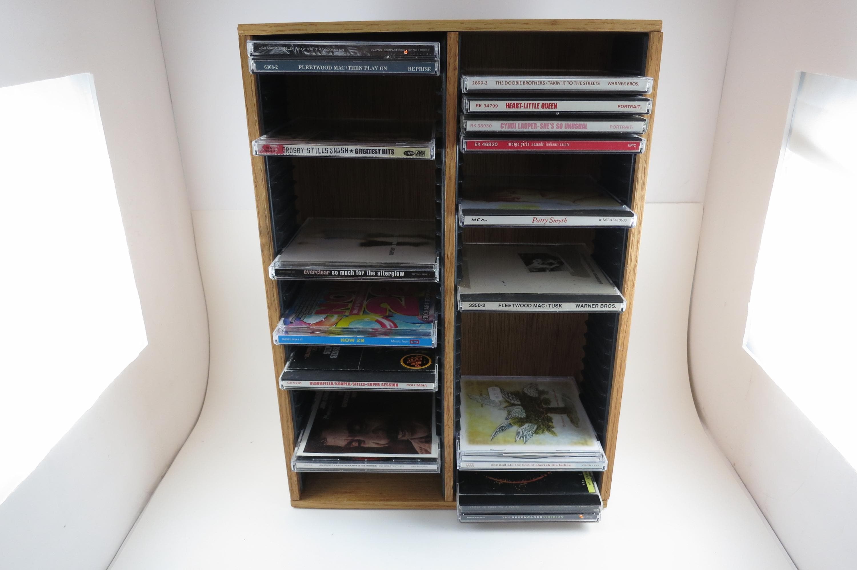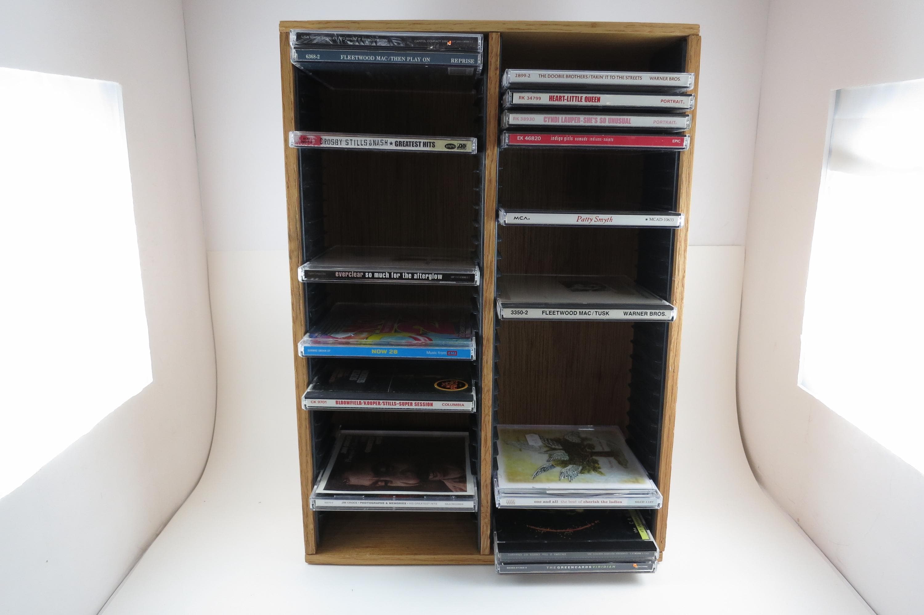Vintage 90's Faux Wood Slotted CD Holder Display Holds 60 Discs In Cases Excellent Condition. Measures 11 1/2 inches wide, 4 3/4 inches deep and 16 1/8 inches tall. Holds 60 CD's Total. Up to four double cd's. Great for storage or display of your collection.
