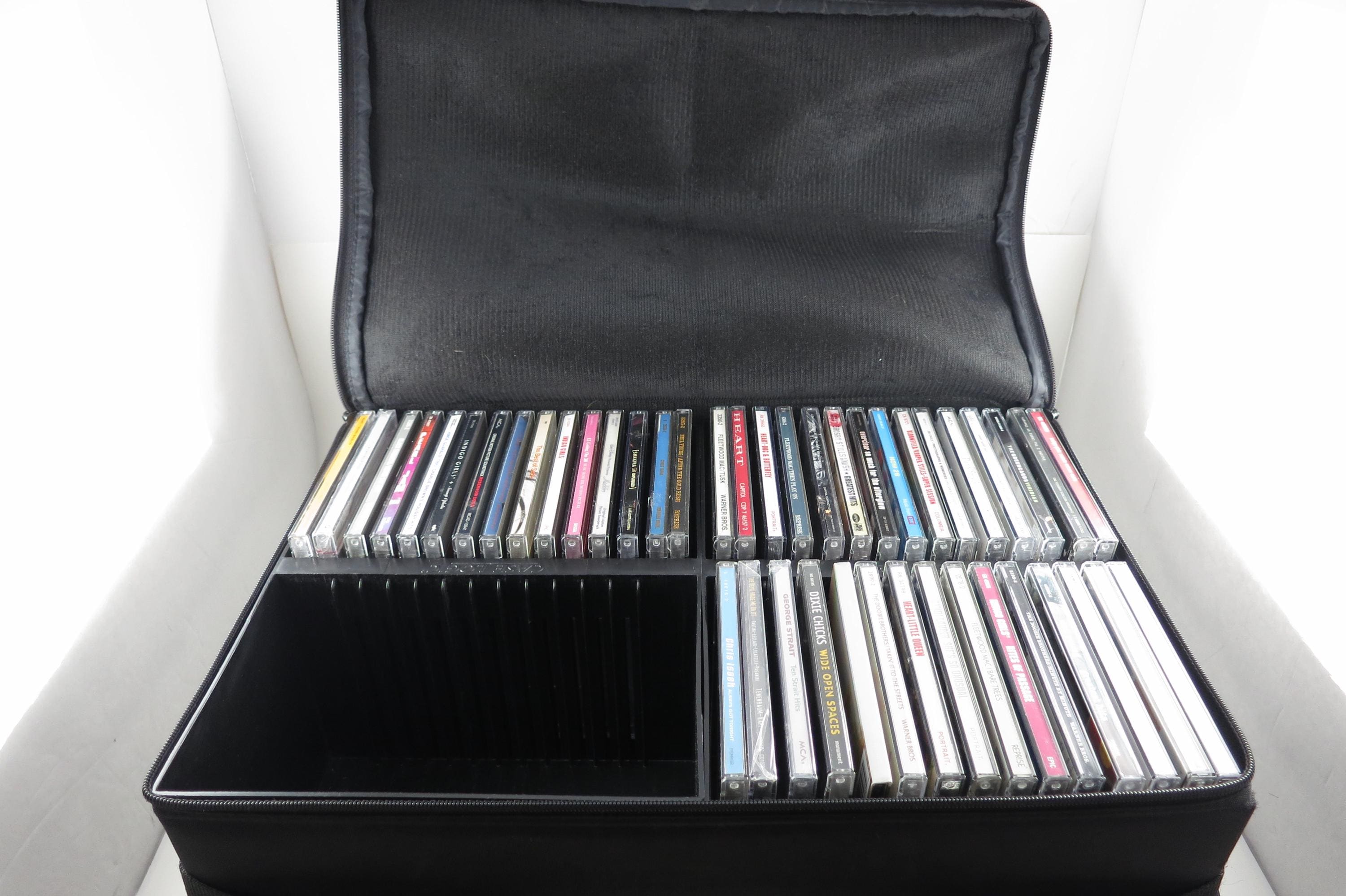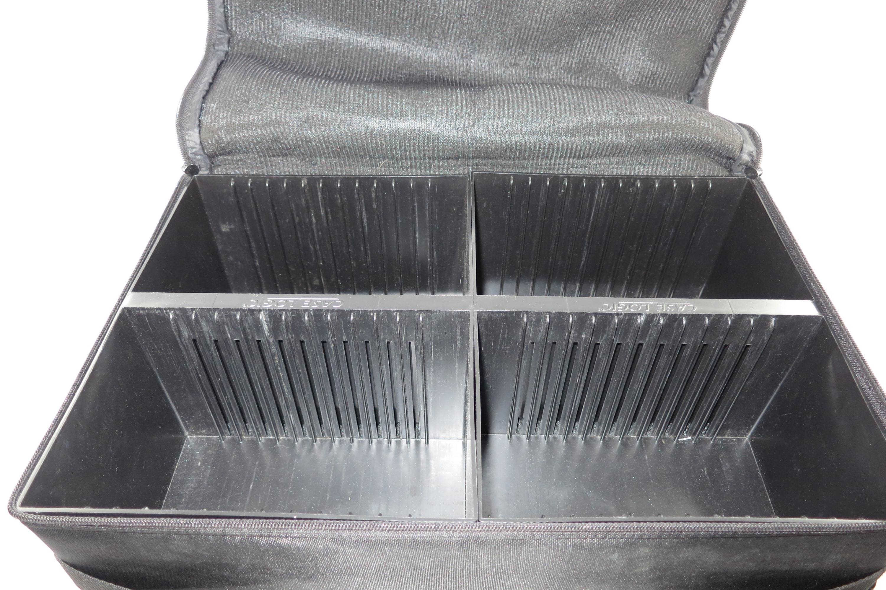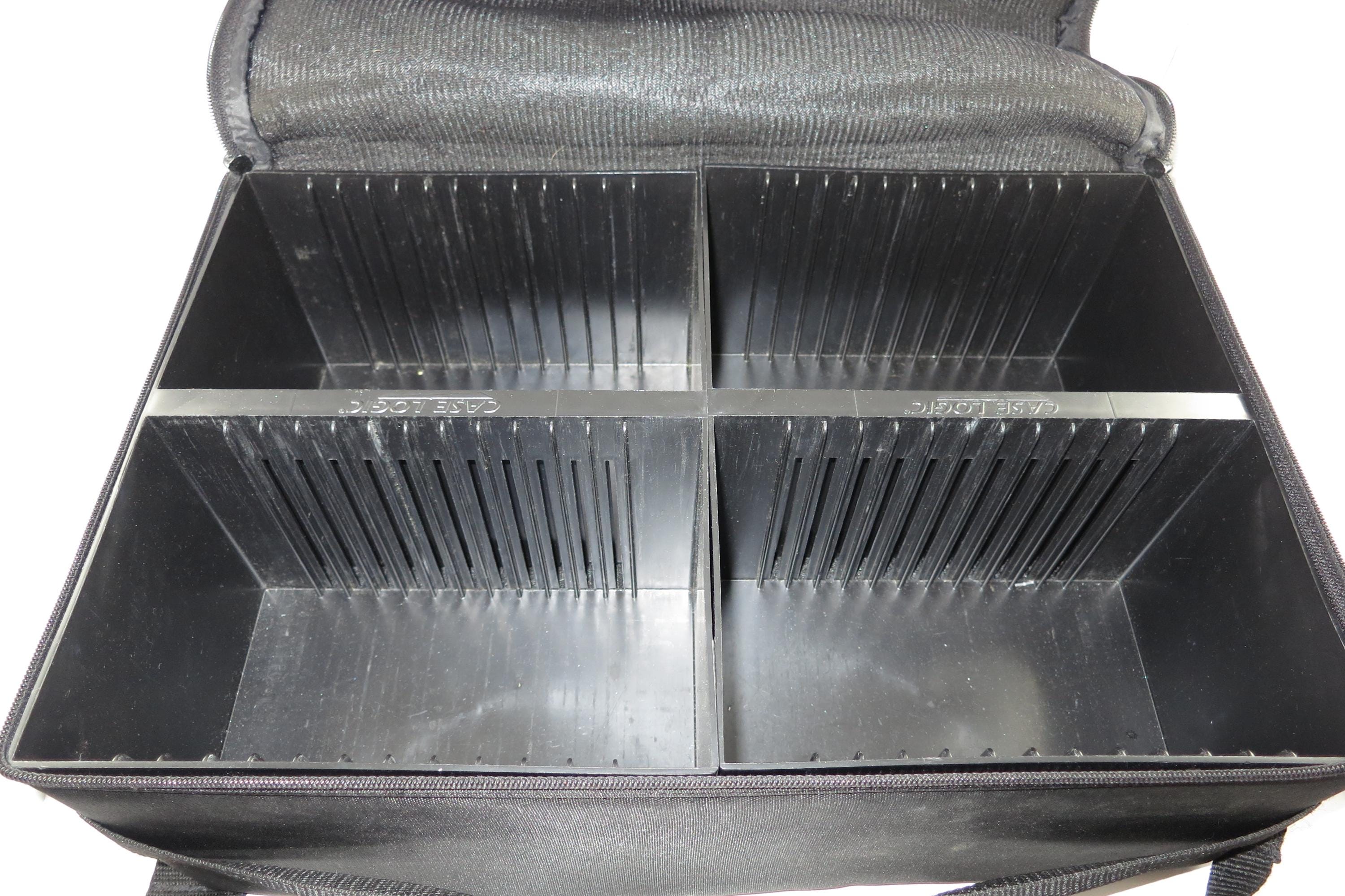 1990's Case Logic Black Mega Double CD Carrying Case Holds 60 Discs Carrying Strap Handle Excellent Condition. This is a large size case that can hold 60 regular discs or 52 regular discs and 8 Double Discs in their cases. It has a carrying handle and shoulder strap. Great condition.
