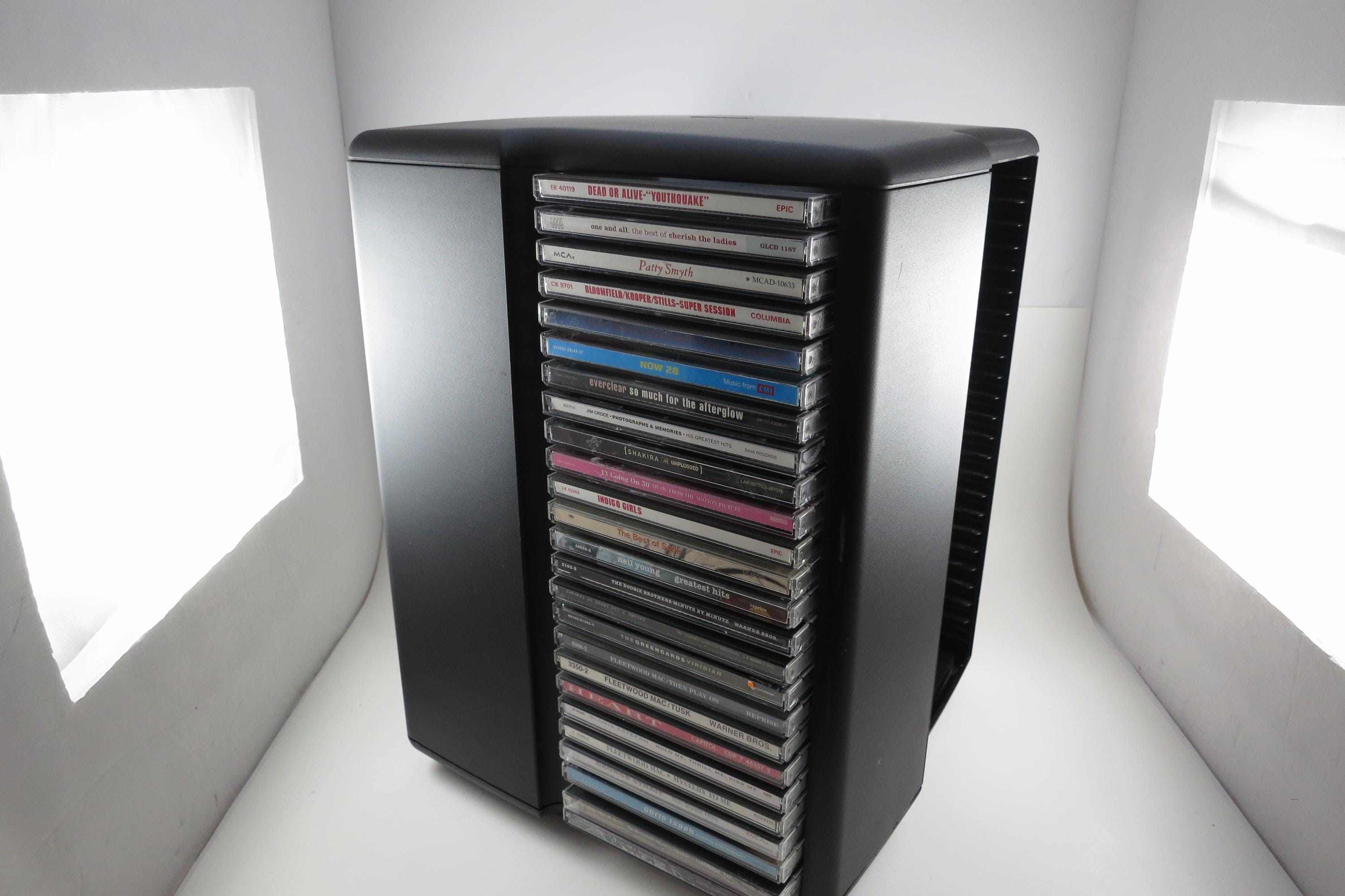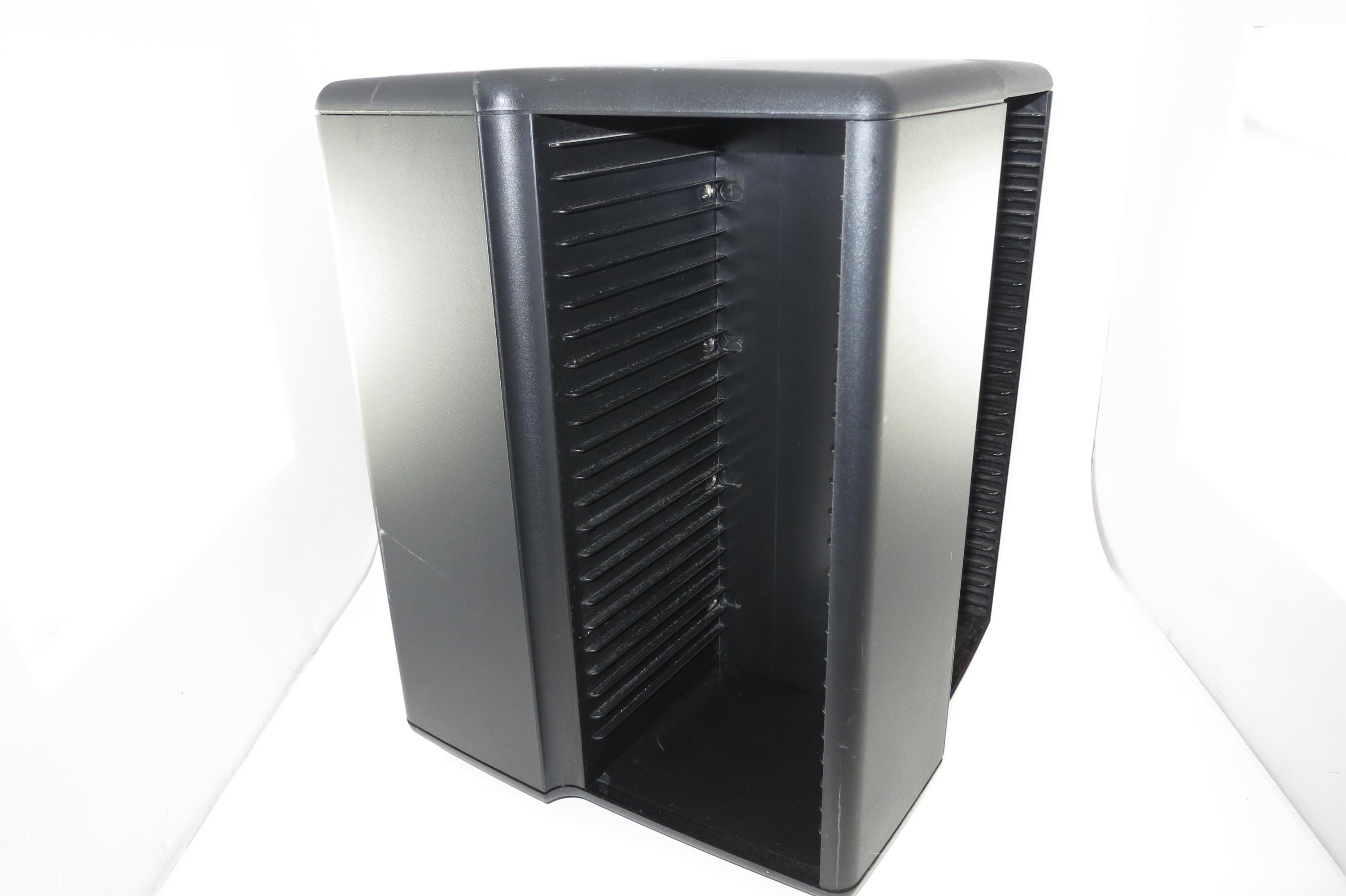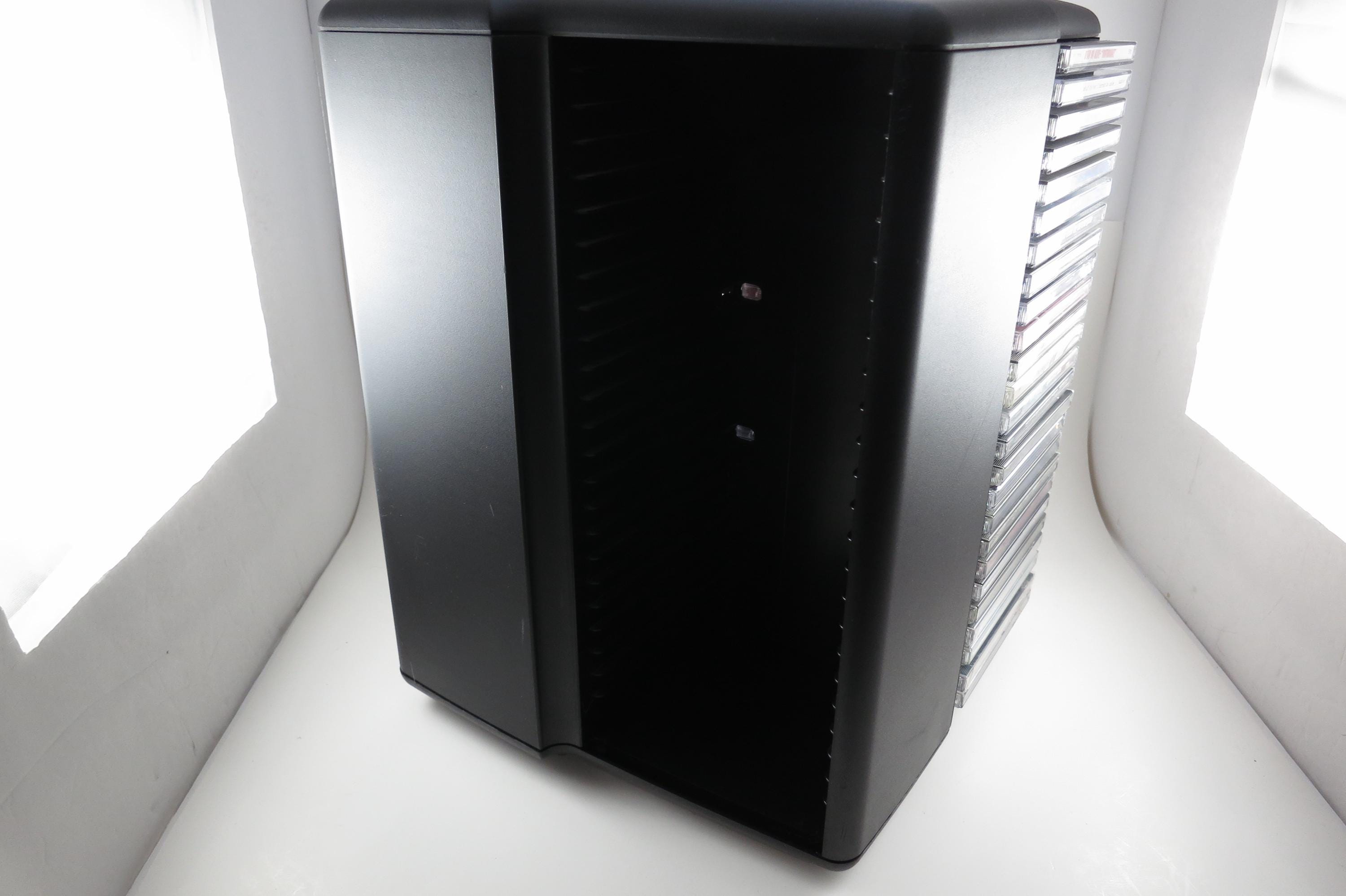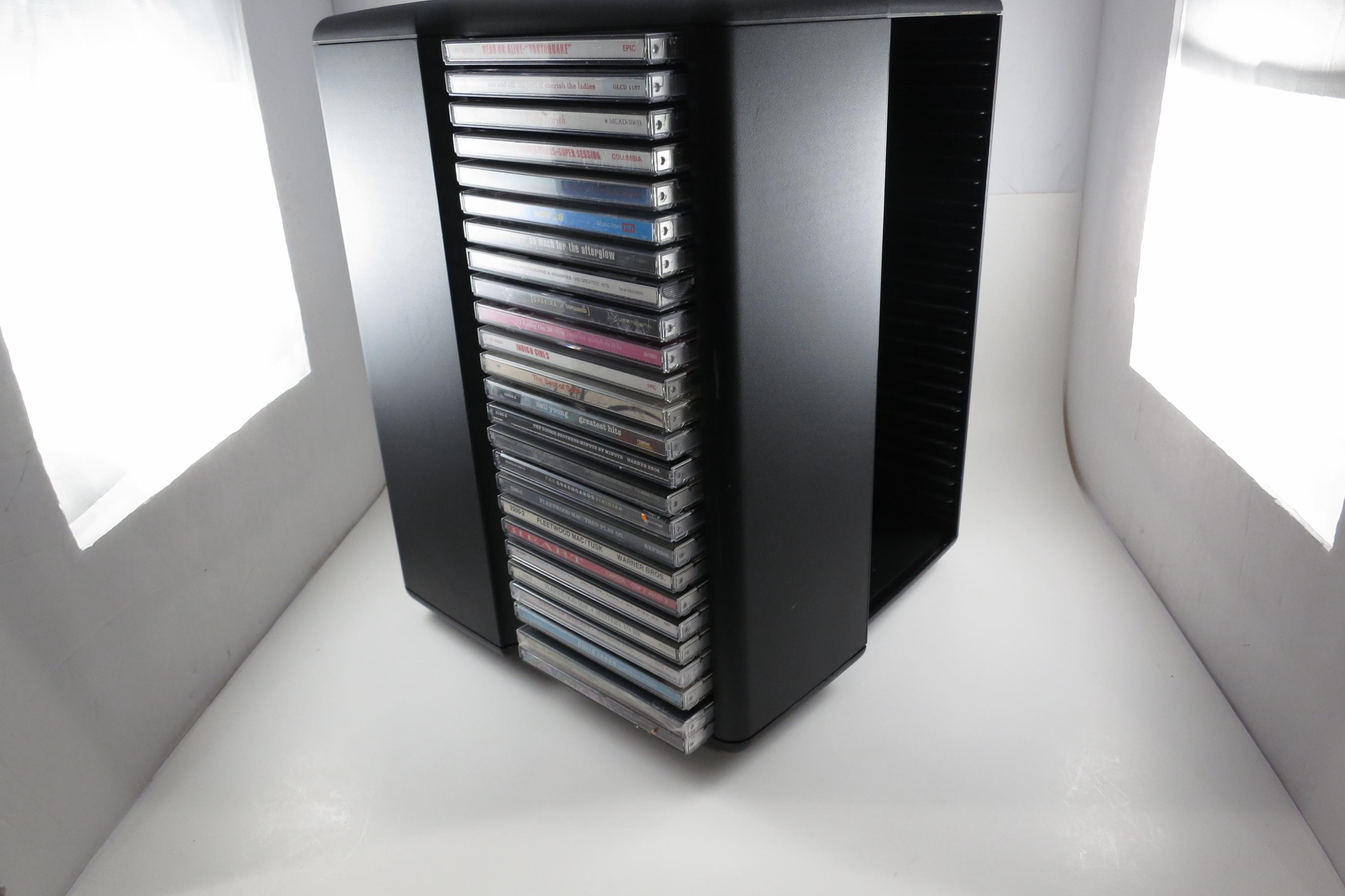 1990's Black Laserline CD Holder Rotating Base Holds 100 Disc's Excellent Condition Great Gift. Rotating base to easily view your cd's. Each side holds 25 disc's, for a total of 100 Measures 14 1/2 inches tall, 11 1/2 inches wide. Great gift and perfect to hold your CD's.