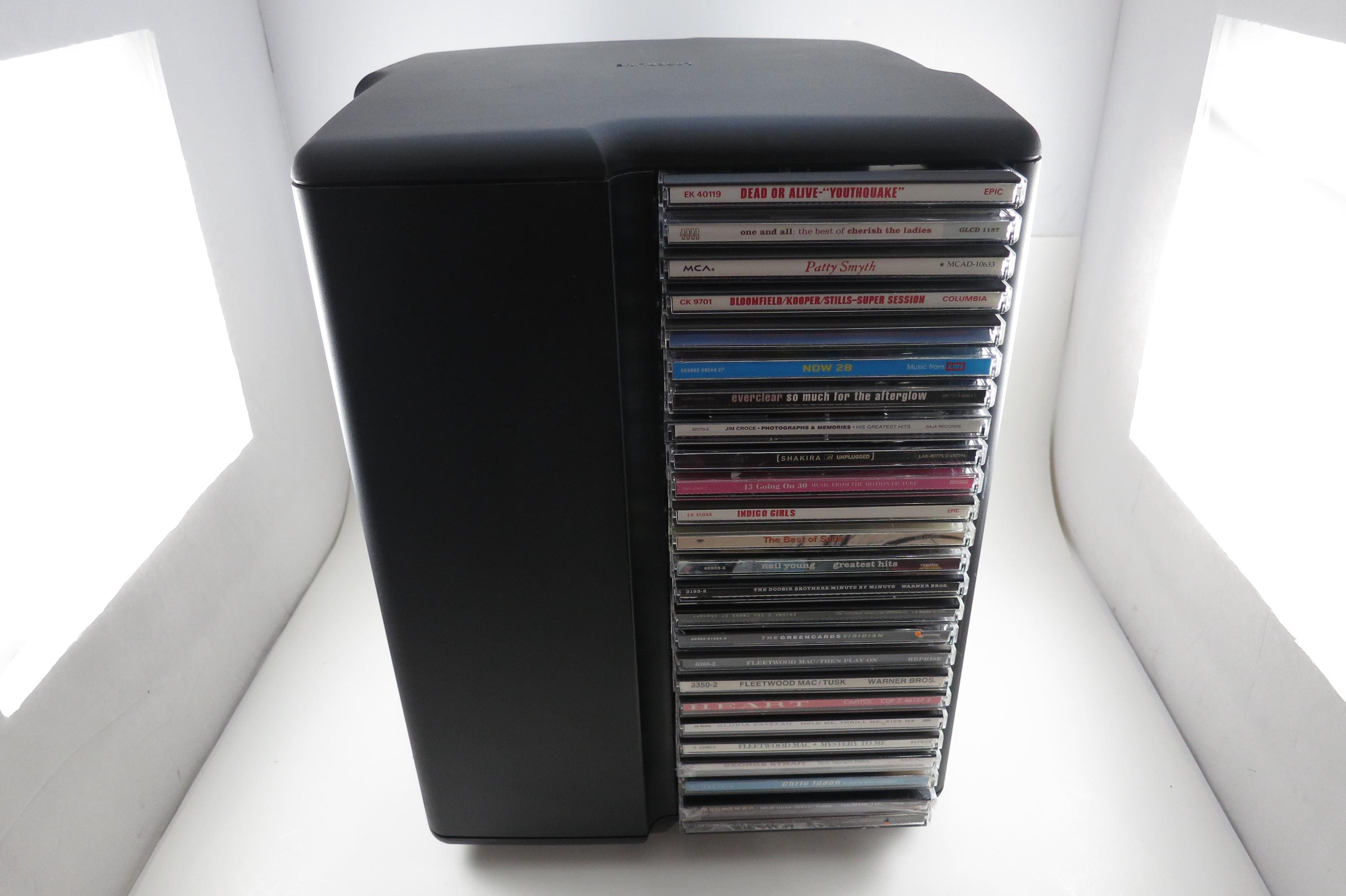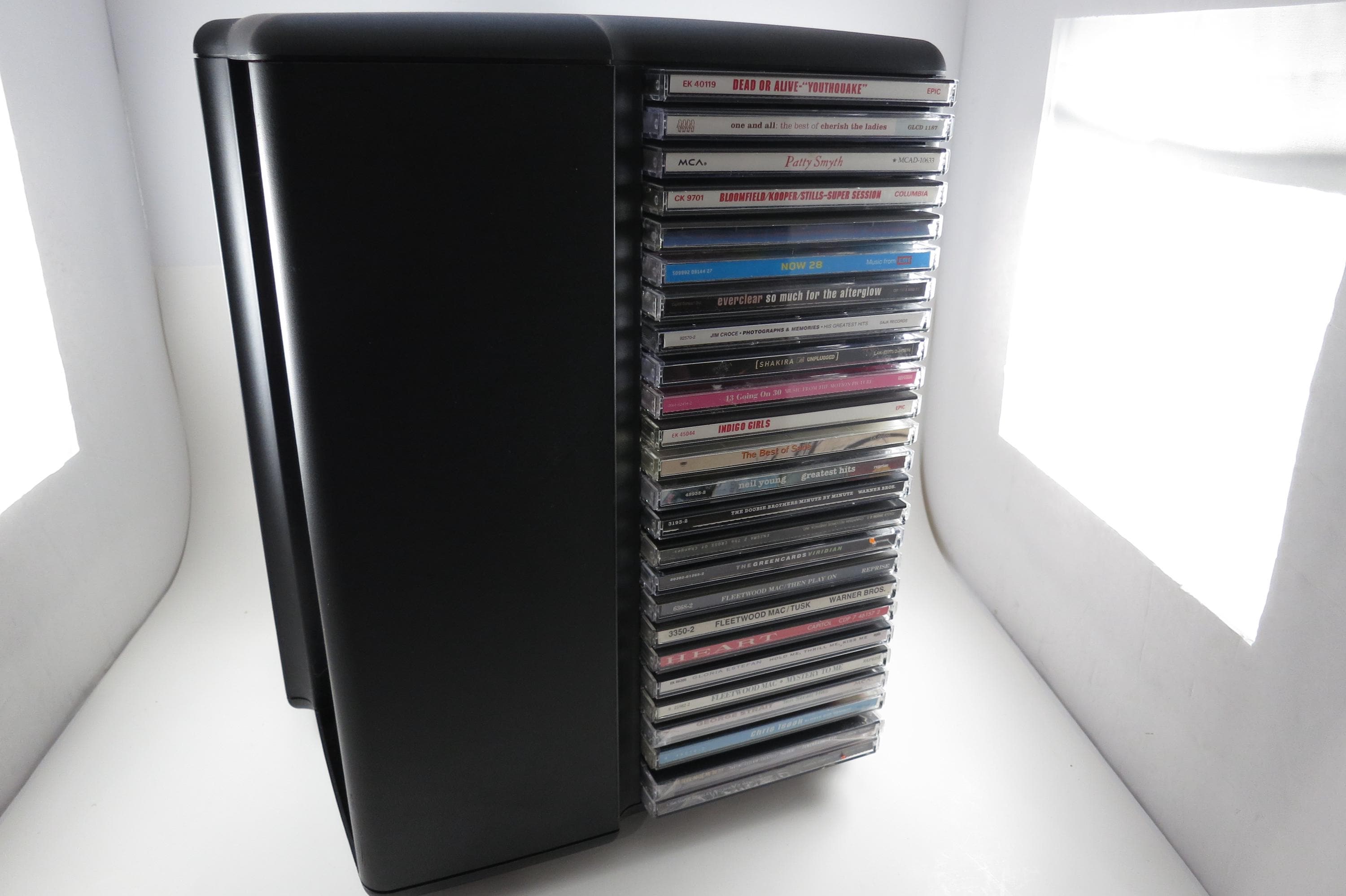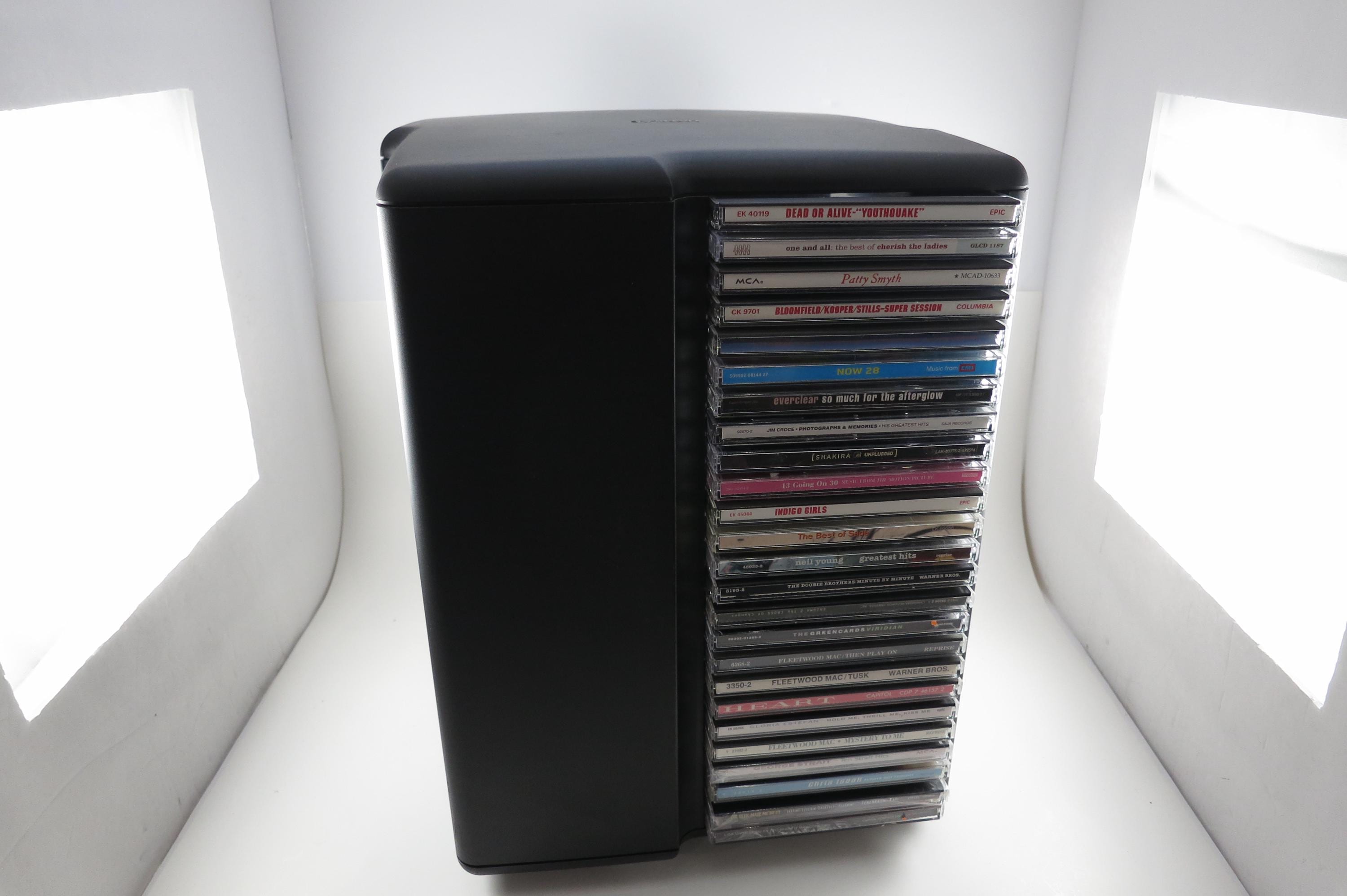 1990's Black Laserline CD Holder Rotating Base Holds 100 Disc's Excellent Condition Great Gift. Rotating base to easily view your cd's. Each side holds 25 disc's, for a total of 100 Measures 14 1/2 inches tall, 11 1/2 inches wide. Great gift and perfect to hold your CD's.