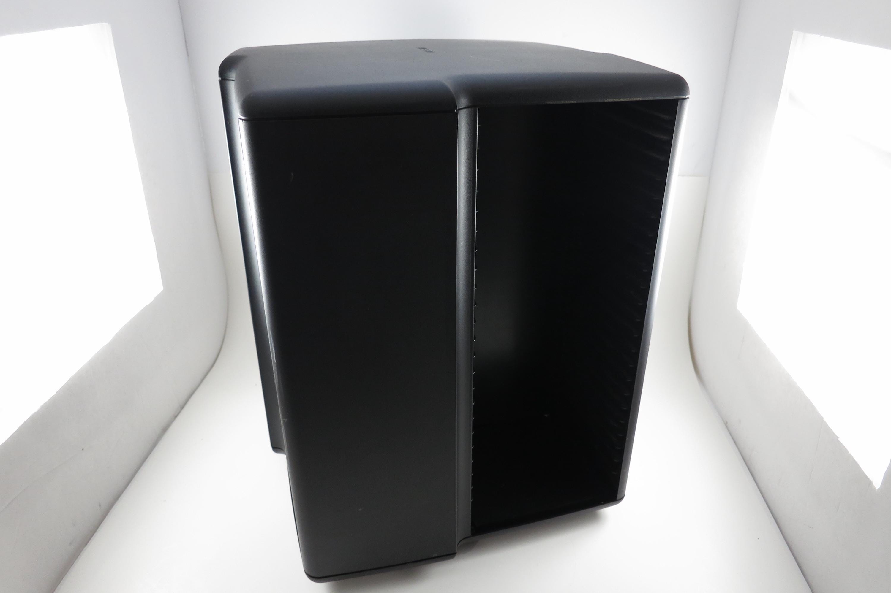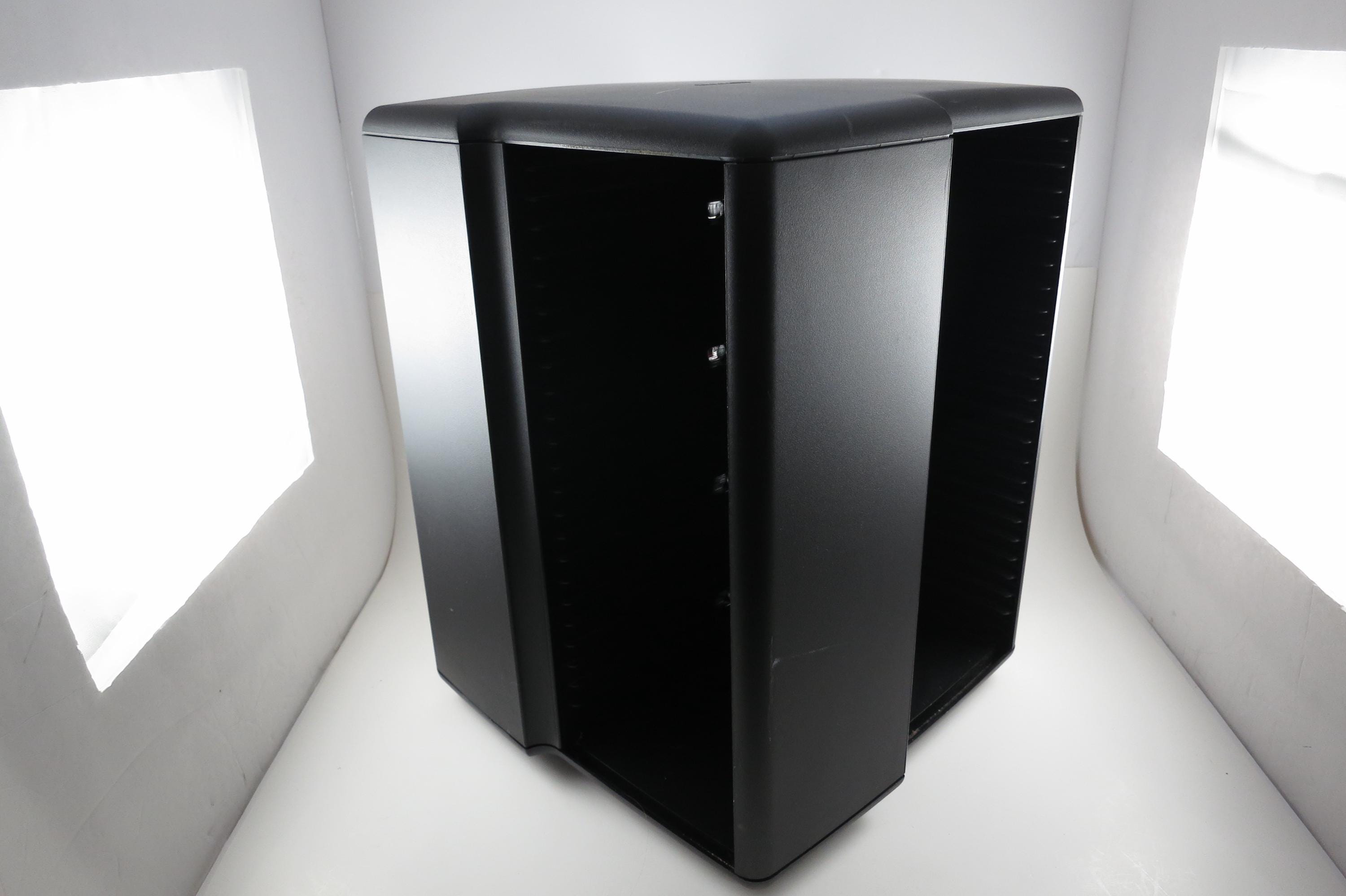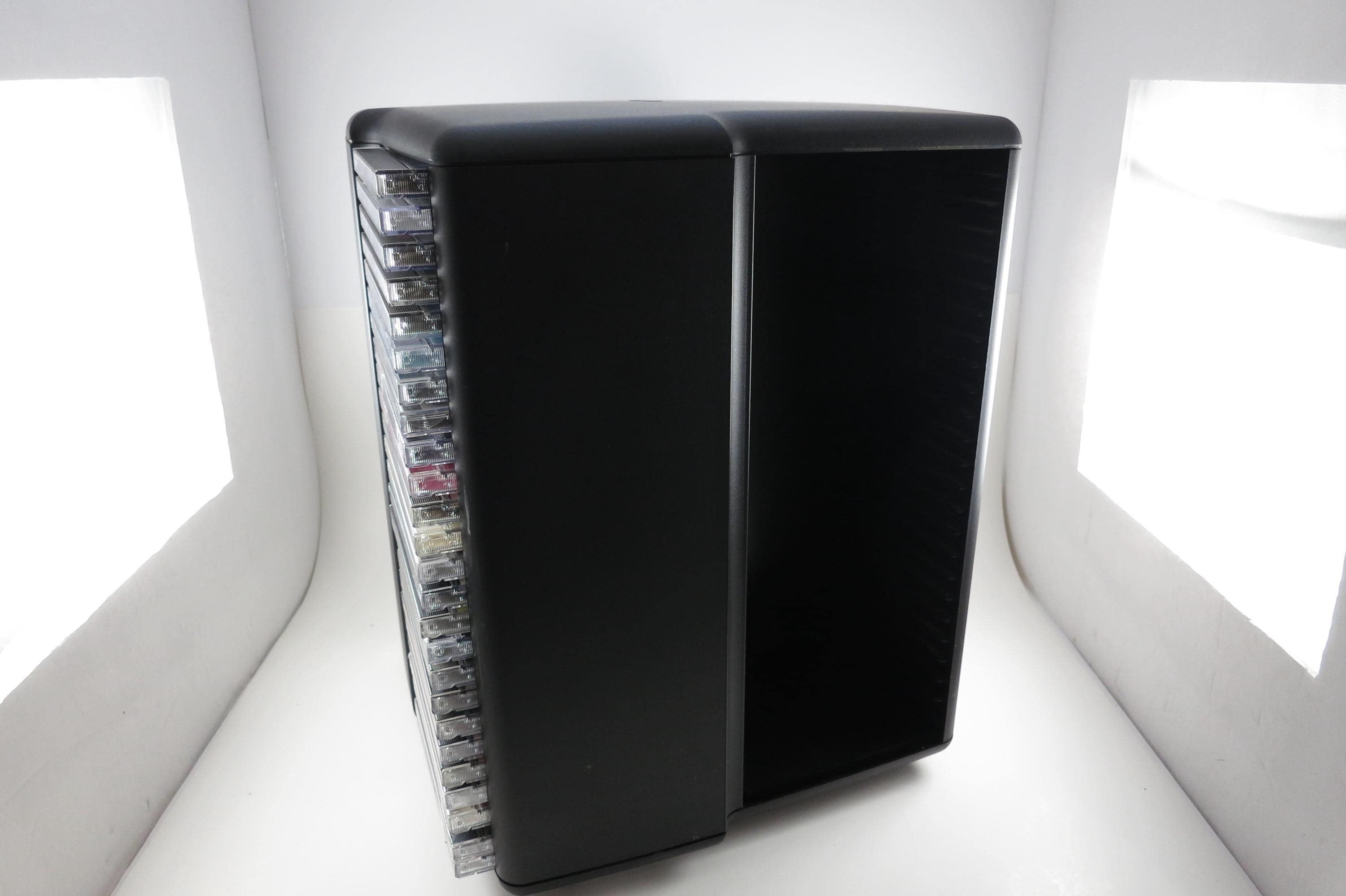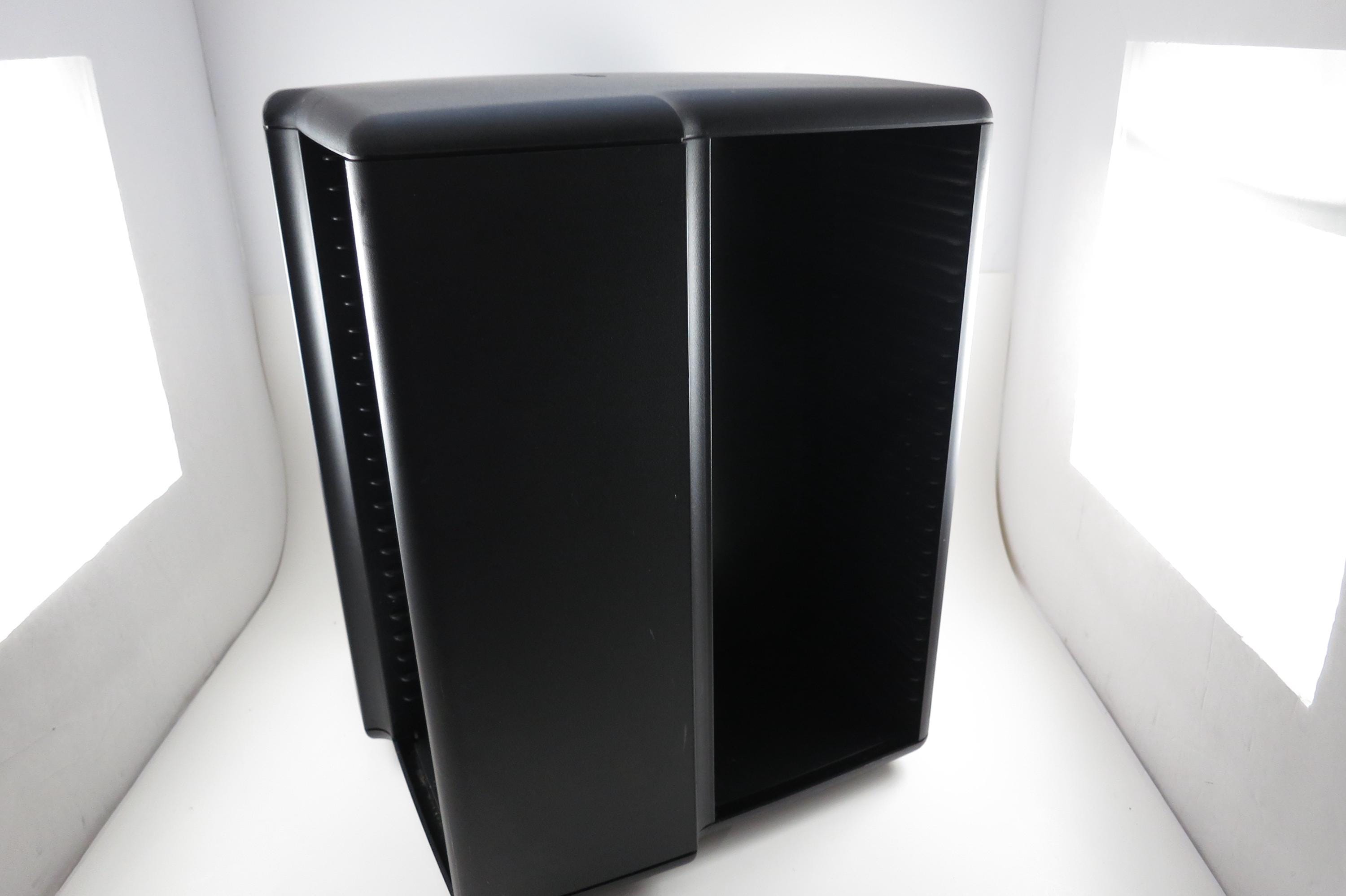 1990's Black Laserline CD Holder Rotating Base Holds 100 Disc's Excellent Condition Great Gift. Rotating base to easily view your cd's. Each side holds 25 disc's, for a total of 100 Measures 14 1/2 inches tall, 11 1/2 inches wide. Great gift and perfect to hold your CD's.