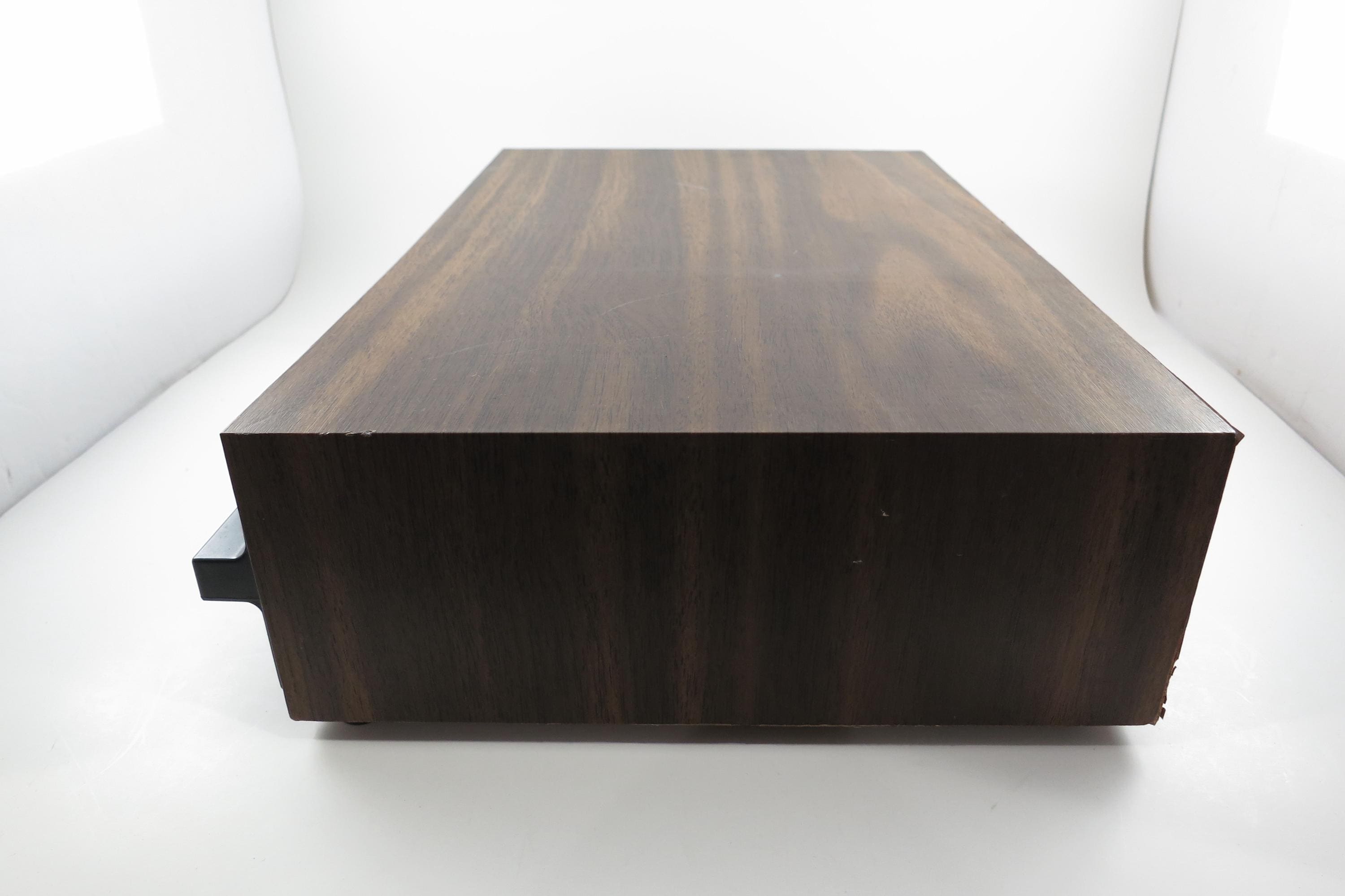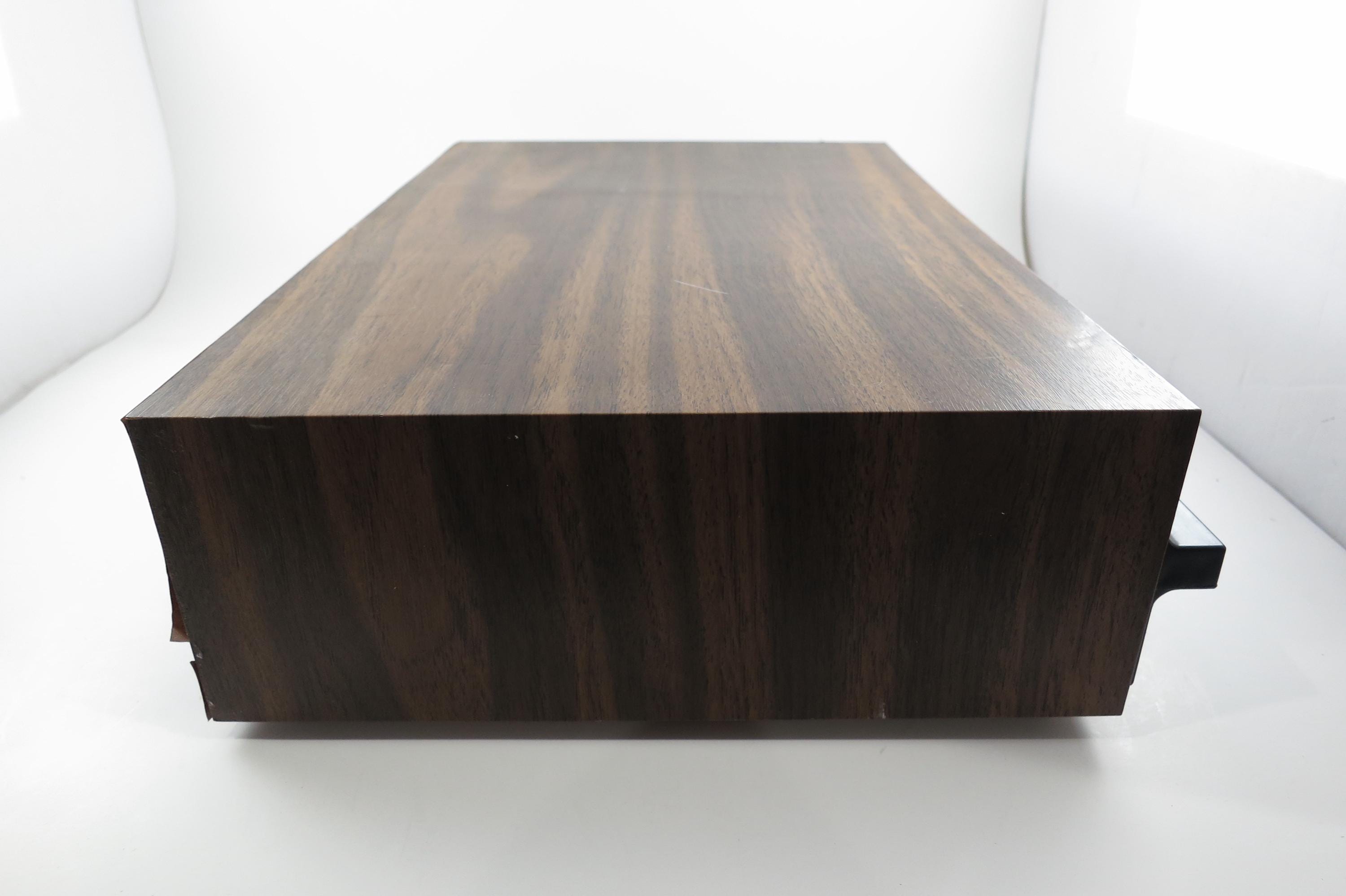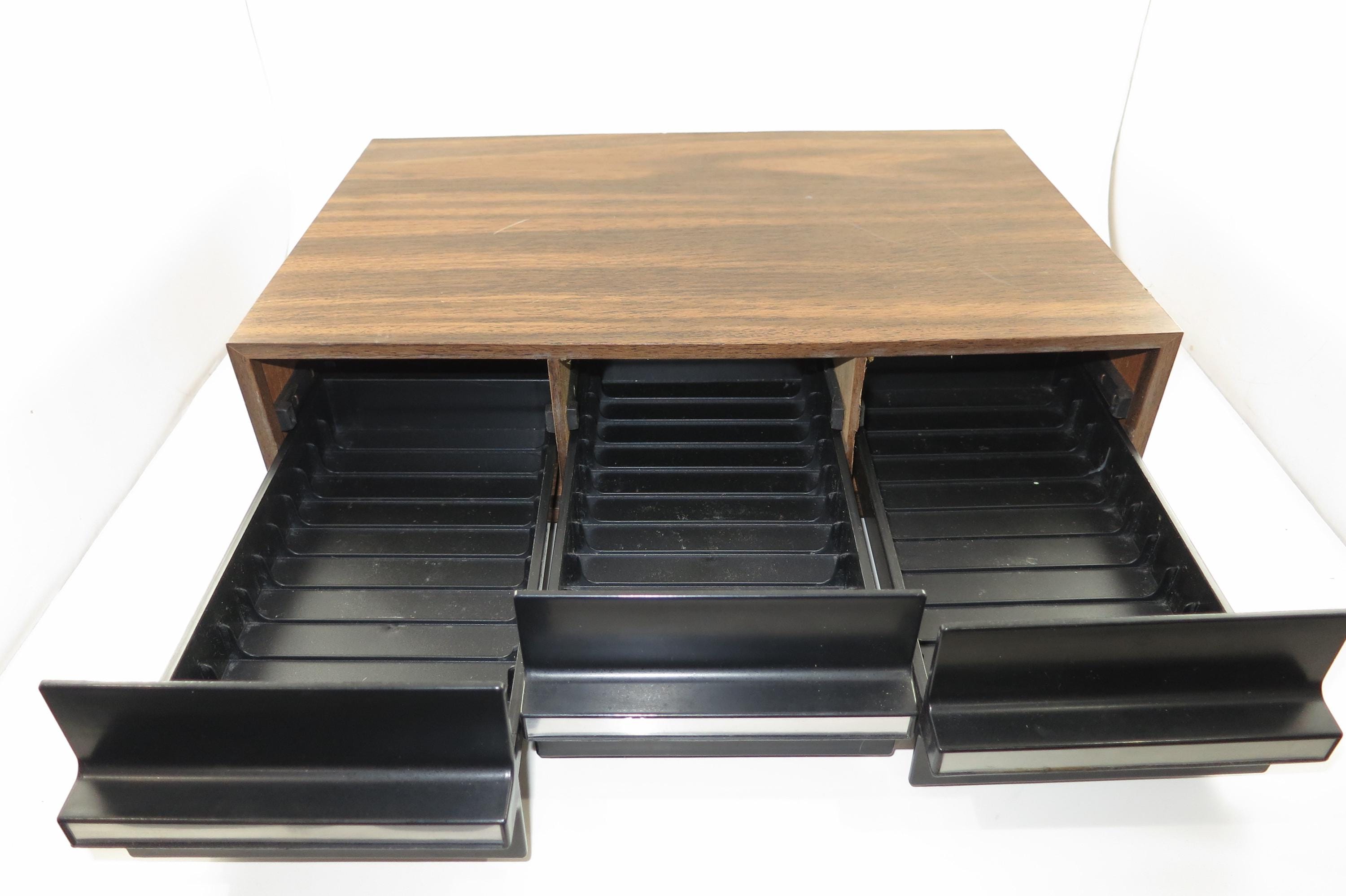 1980's Faux Wood Three Row Hard Cassette Holder Holds 36 Tapes Excellent Condition. Has three pull out trays that each hold 12 Cassettes for a total of 36. This is the hard variety that is for home cassette storage. This is one of the nicer versions of the cassette case, where each Cassette sits in a divided individual space.