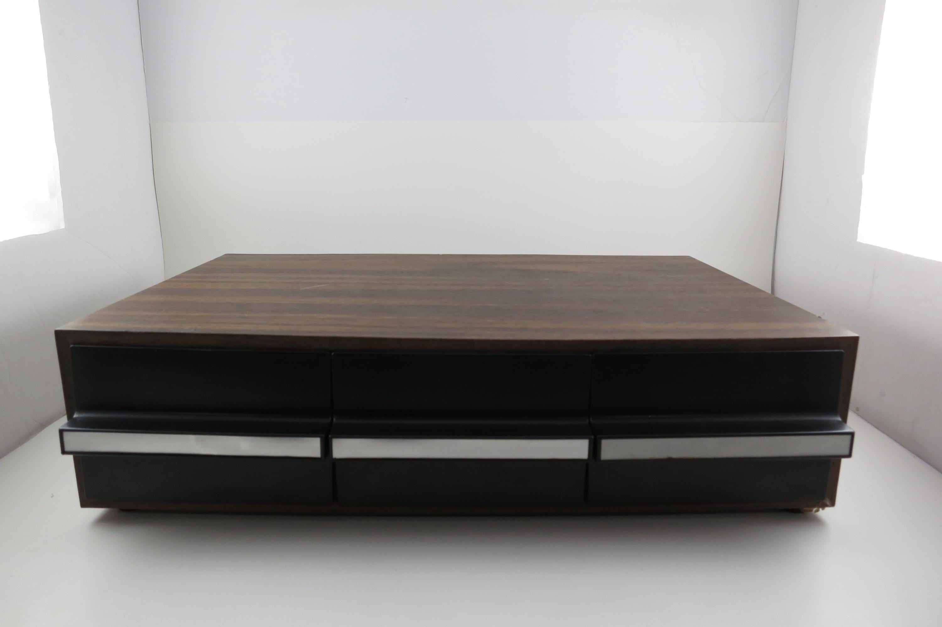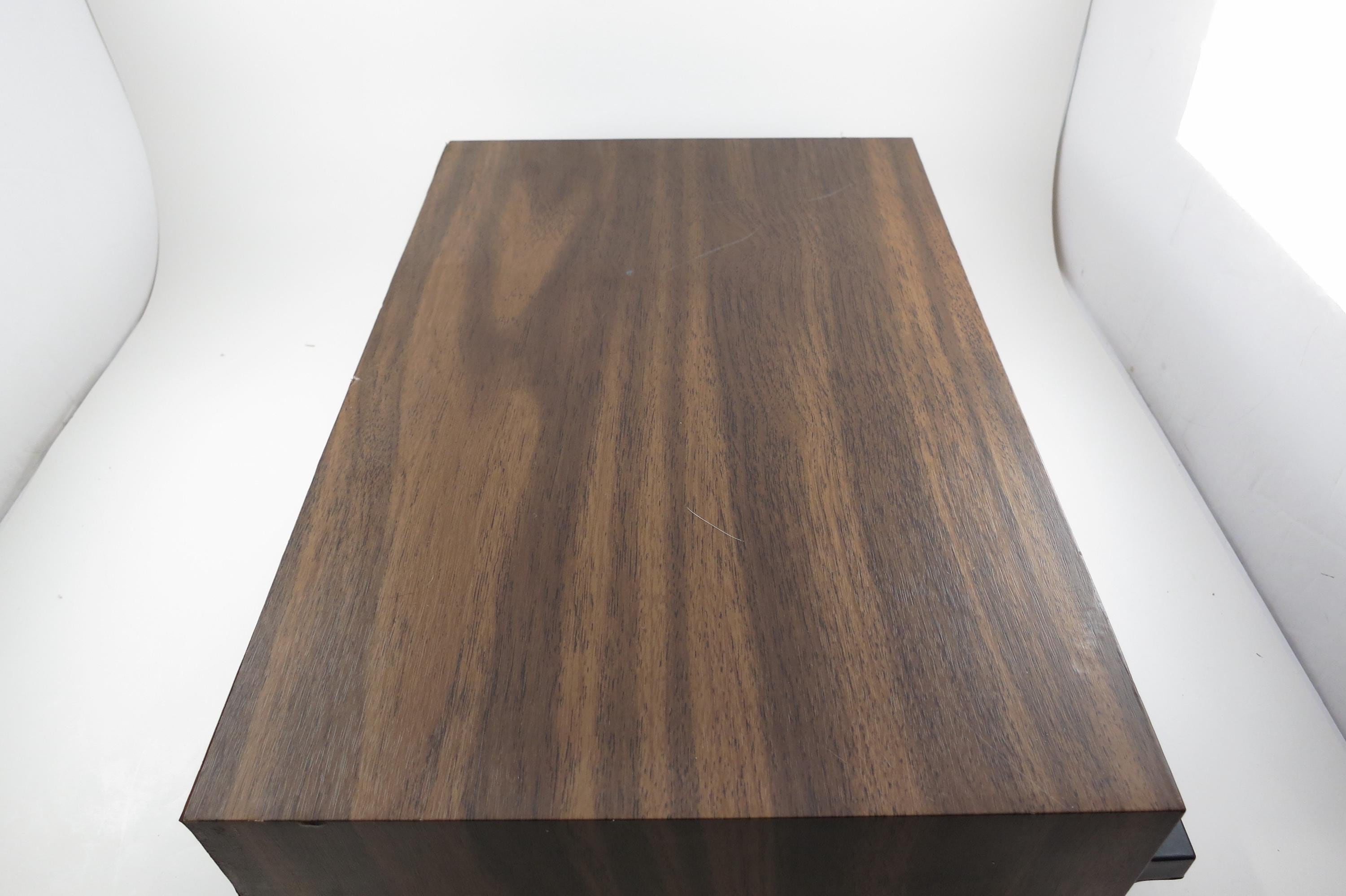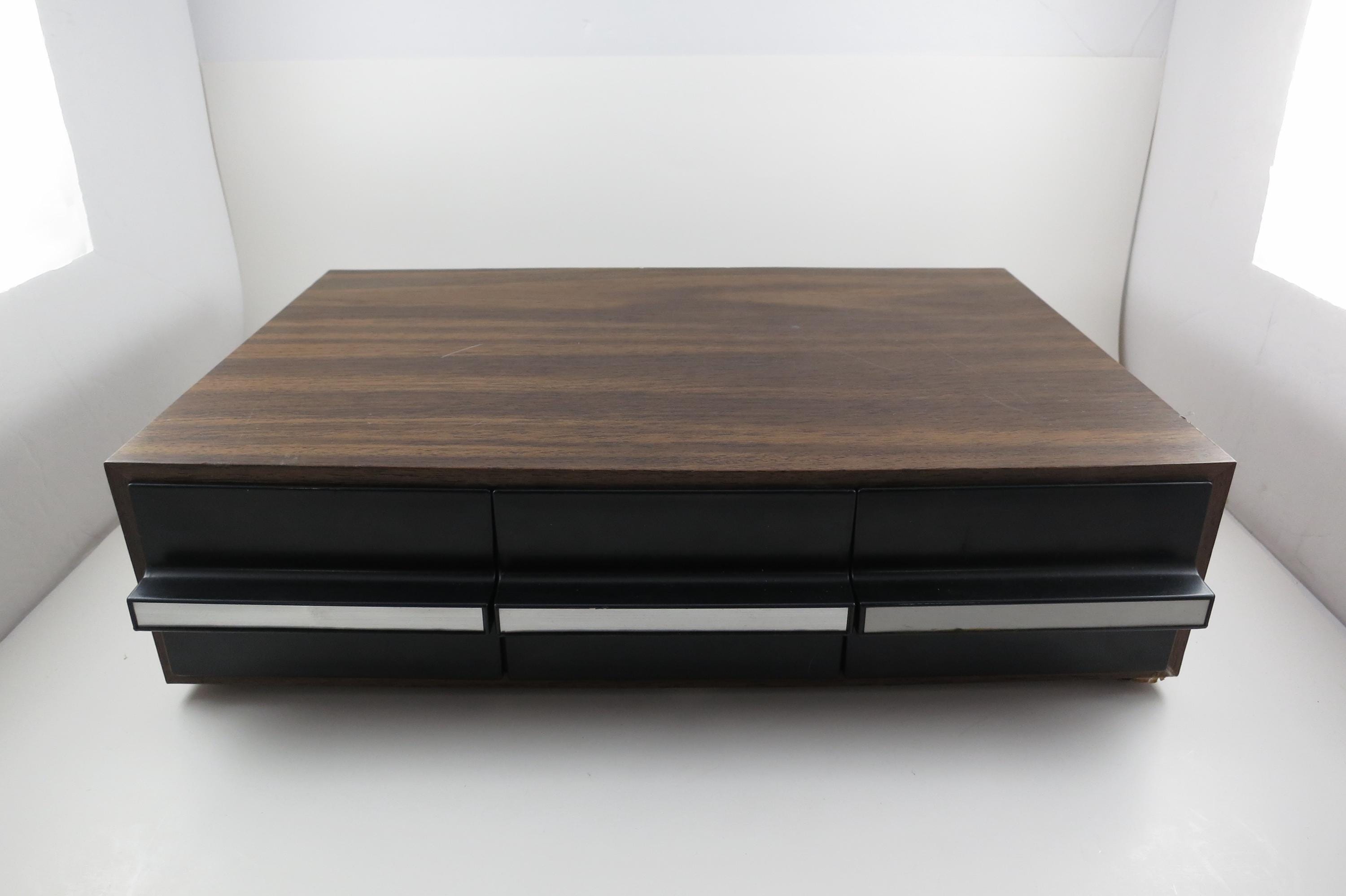 1980's Faux Wood Three Row Hard Cassette Holder Holds 36 Tapes Excellent Condition. Has three pull out trays that each hold 12 Cassettes for a total of 36. This is the hard variety that is for home cassette storage. This is one of the nicer versions of the cassette case, where each Cassette sits in a divided individual space.
