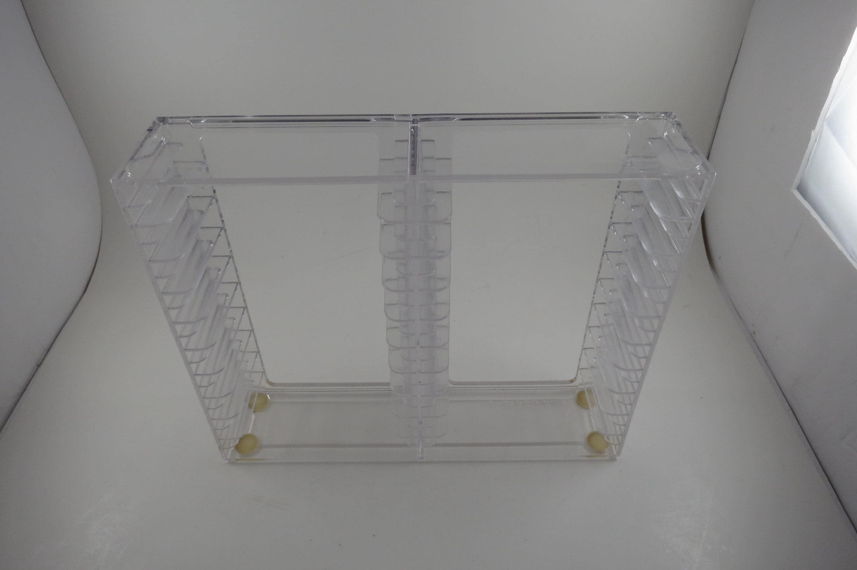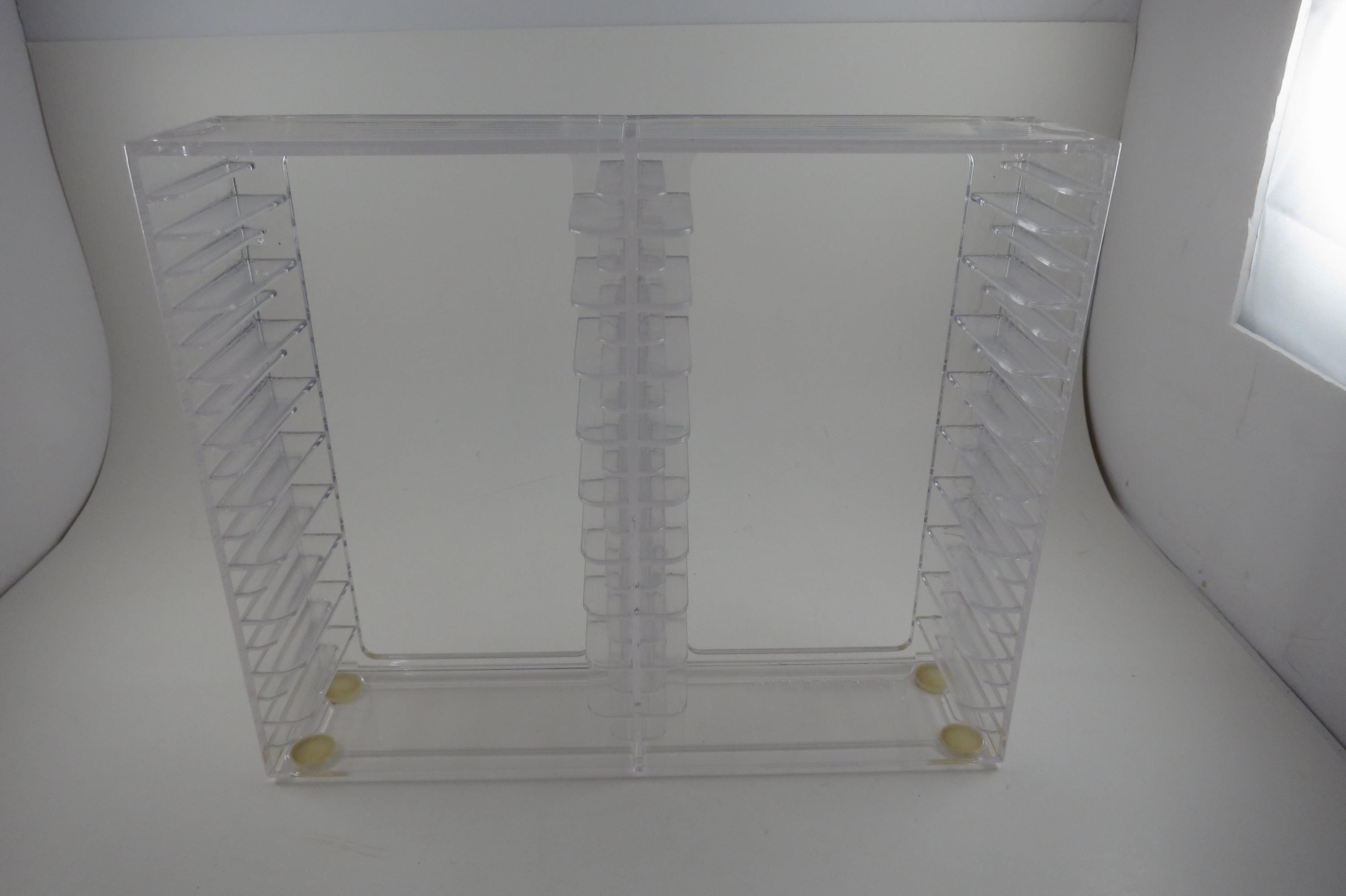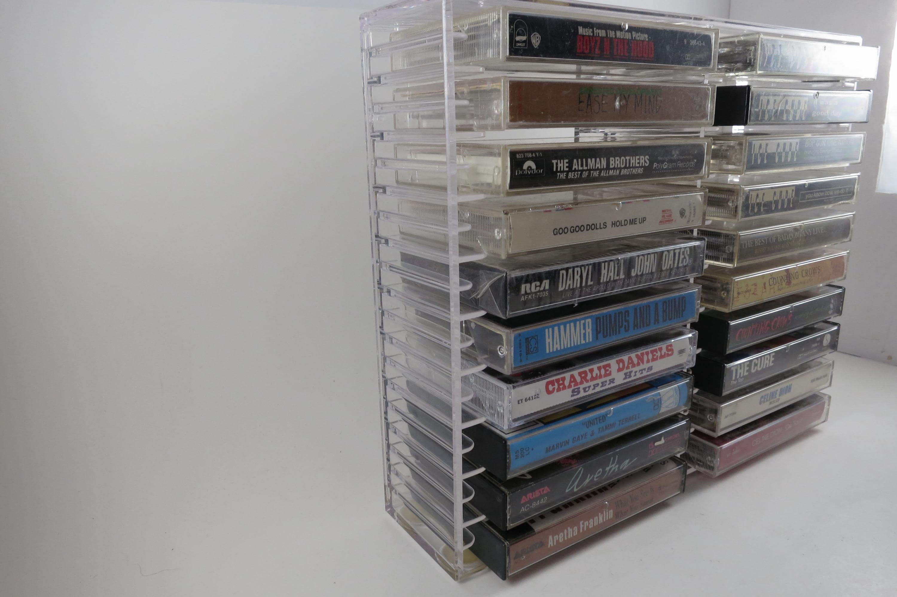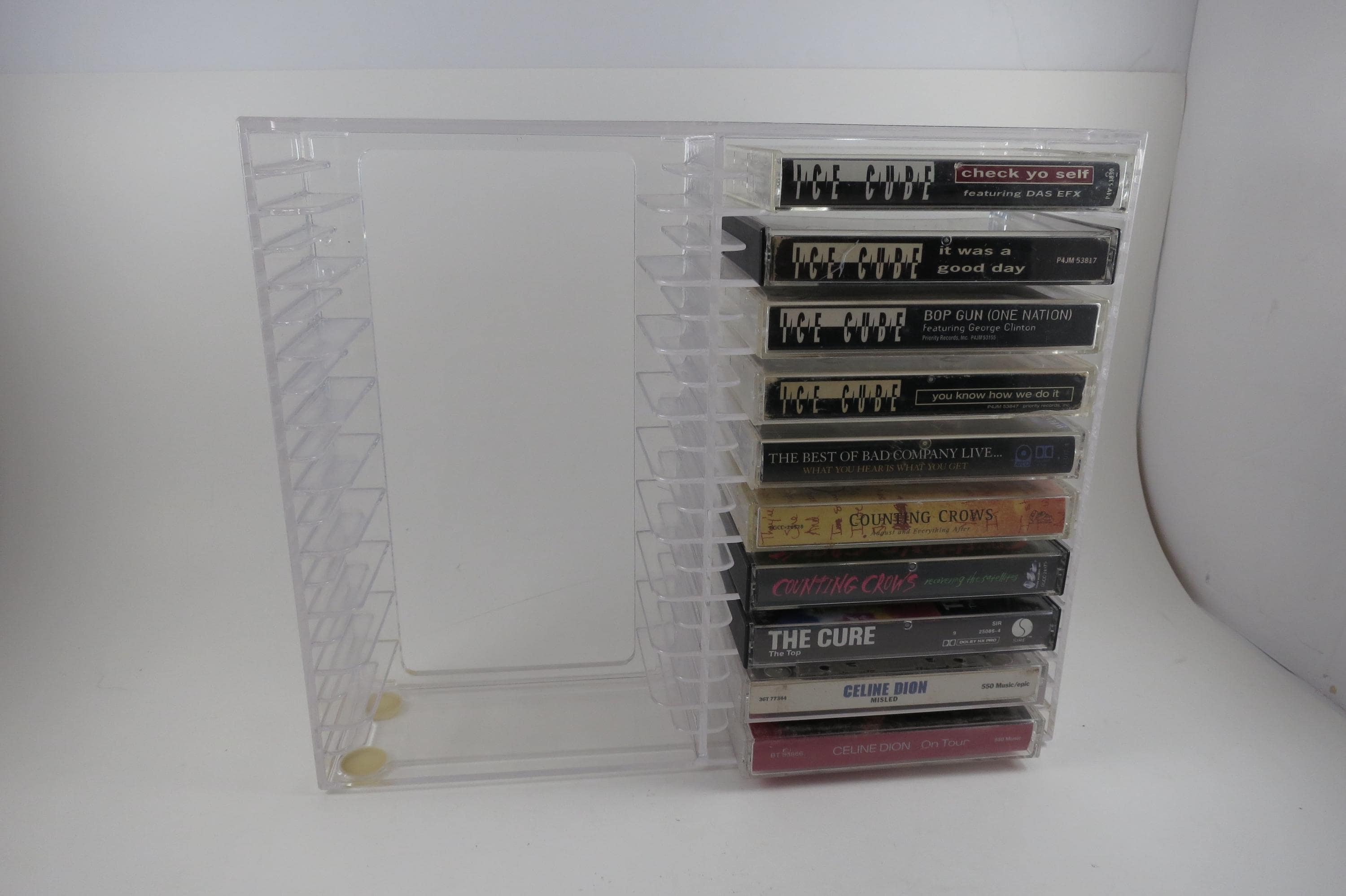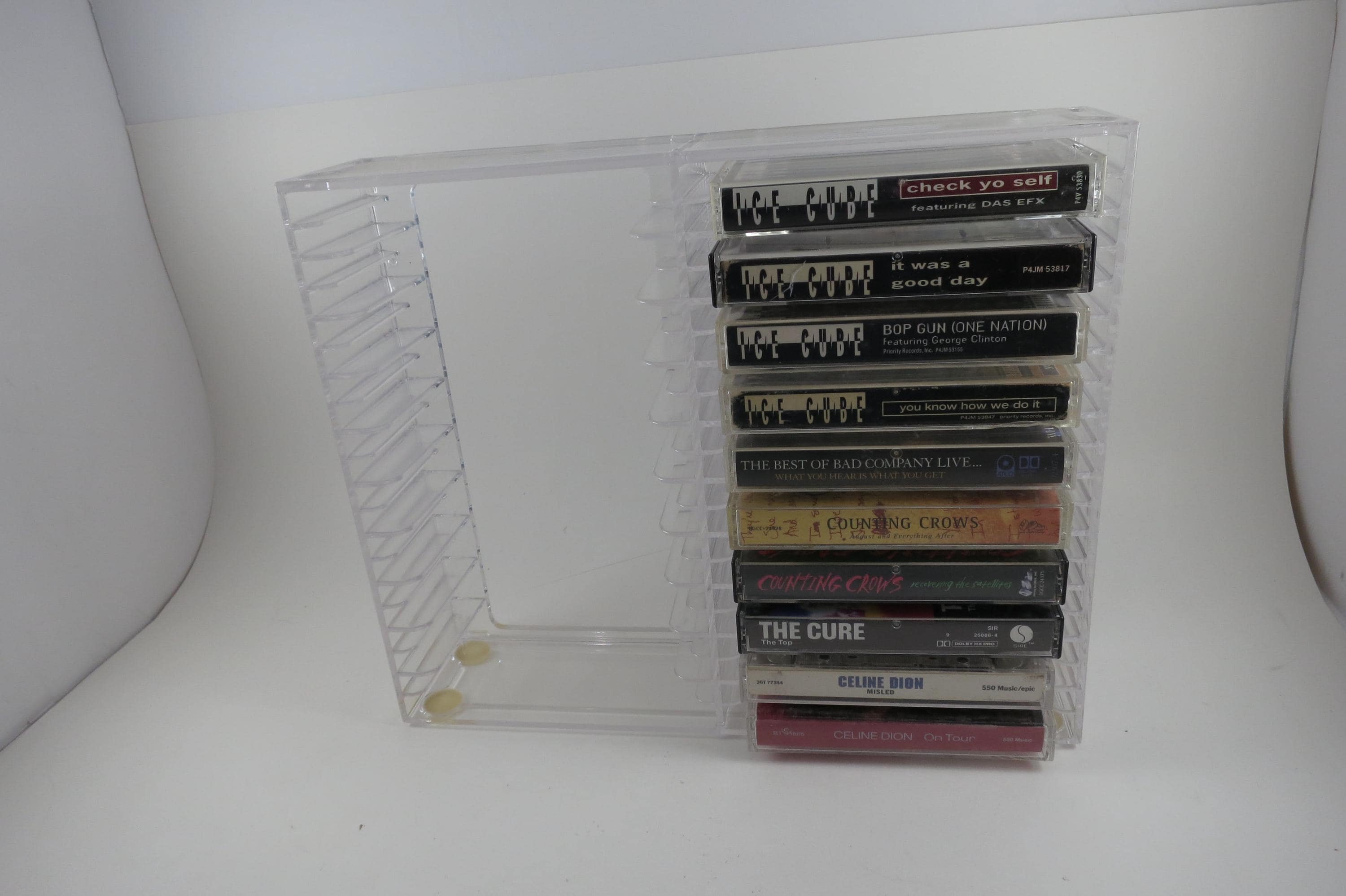 Vintage 1991 Clear Acrylic Cassette Holder Holds 20 Tapes Excellent Used Condition. Holds 20 Cassettes in their cases.