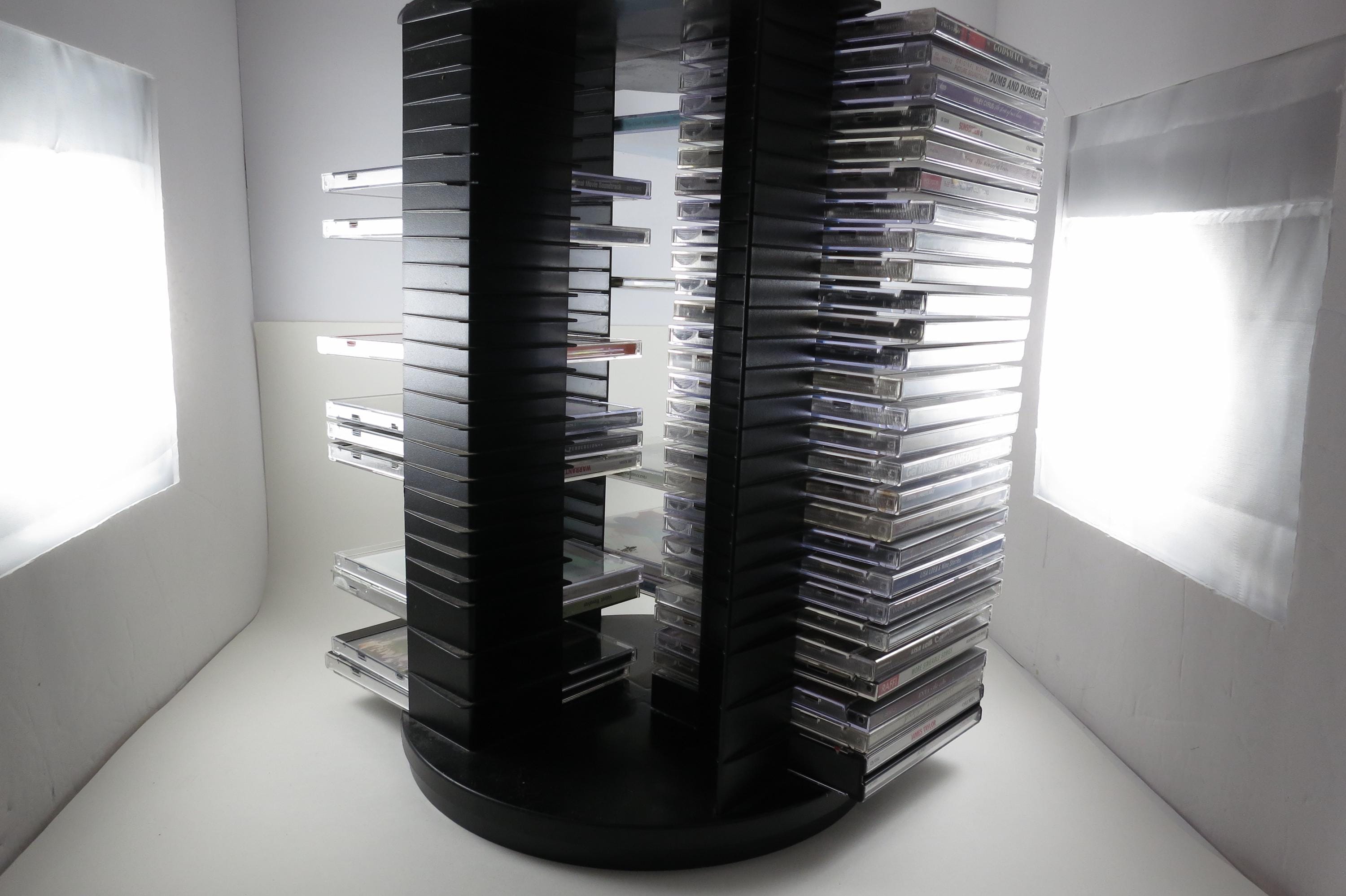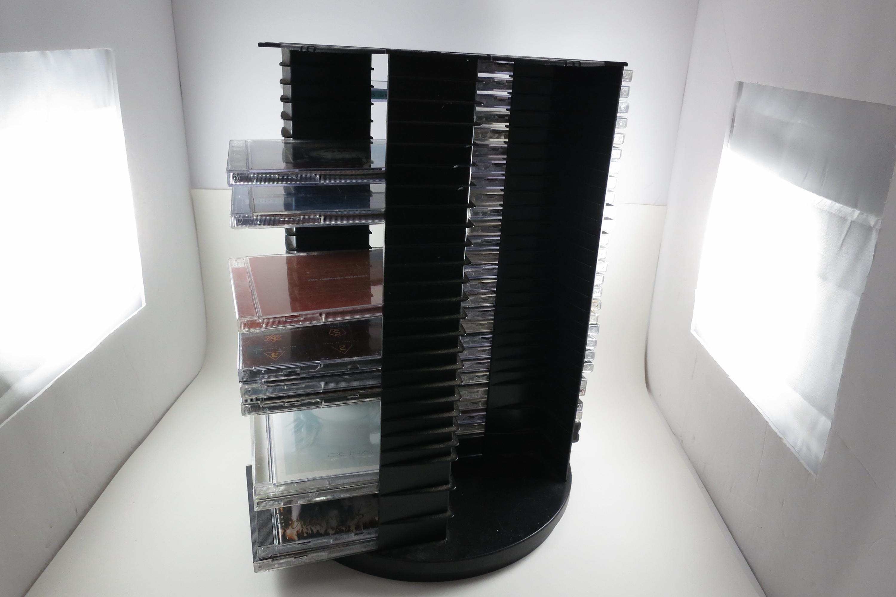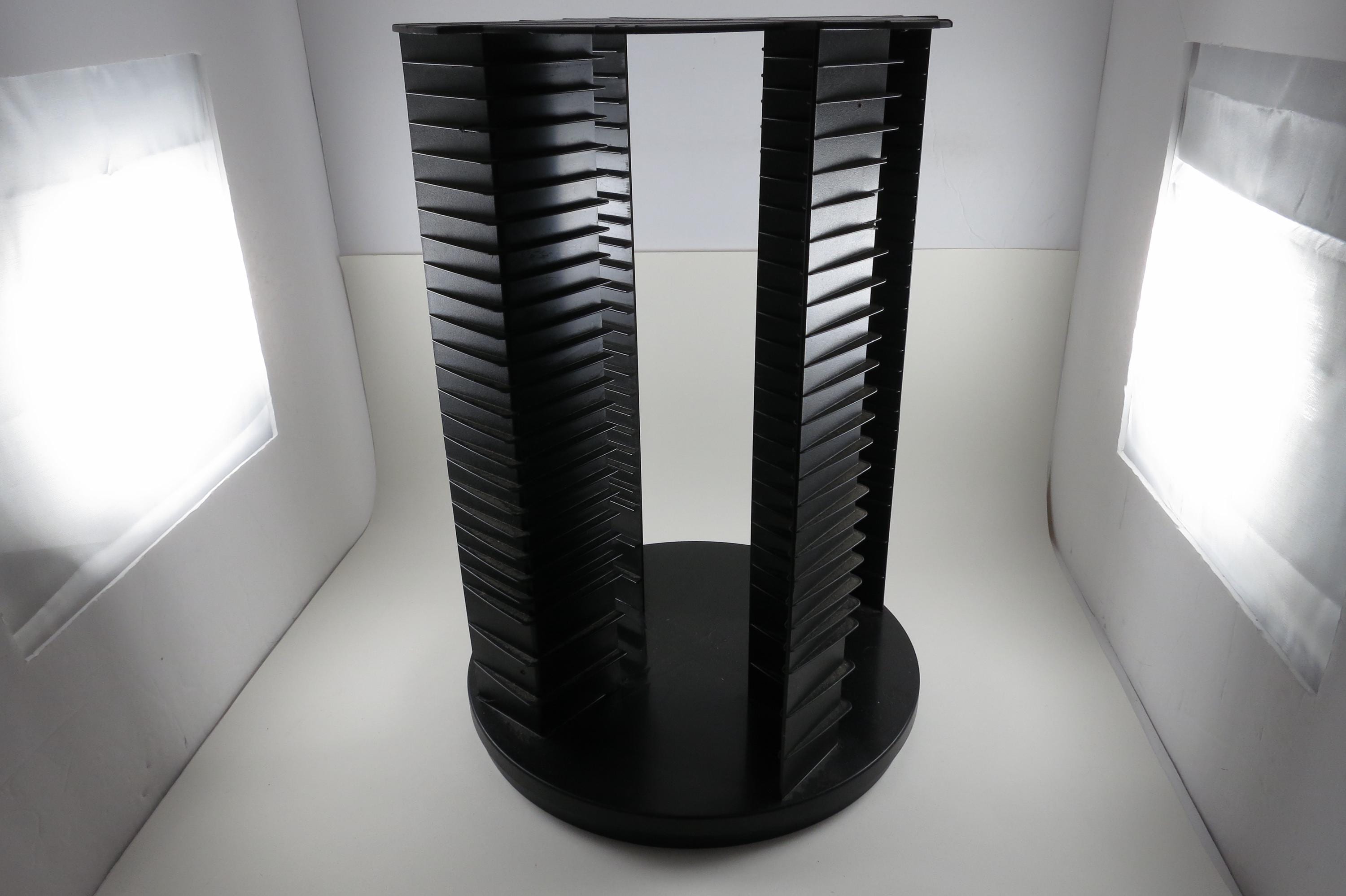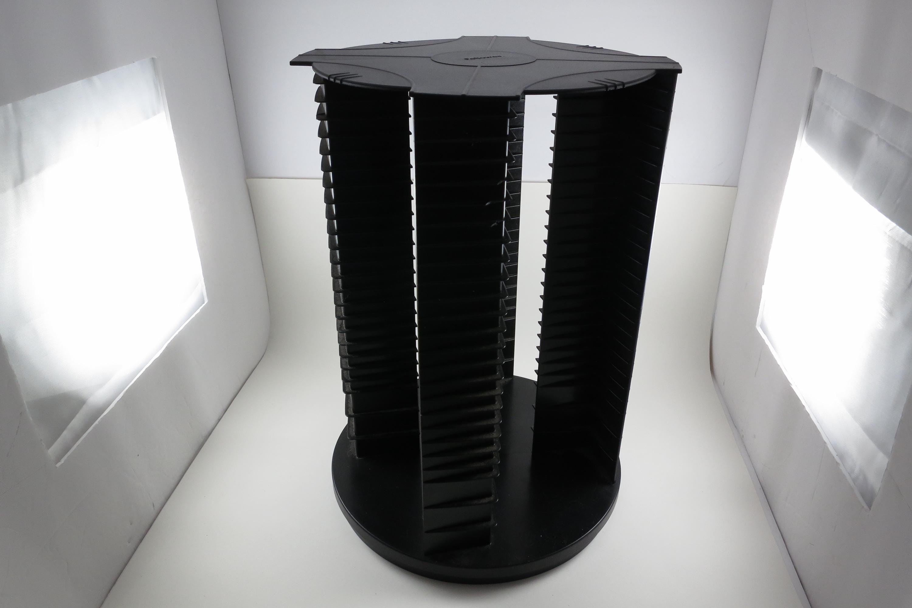 1990's Black Fellowes CD Holder Rotating Base Holds 112 Disc's Excellent Condition Great Gift. Rotating base to easily view your cd's. Each side holds 28 disc's, for a total of 112. Measures 11 1/2 inches tall, 11 inches wide. Each side has space for 3 Double CD's, total of 12 doubles and 88 Singles, or whatever configuration you like! Great gift and perfect to hold your CD's. Lazy Susan type rotating unit.