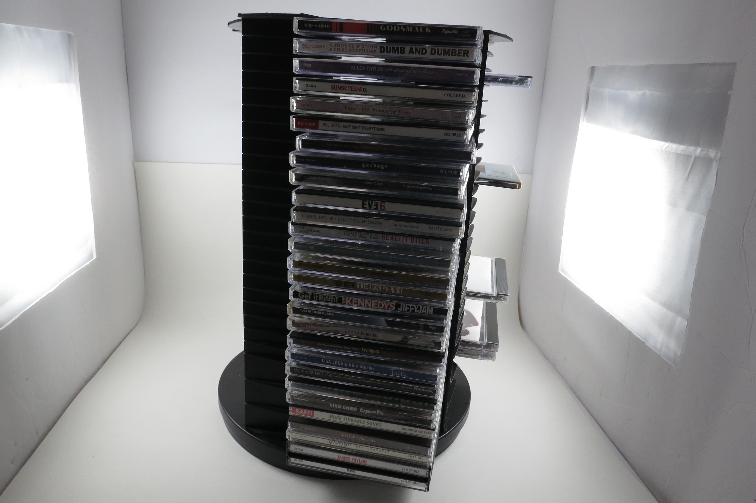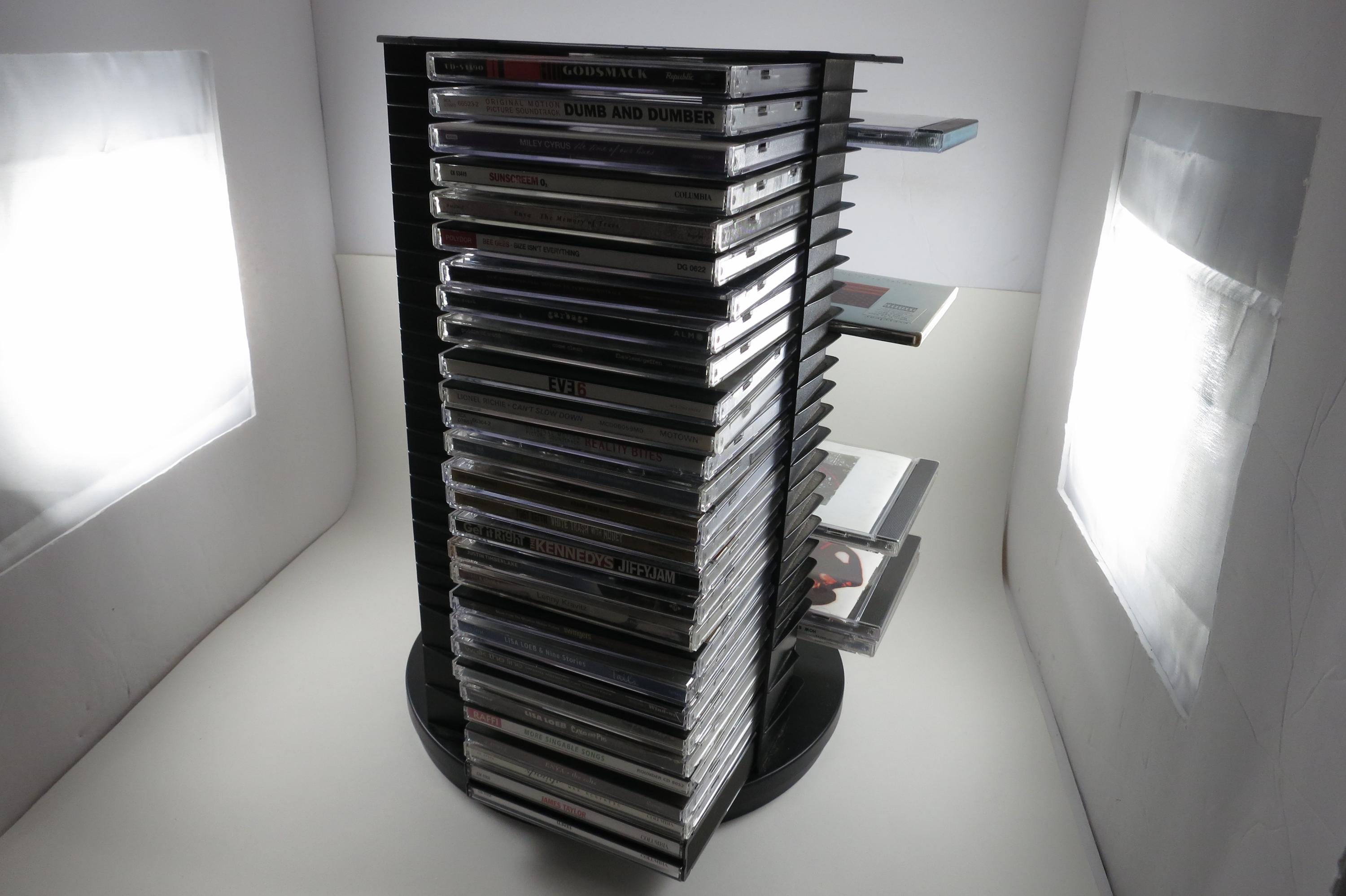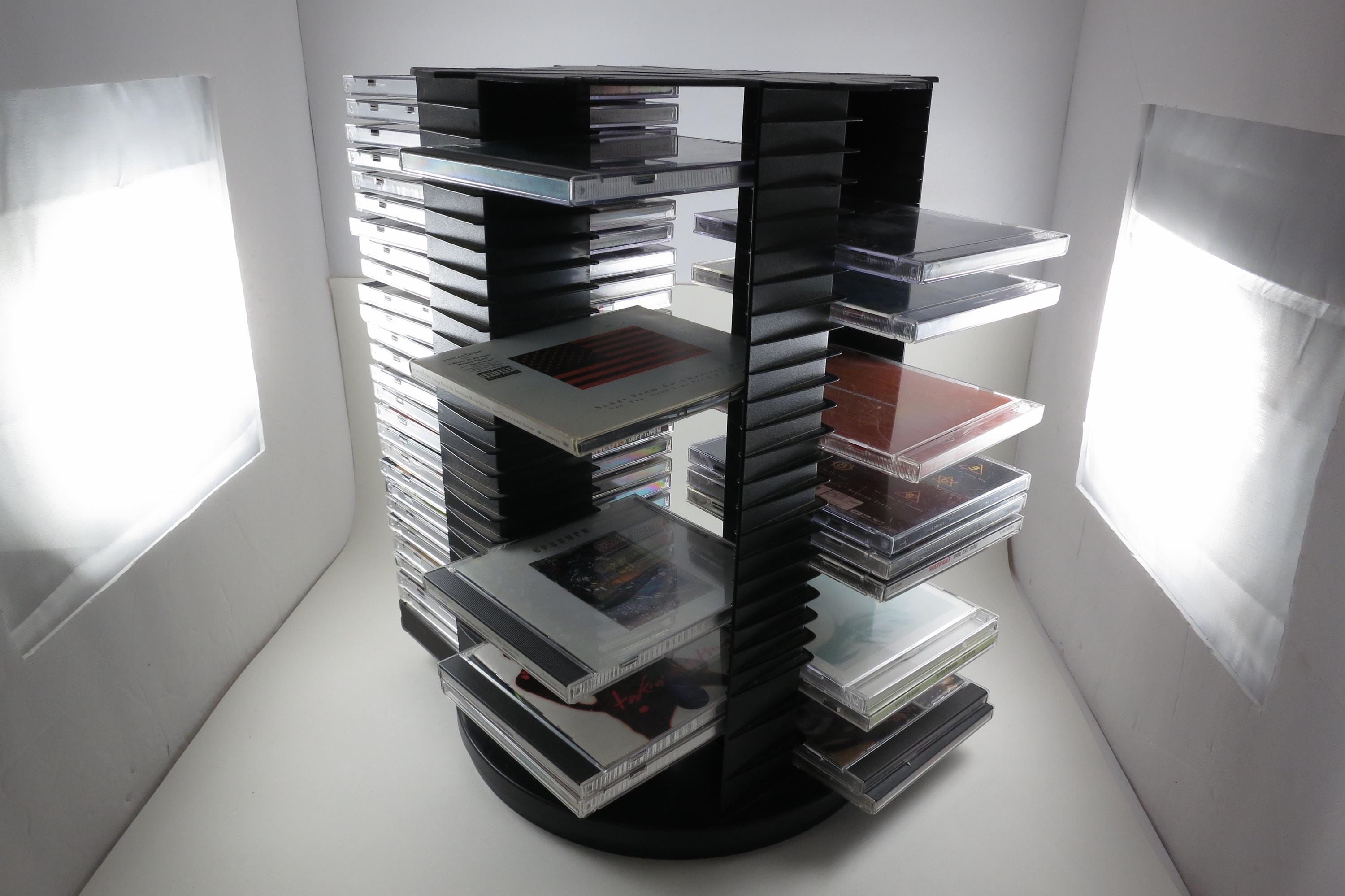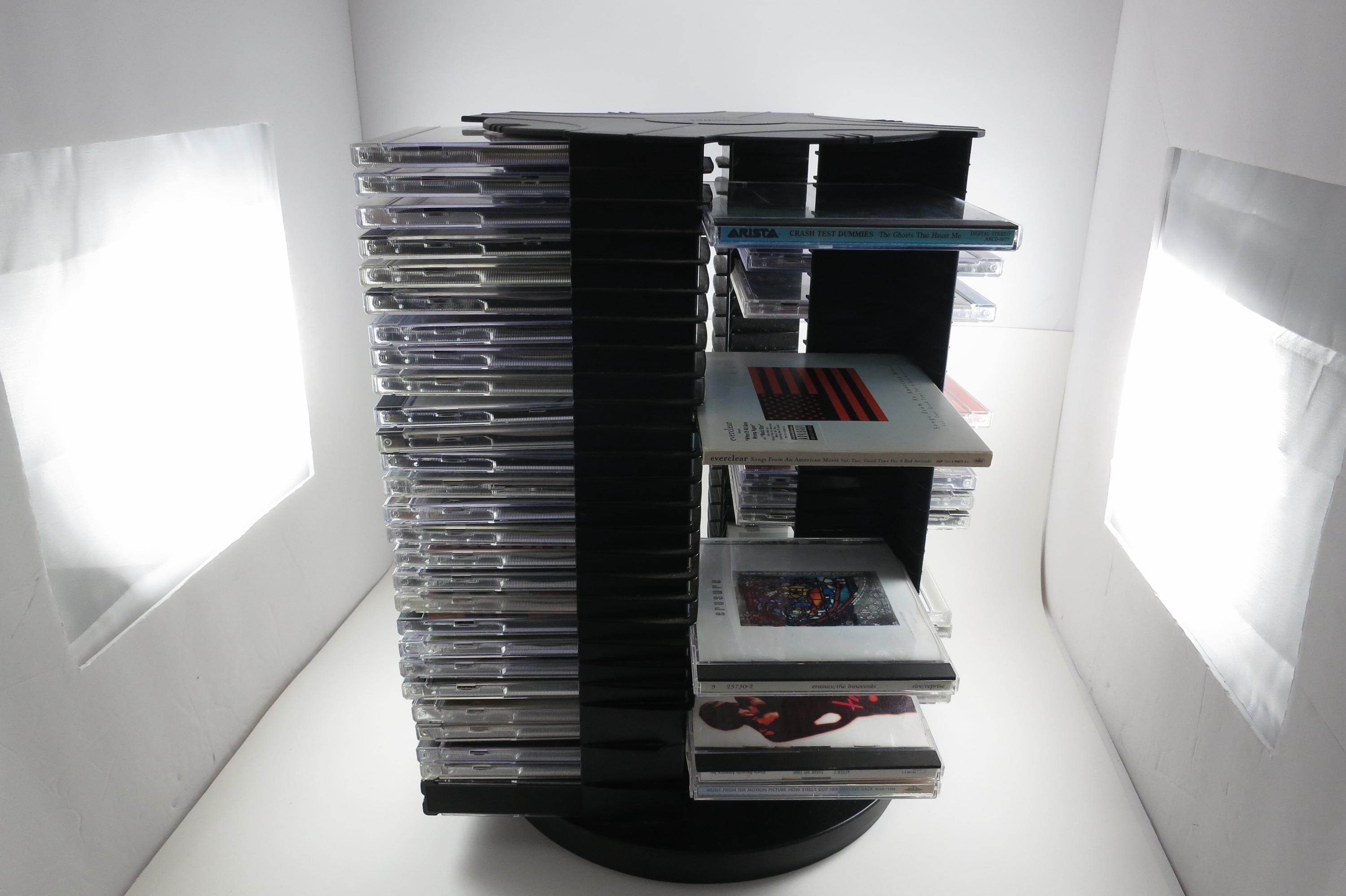 1990's Black Fellowes CD Holder Rotating Base Holds 112 Disc's Excellent Condition Great Gift. Rotating base to easily view your cd's. Each side holds 28 disc's, for a total of 112. Measures 11 1/2 inches tall, 11 inches wide. Each side has space for 3 Double CD's, total of 12 doubles and 88 Singles, or whatever configuration you like! Great gift and perfect to hold your CD's. Lazy Susan type rotating unit.