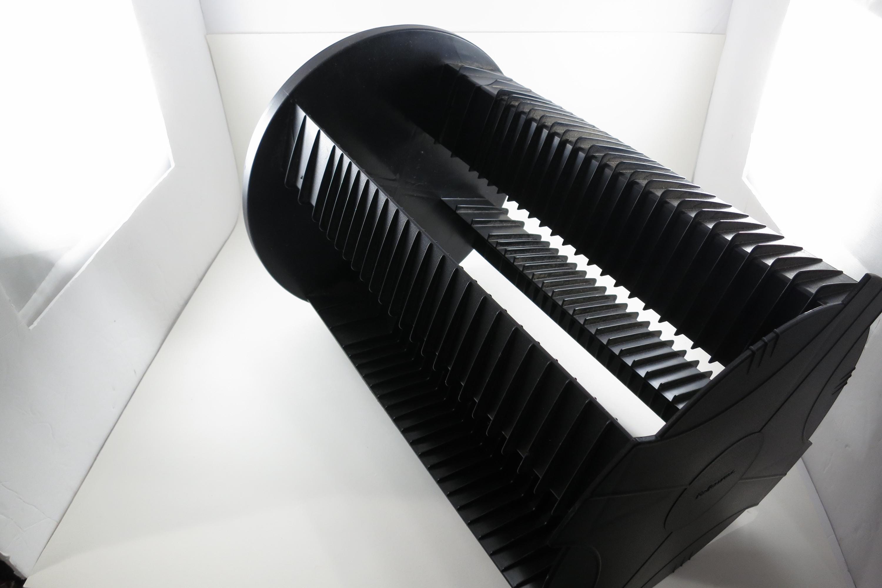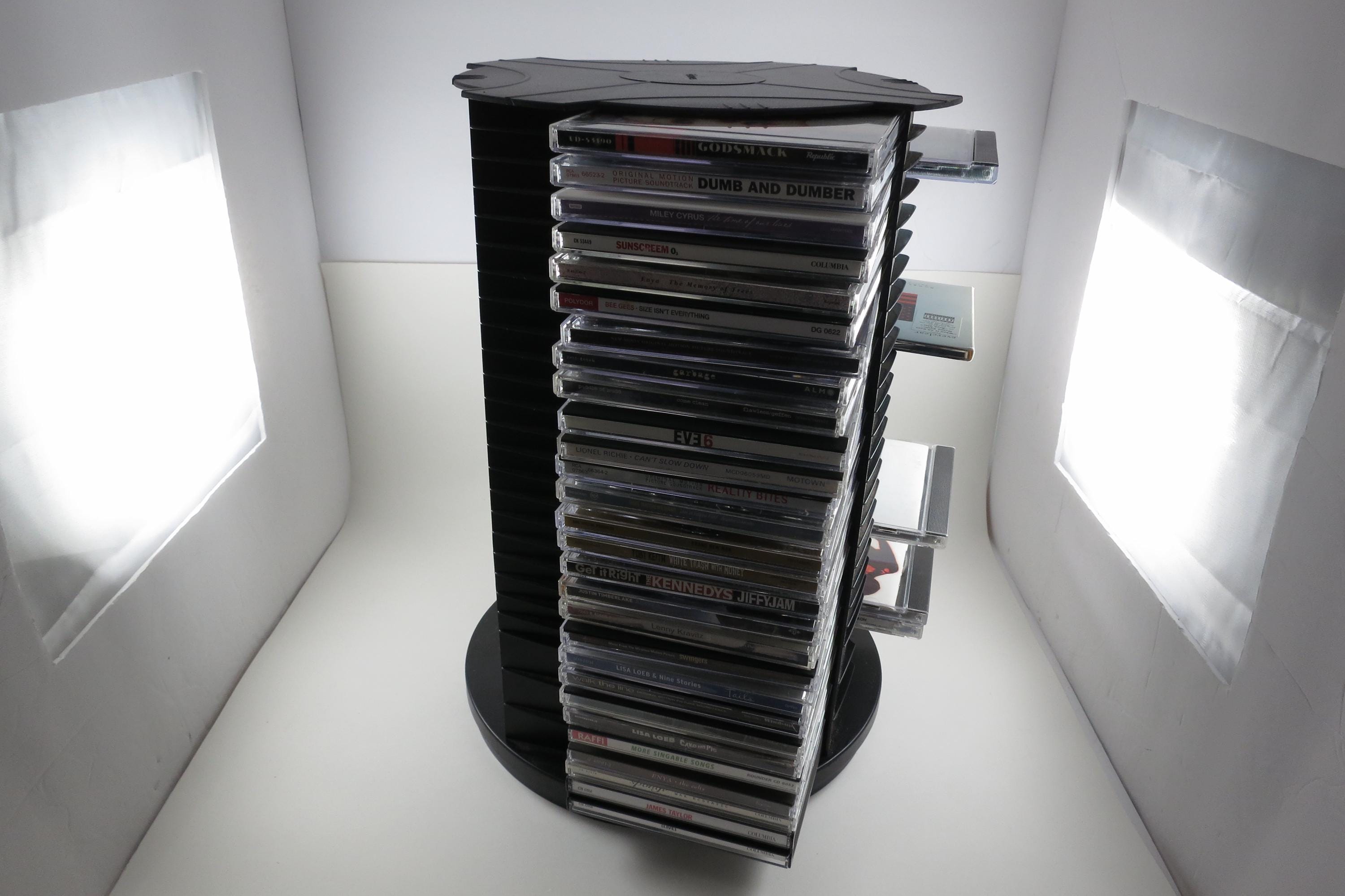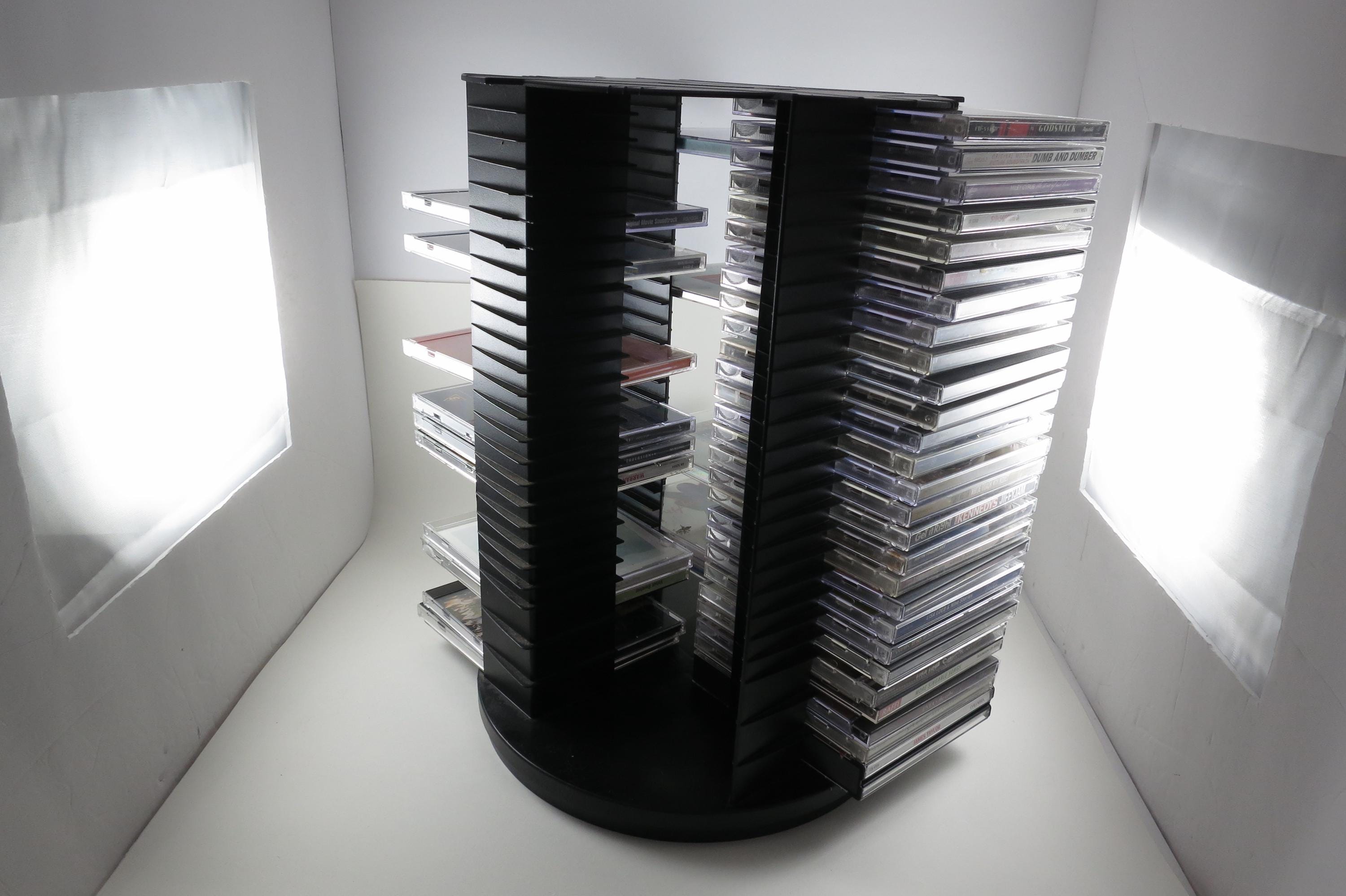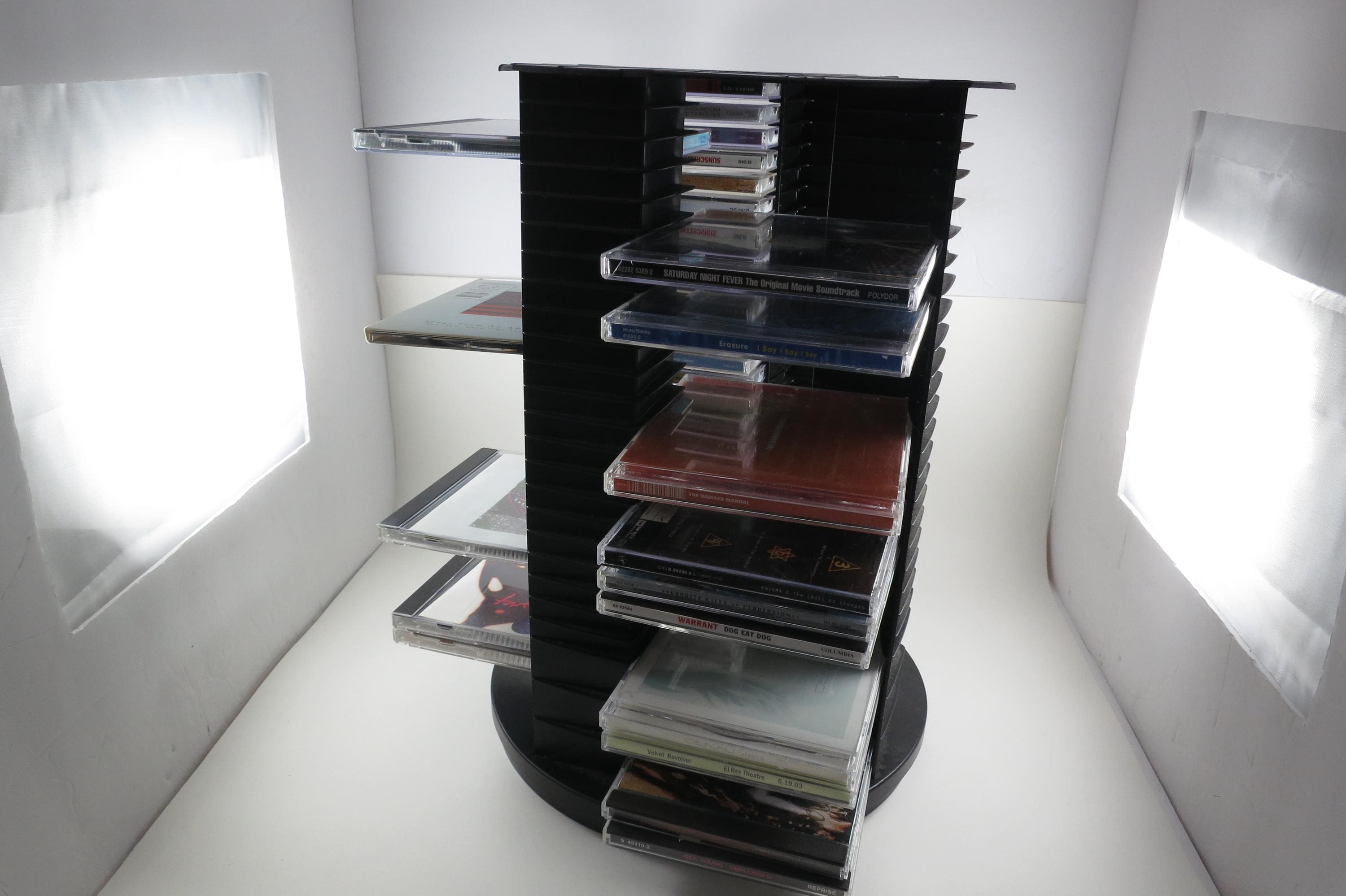 1990's Black Fellowes CD Holder Rotating Base Holds 112 Disc's Excellent Condition Great Gift. Rotating base to easily view your cd's. Each side holds 28 disc's, for a total of 112. Measures 11 1/2 inches tall, 11 inches wide. Each side has space for 3 Double CD's, total of 12 doubles and 88 Singles, or whatever configuration you like! Great gift and perfect to hold your CD's. Lazy Susan type rotating unit.