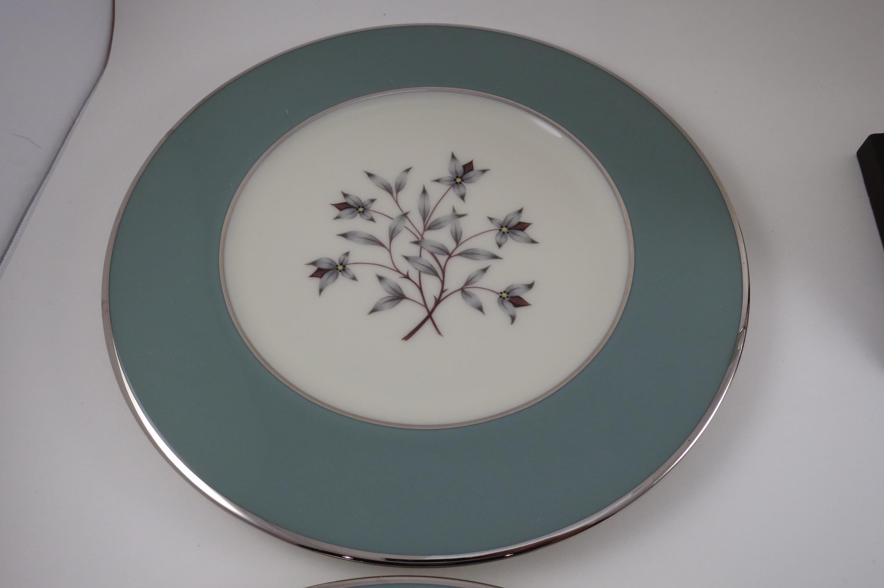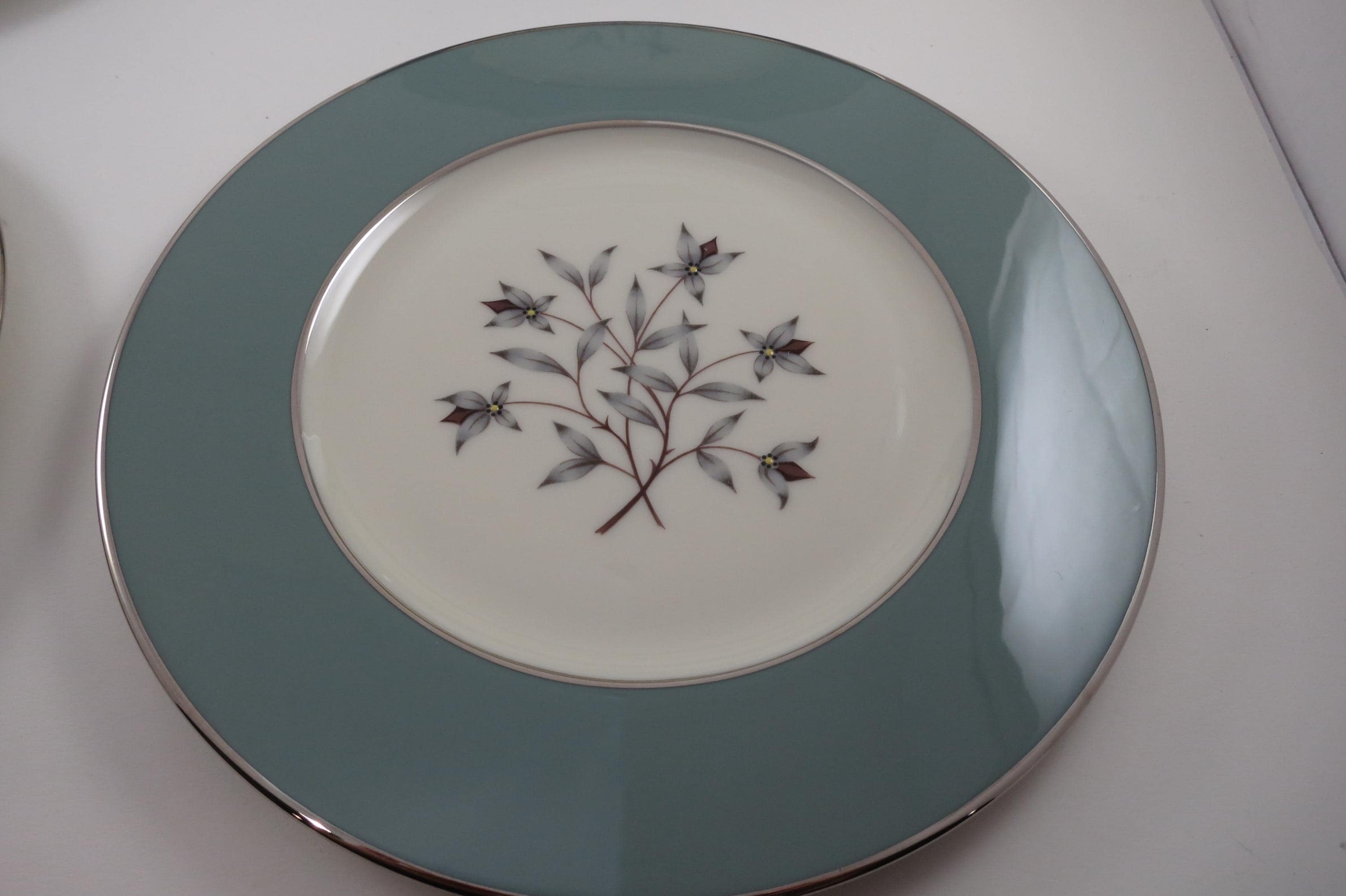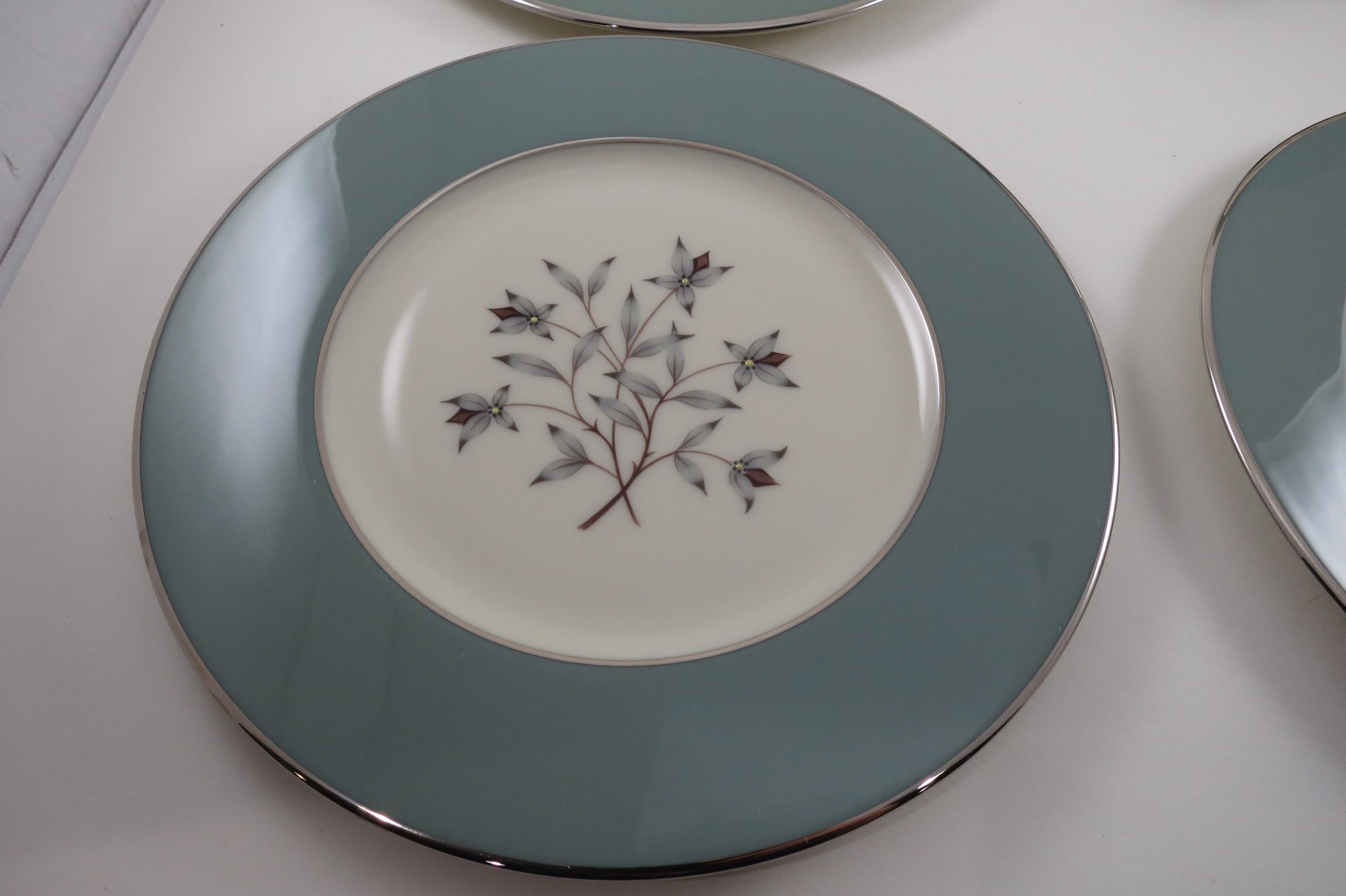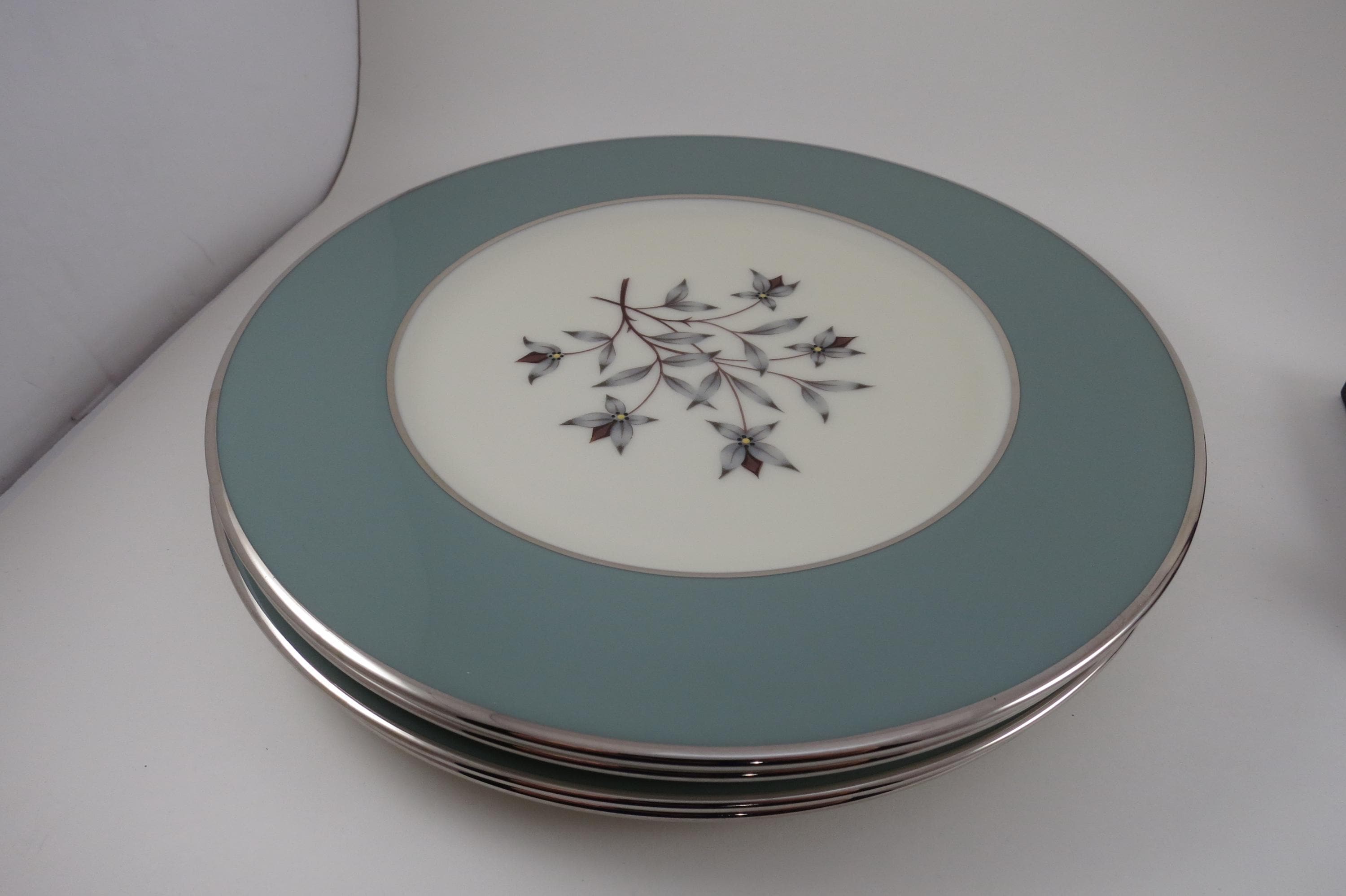These plates look like they were never used, amazing considering their age. No chips, cracks, no crazing. Fabulous Kingsley pattern with the teal band, center floral and platinum band.