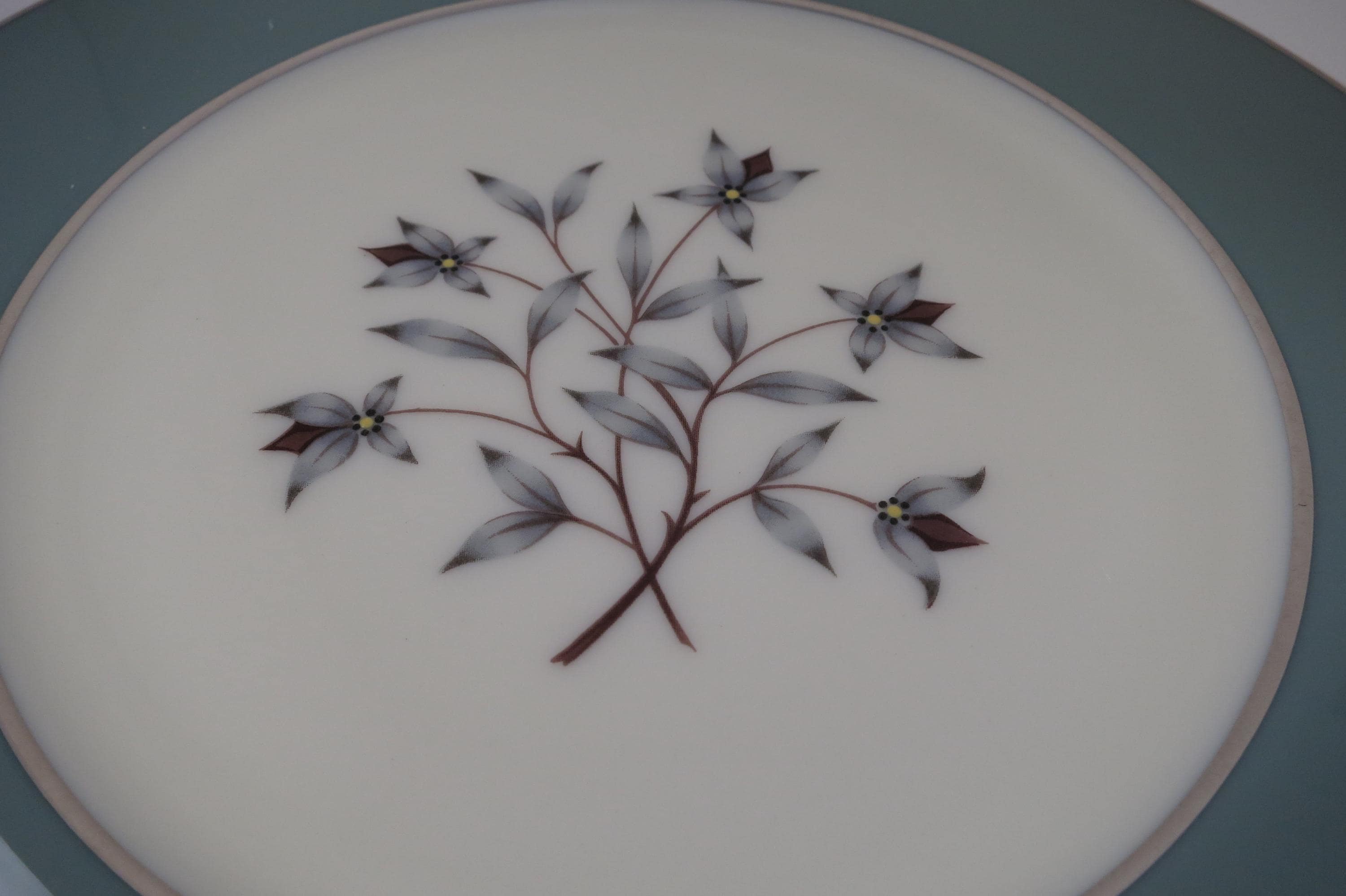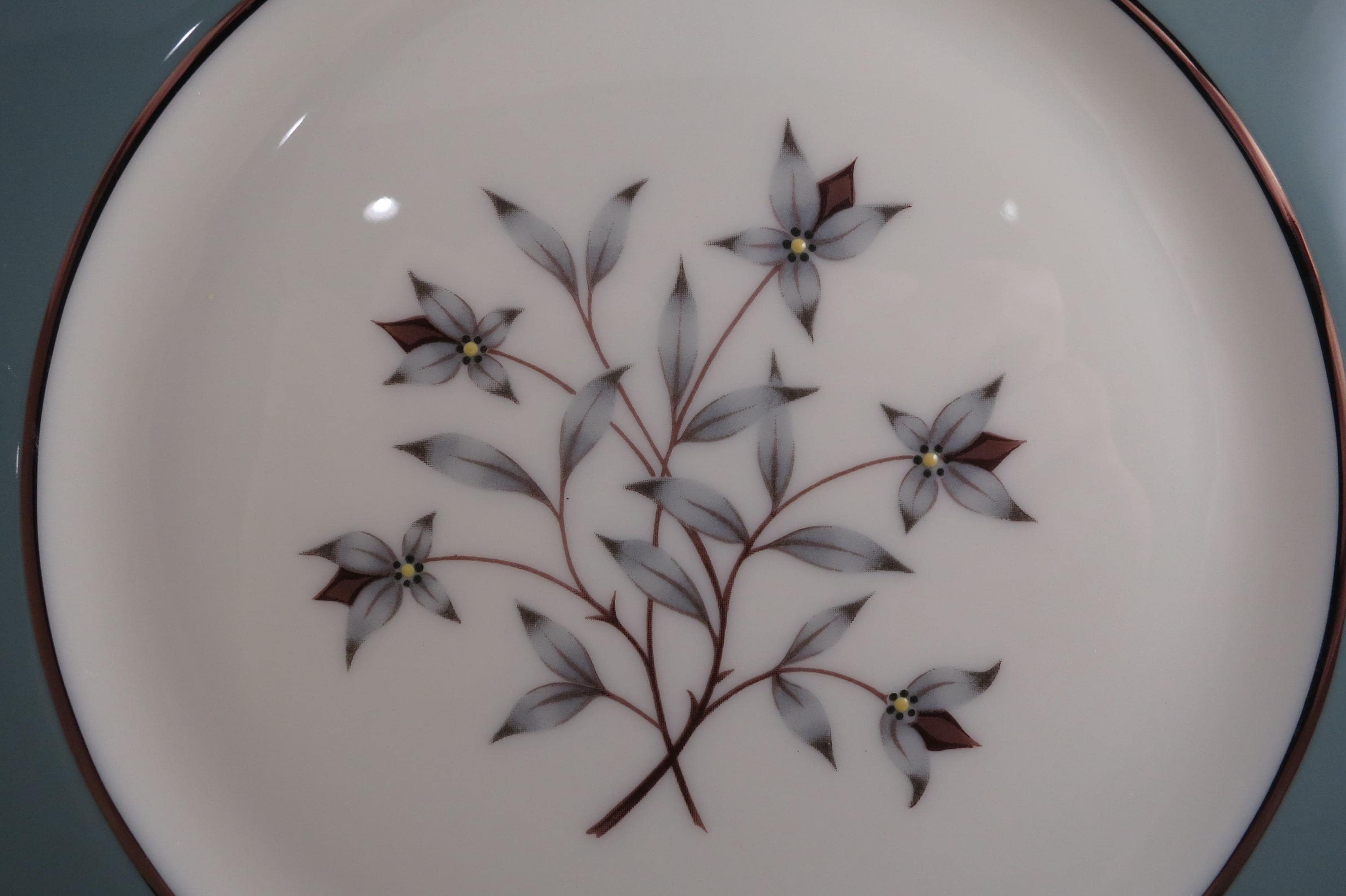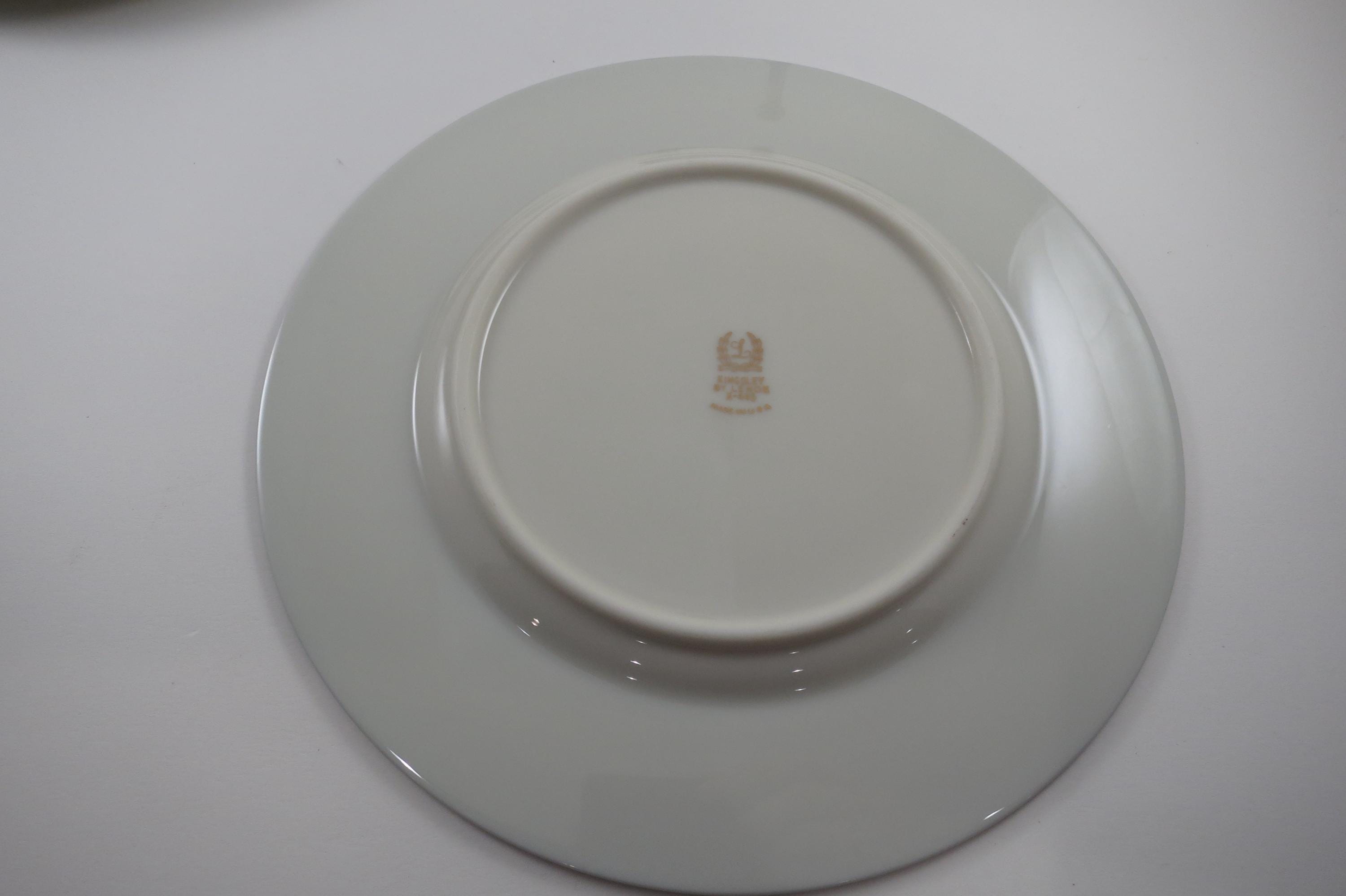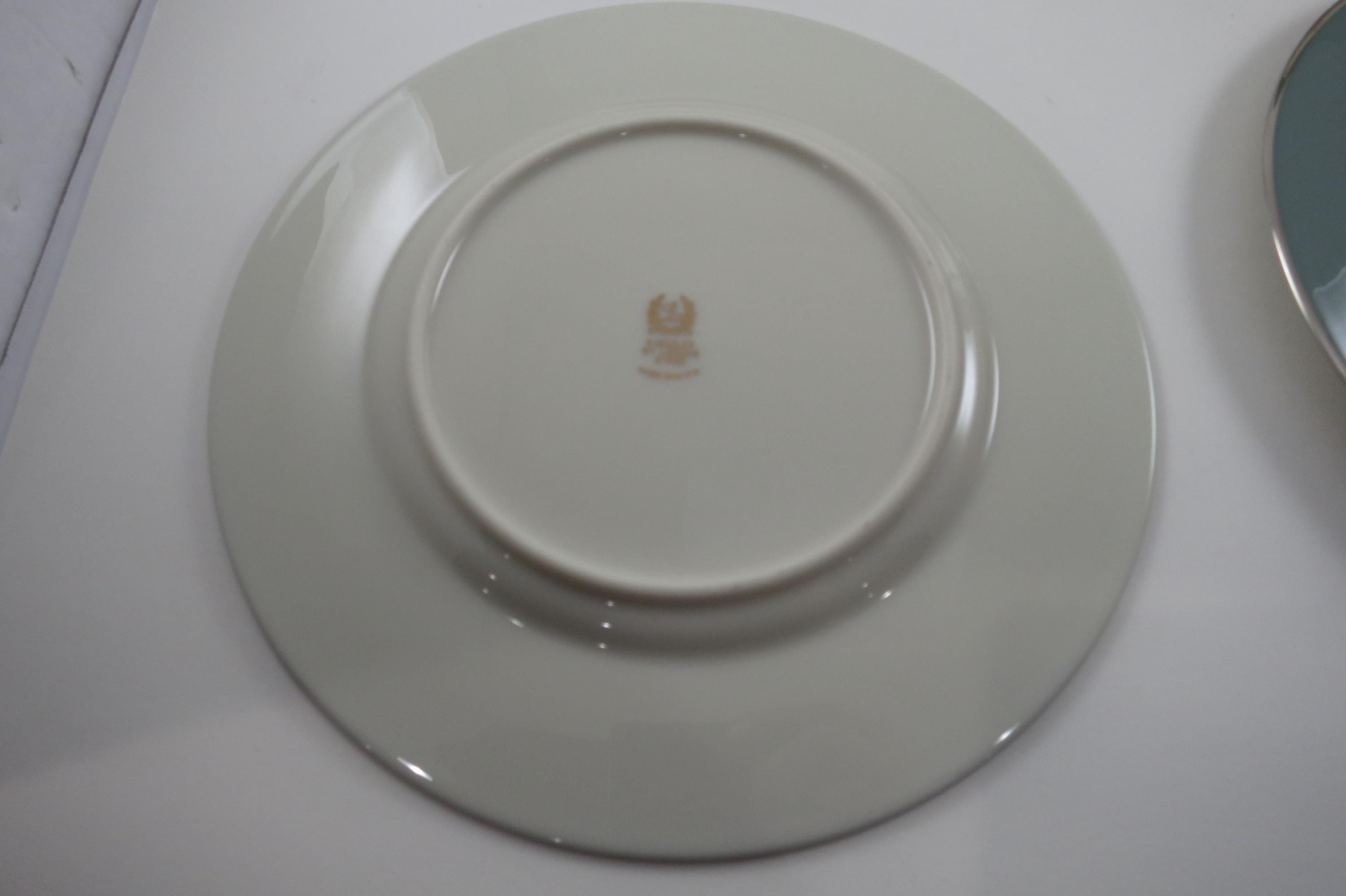 These plates look like they were never used, amazing considering their age. No chips, cracks, no crazing. Fabulous Kingsley pattern with the teal band, center floral and platinum band.