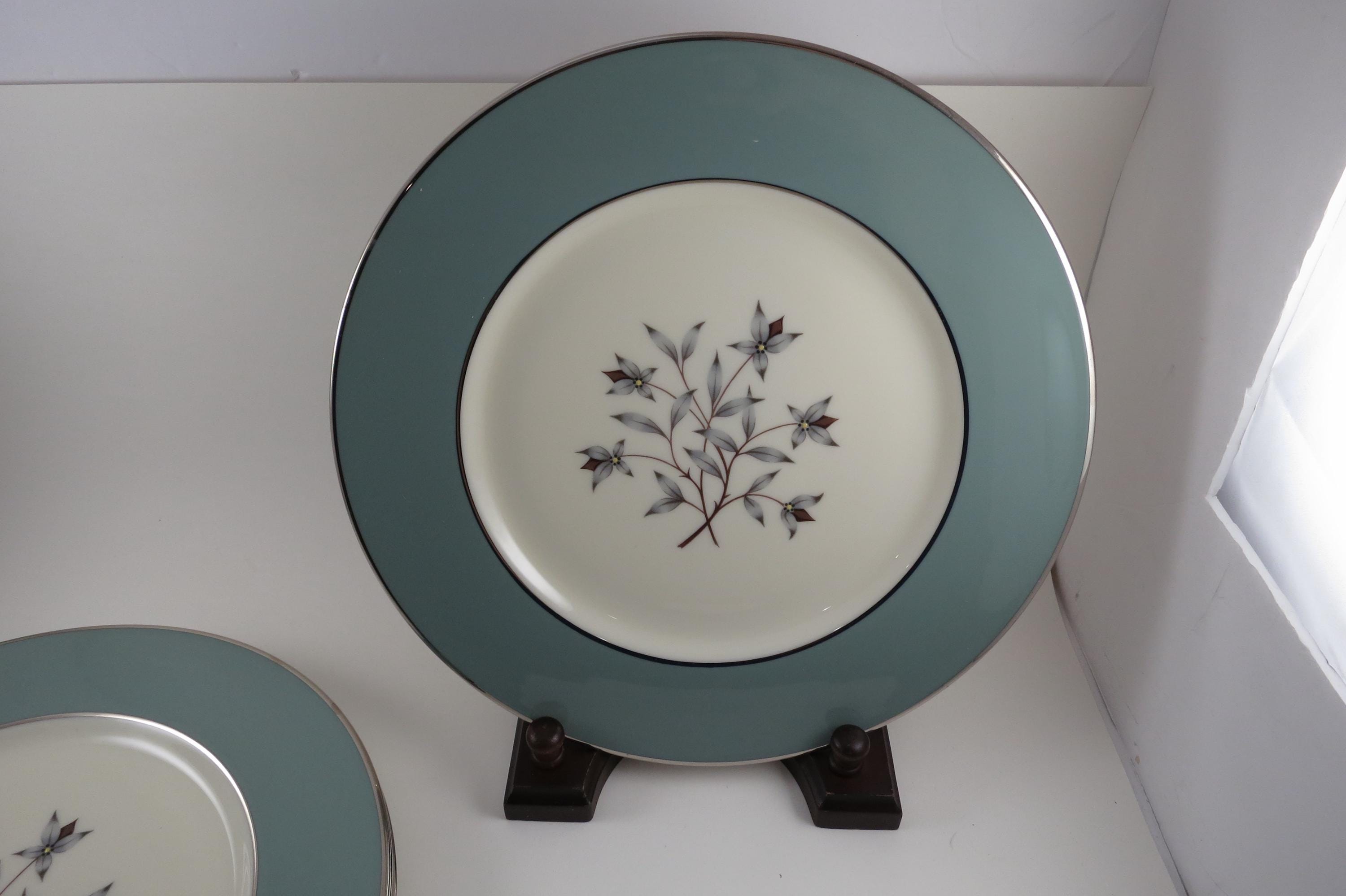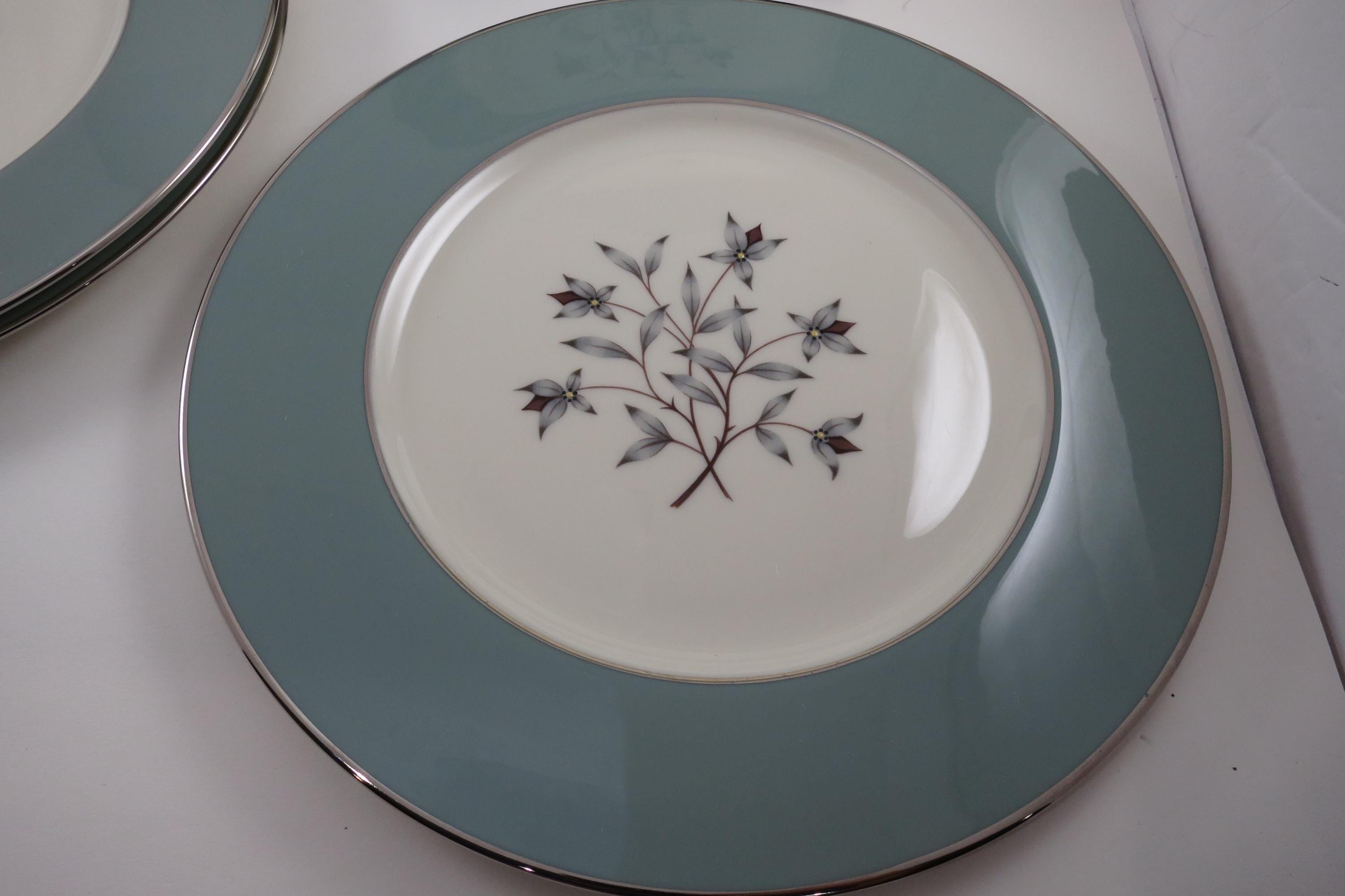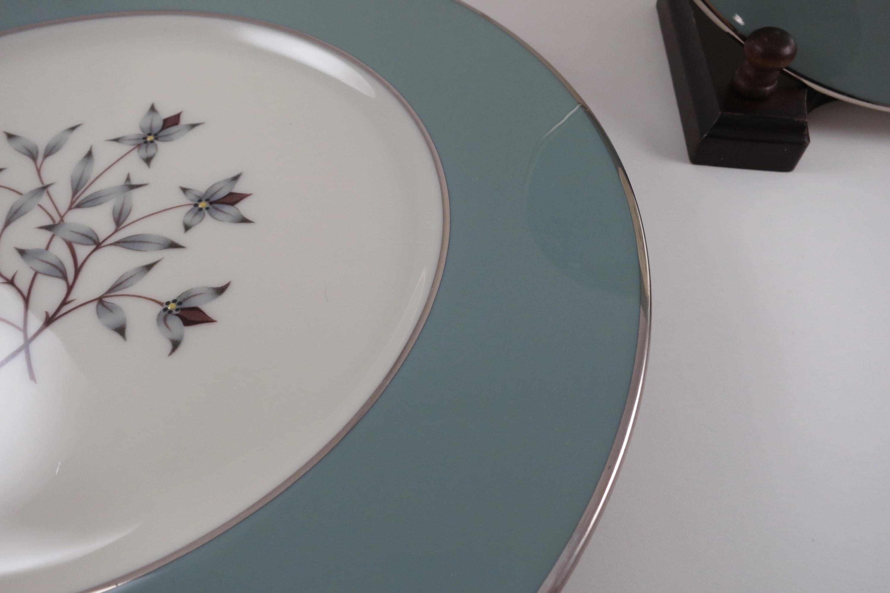 These plates look like they were never used, amazing considering their age. No chips, cracks, no crazing. Fabulous Kingsley pattern with the teal band, center floral and platinum band.
