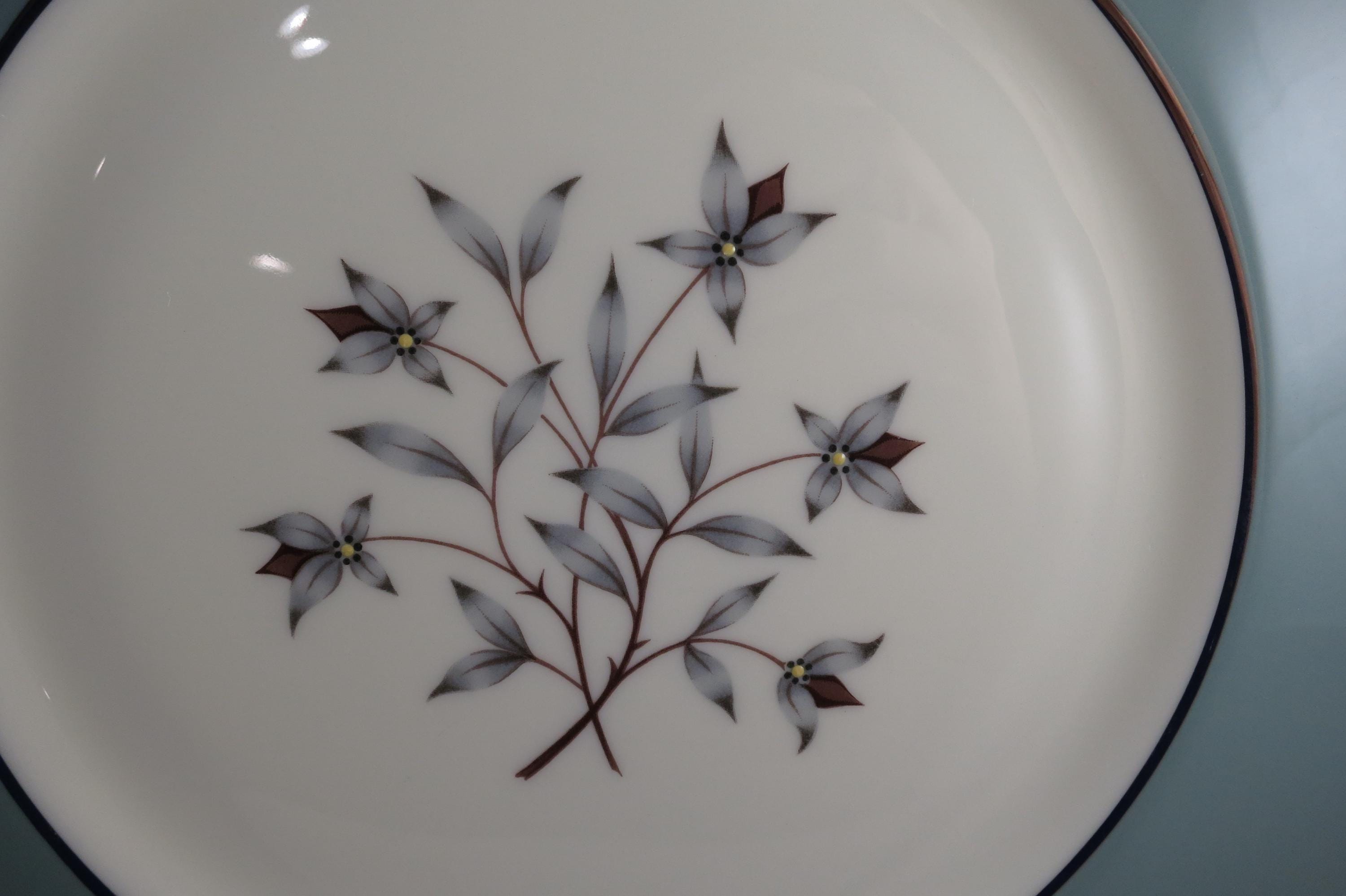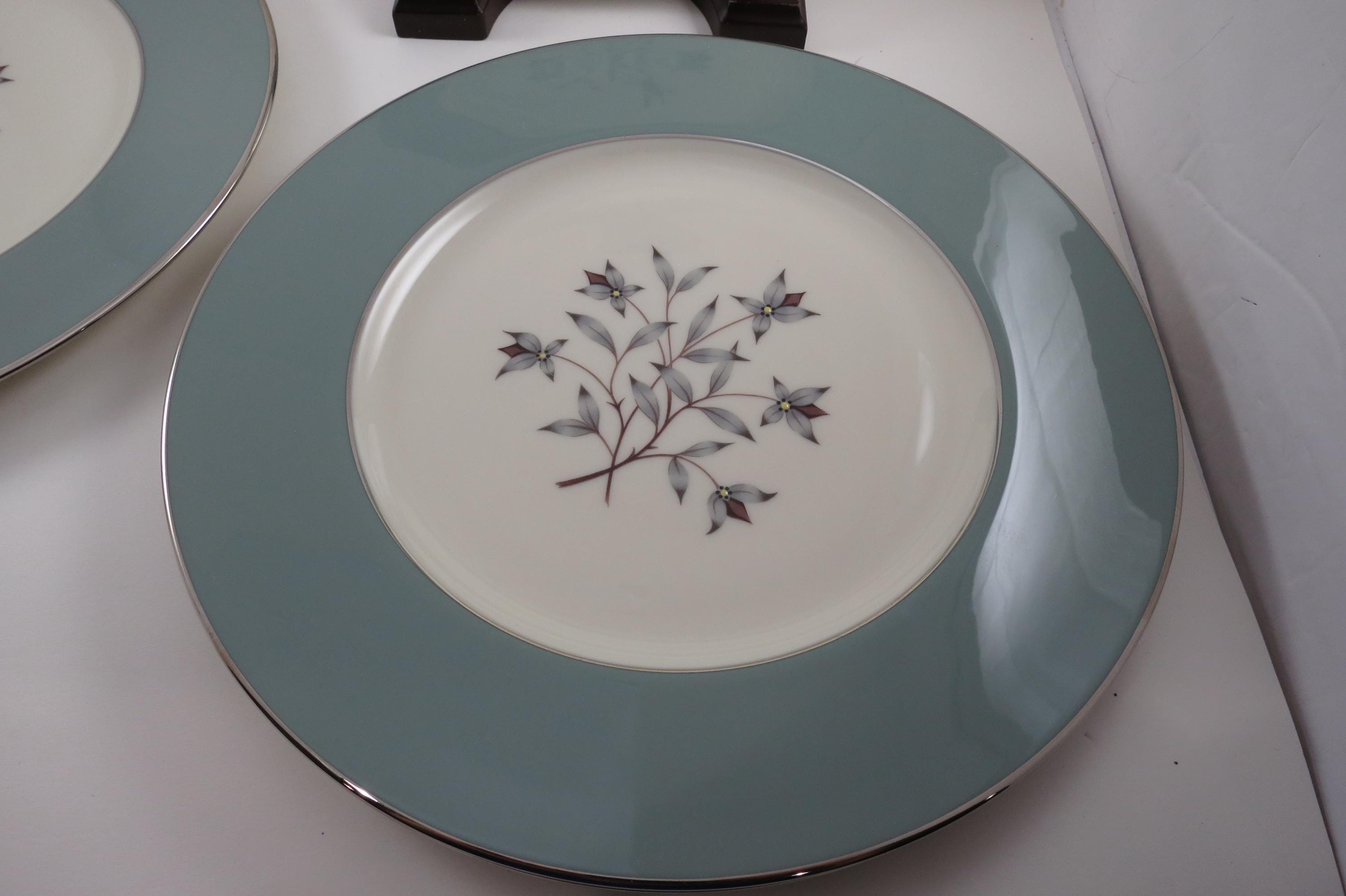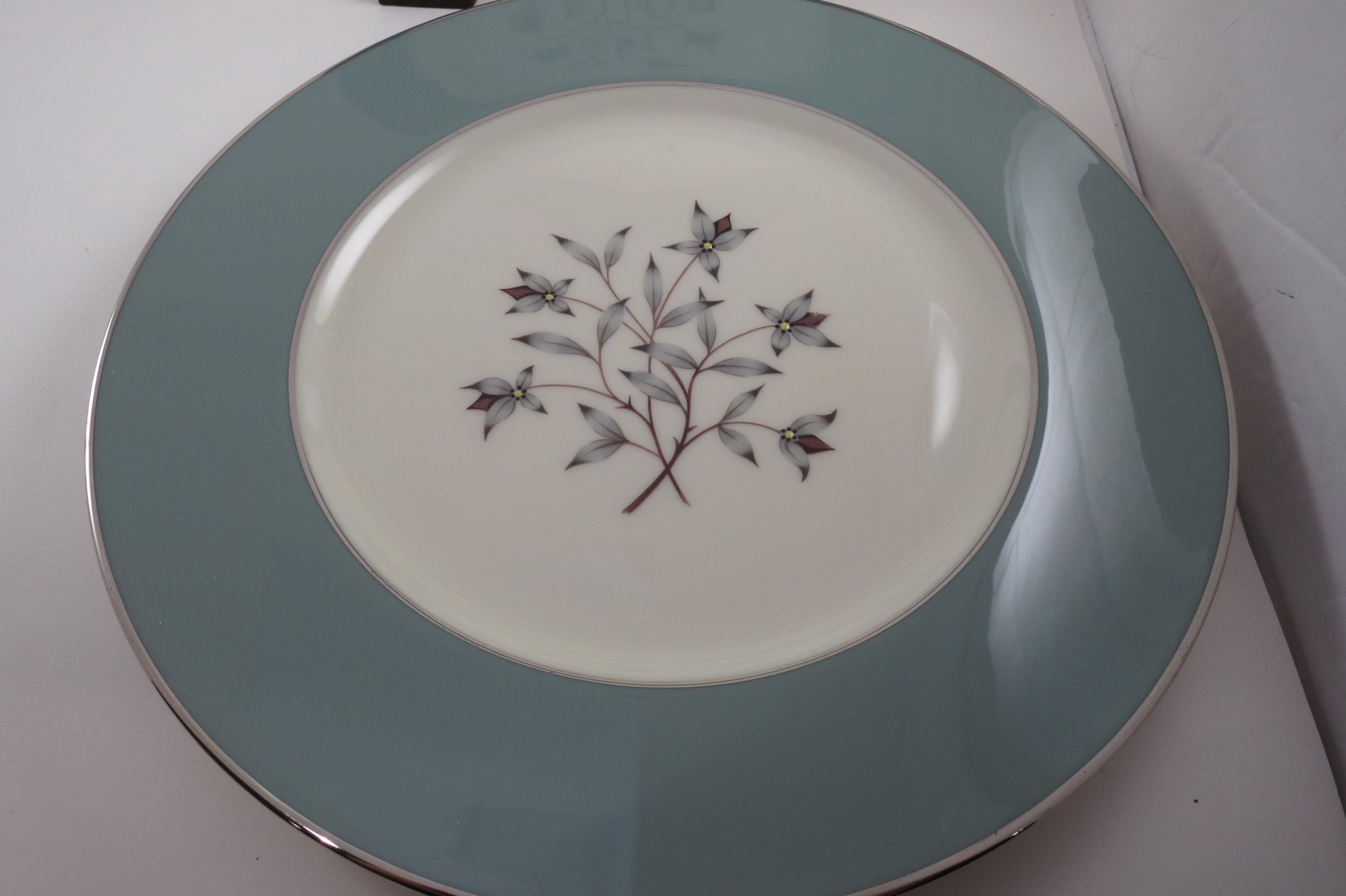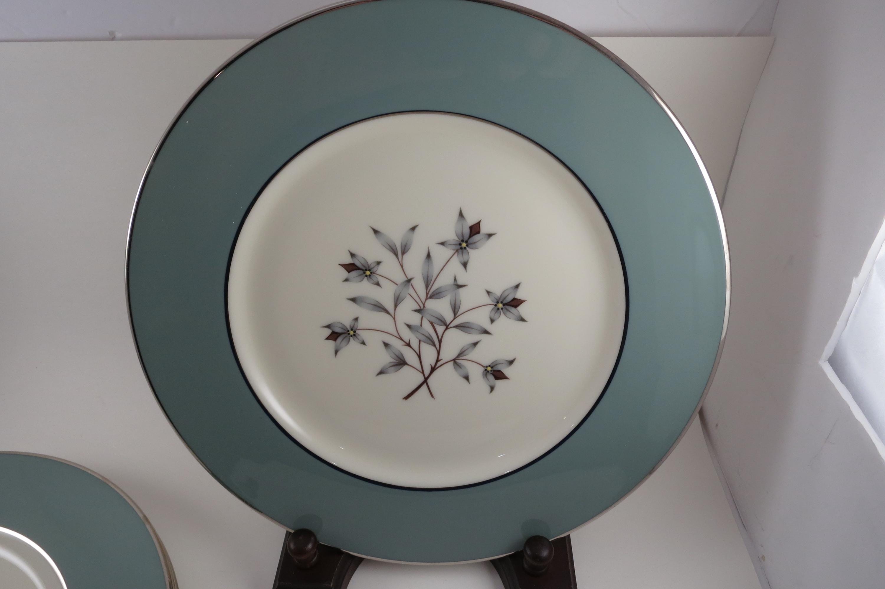 These plates look like they were never used, amazing considering their age. No chips, cracks, no crazing. Fabulous Kingsley pattern with the teal band, center floral and platinum band.