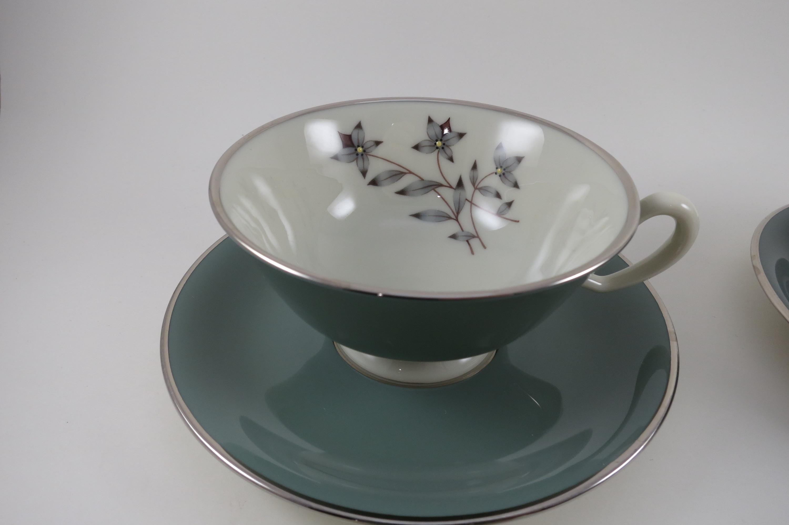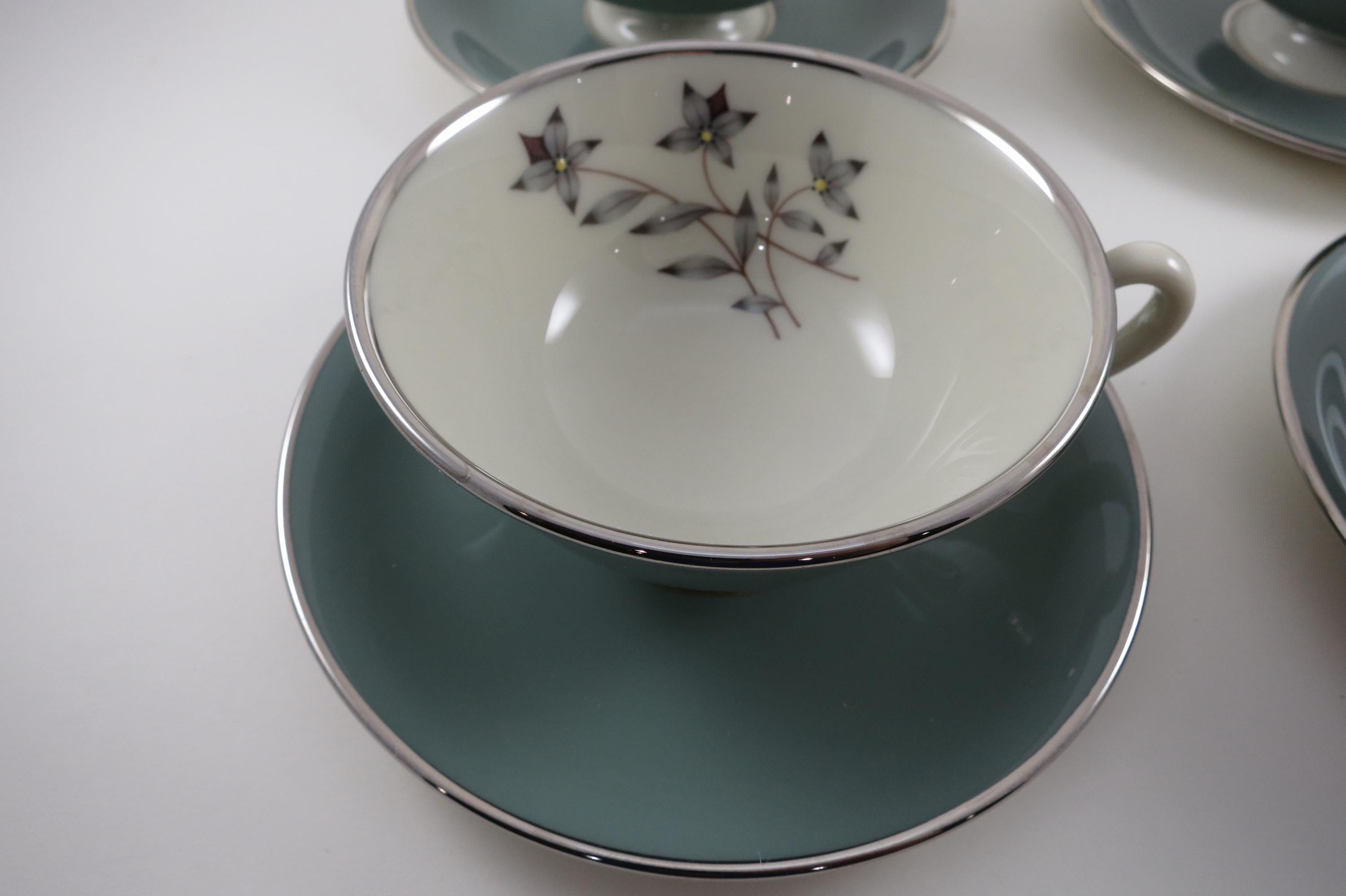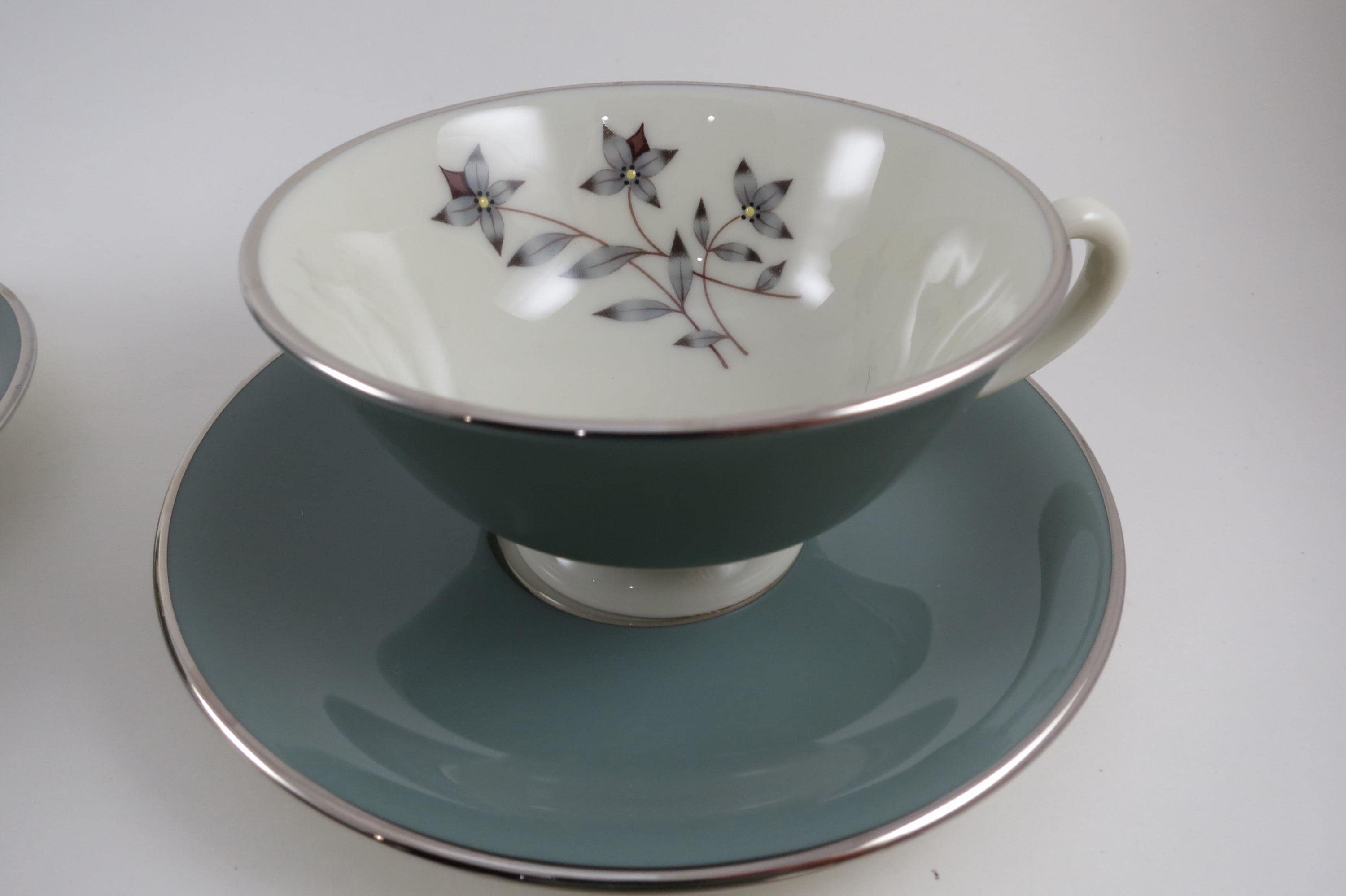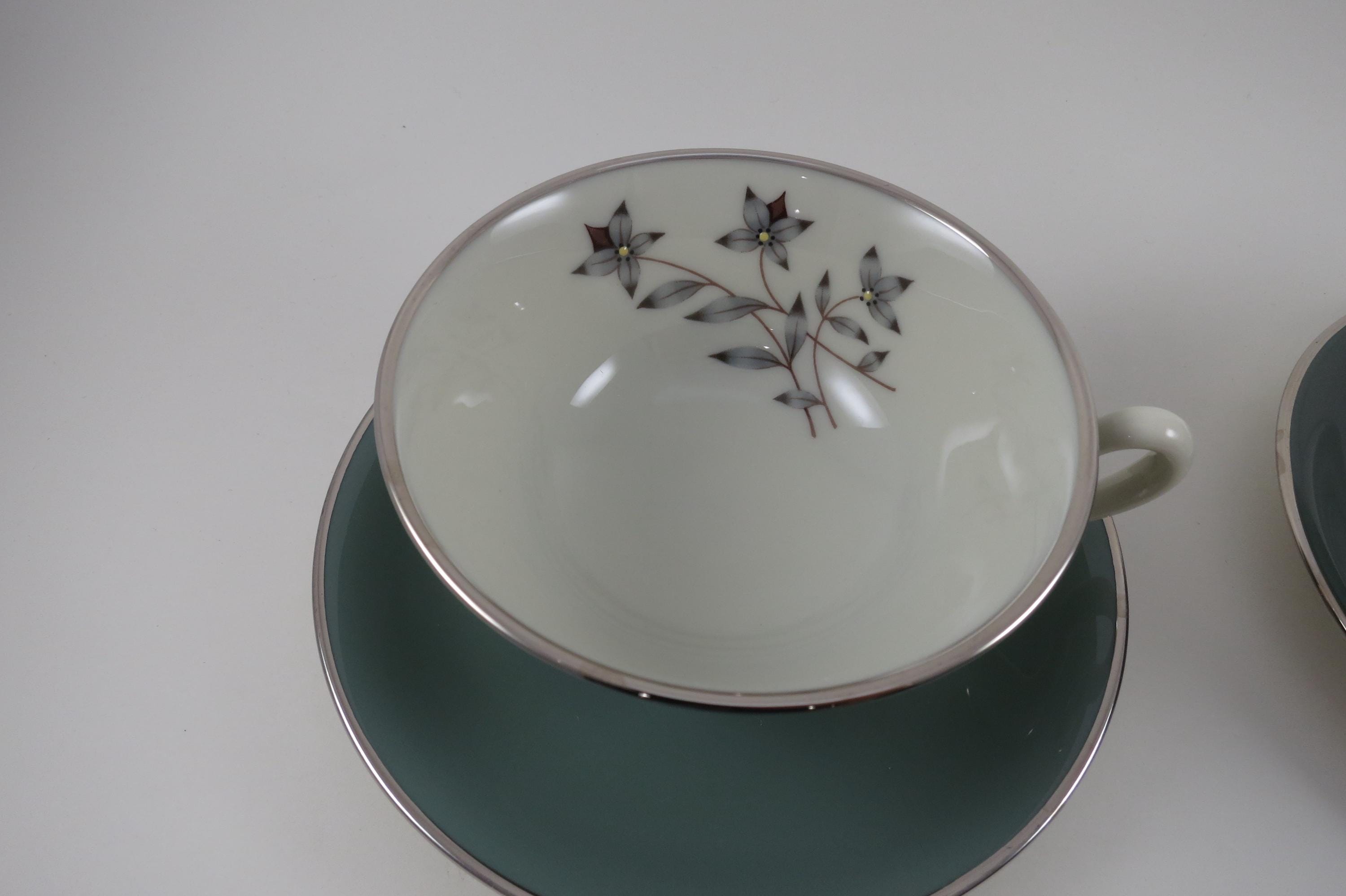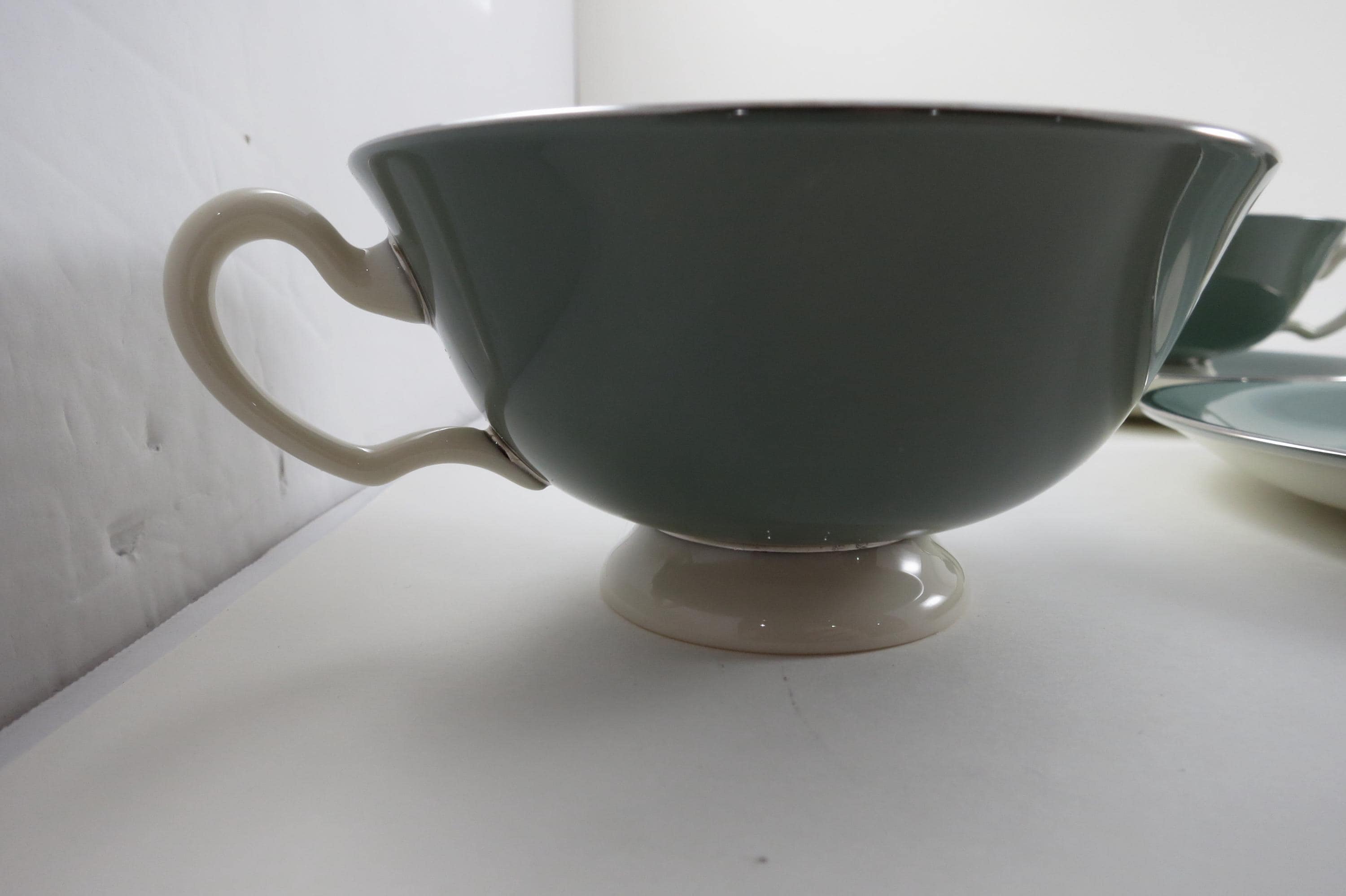 These cups and saucers look like they were never used, amazing considering their age. No chips, cracks, no crazing. Fabulous Kingsley pattern with the teal band, center floral and platinum band.