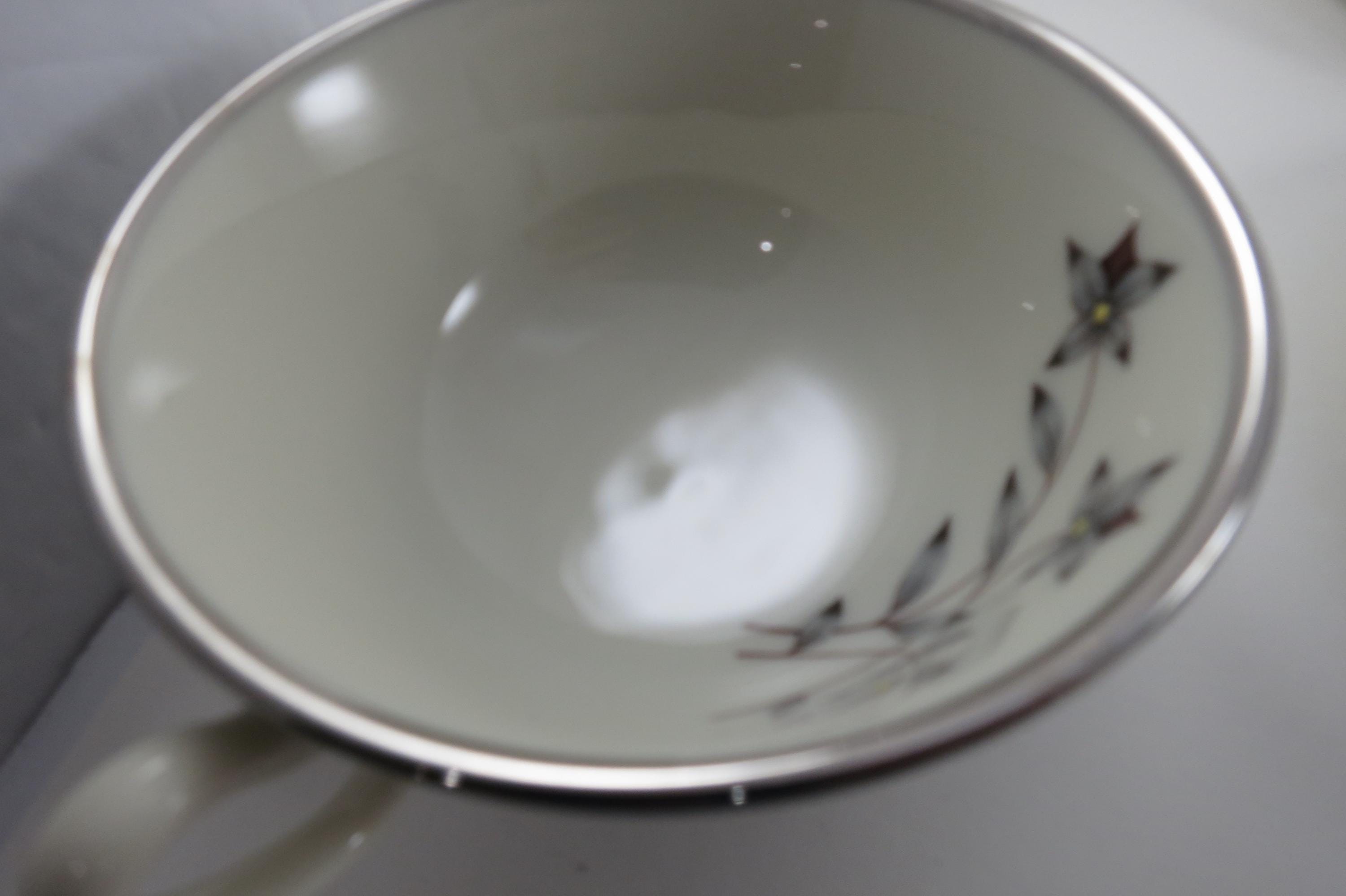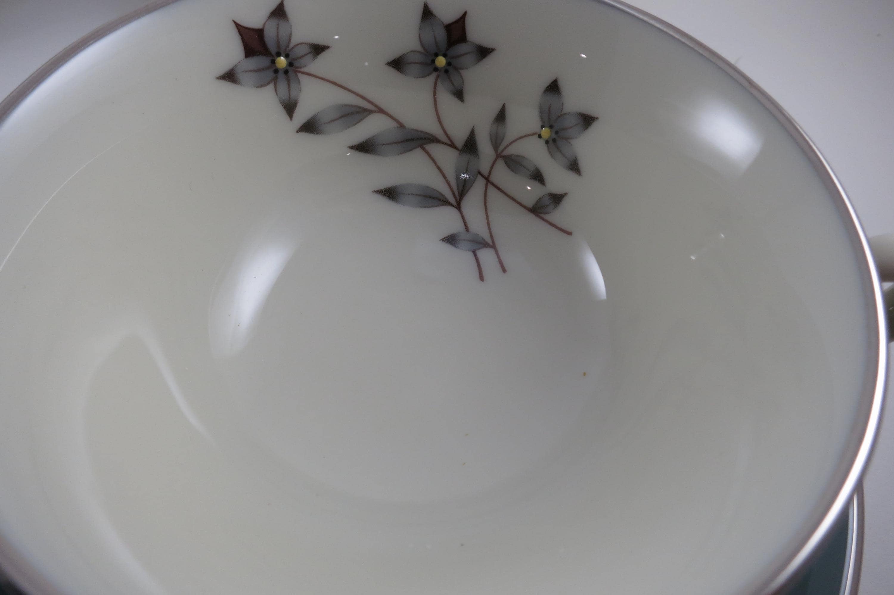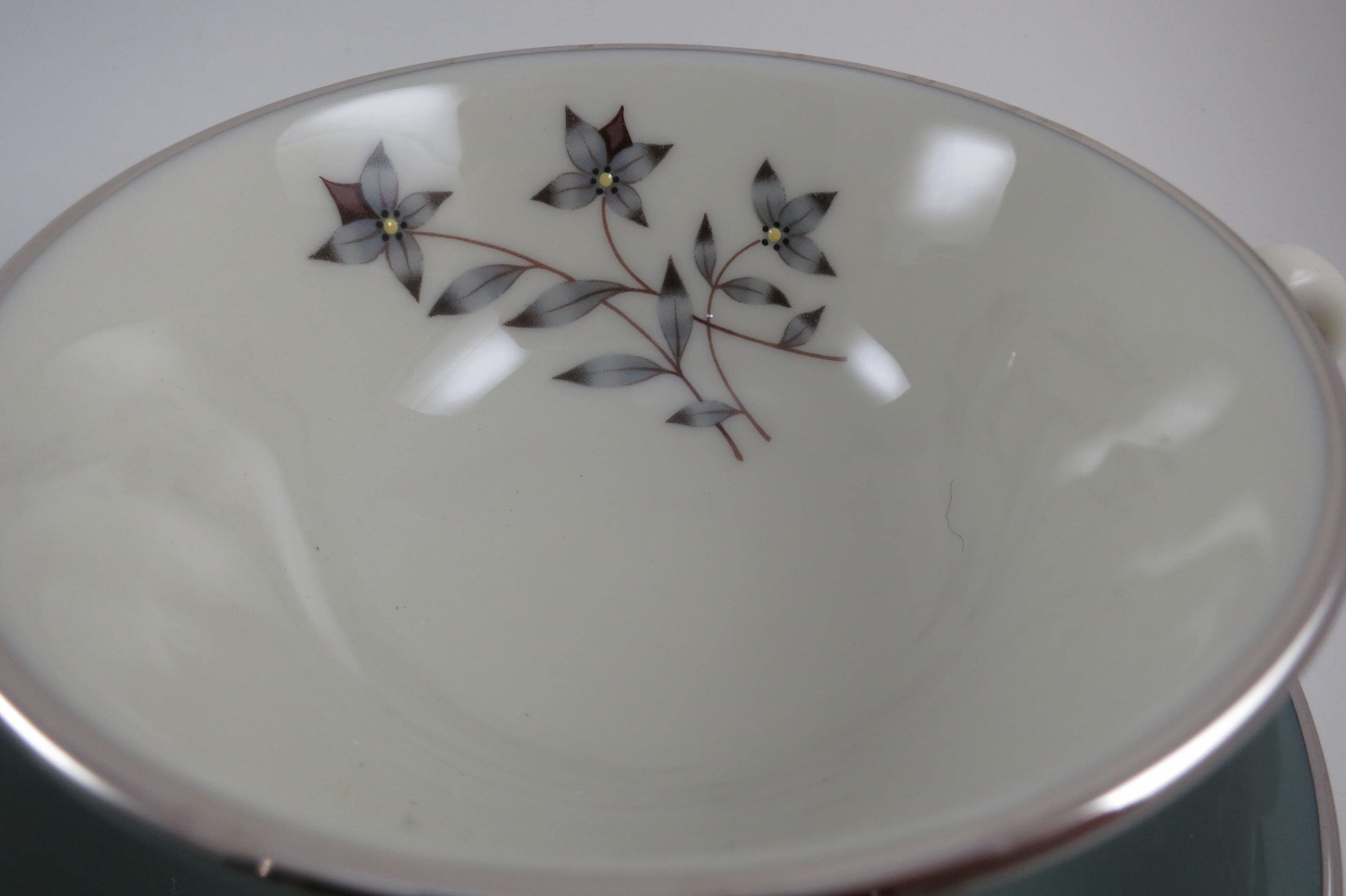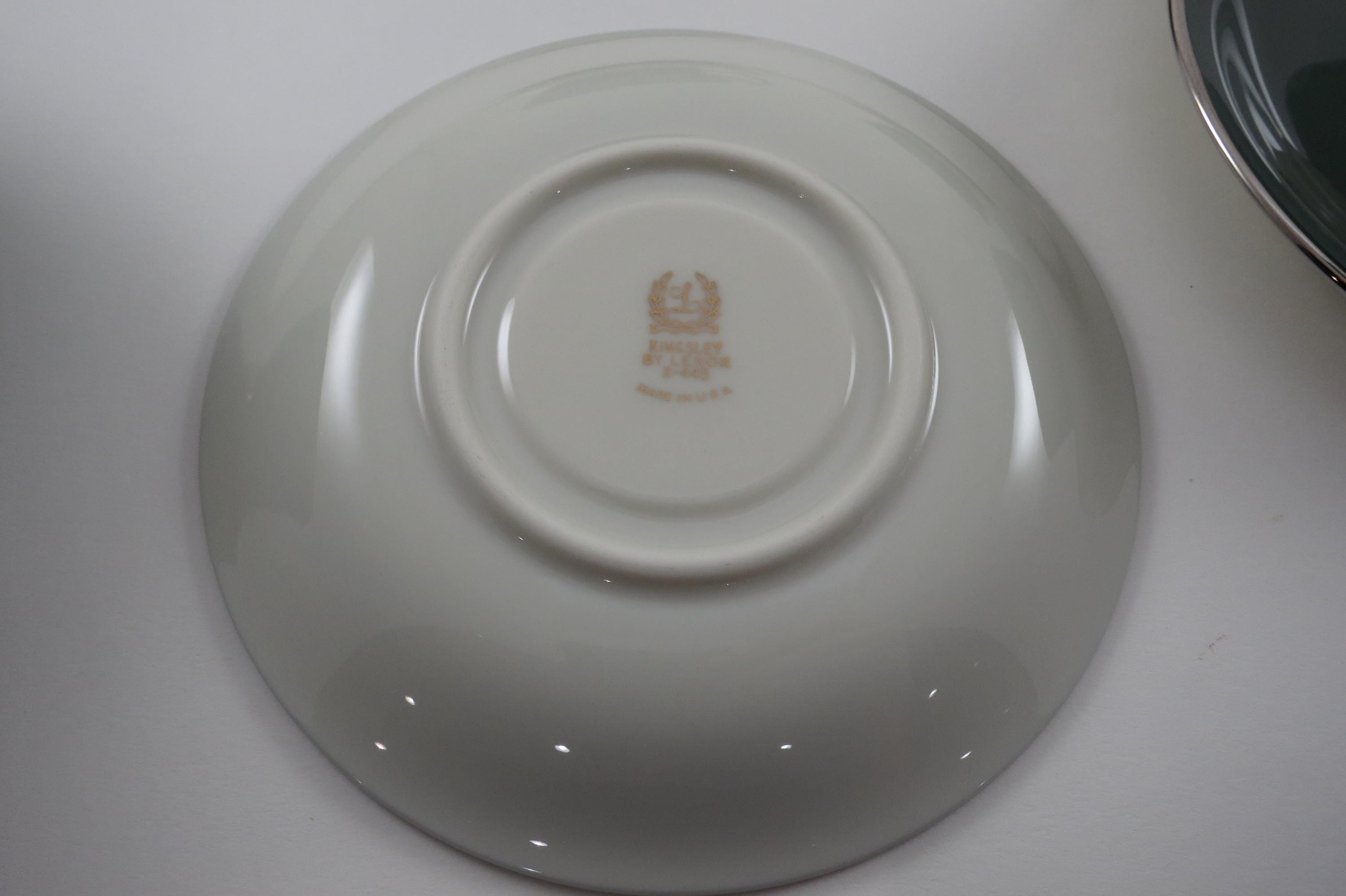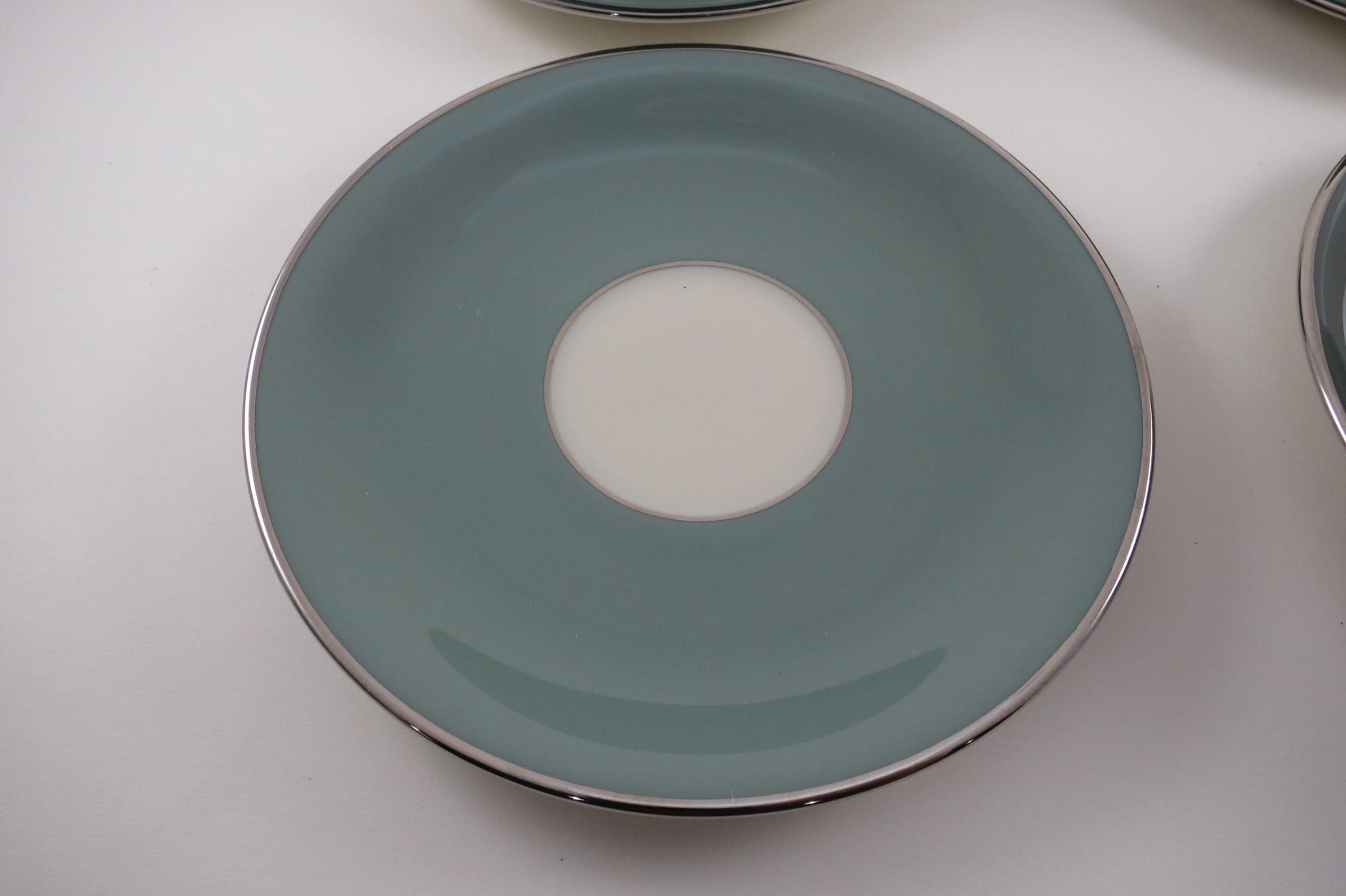 These cups and saucers look like they were never used, amazing considering their age. No chips, cracks, no crazing. Fabulous Kingsley pattern with the teal band, center floral and platinum band.