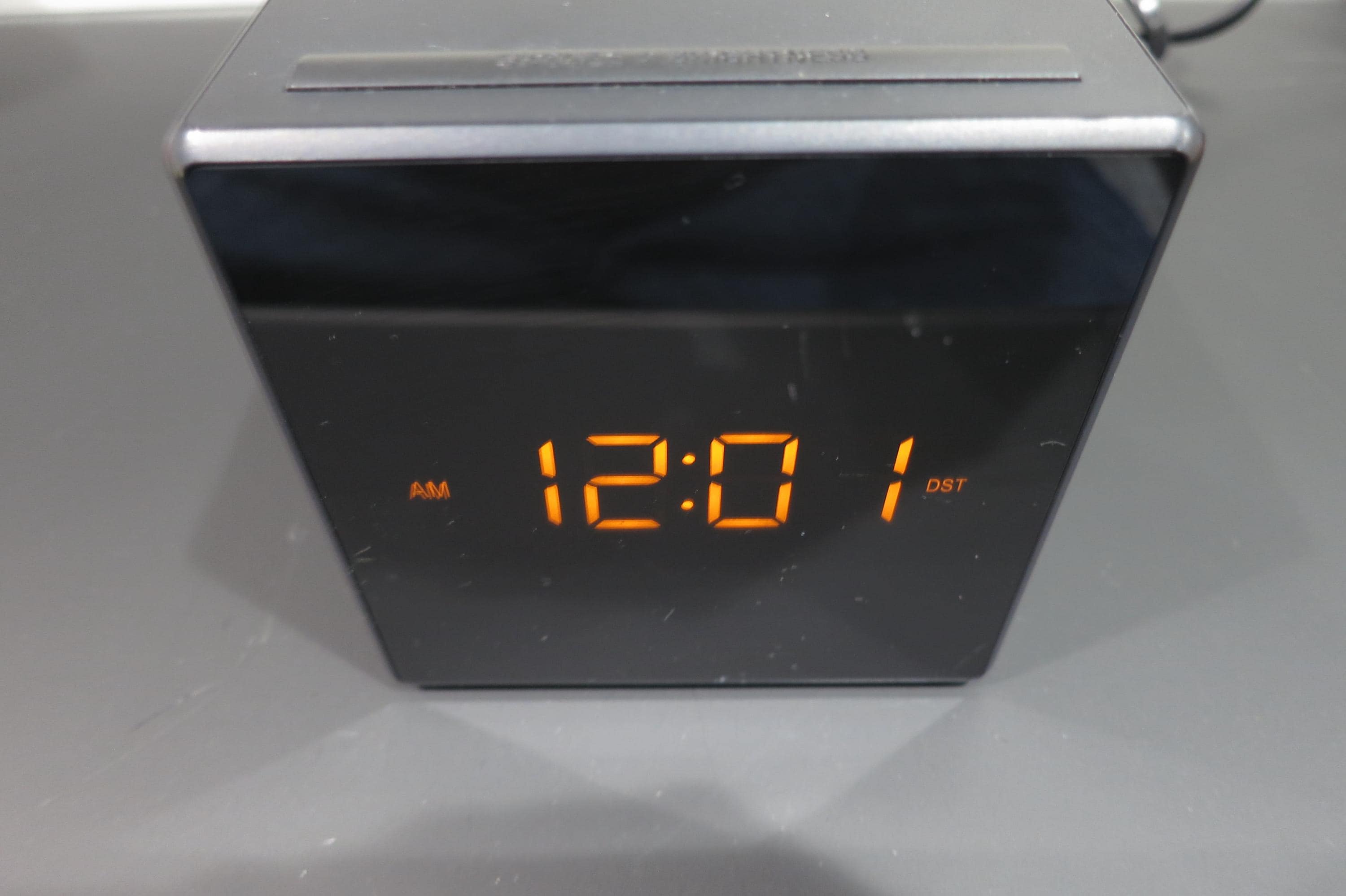 Has large orange numbers. Alarm can be either the radio or a buzzer. Has sleep mode as well as a battery back up.