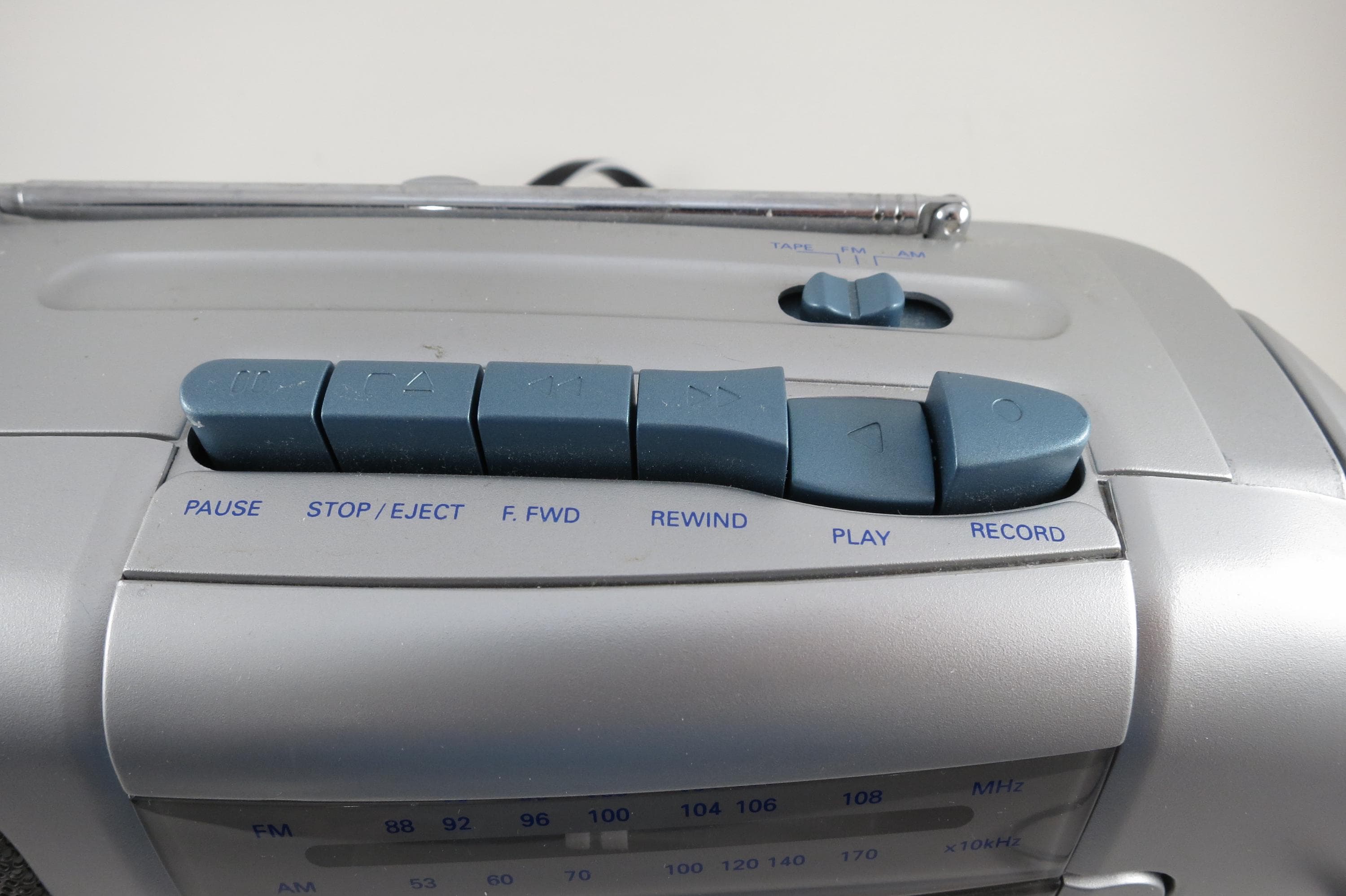 Cassette and radio both work properly, decent sound for a smaller unit. Measures 12 inches wide, 3 1/2 inches deep and 5 1/2 inches tall. Handle and antenna are in excellent condition as well.