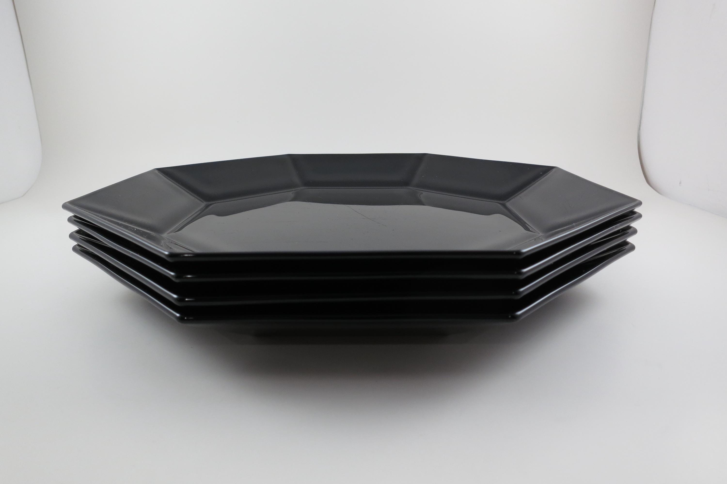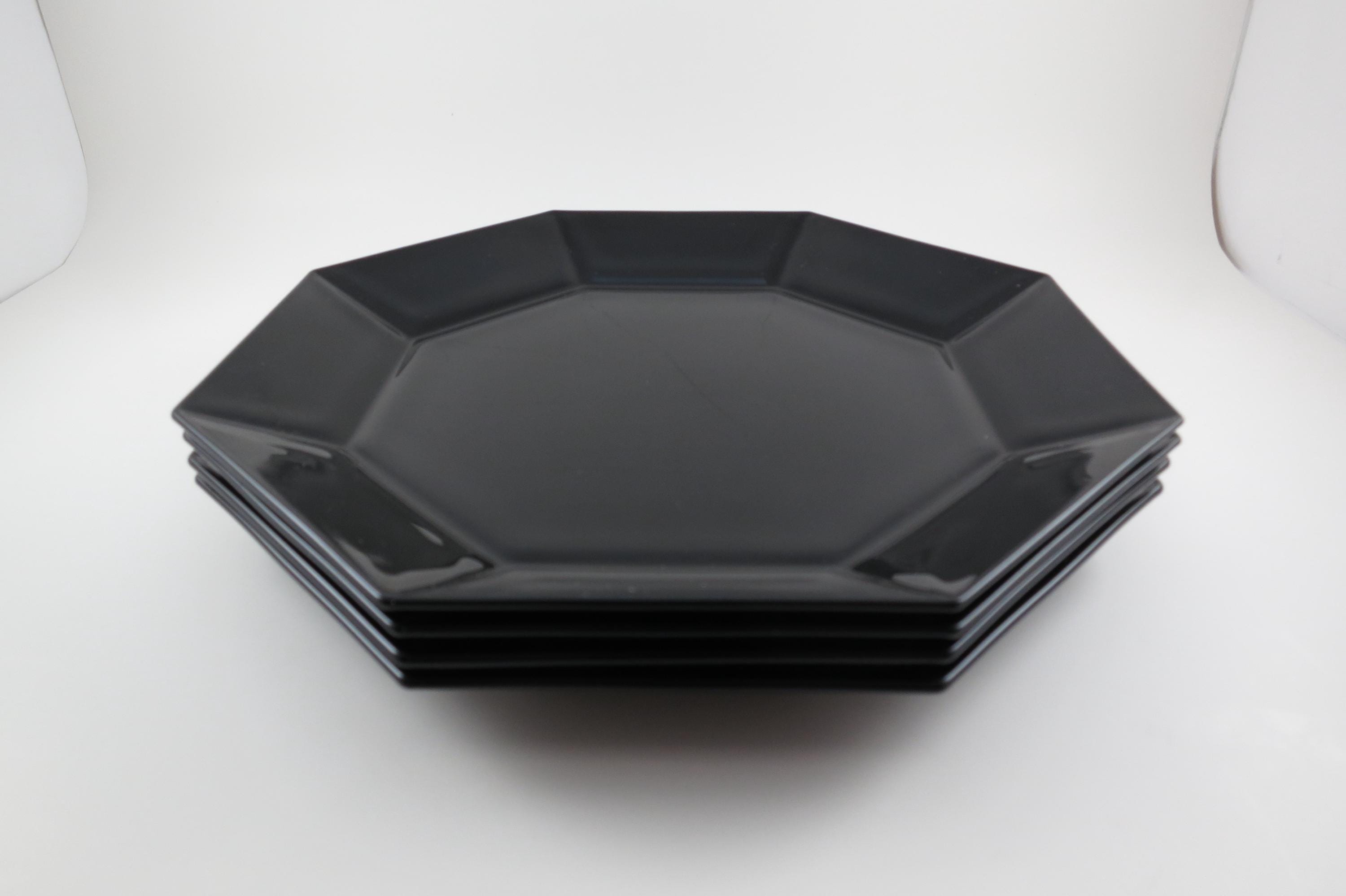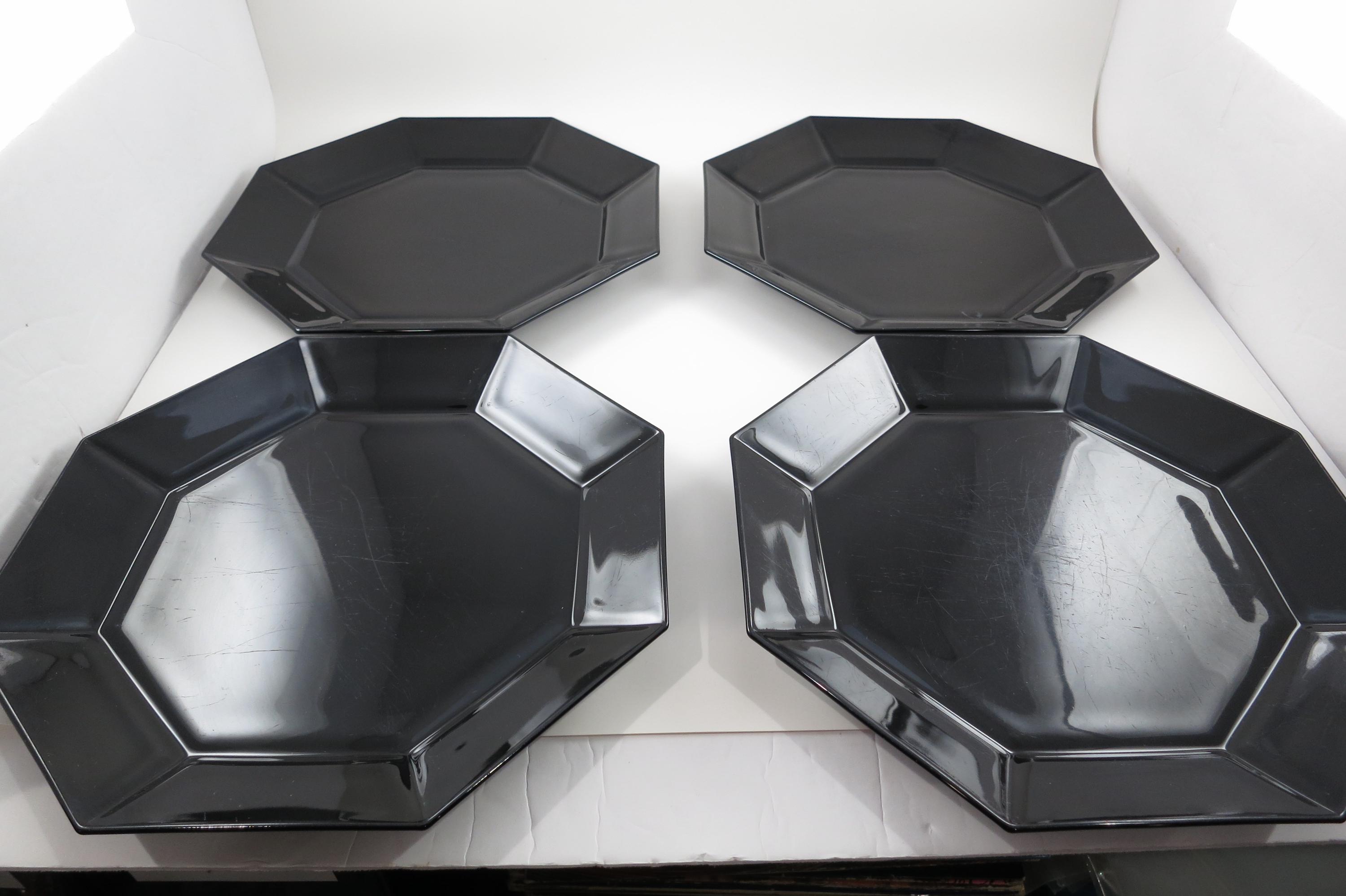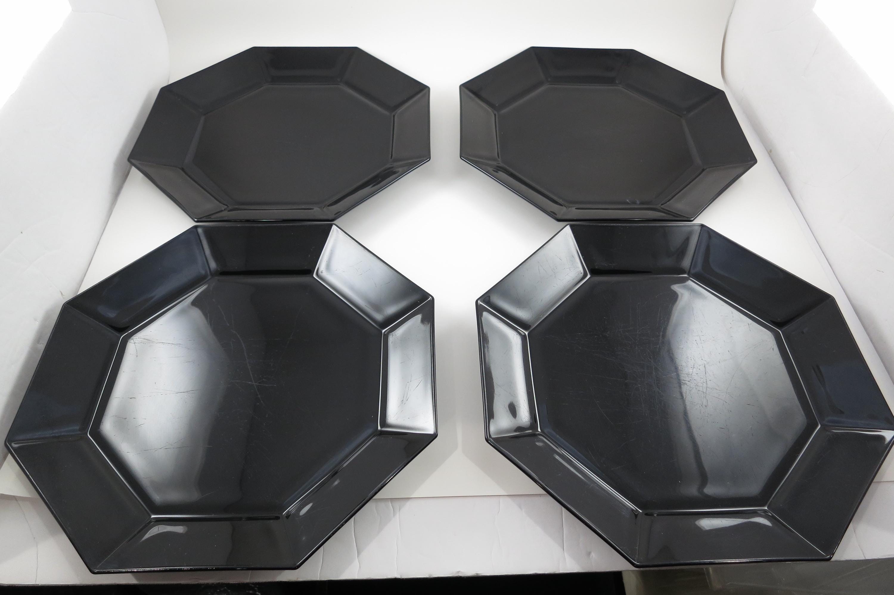 Set of Four Arcoroc France Octime Black 9 3/4 Inch Sharp Edge Dinner Plates.