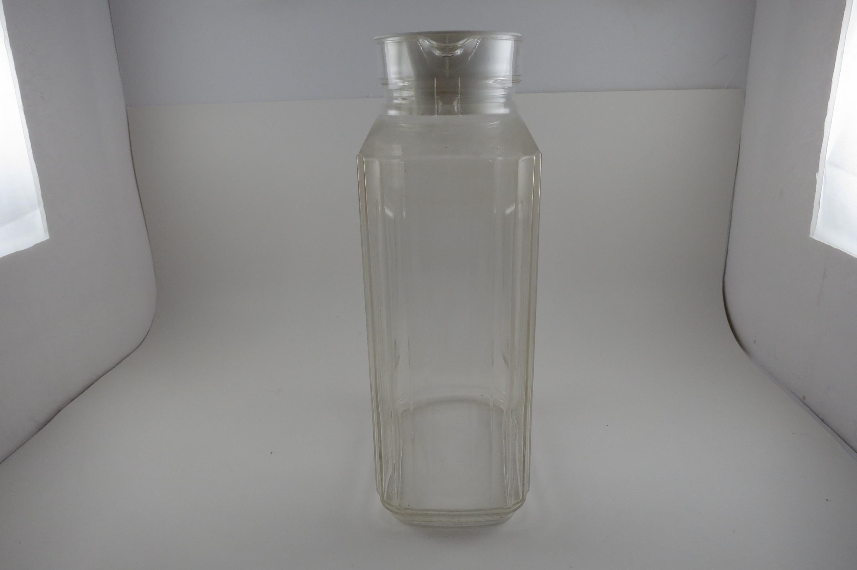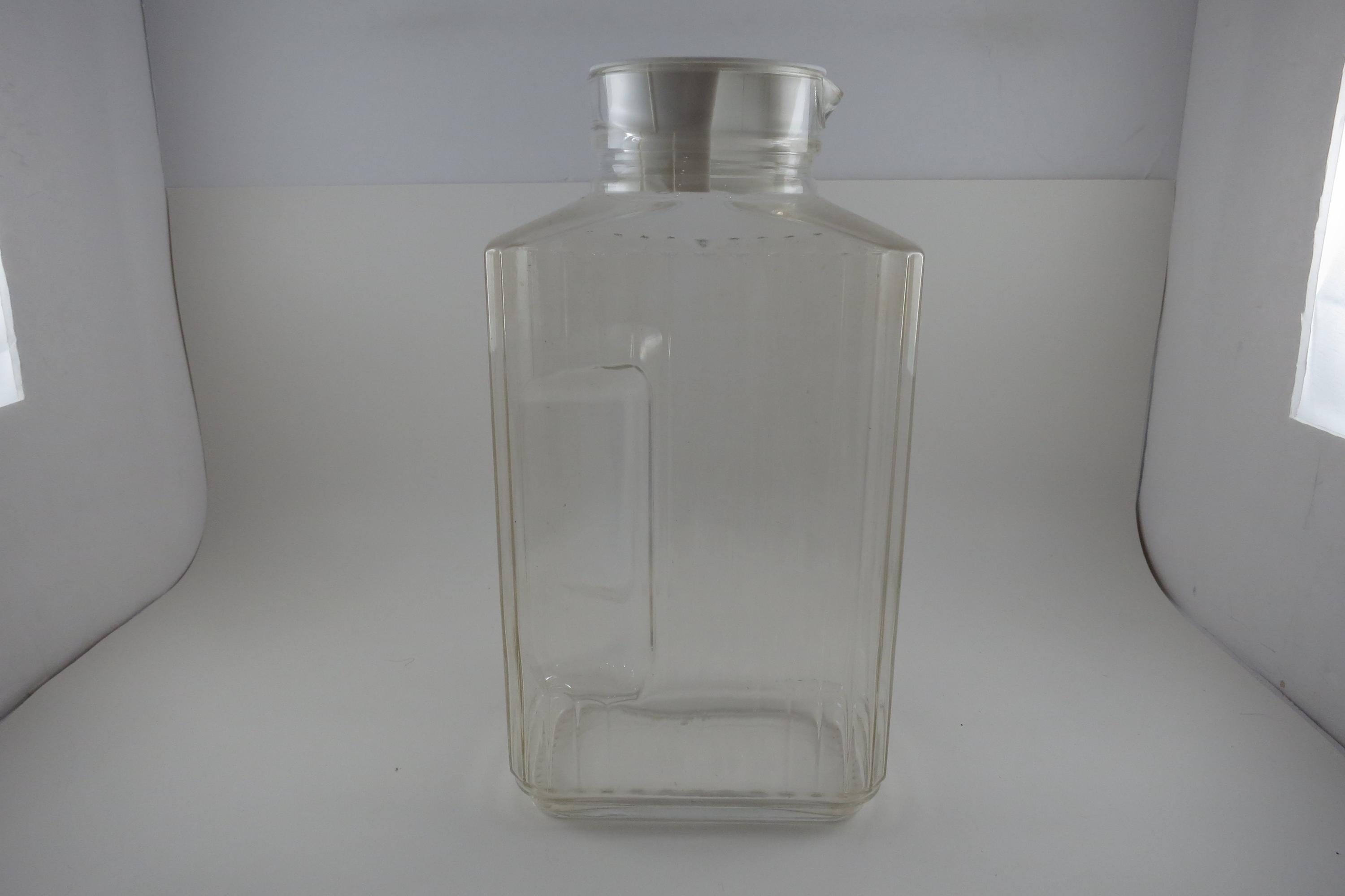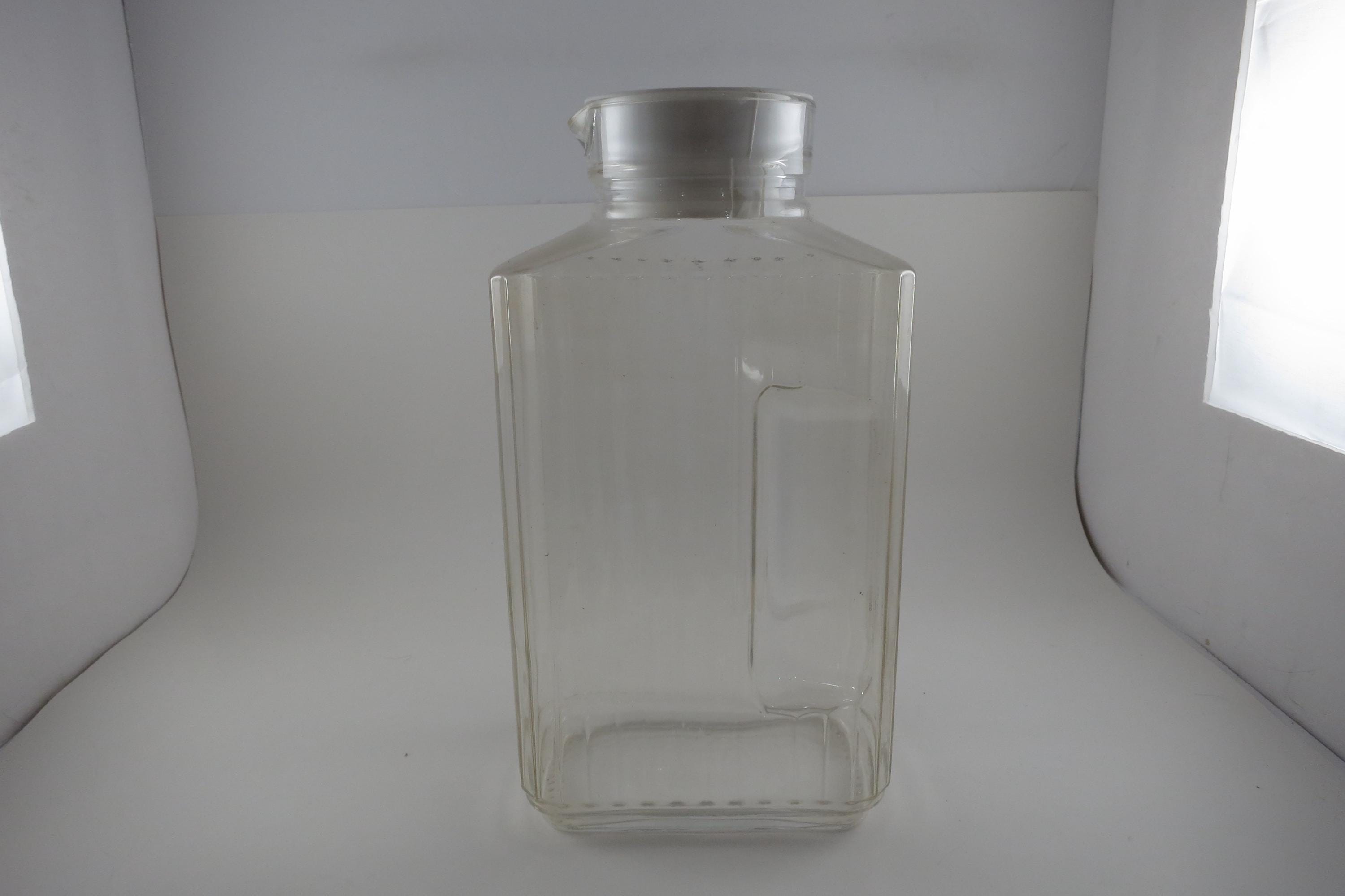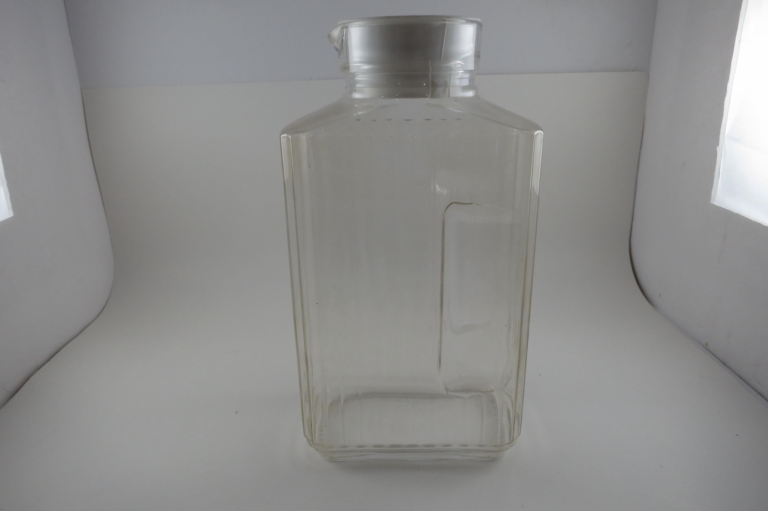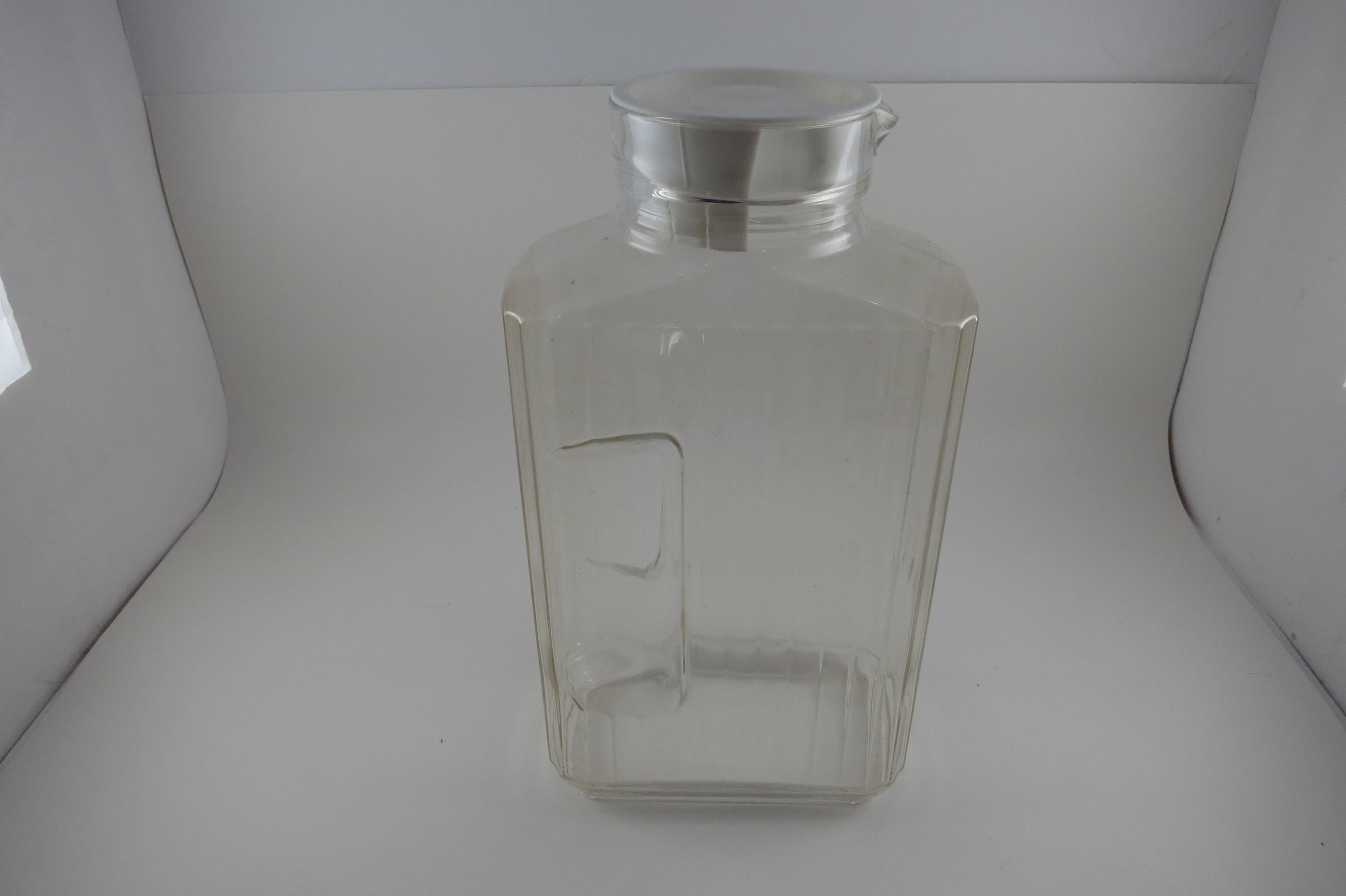 Vintage ARC France Ribbed Glass Juice/Water Jar with Original White Lid 2 Liter Excellent Original Condition. Measures 10 1/2 Inches Tall and 5 1/2 inches wide. Excellent Condition with No chips, cracks or damages.