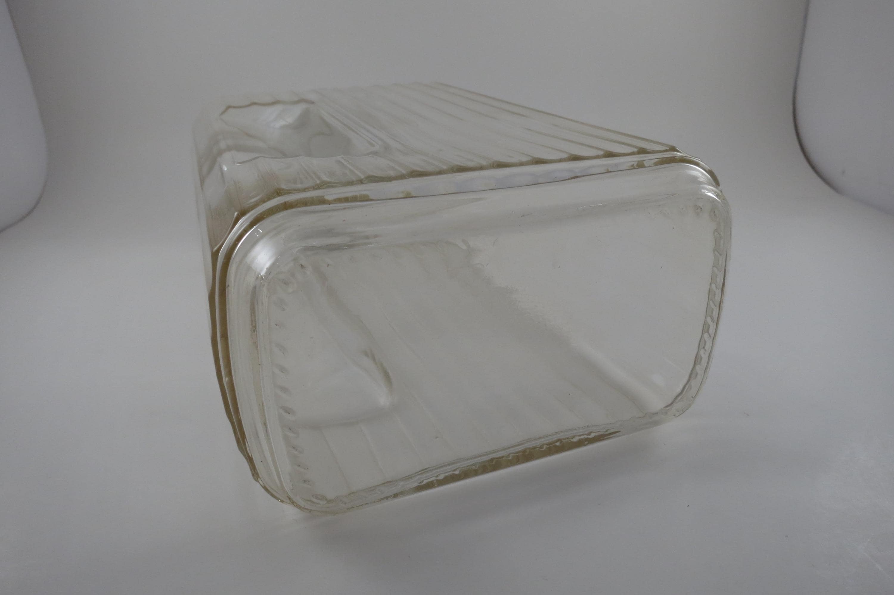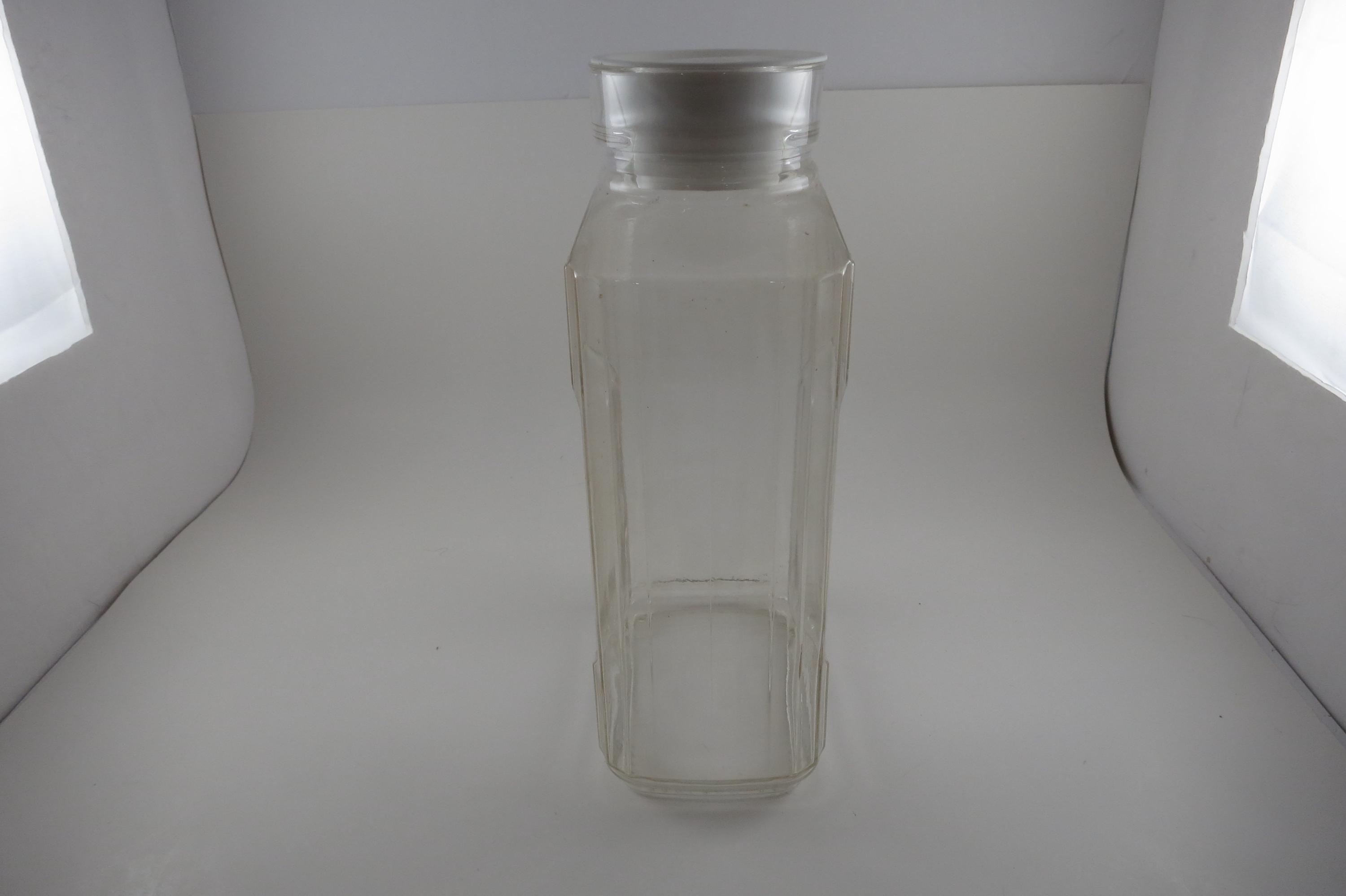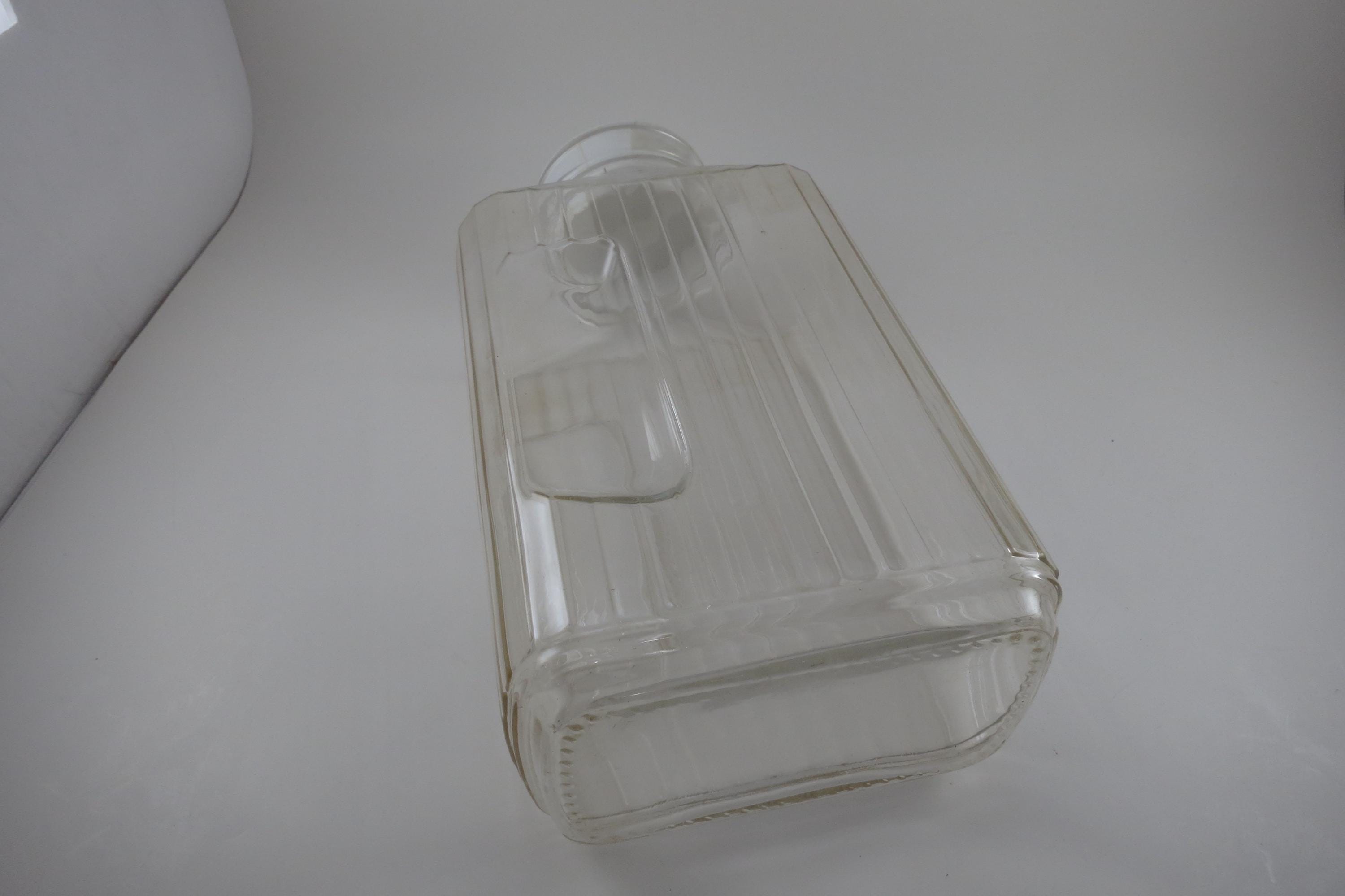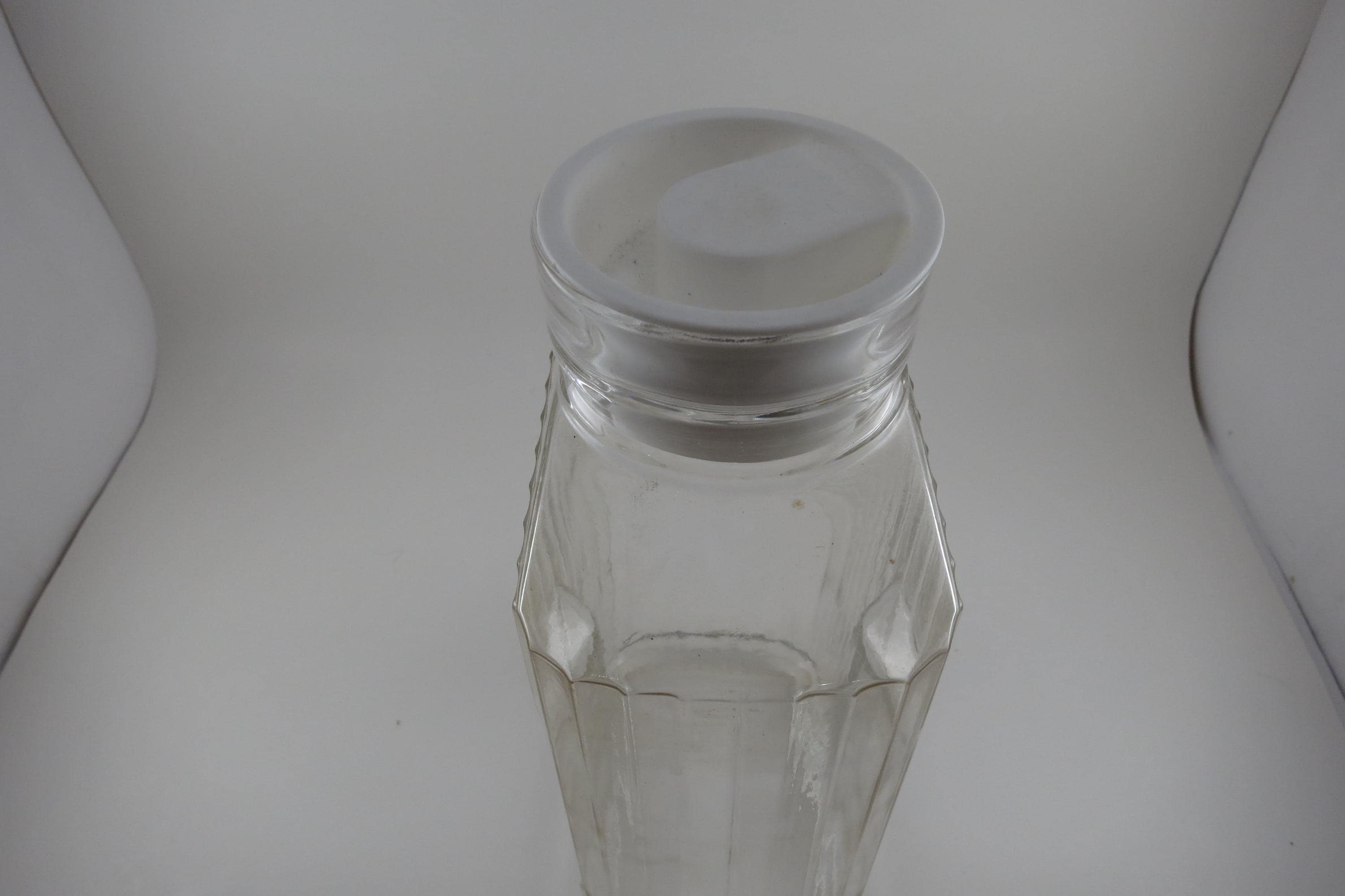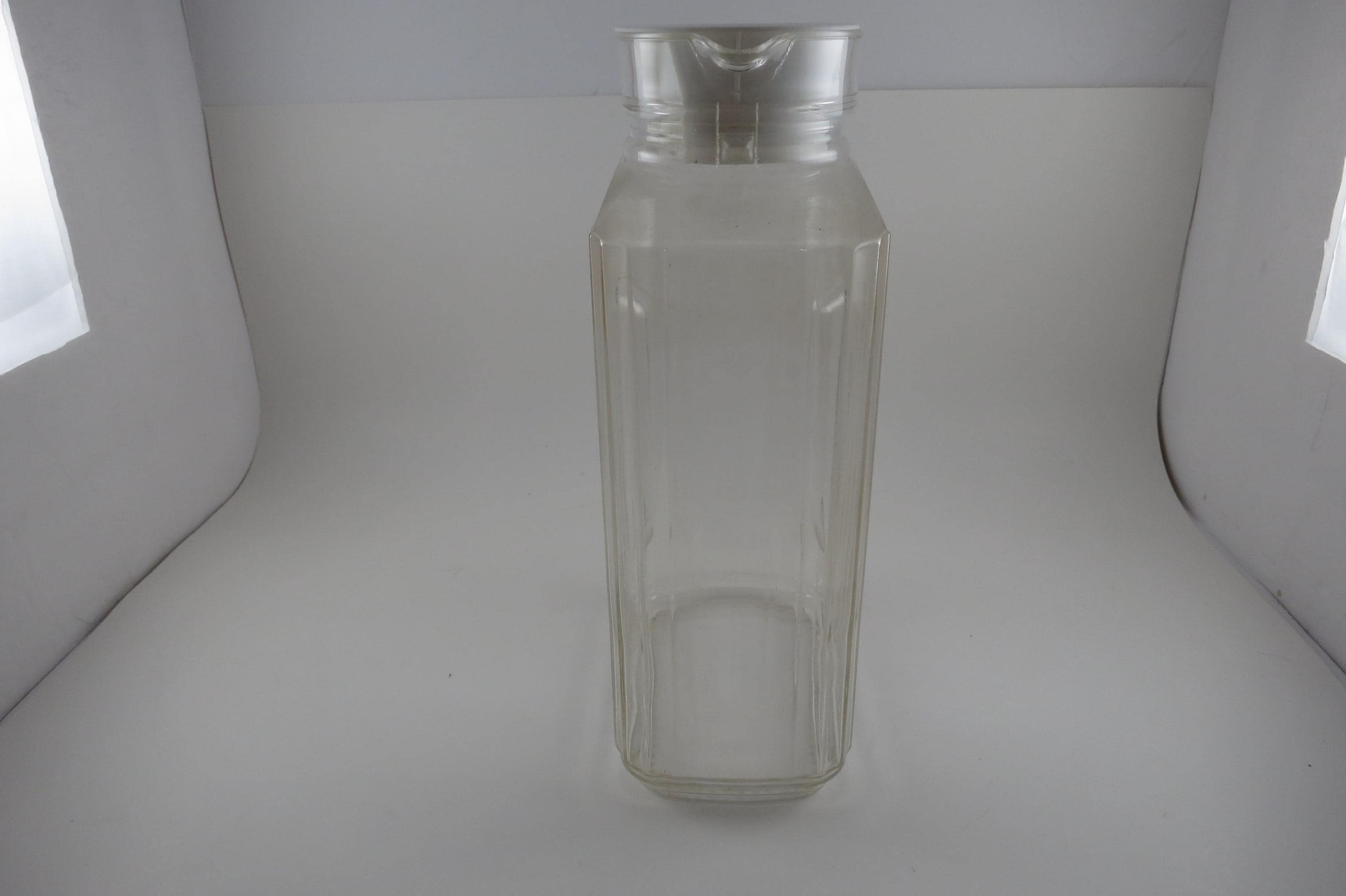 Vintage ARC France Ribbed Glass Juice/Water Jar with Original White Lid 2 Liter Excellent Original Condition. Measures 10 1/2 Inches Tall and 5 1/2 inches wide. Excellent Condition with No chips, cracks or damages.