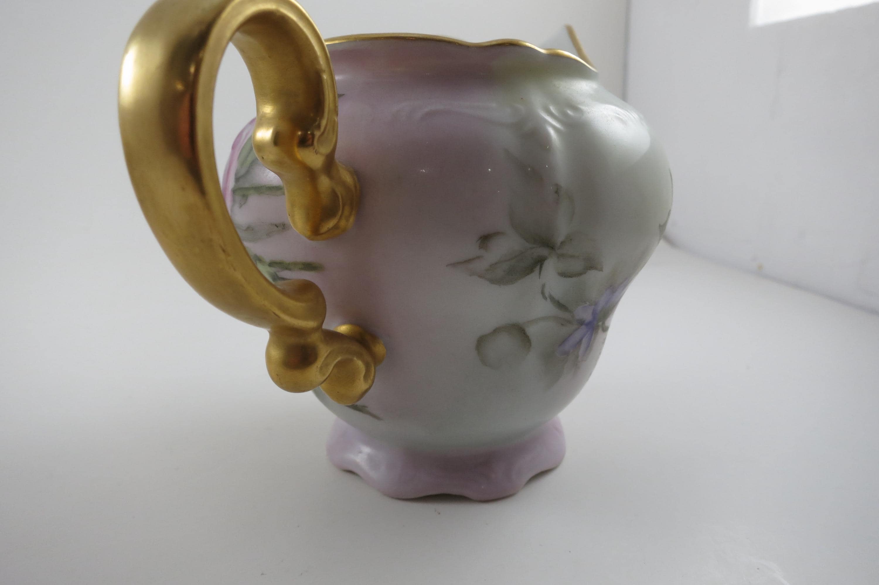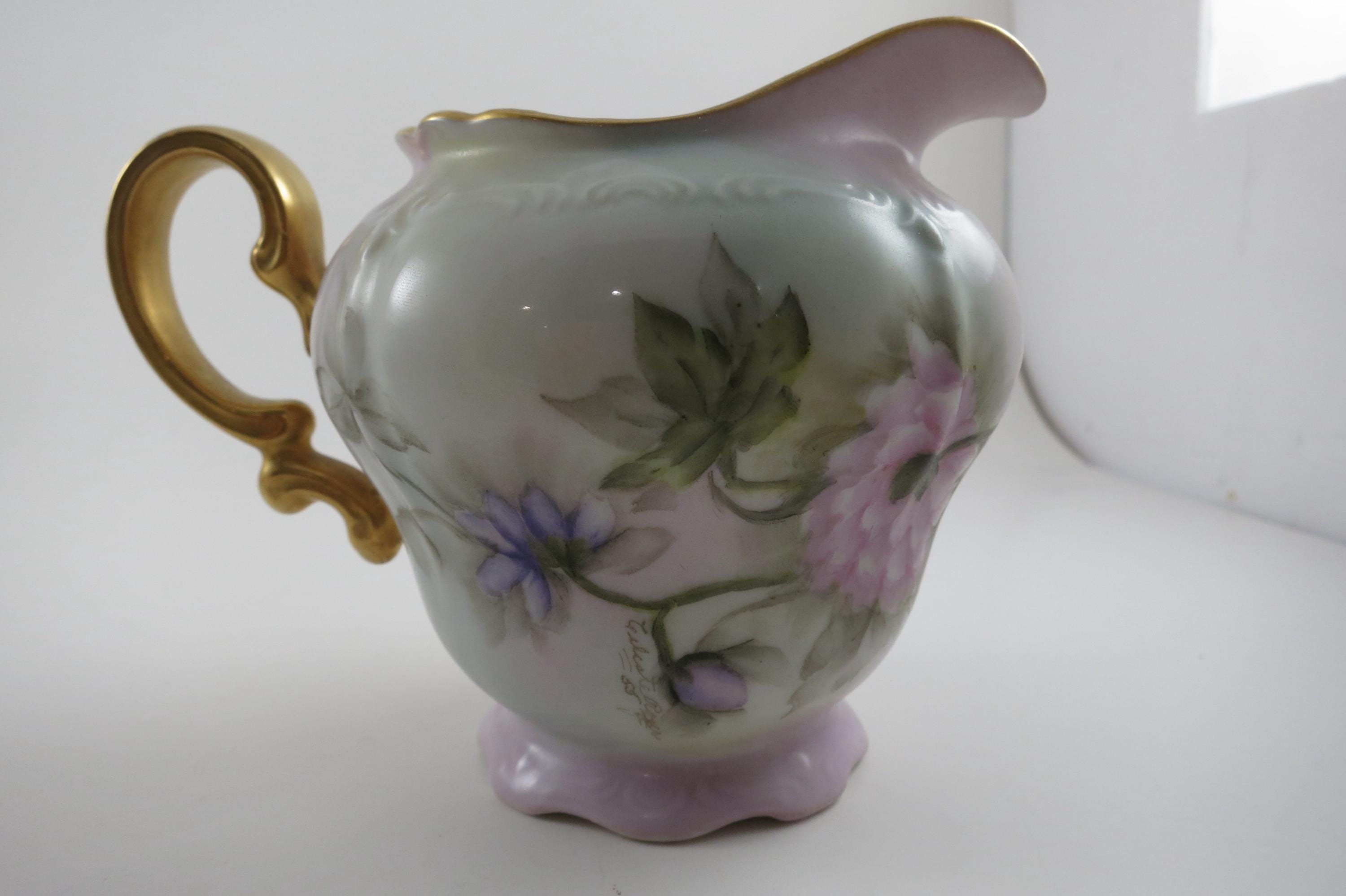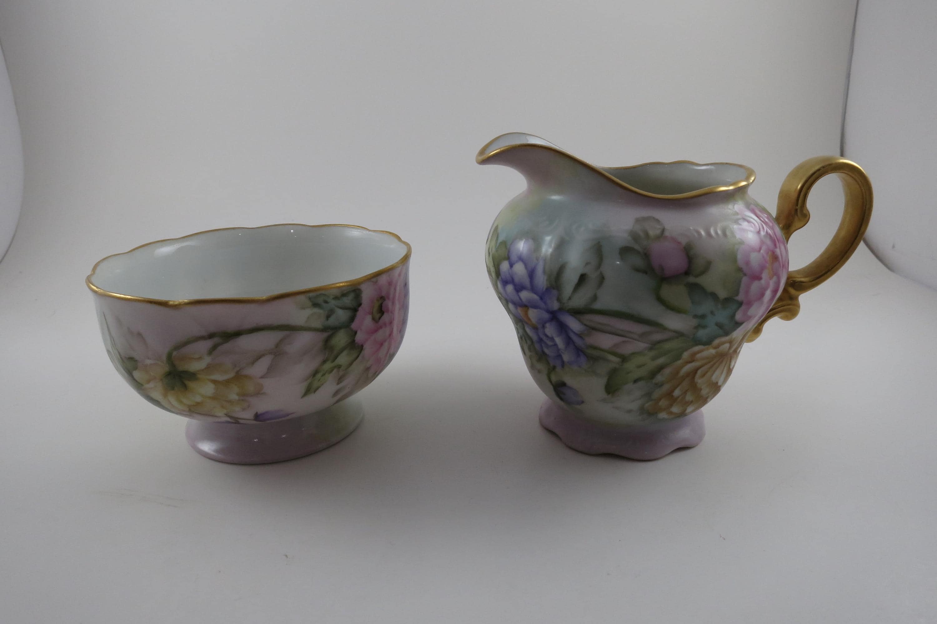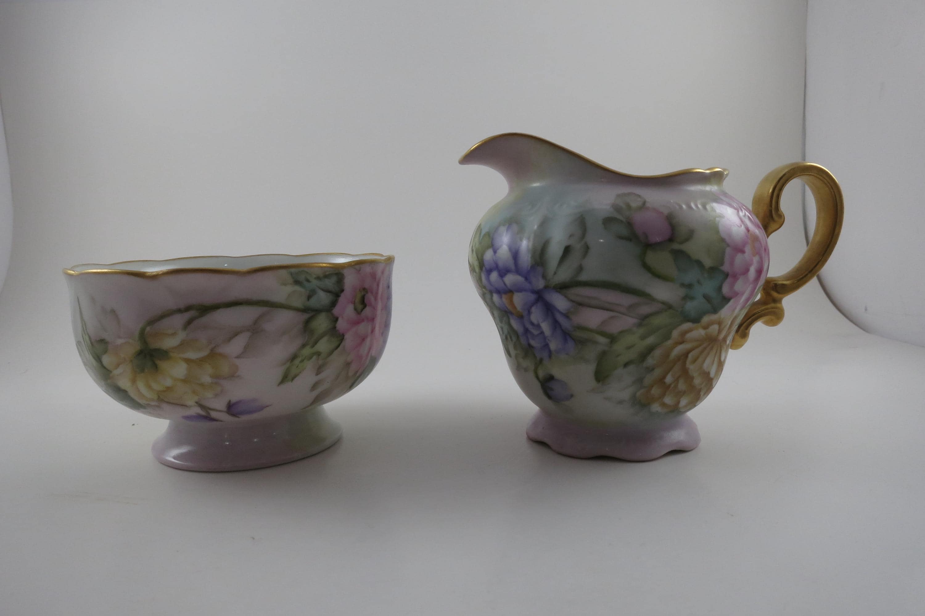 Hand Painted in pink, yellow and purple floral with heavy gold trim. Artist signed Celeste Rogers with 55, which I assume means 1955. We have several pieces from this company and artist and all wonderful display pieces! The creamer measures 5 inches wide and 3 3/4 inches tall, the sugar measures 4 inches wide and 2 1/2 inches tall.